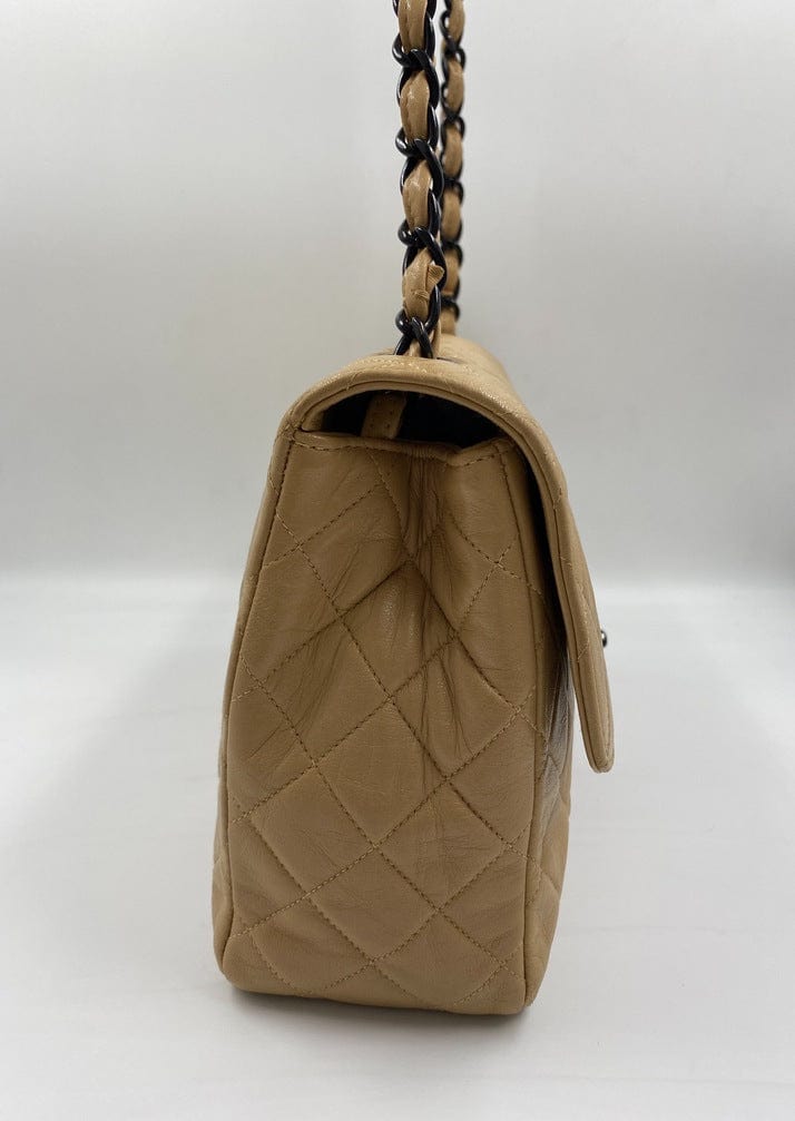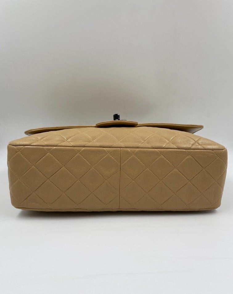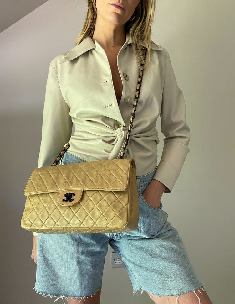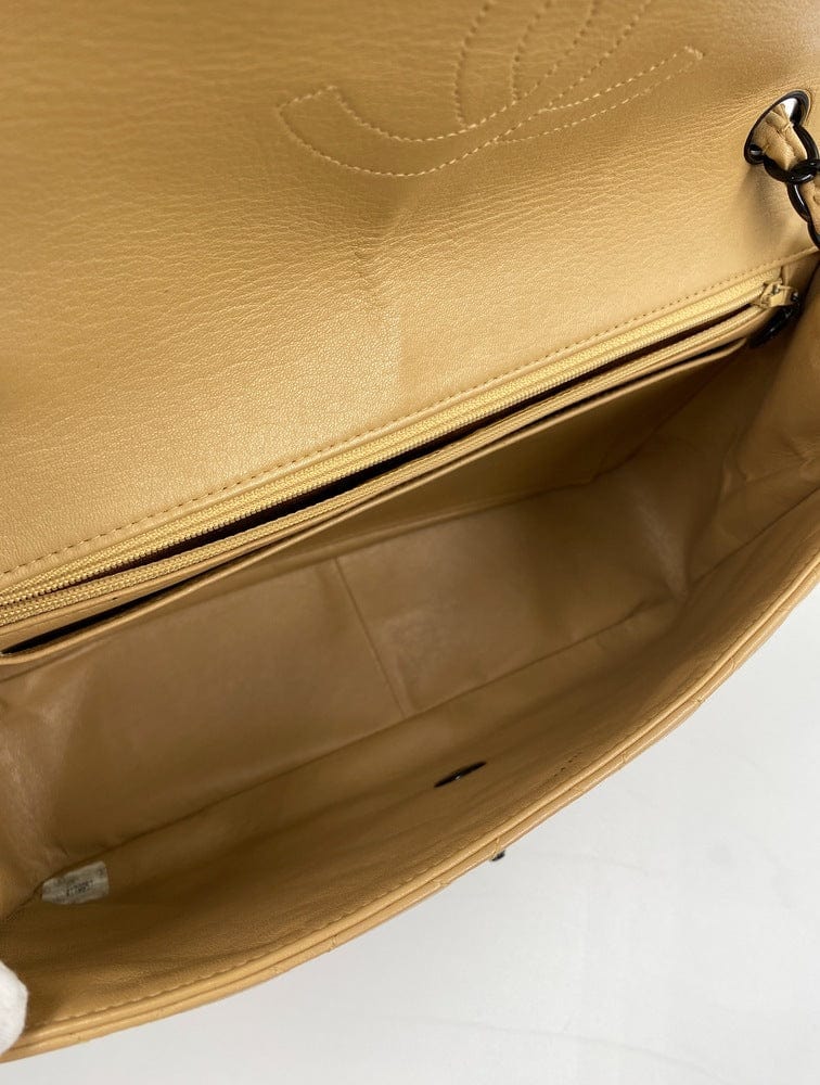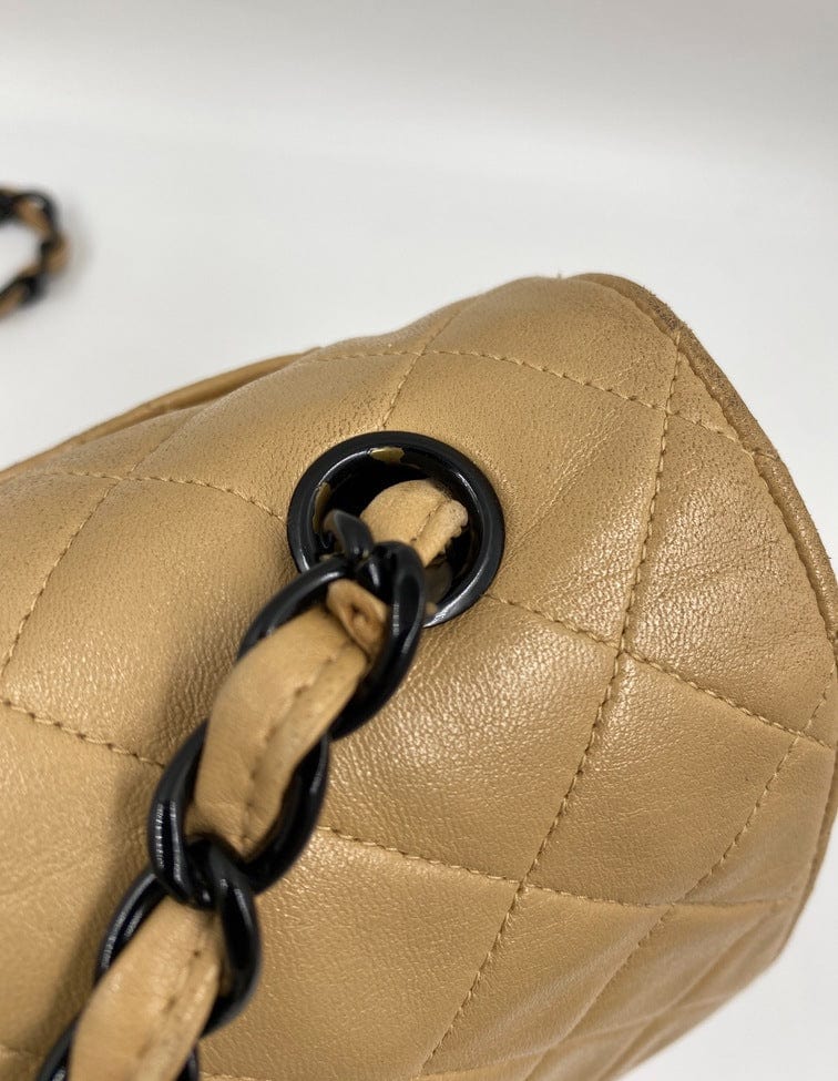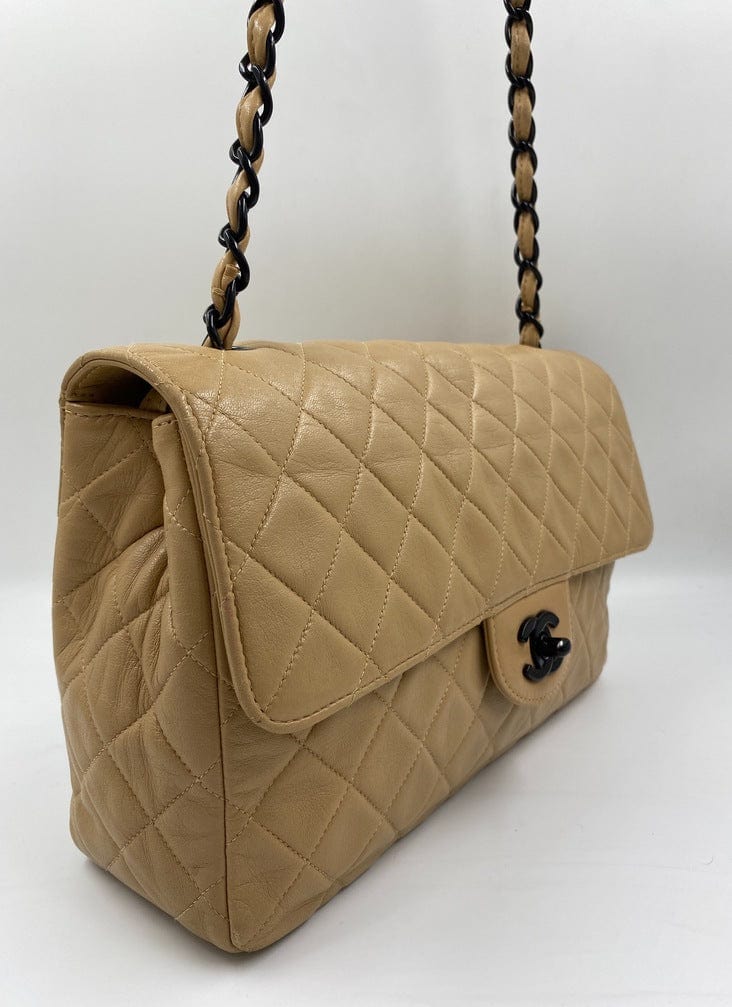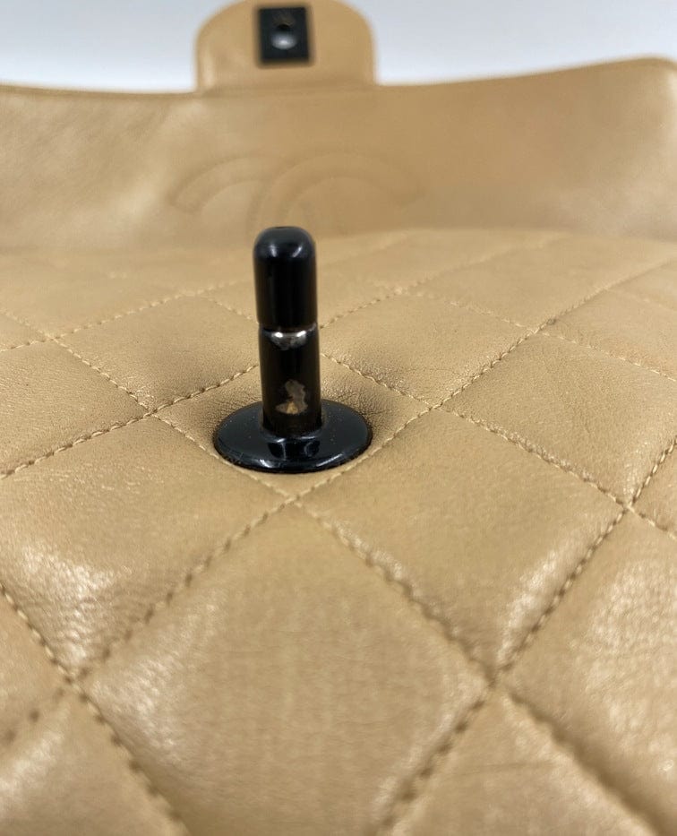This vintage Classic Chanel Flap bag is crafted with diamond quilted beige lambskin leather with black hardware and a leather-trimmed chain-link shoulder strap. There is a single exterior patch pocket on the back, inside there is a zipped pocket plus slip pocket. The interior of the bag is lined with beige leather. This chain can only be worn at one length - the drop of the chain is 53cm.