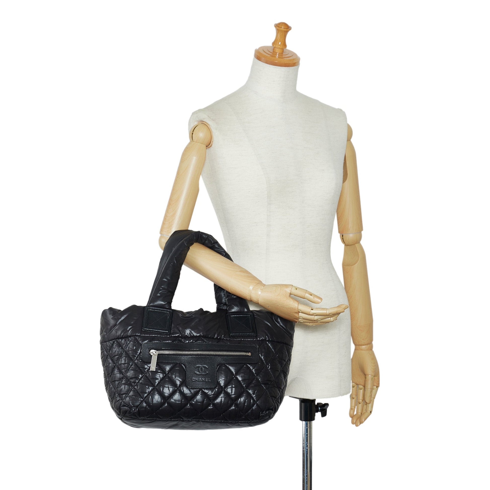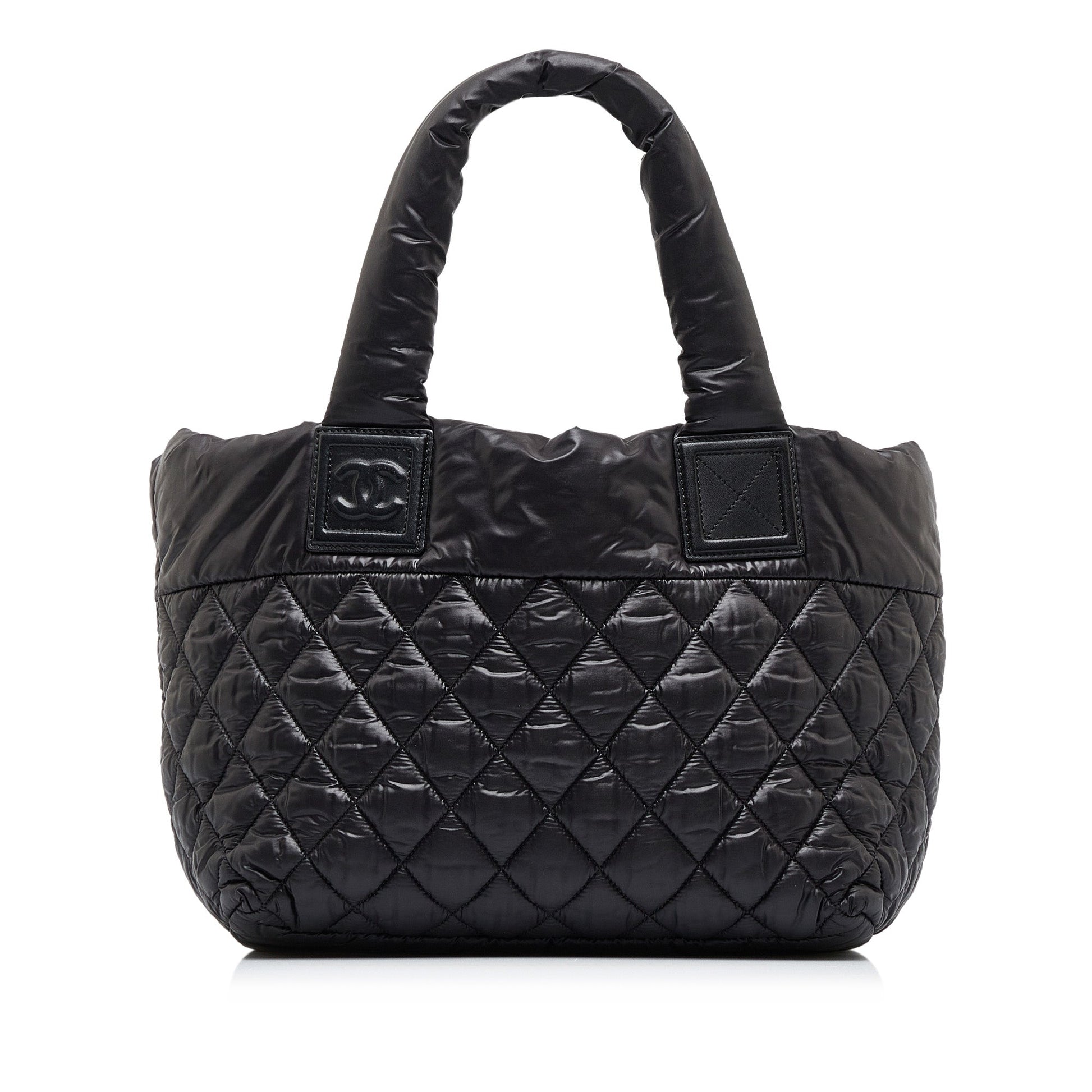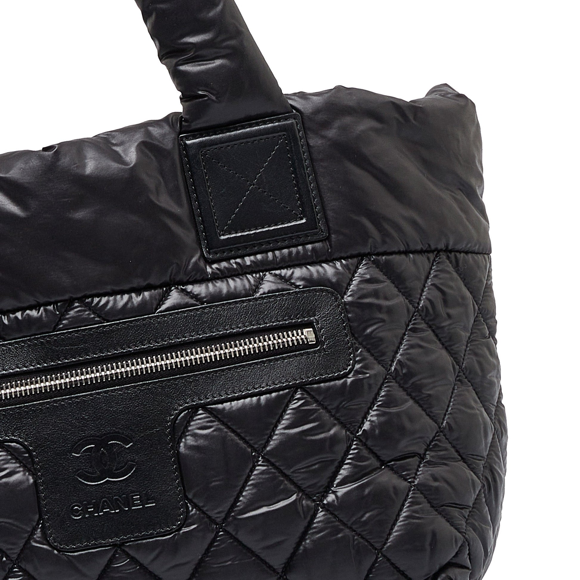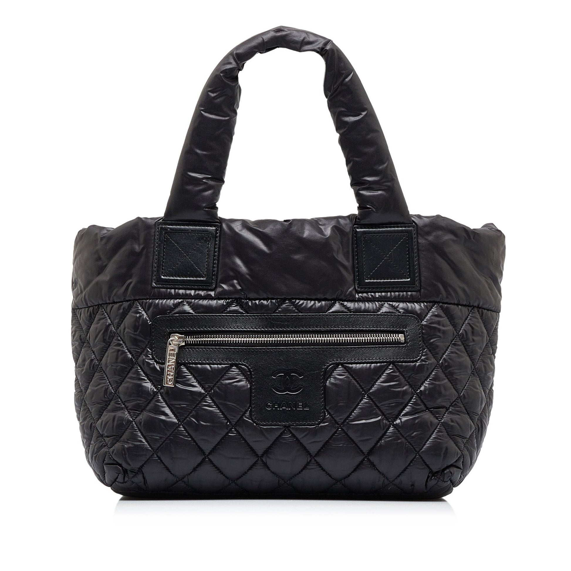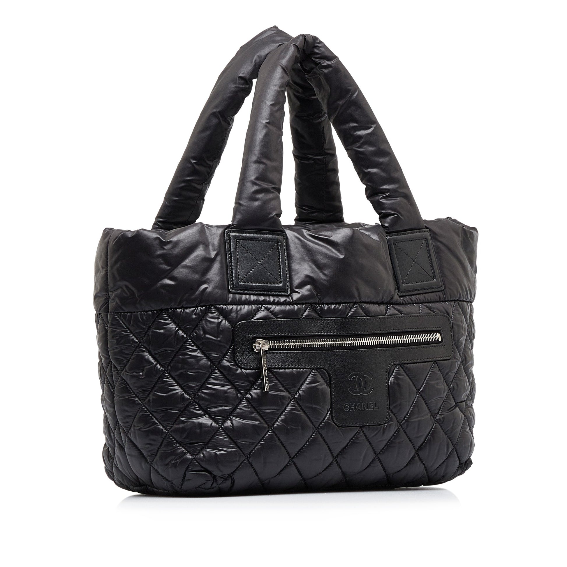 This Chanel Coco Cocoon is made of black padded nylon canvas with classic Chanel quilting. On the front the Bag external zippered compartment and a leather trim with logo embossing on the front. The Bag can be closed with a zipper at the top opening. Inside the Bag there is a zippered compartment. The Bag fits comfortably in the hand with its two handles made of padded nylon fabric. A Bag, which radiates sporty elegance.