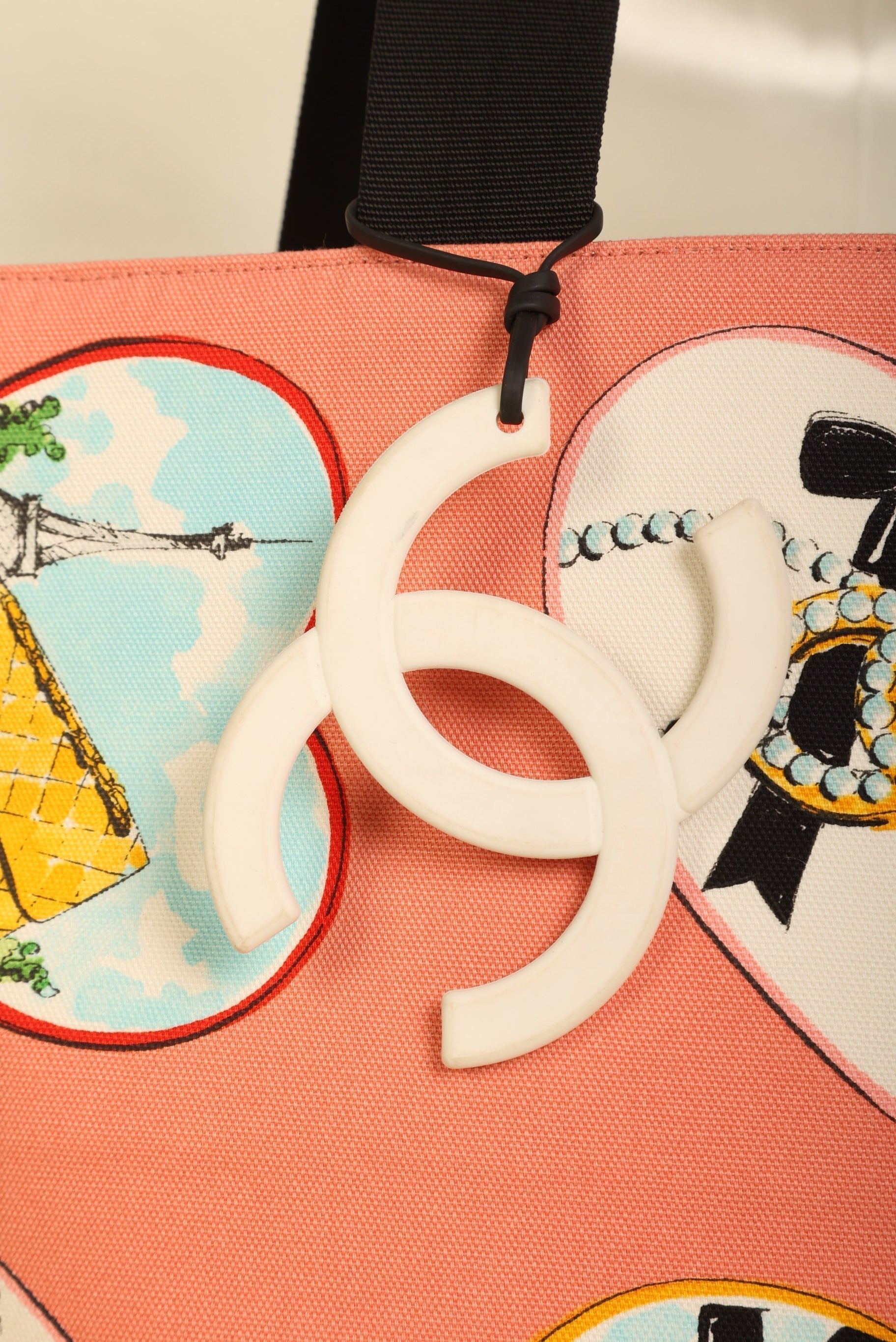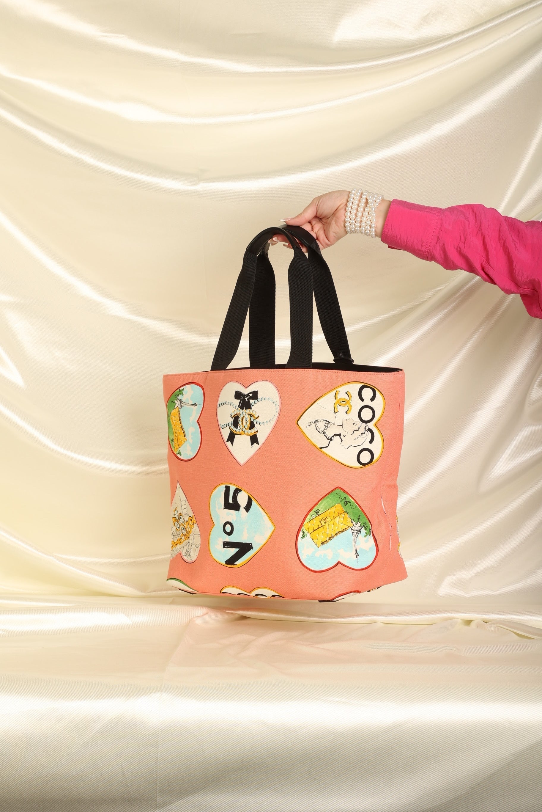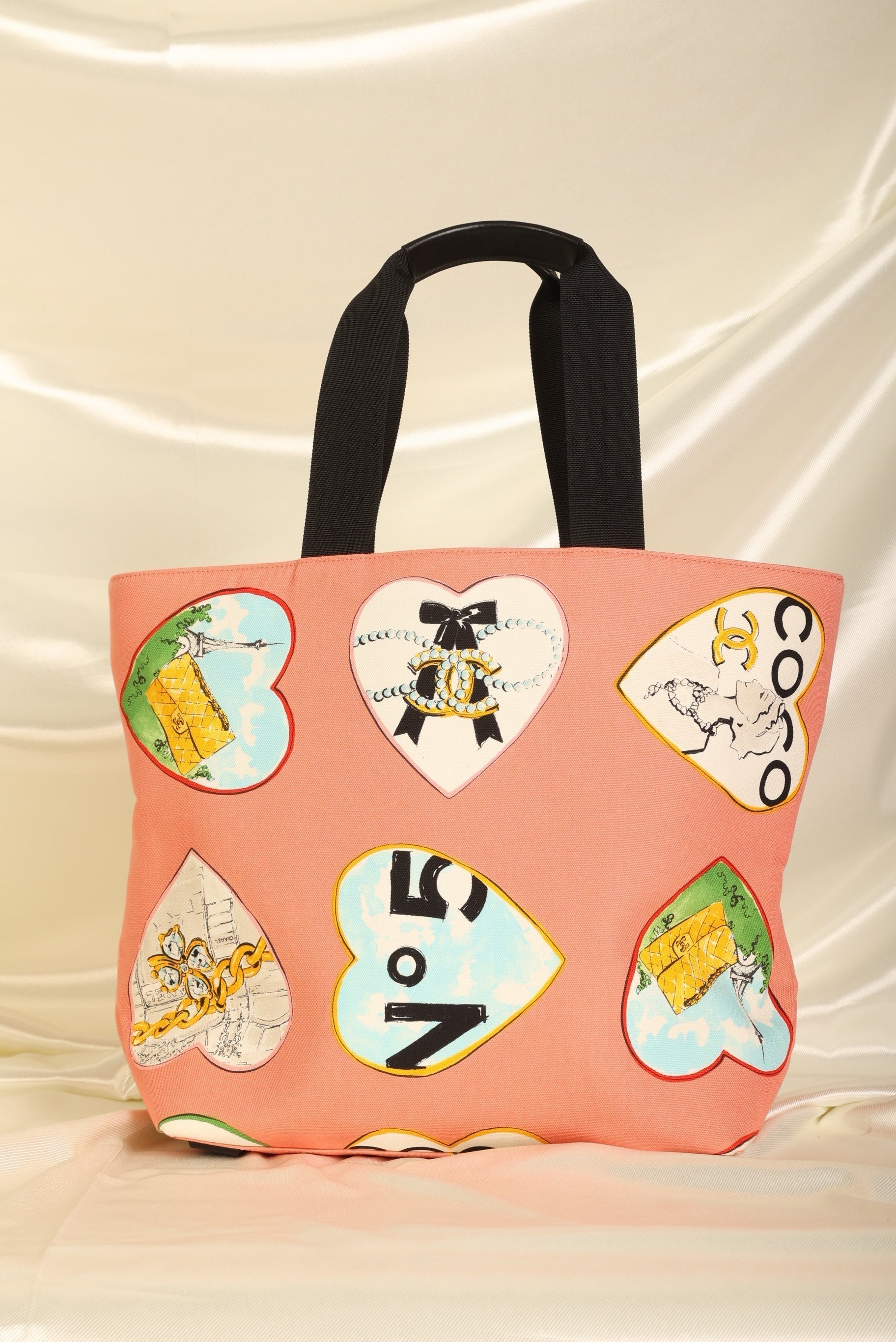 Crafted in 2005. Throwing over this tote gives an effortless look with the benefit of a great amount of space. The iconic Coco hearts cover the body of the bag exhibiting integral Chanel moments. In addition, the CC charm makes this piece timeless! Perfect to bring along when you travel, or to a fun beach day with your friends!