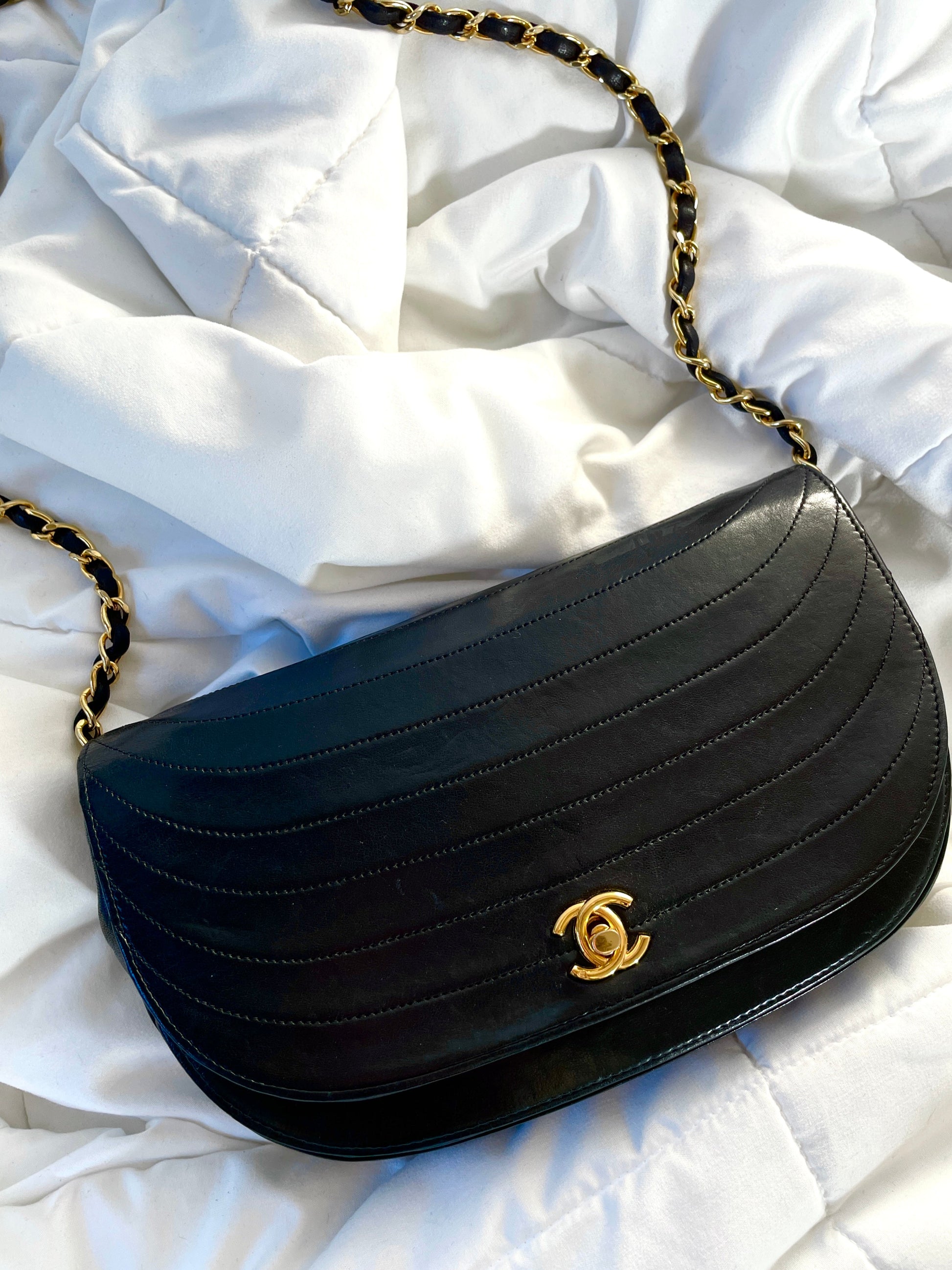 Up for grabs is a stunning Chanel?Crescent Half Flap vintage bag in lambskin in a medium size! Highly sought after, crafted in the 90's with 24k gold plated hardware. Just conditioned, so lambskin is buttery soft! Currently online going for 4000+.