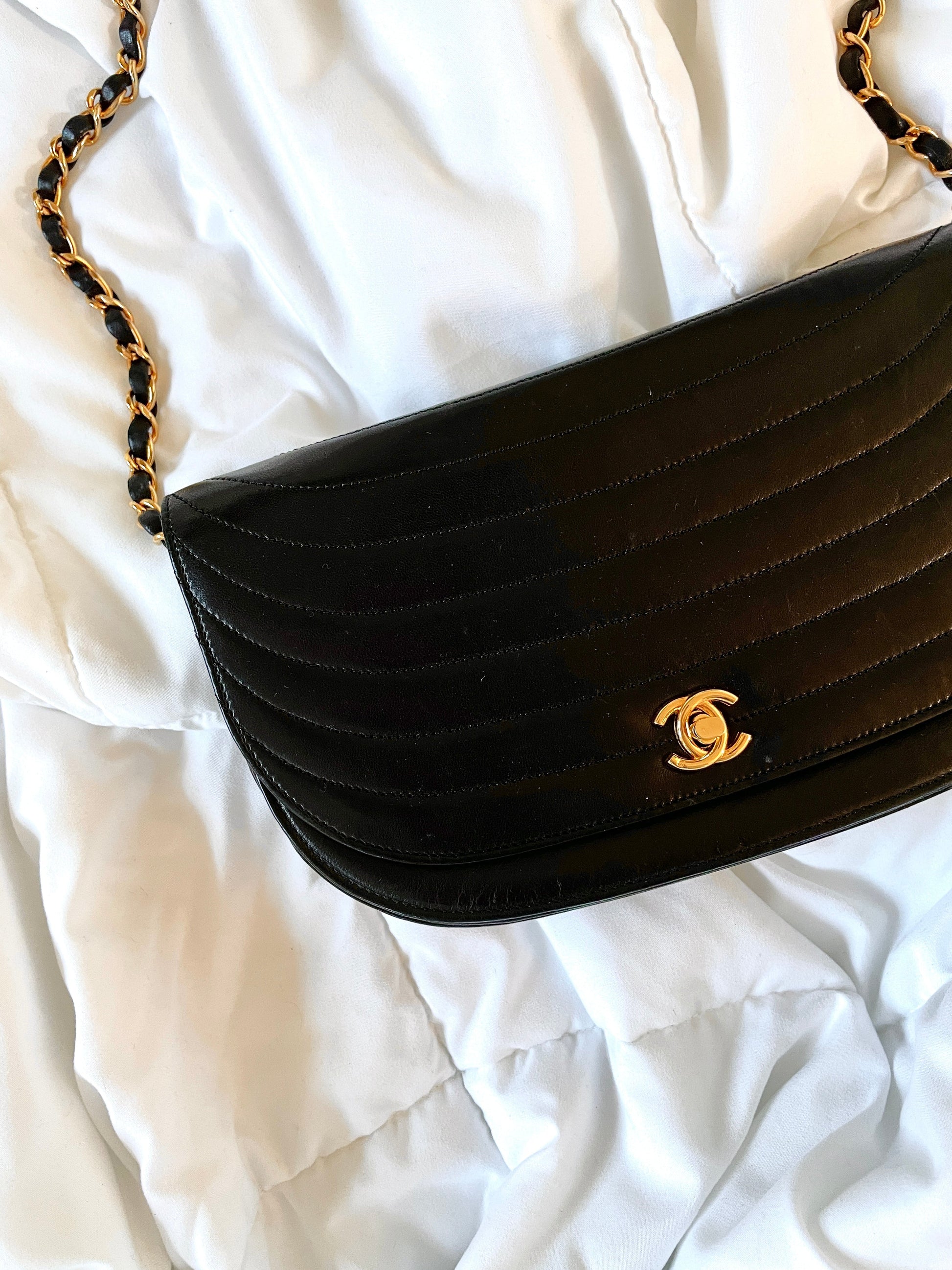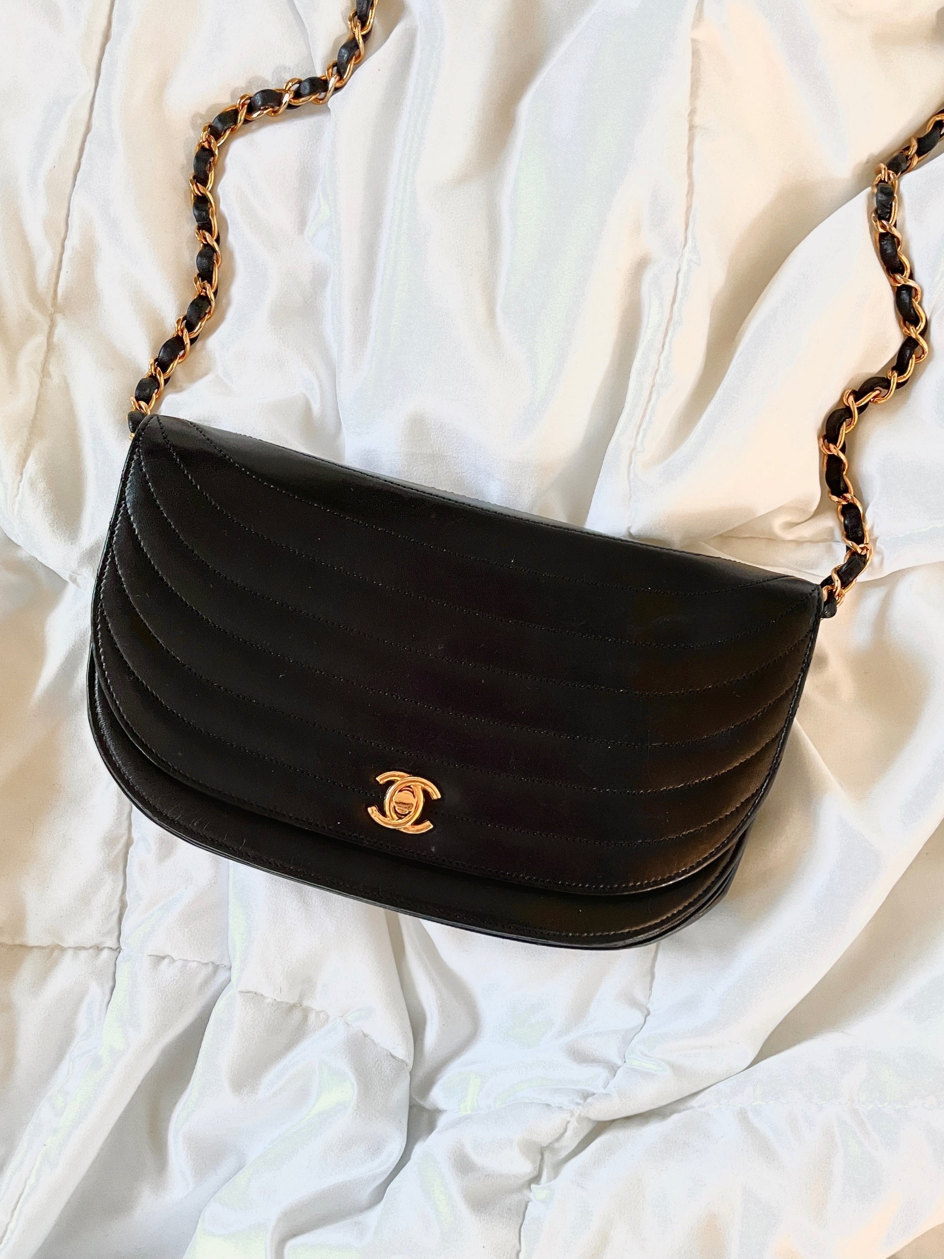 Up for grabs is a stunning Chanel?Crescent Half Flap vintage bag in lambskin in a medium size! Highly sought after, crafted in the 90's with 24k gold plated hardware. Just conditioned, so lambskin is buttery soft! Currently online going for 4000+.