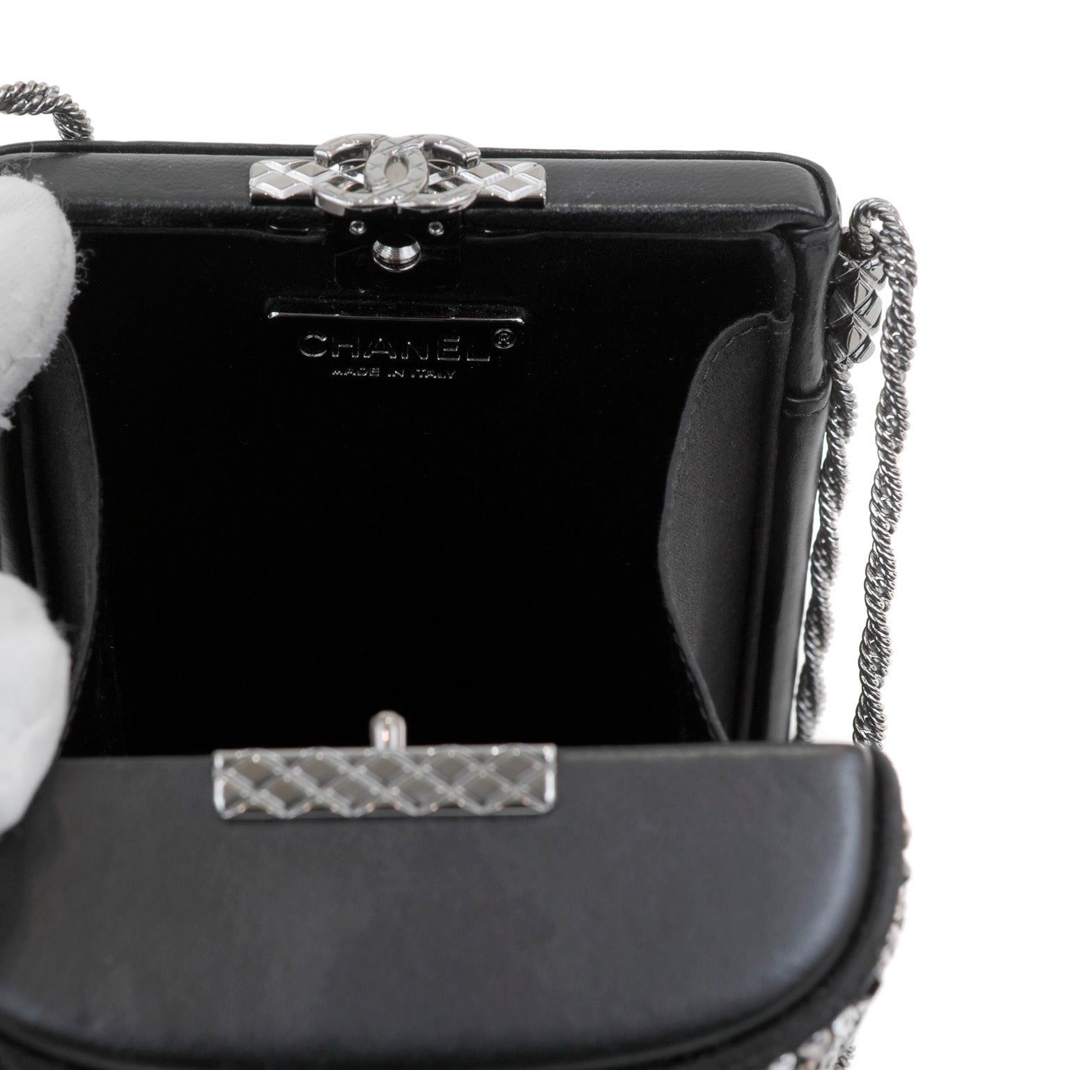 This Chanel Swarovski Crystal Crossbody Evening Bag is a collectible piece in pristine condition. North South configuration with push lock clasp opening. Covered in an array of variously shaped twinkling Swarovski crystals. Extra long silver chain strap may be comfortably carried across the body. Dust bag included.