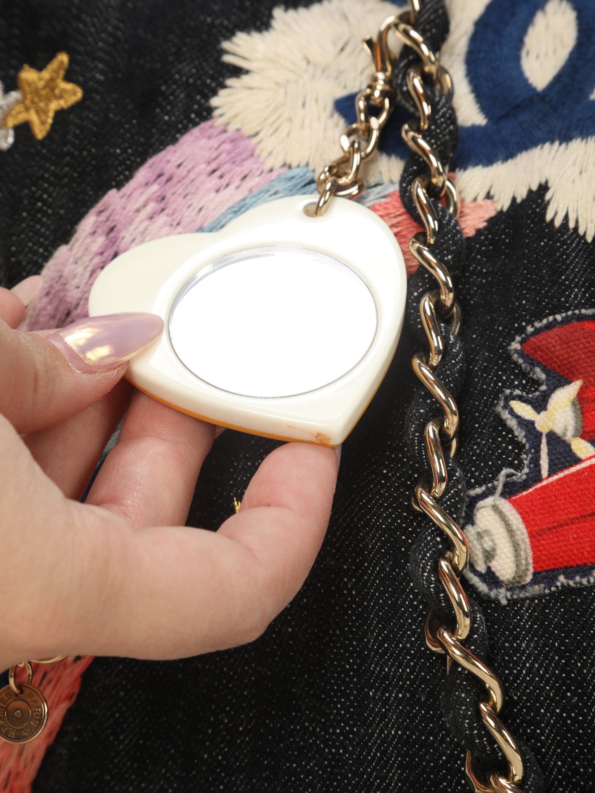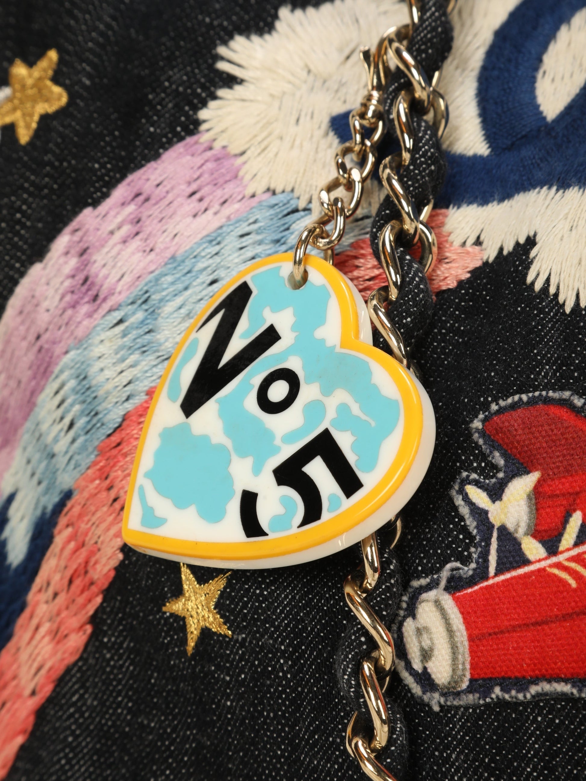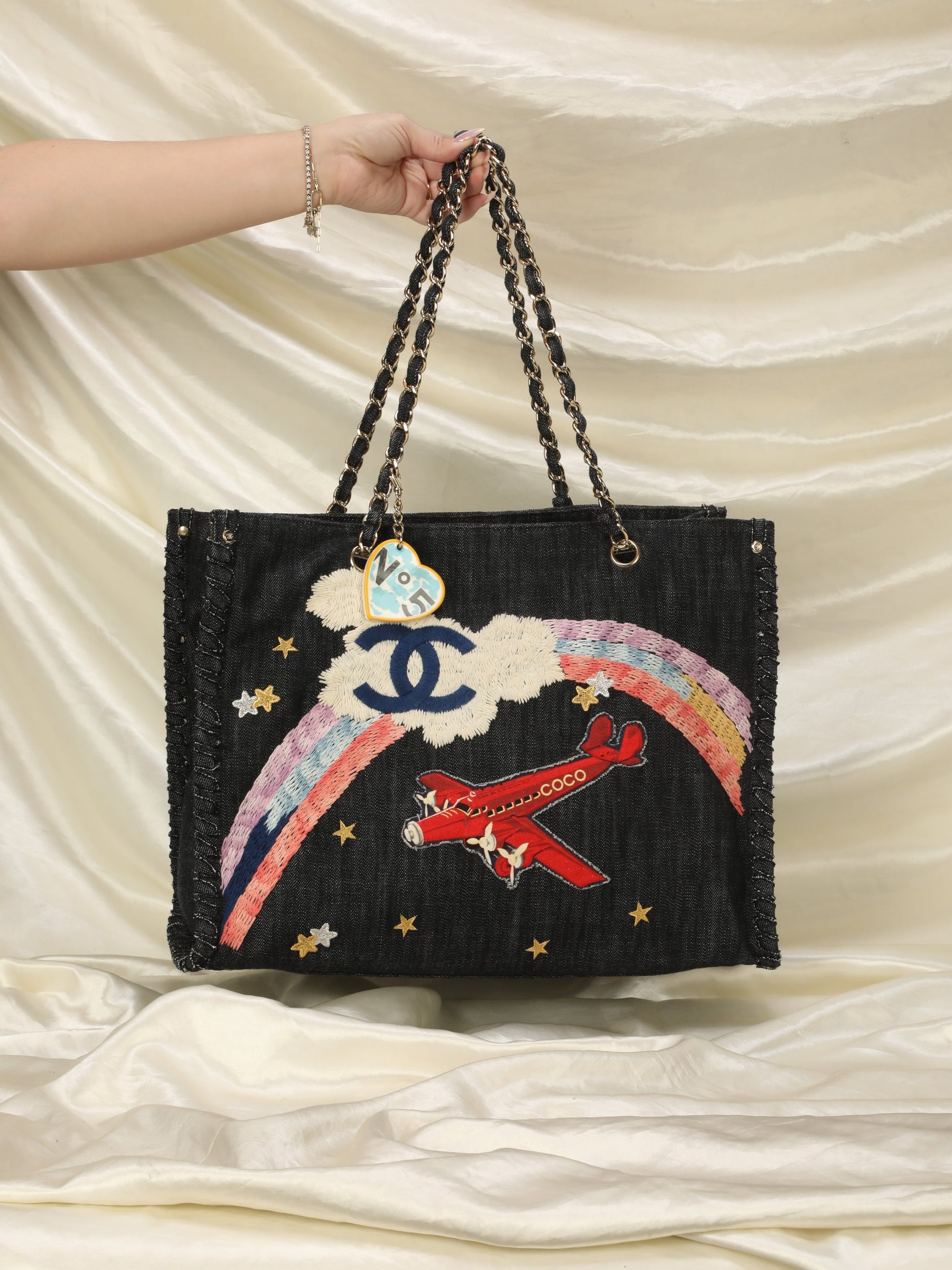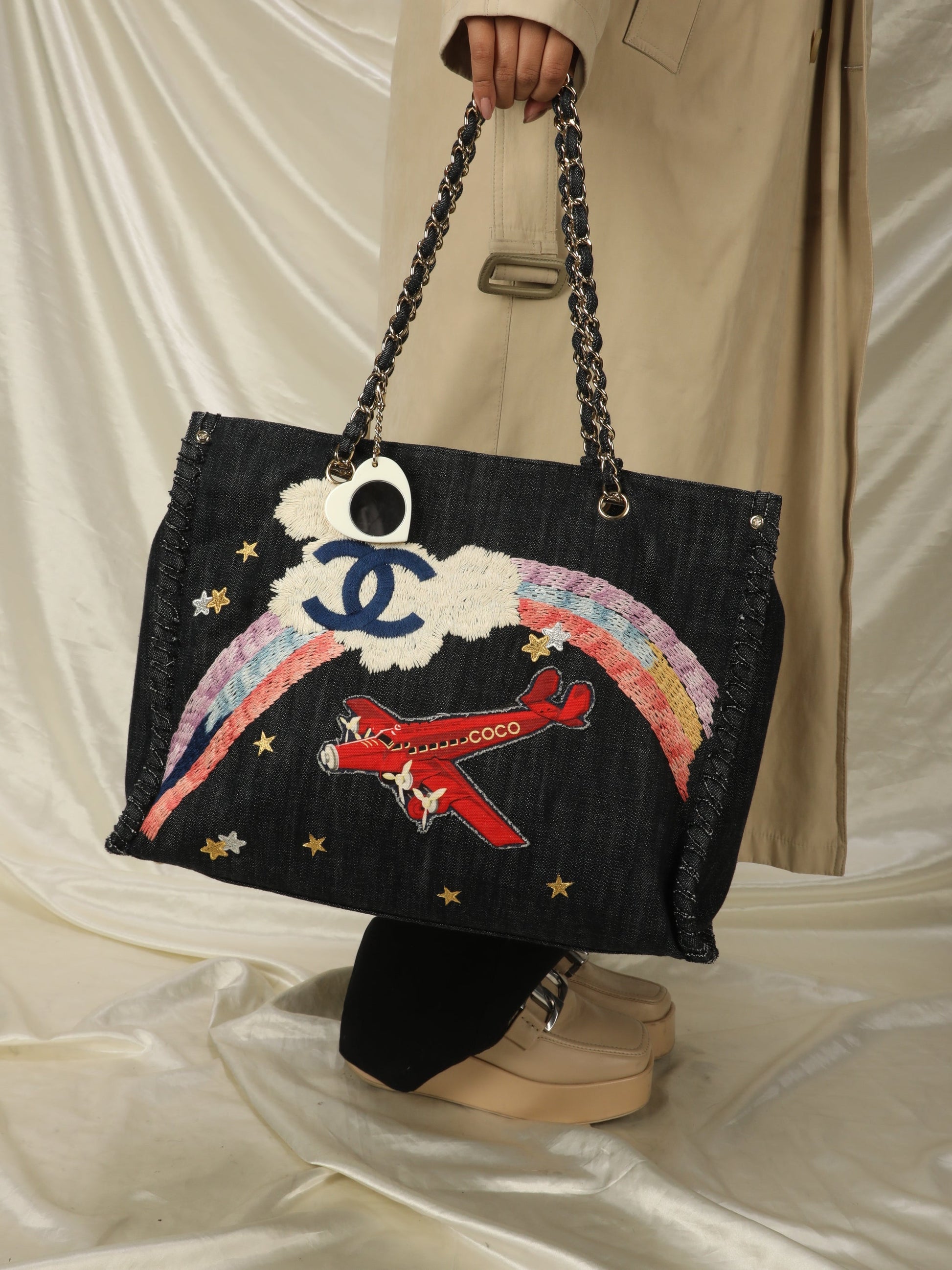 FOR THE CHANEL COLLECTORS!! Extremely rare, limited edition denim Chanel tote embroidered with a large Chanel logo, Chanel airplane, and pastel raiBAow. Whipstitched denim edges and light gold hardware. Hanging removable mirror charm. A Chanel that will receive compliments when .