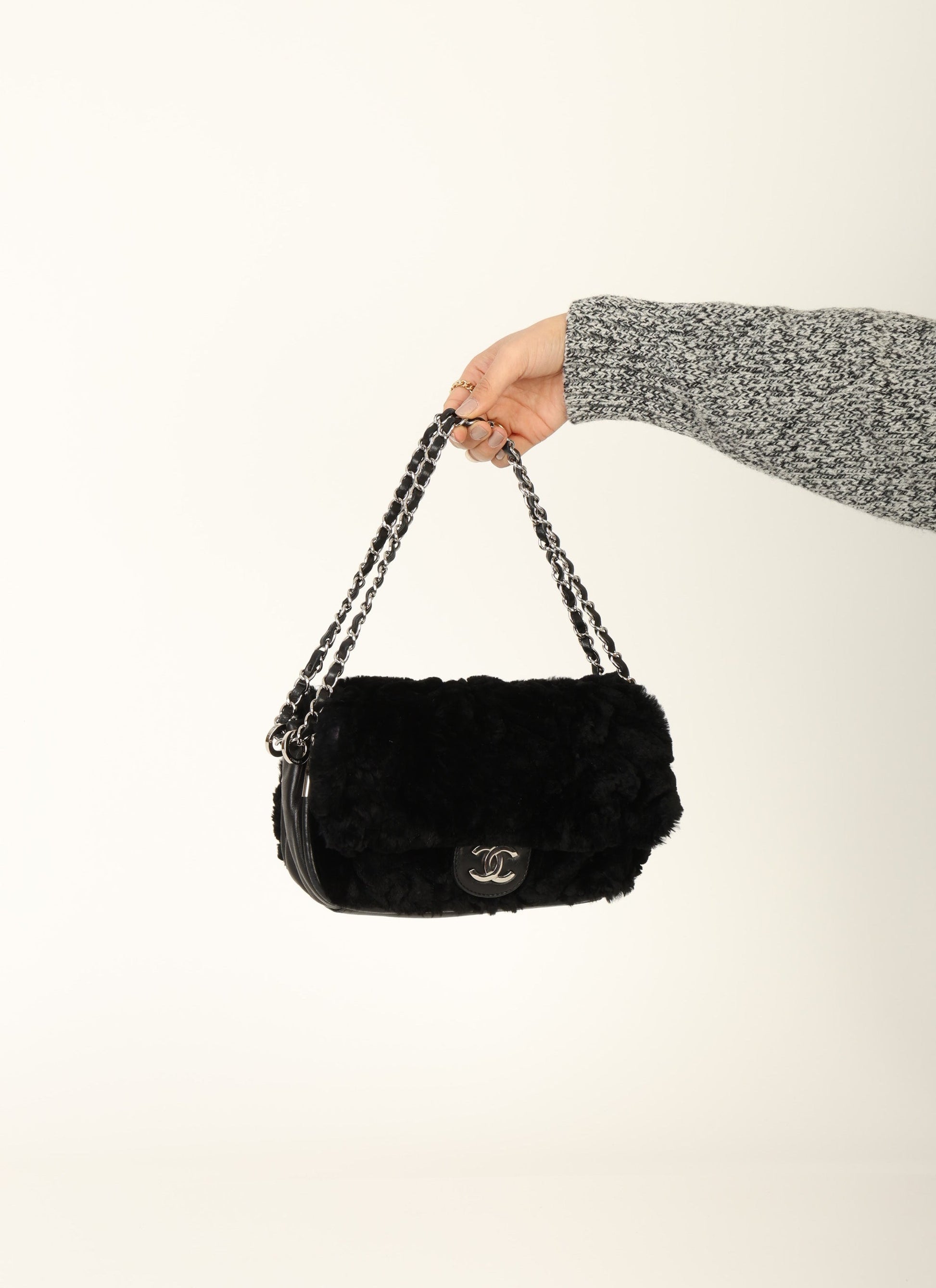 Dropping in the shop is a Chanel Fur Medium Flap bag in black with silver hardware! The softest rabbit fur covers the majority of the bag, showing leather lambskin along the bottom and sides of the bag. The silver hardware gives the bag a chic edge. You can wear this piece as a long or short-shoulder bag. The interior includes one main compartment and one zipped. You can fit your phone, wallet, keys, sunglasses, and a few other smaller essentials.?