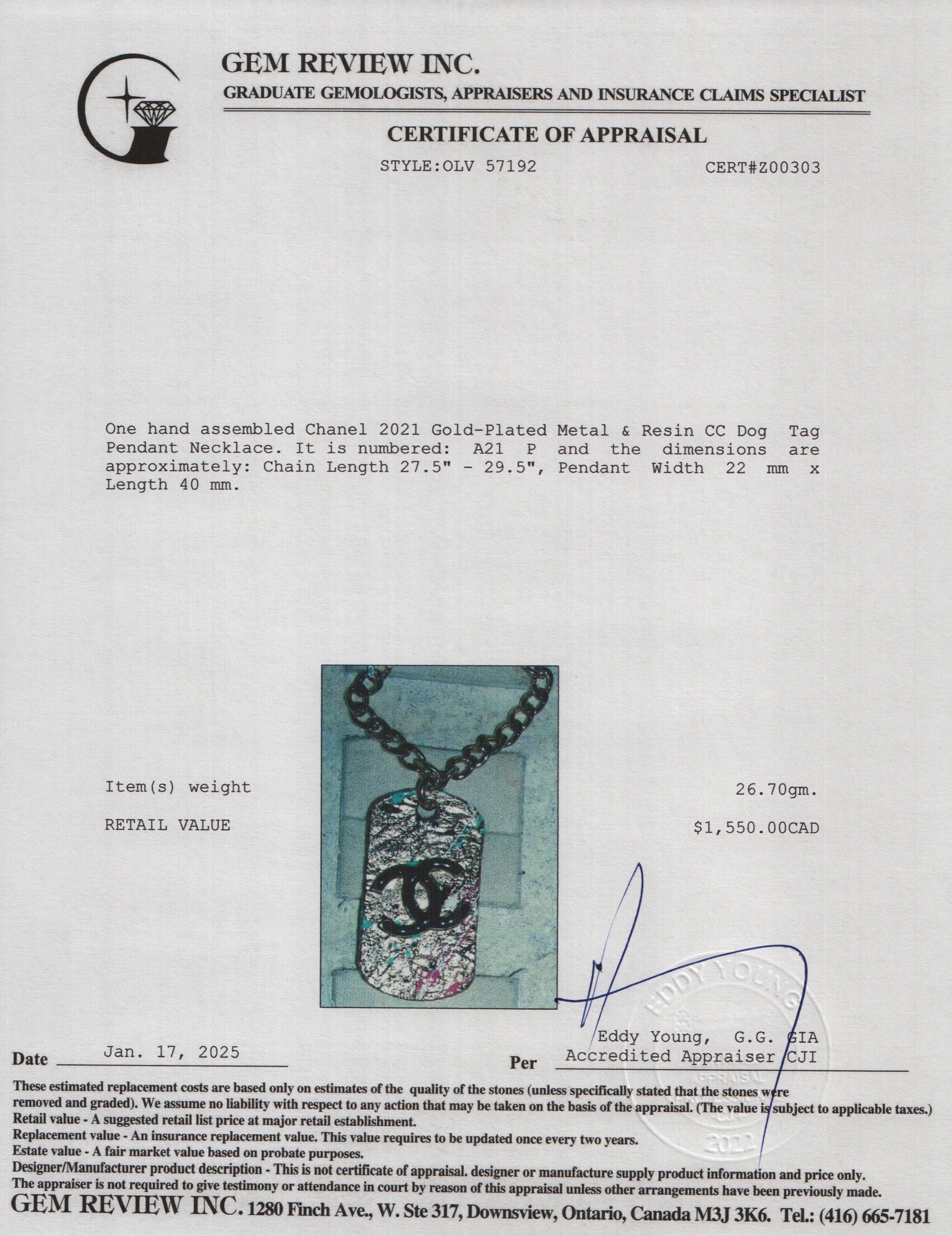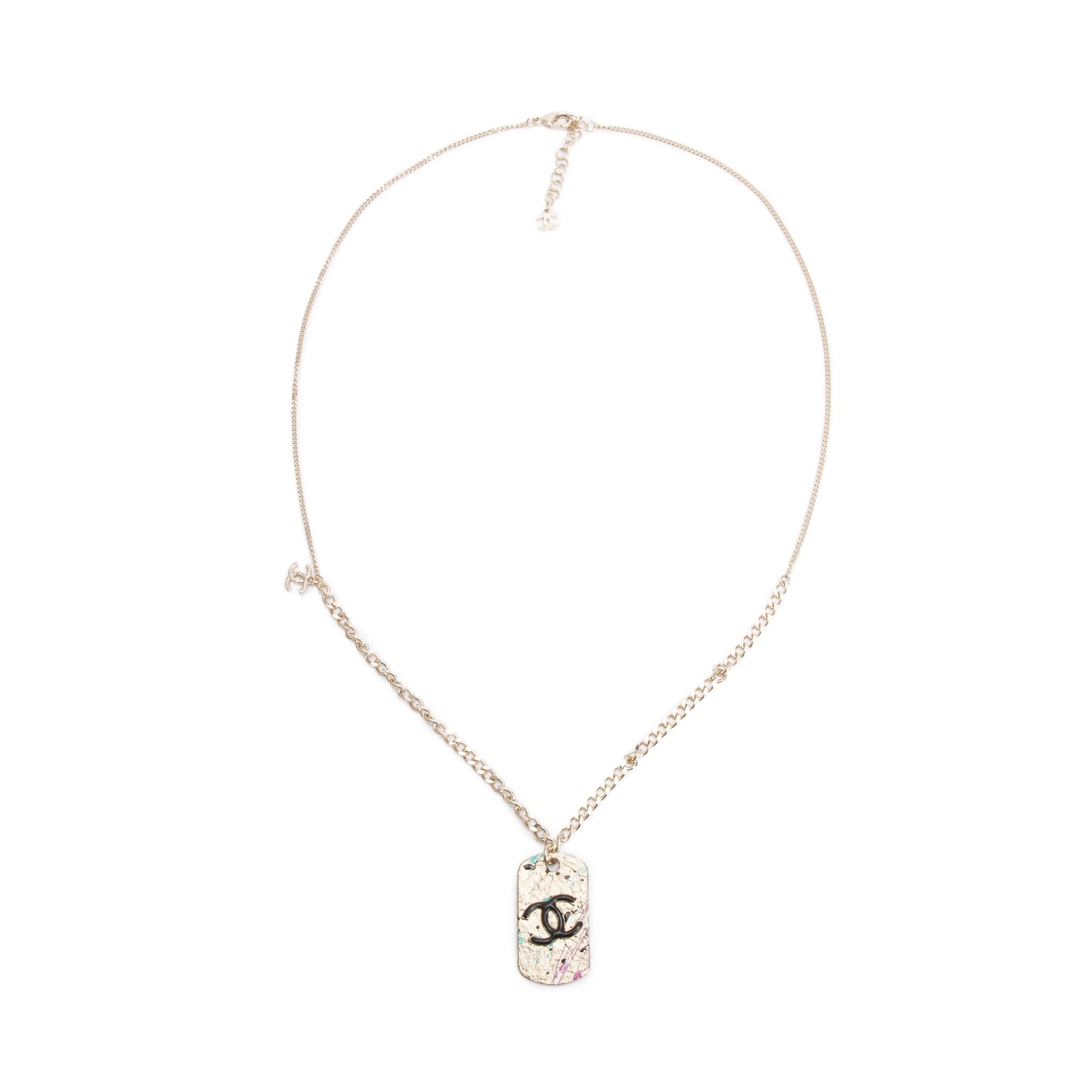 Chanel 2021 Gold-Plated Metal & Resin CC Dog Tag Pendant Necklace w/ Box