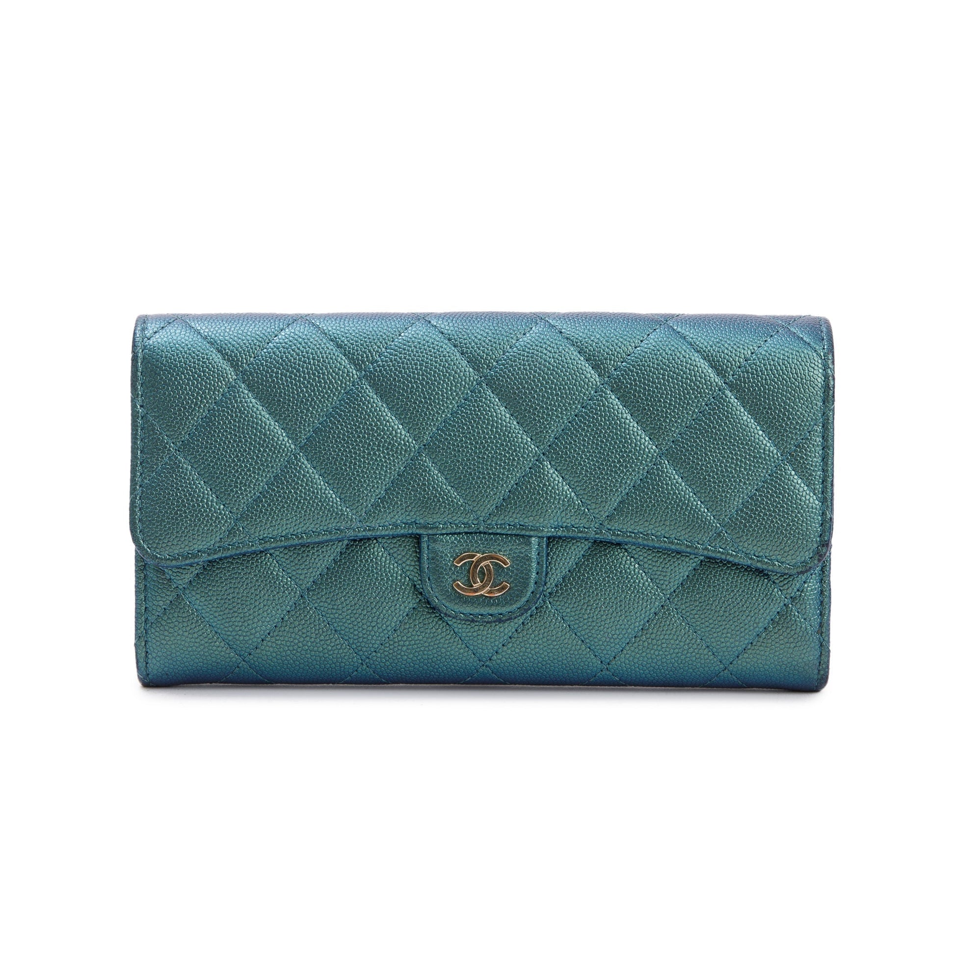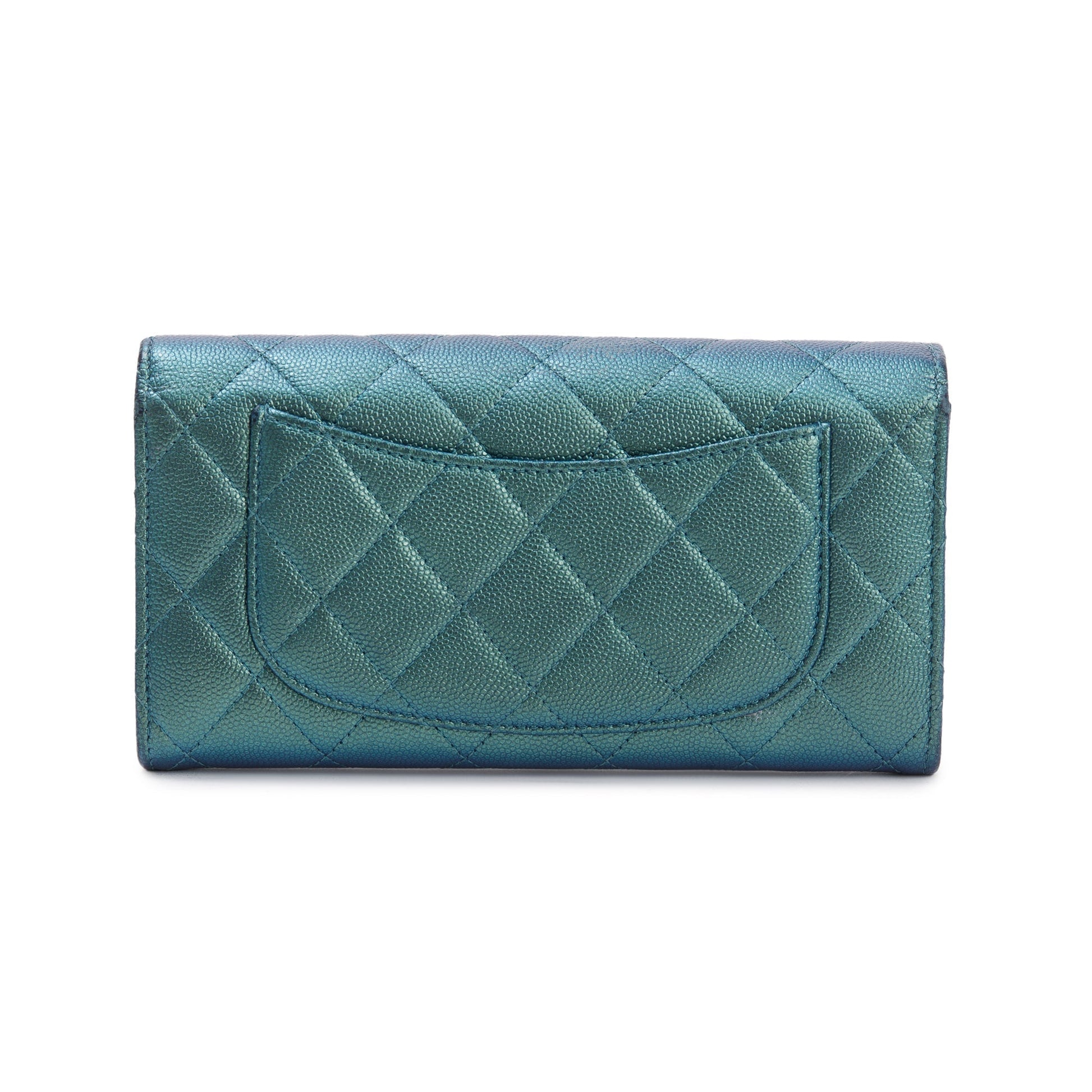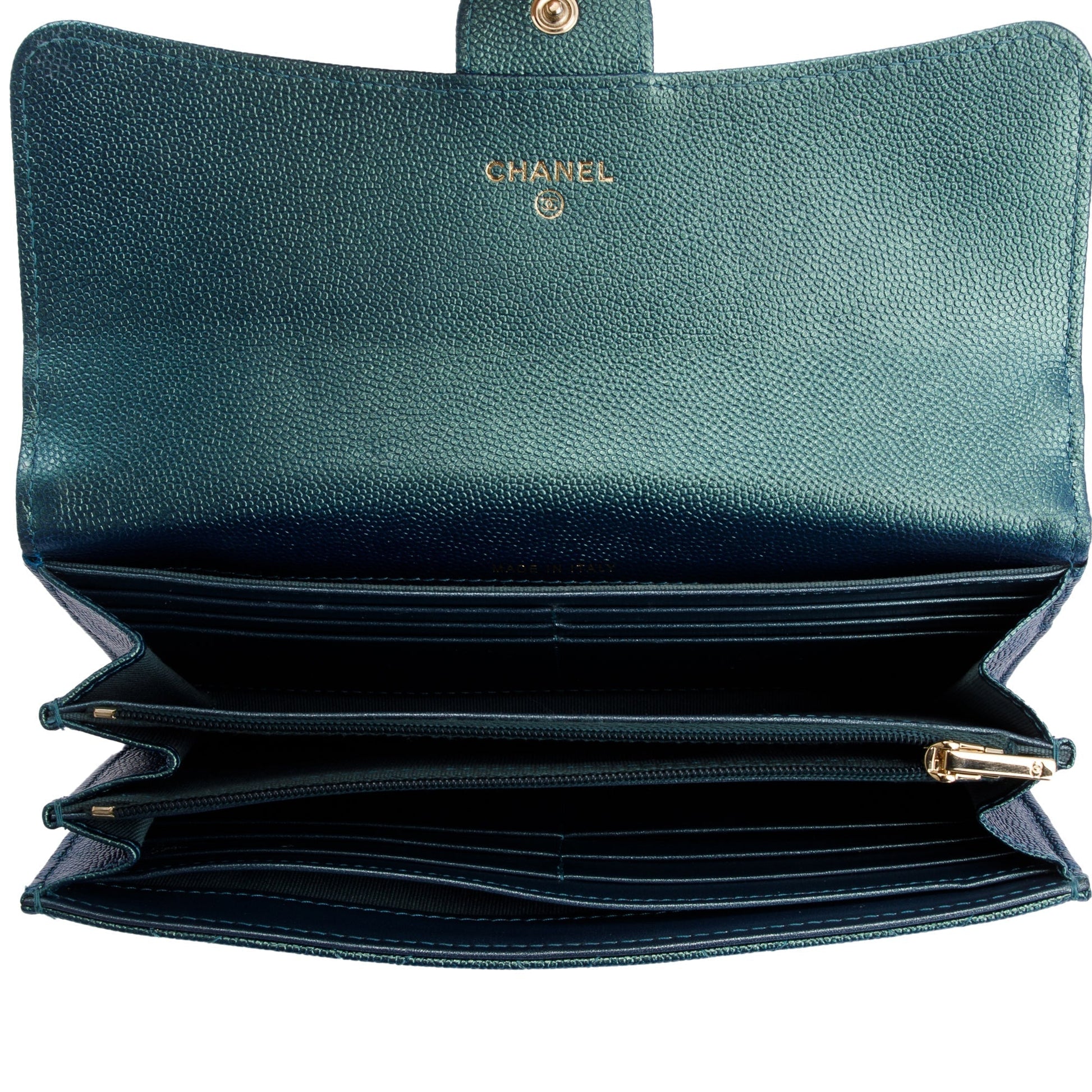 Chanel 2021 Green Iridescent Caviar Leather Classic Long Flap Wallet w/ Box & Authenticity Card