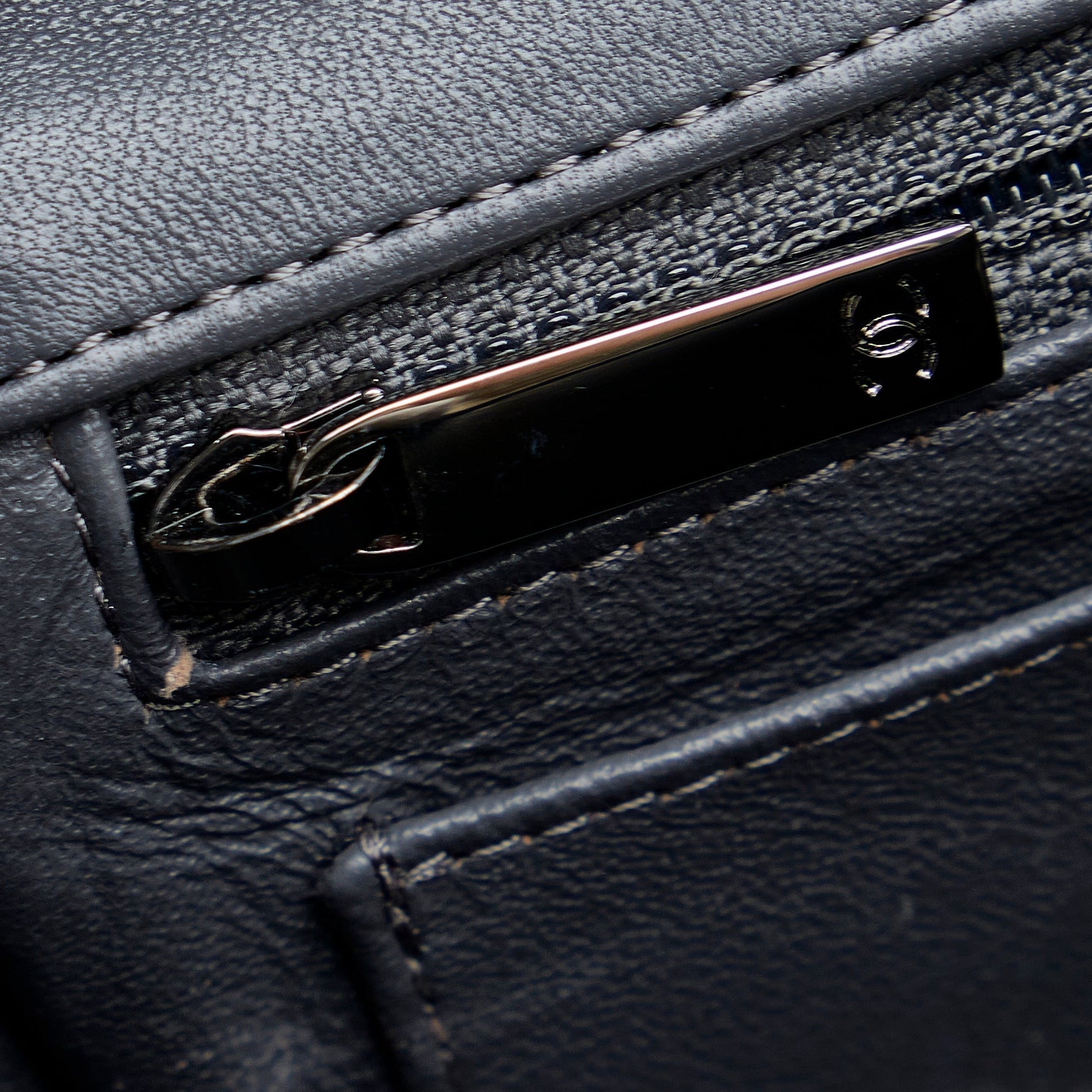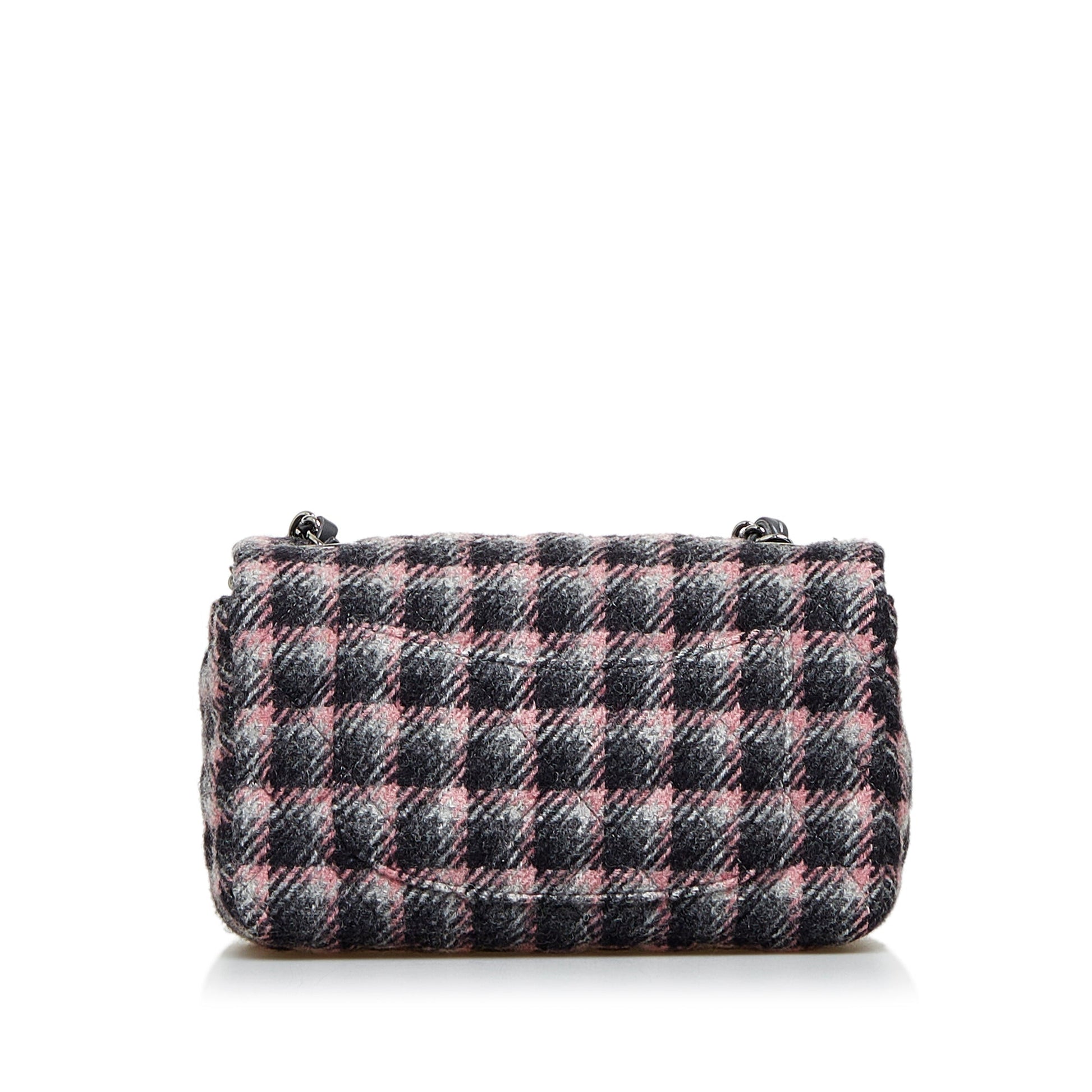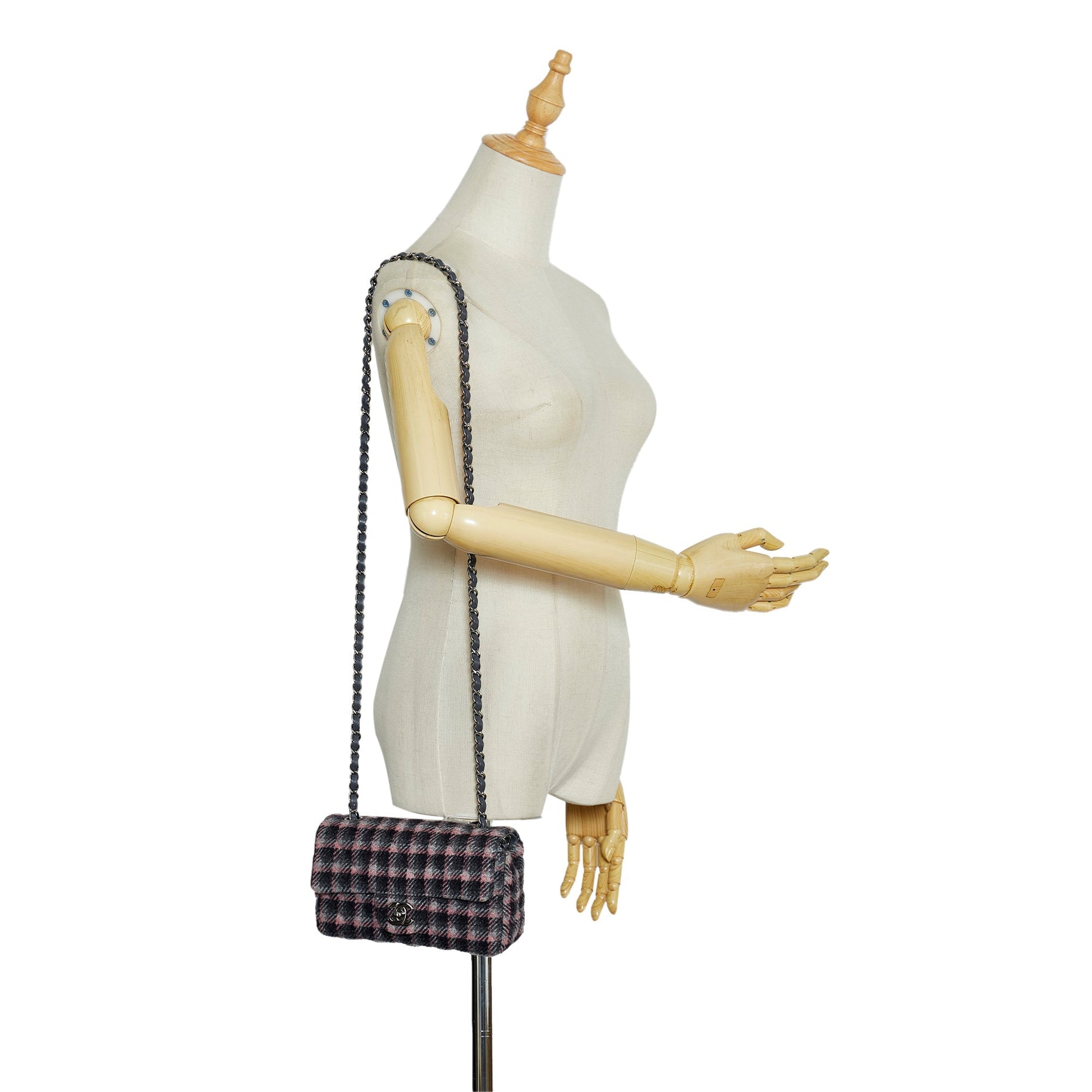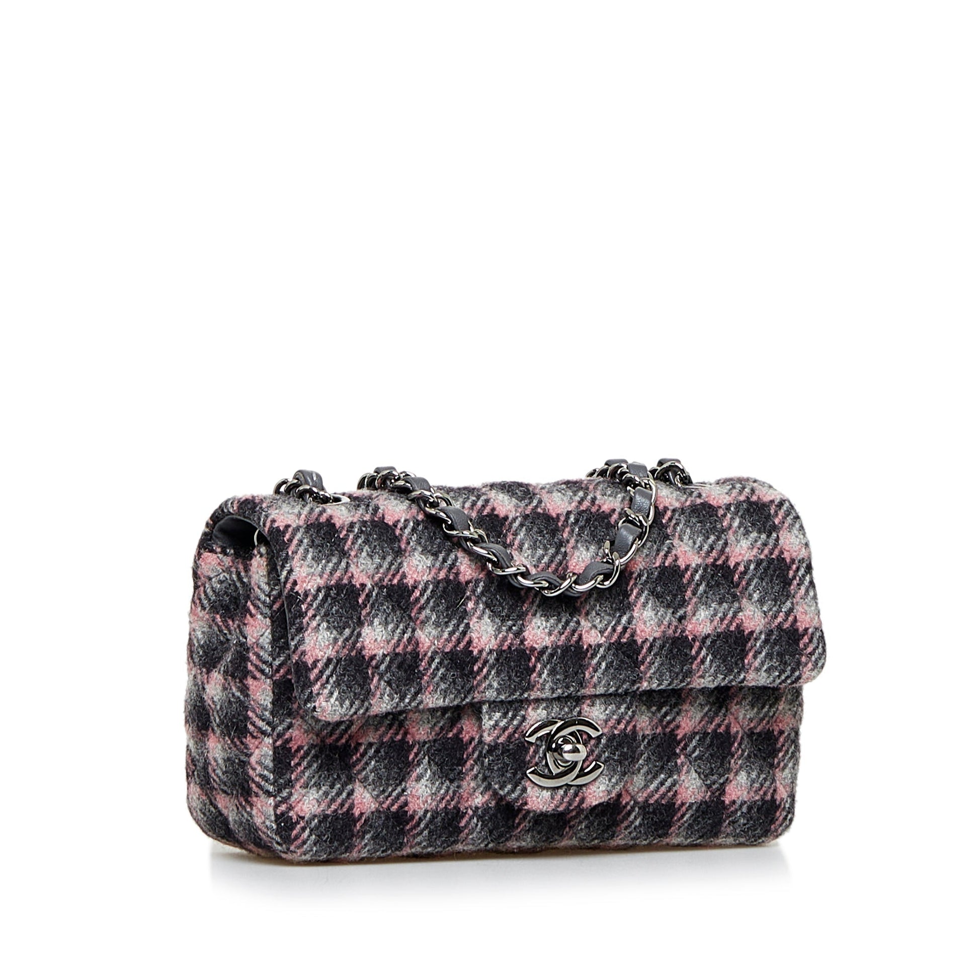 This beautiful shoulder bag from Chanel features a quilted wool body with tweed trim, an exterior pocket on the outside back, a flat leather strap, a flap with a twist closure, and zippered and slip pockets inside. It can be worn loosely over the shoulder.