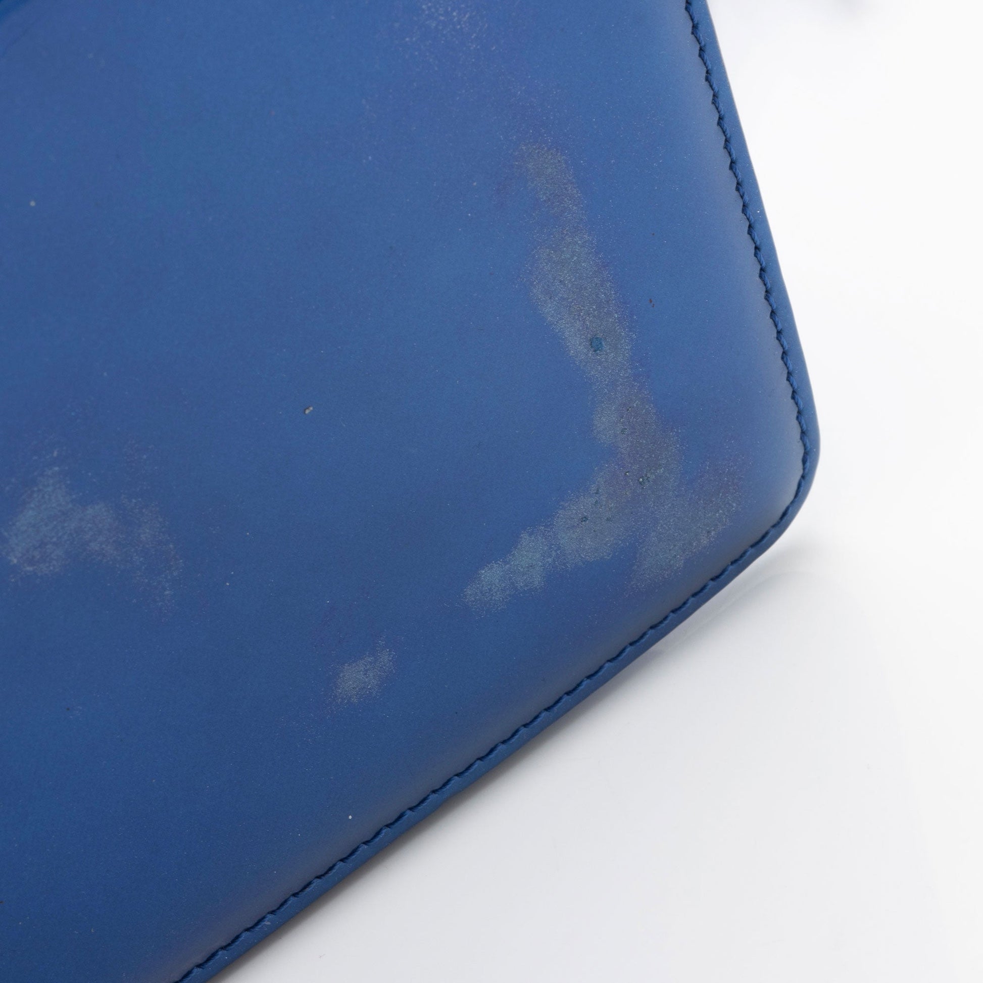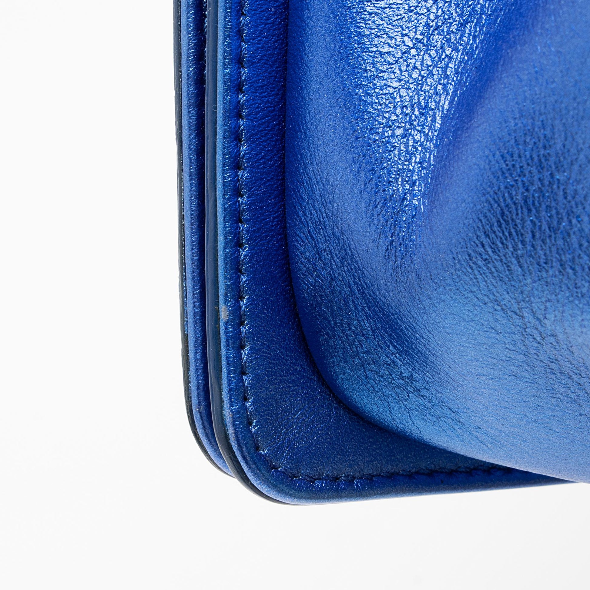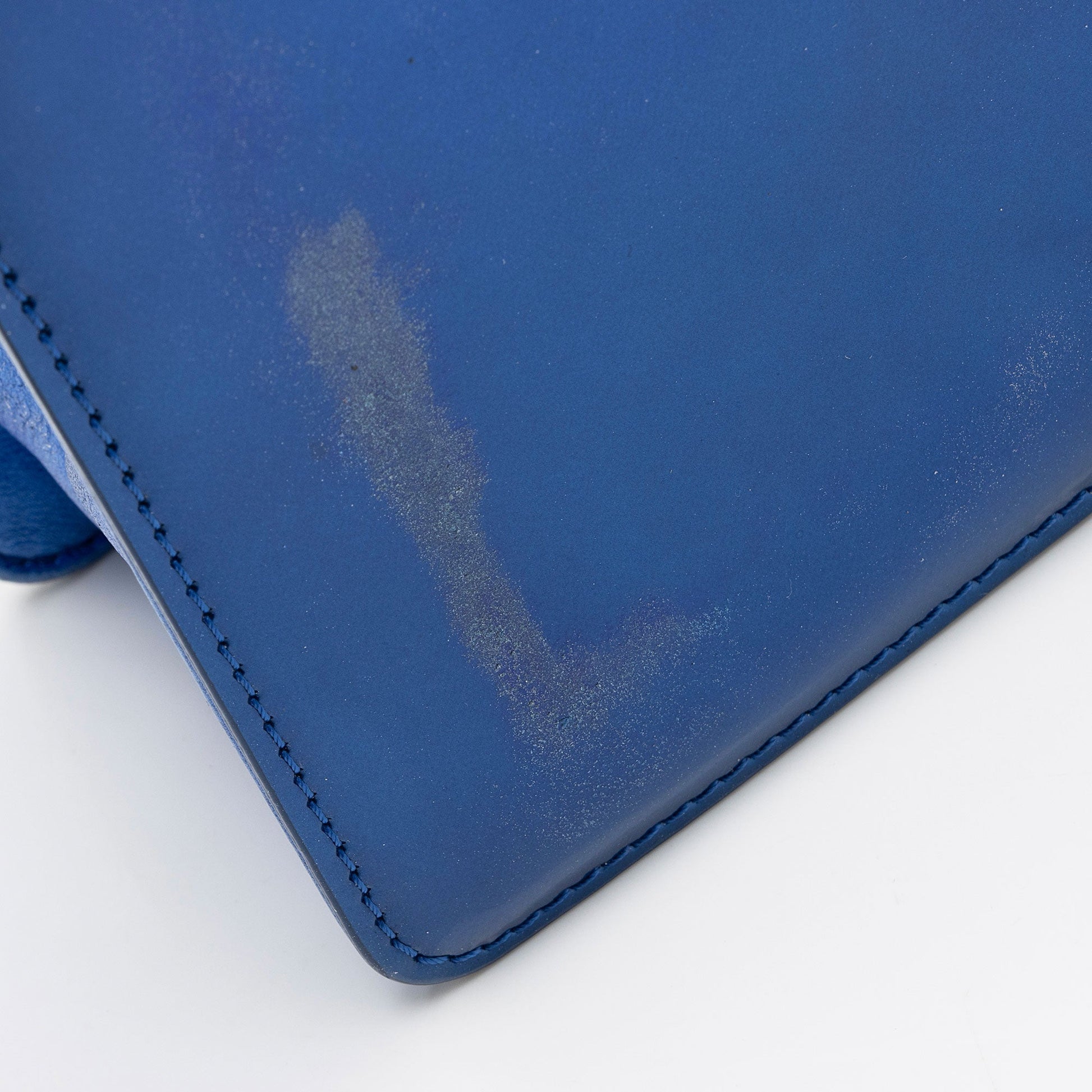 Condition Notes: Visible scuffs and wear throughout exterior edges and corners. Moderate scuffs and discoloration on interior of shoulder strap. Scuffs and marks throughout exterior. Surface scratches to hardware. Heavy scuffs and discoloration throughout interior front leather and interior flap. Light marks and glitter throughout interior.