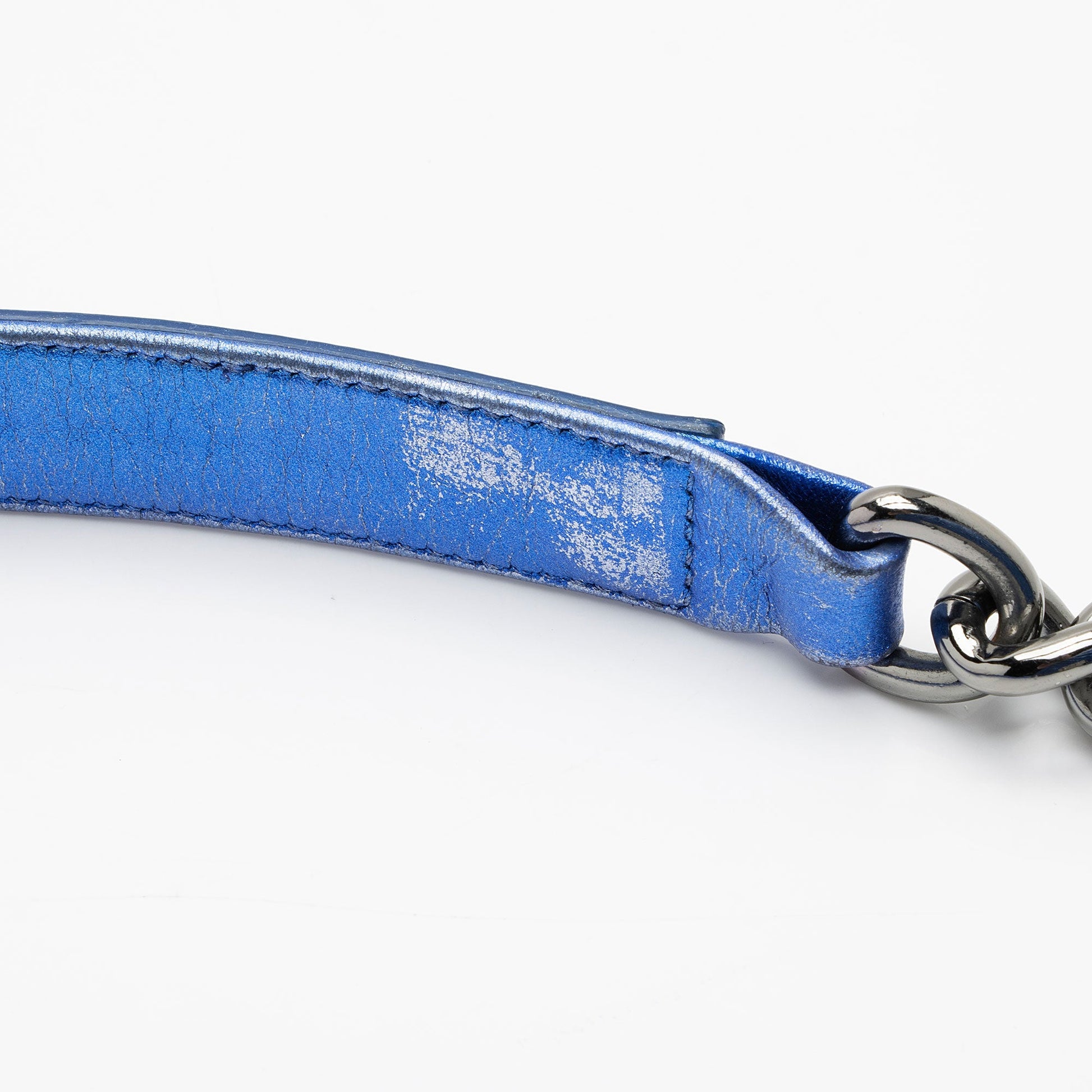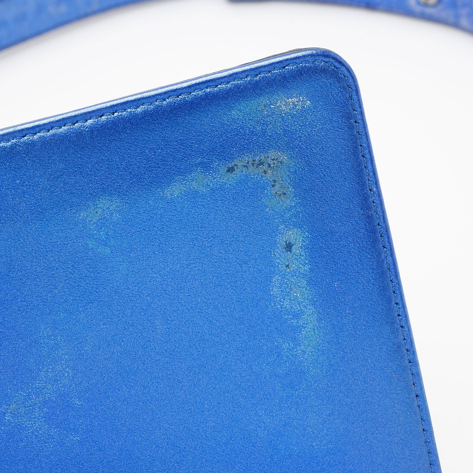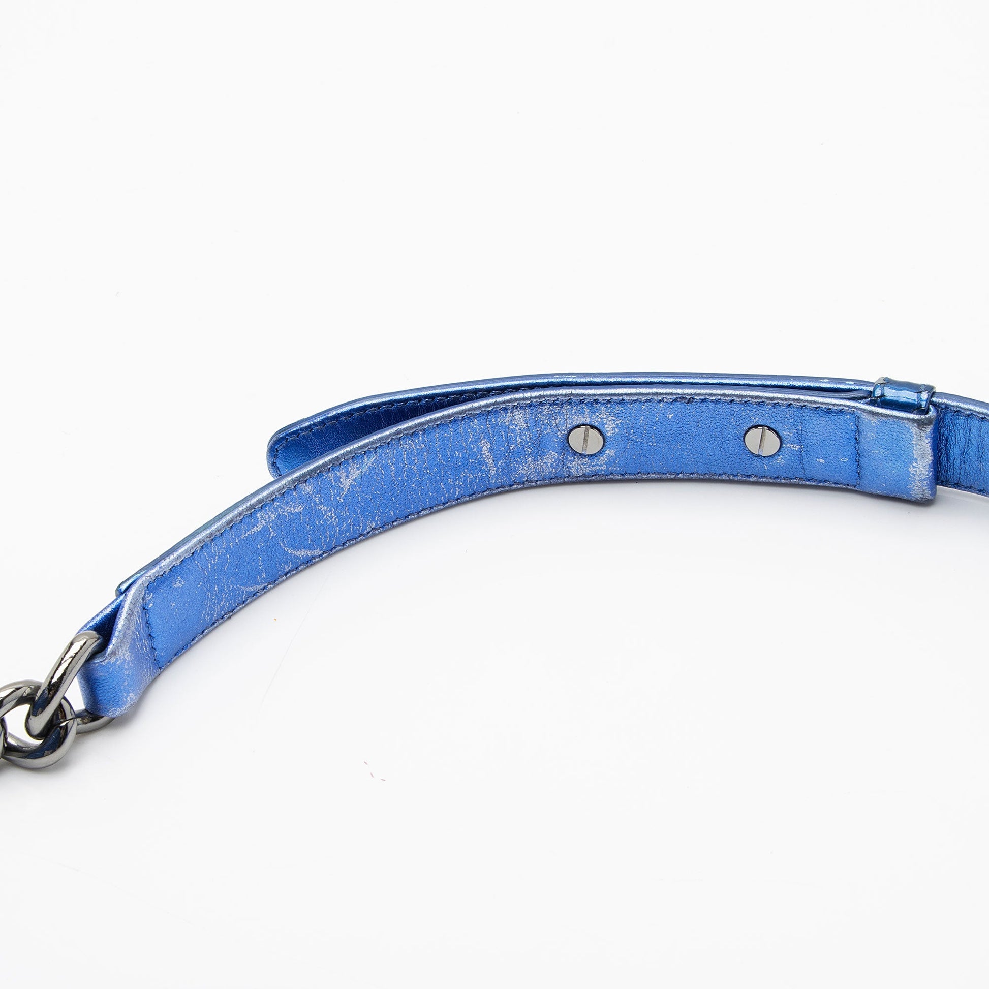 Condition Notes: Visible scuffs and wear throughout exterior edges and corners. Moderate scuffs and discoloration on interior of shoulder strap. Scuffs and marks throughout exterior. Surface scratches to hardware. Heavy scuffs and discoloration throughout interior front leather and interior flap. Light marks and glitter throughout interior.