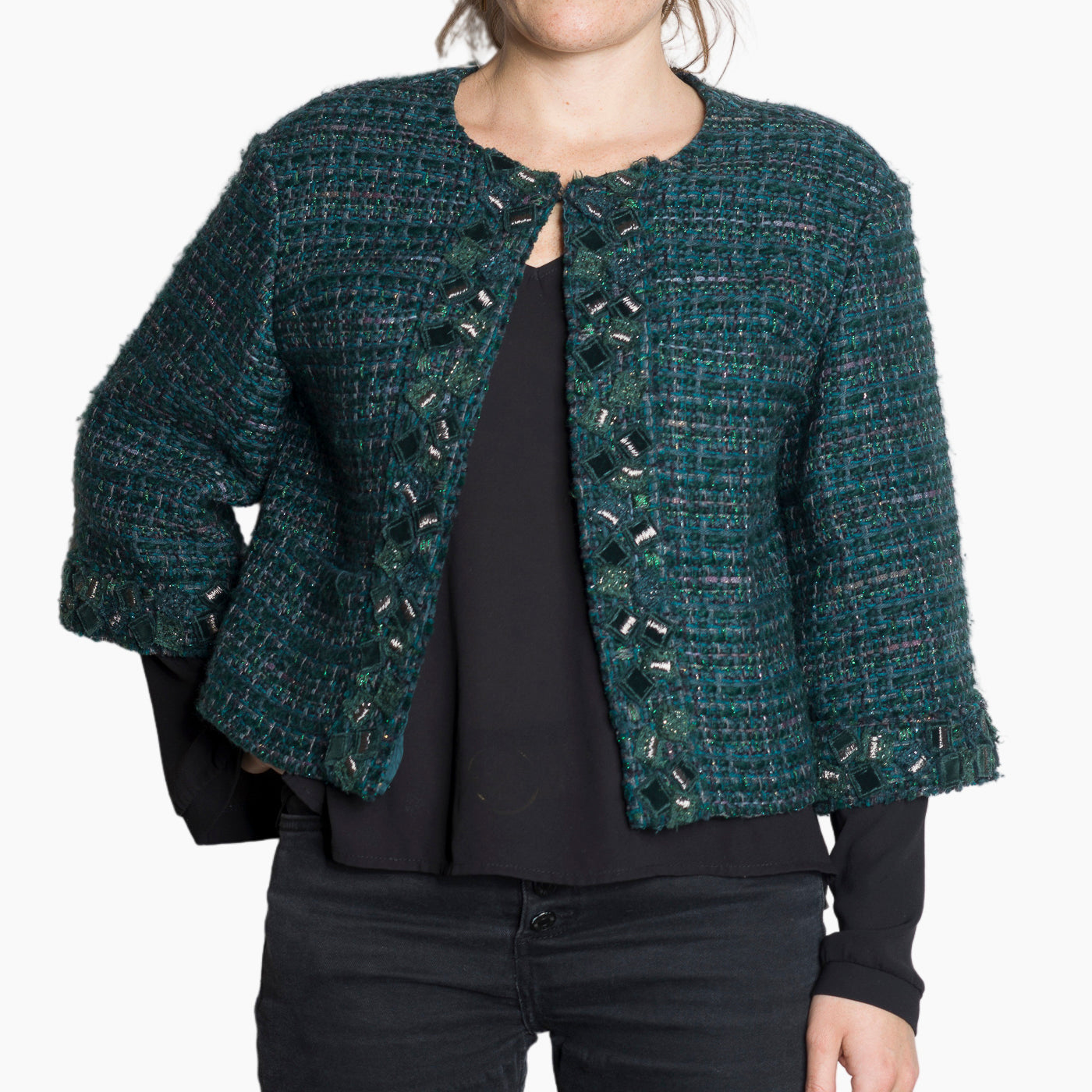 DESCRIPTION: Tweed jacket with silver iridescent treads