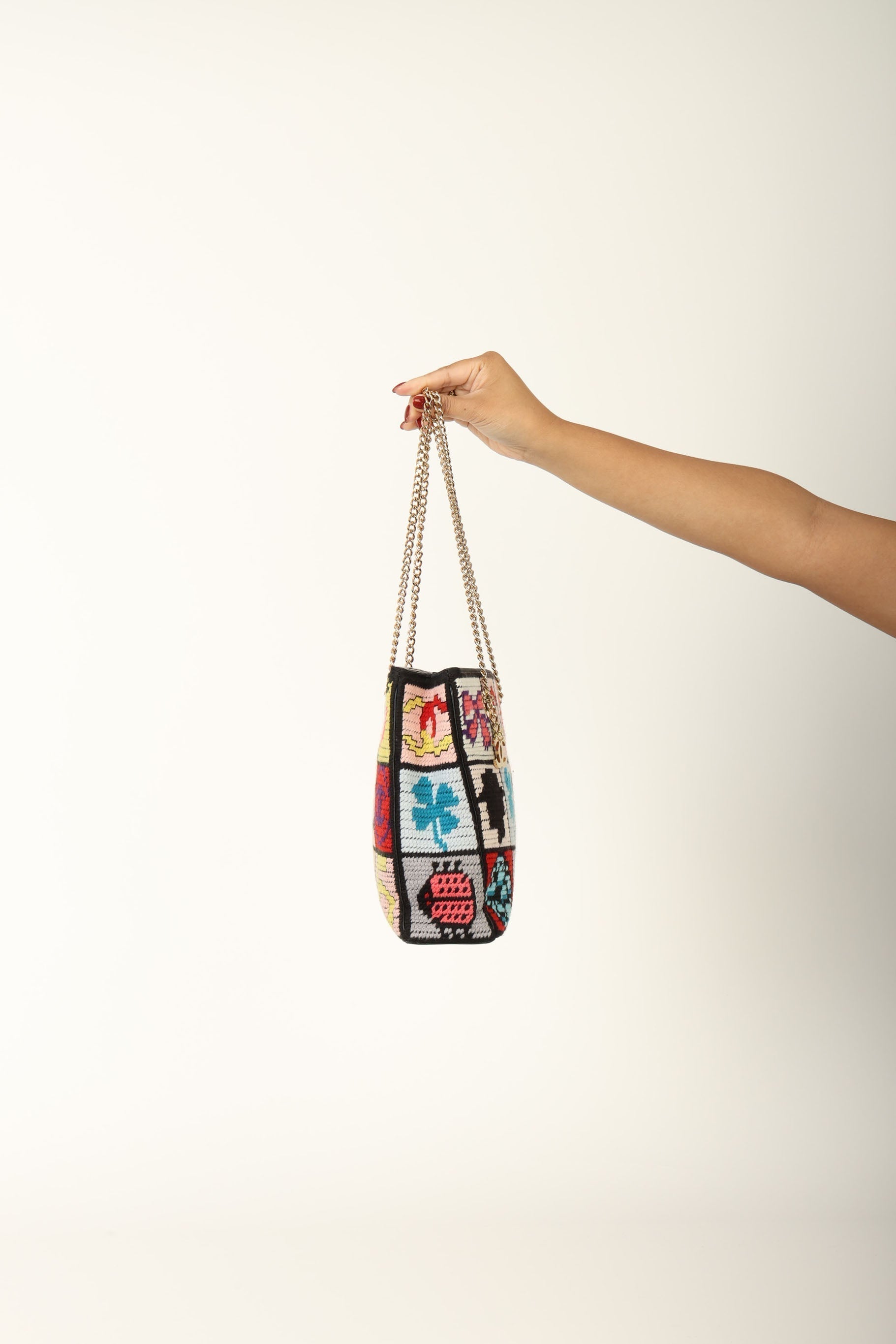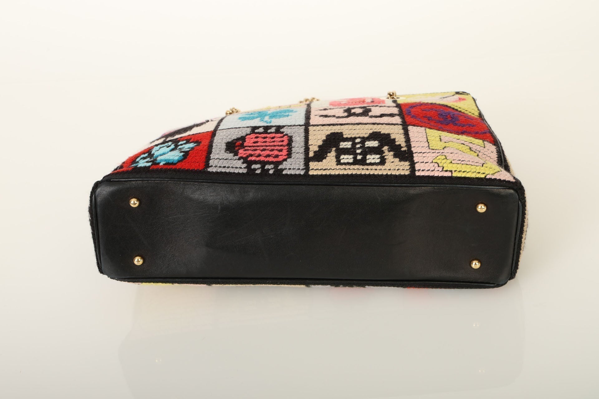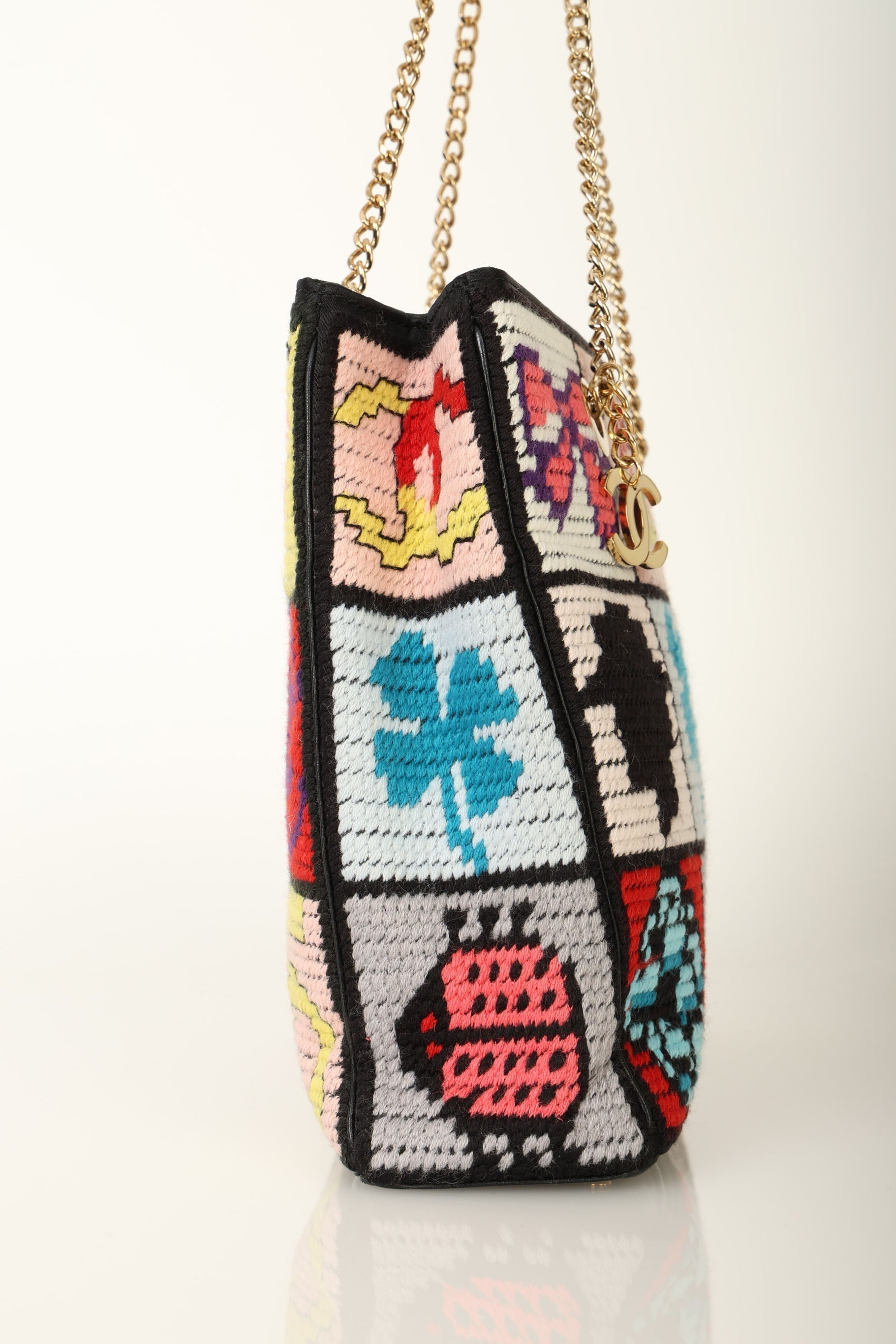 Presenting the perfect Chanel chain tote that gives the best grandma energy! The needlepoint icon designs are whimsical and playful, and will bring fun color to your collection.