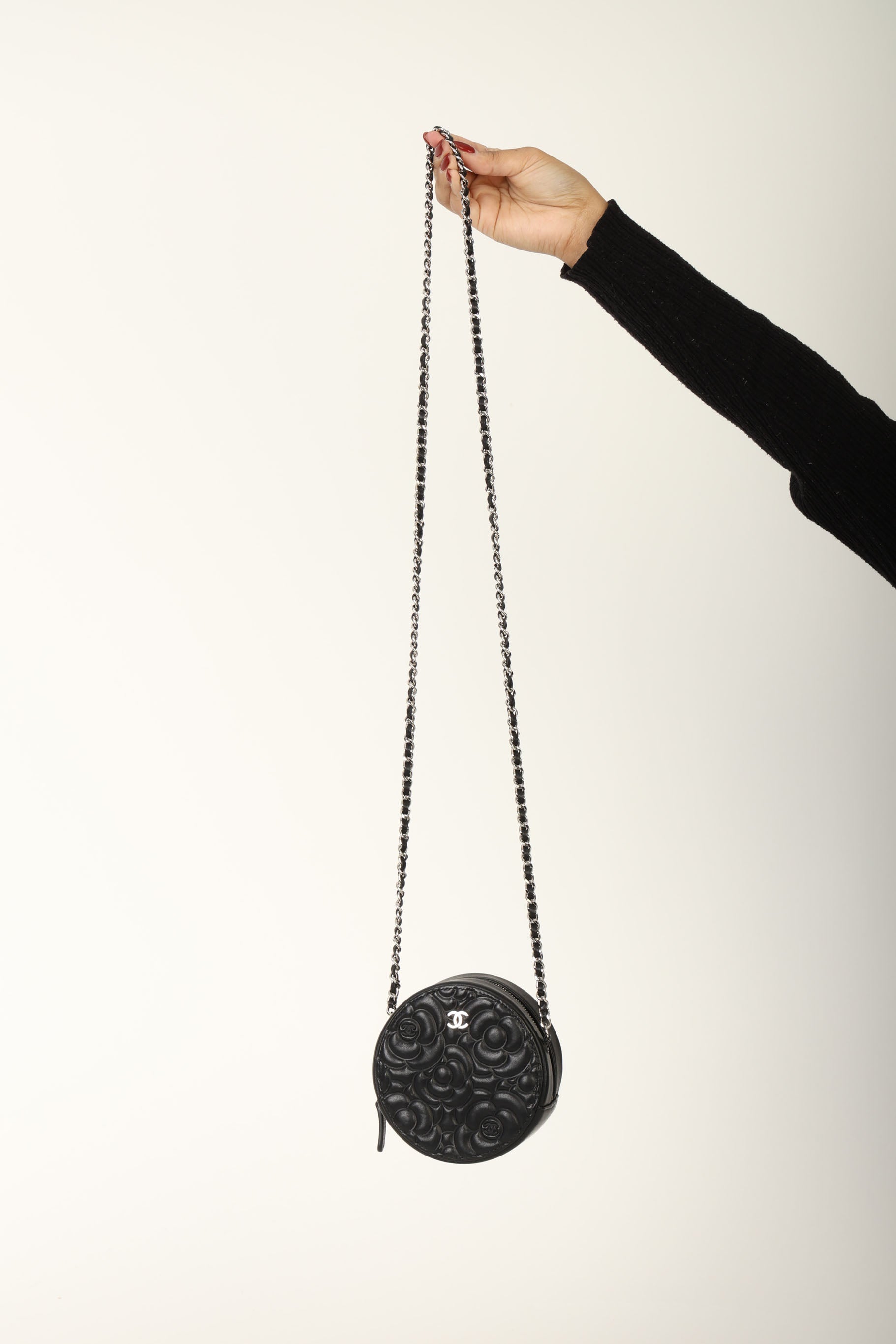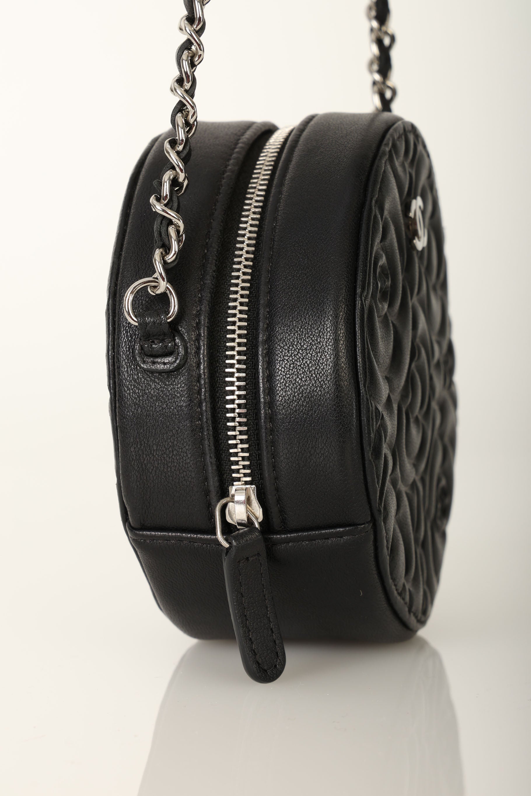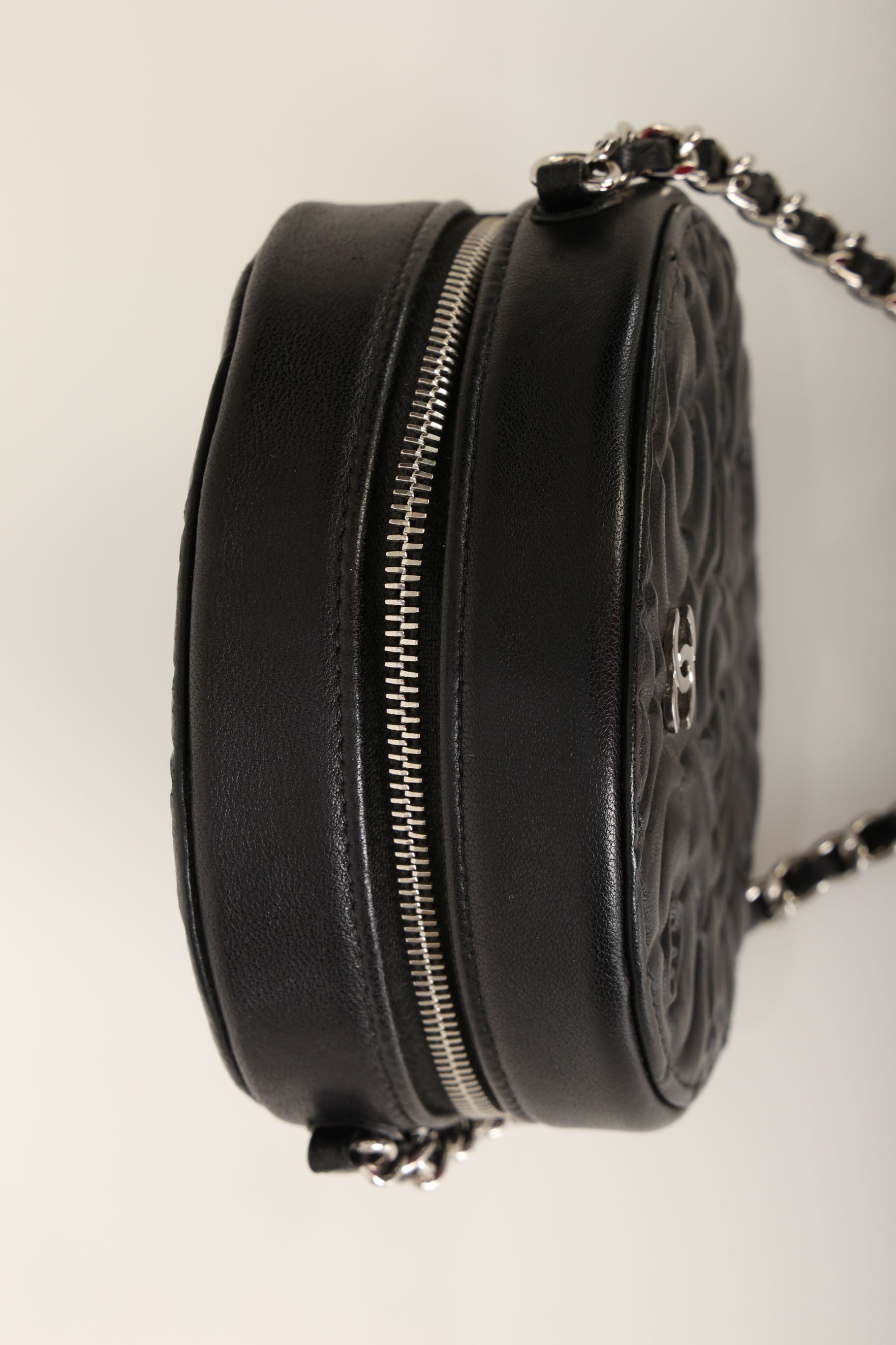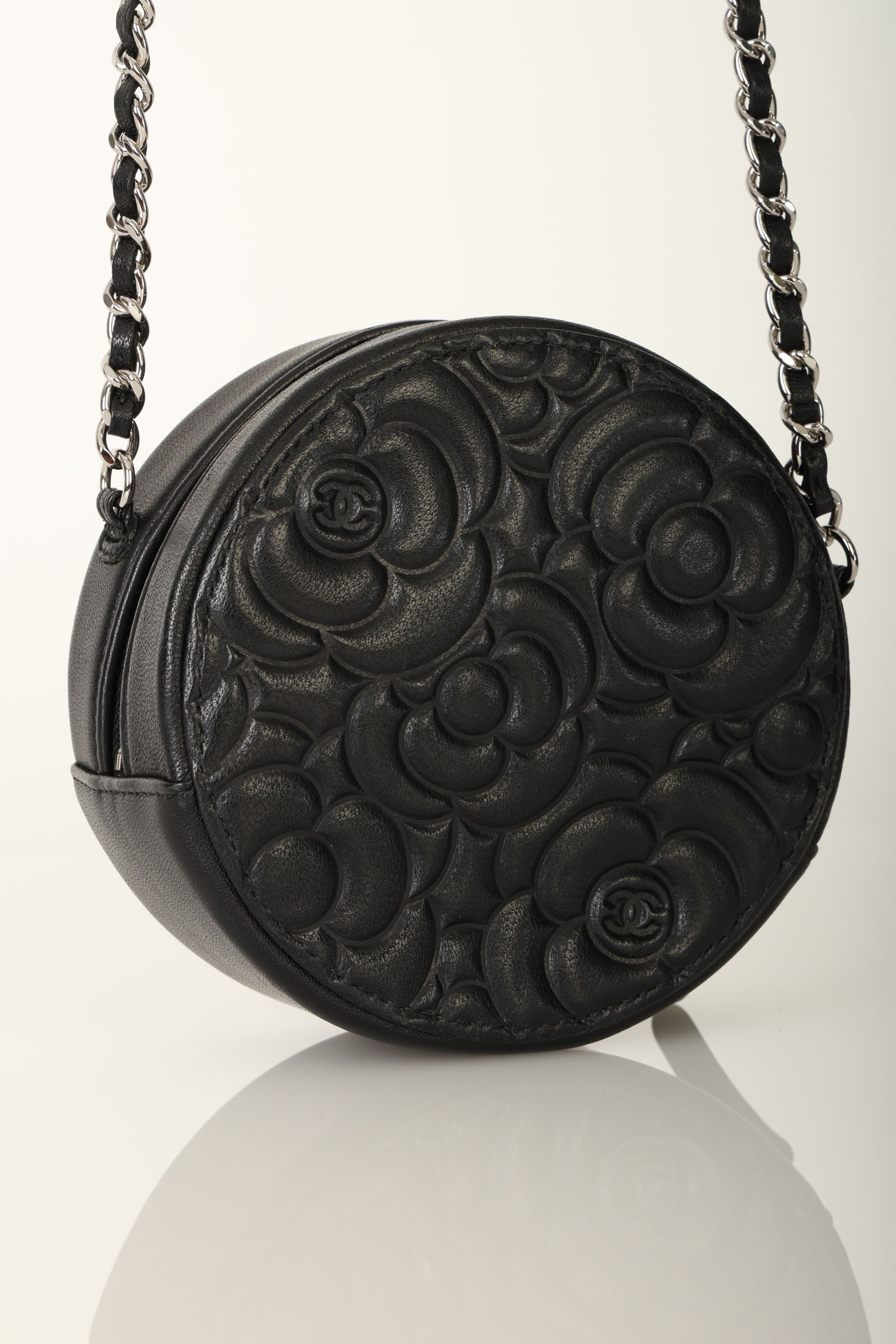 The cutest black Chanel goatskin and silver hardware crossbody - perfect for traveling or fun Spring/Summer events! The embossed camellias make such a beautiful statement, and will complement any outfit!