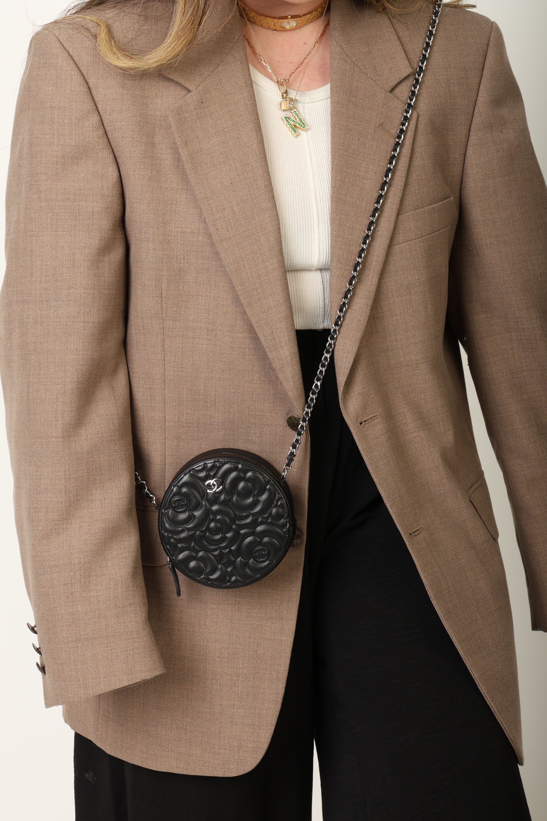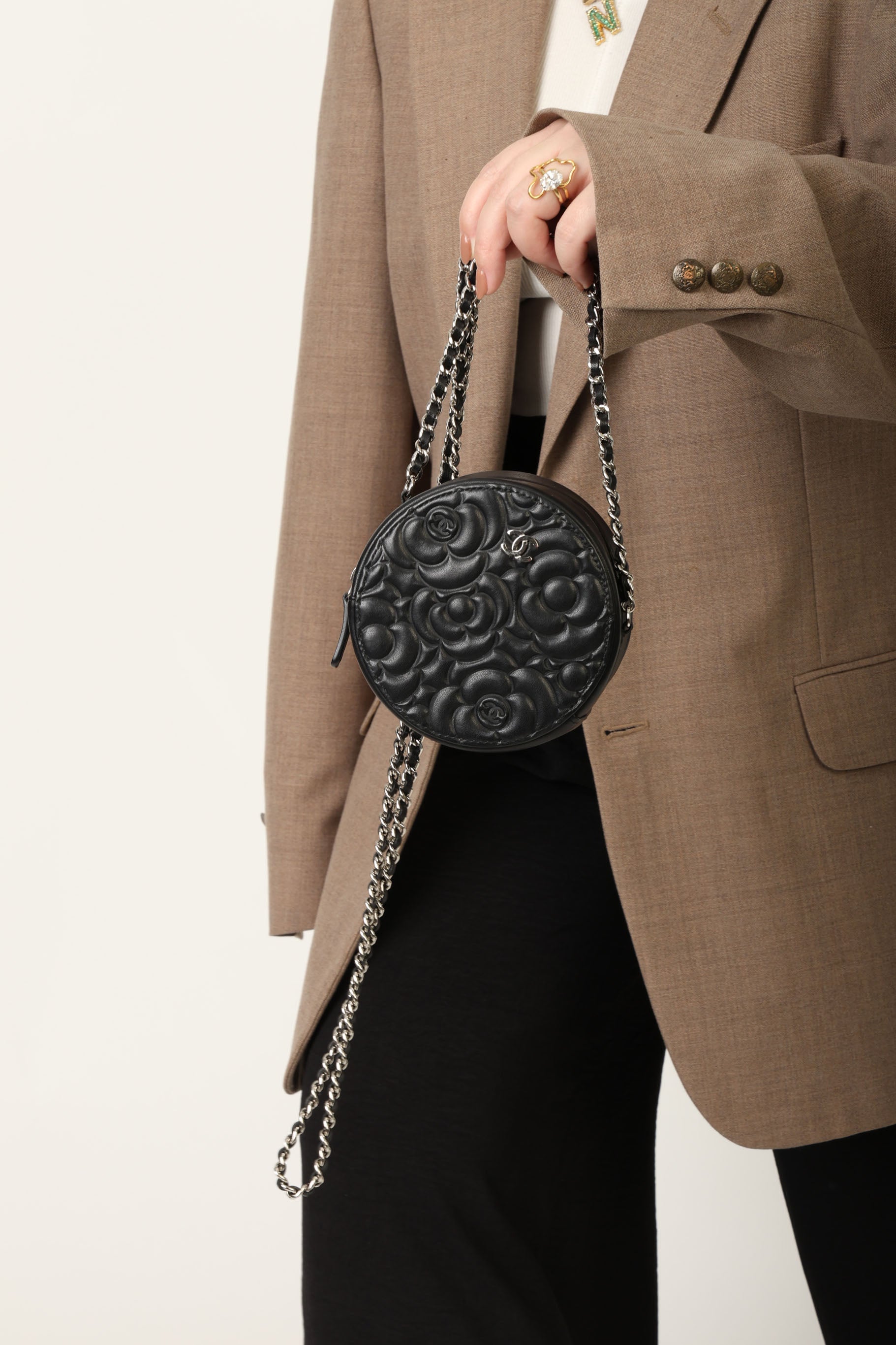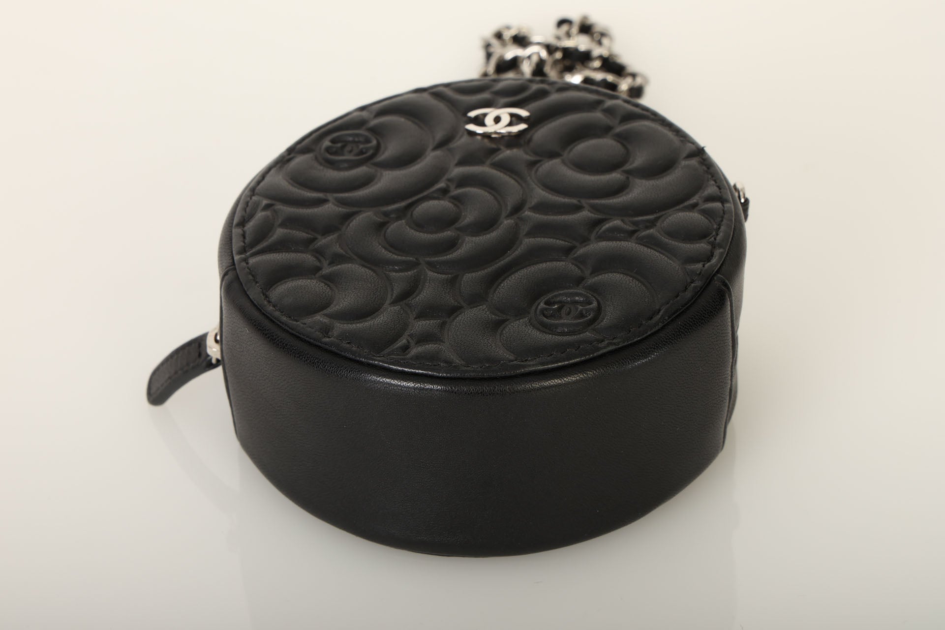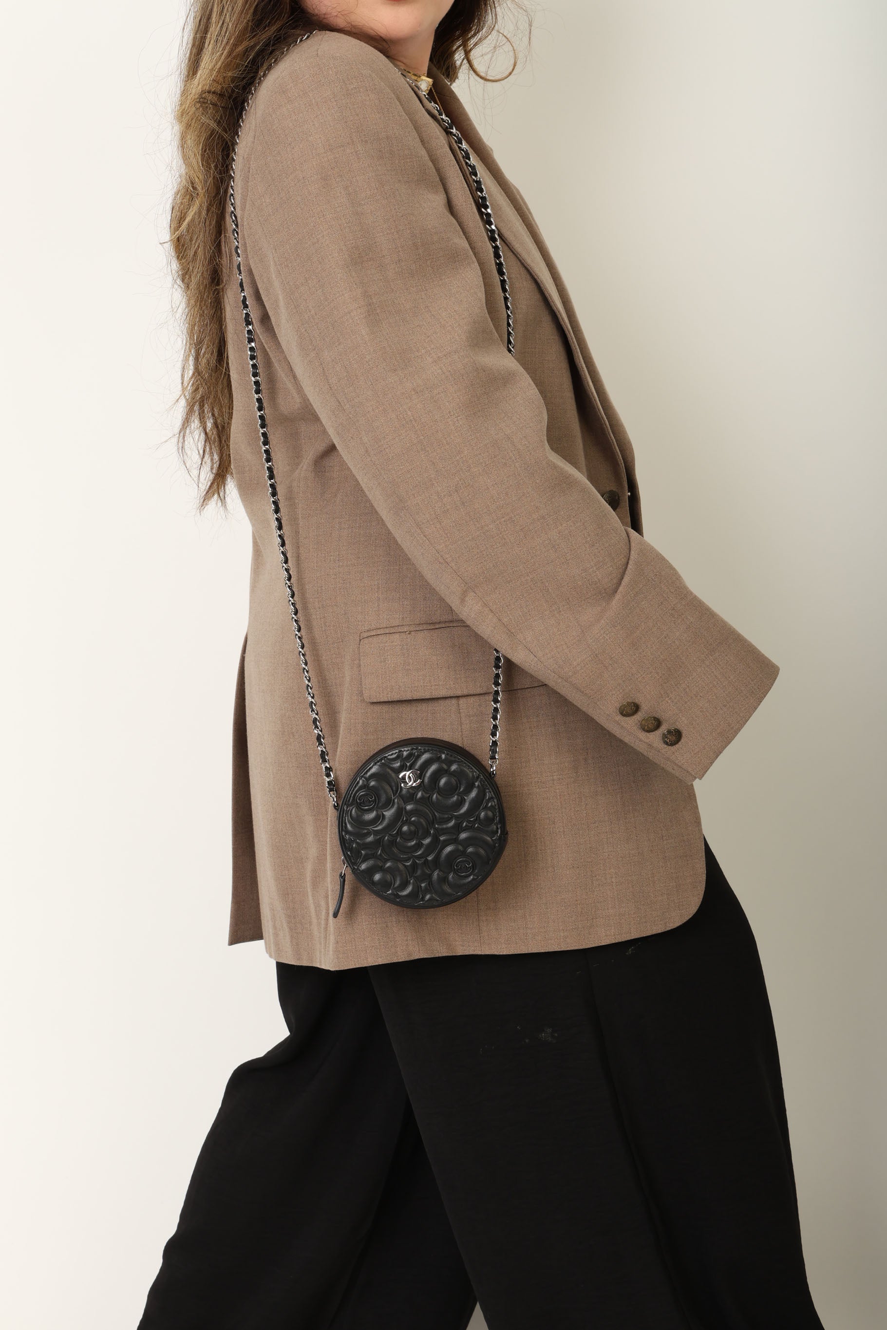 The cutest black Chanel goatskin and silver hardware crossbody - perfect for traveling or fun Spring/Summer events! The embossed camellias make such a beautiful statement, and will complement any outfit!