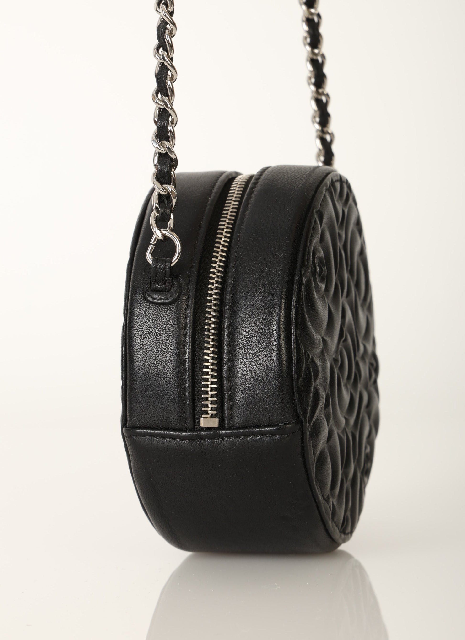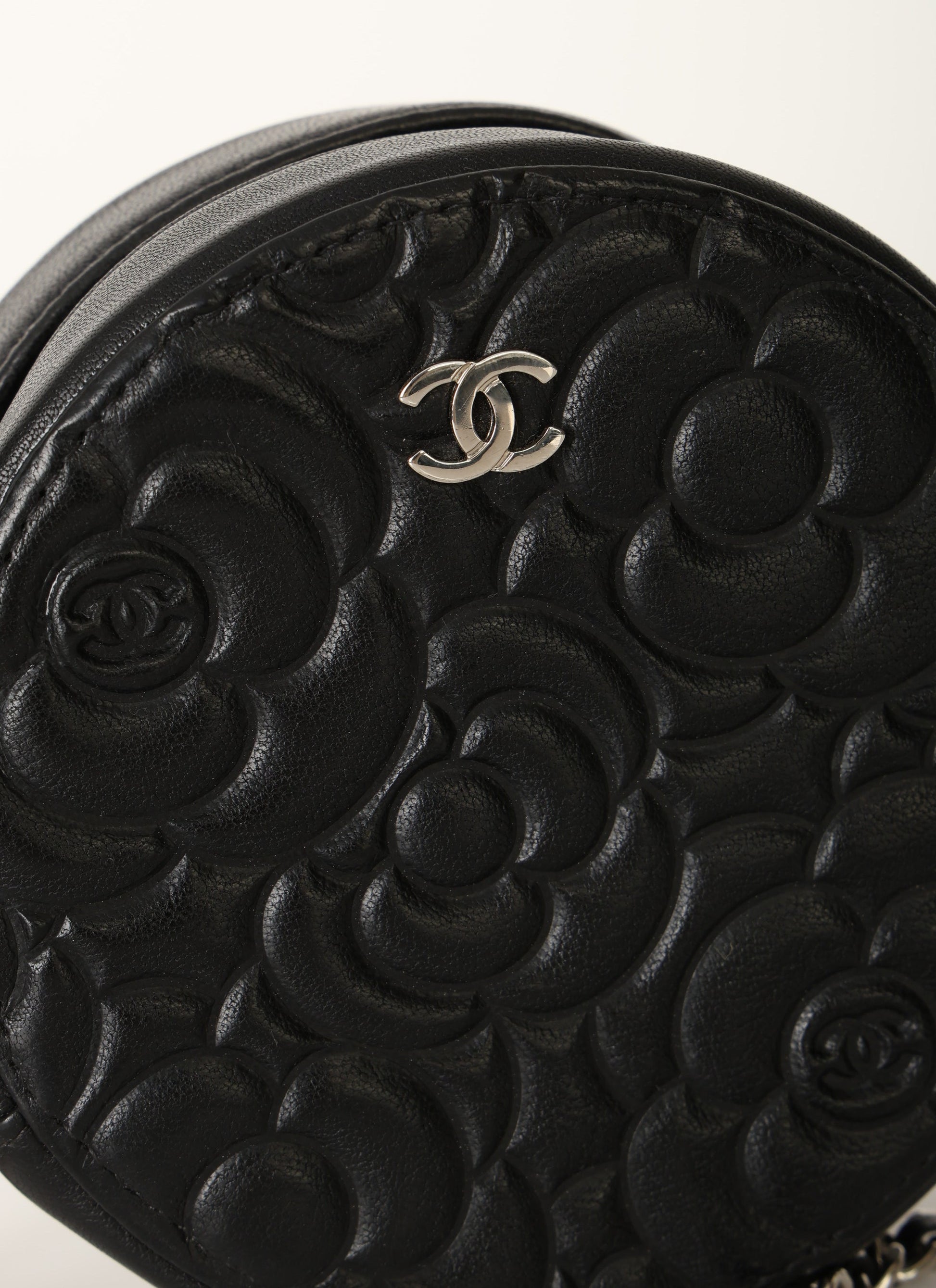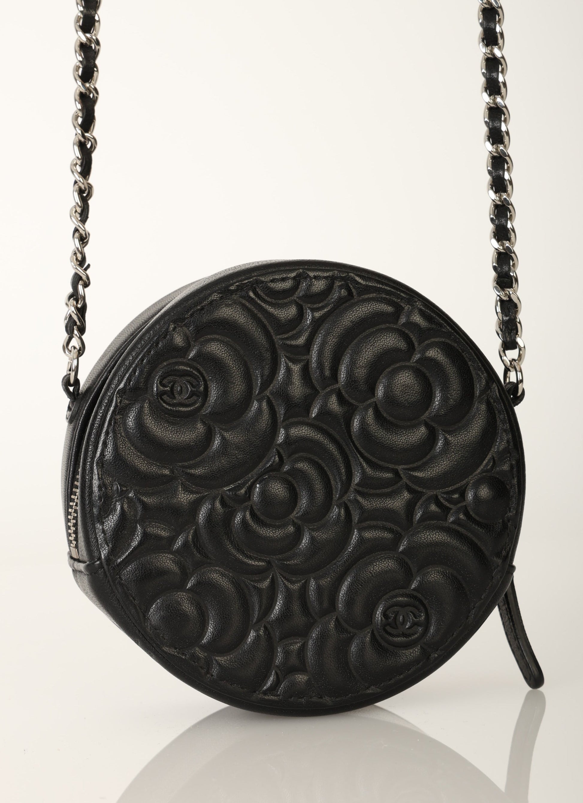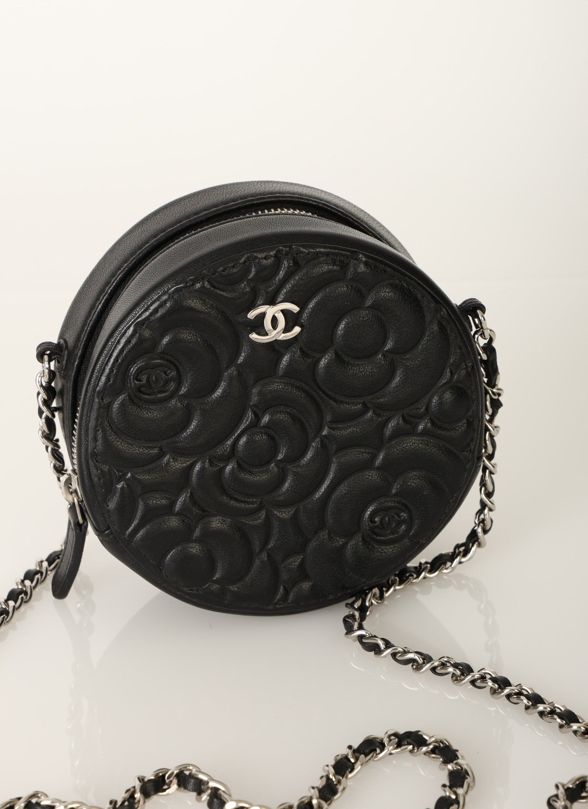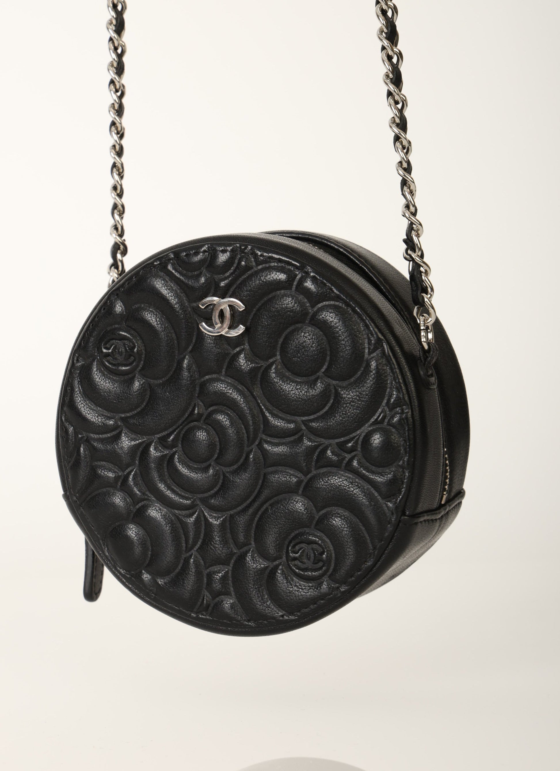 Dropping in the shop is a stunning Chanel Lambskin Camellia Mini Crossbody bag in black with silver hardware! This is a great piece to grab on a night out or any special event. Gorgeous camellia flowers are embossed on the lambskin making this such a unique piece. The interior features two smaller pockets and one large compartment.?You can fit your cards, keys, key pouch, and a few other smaller essentials.?