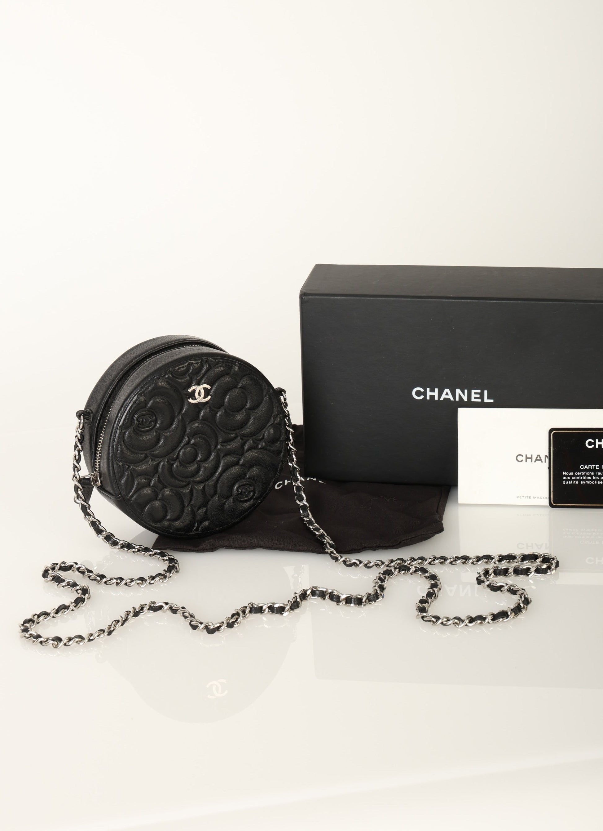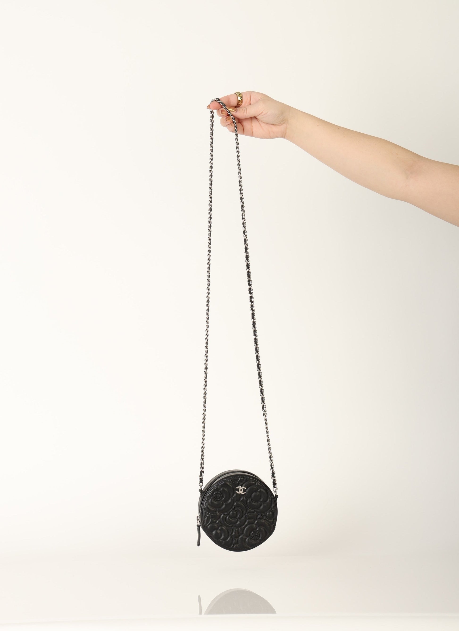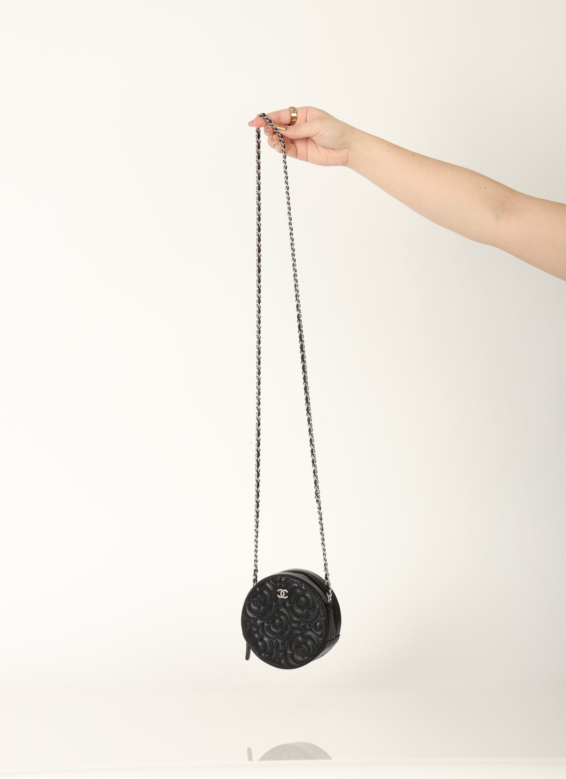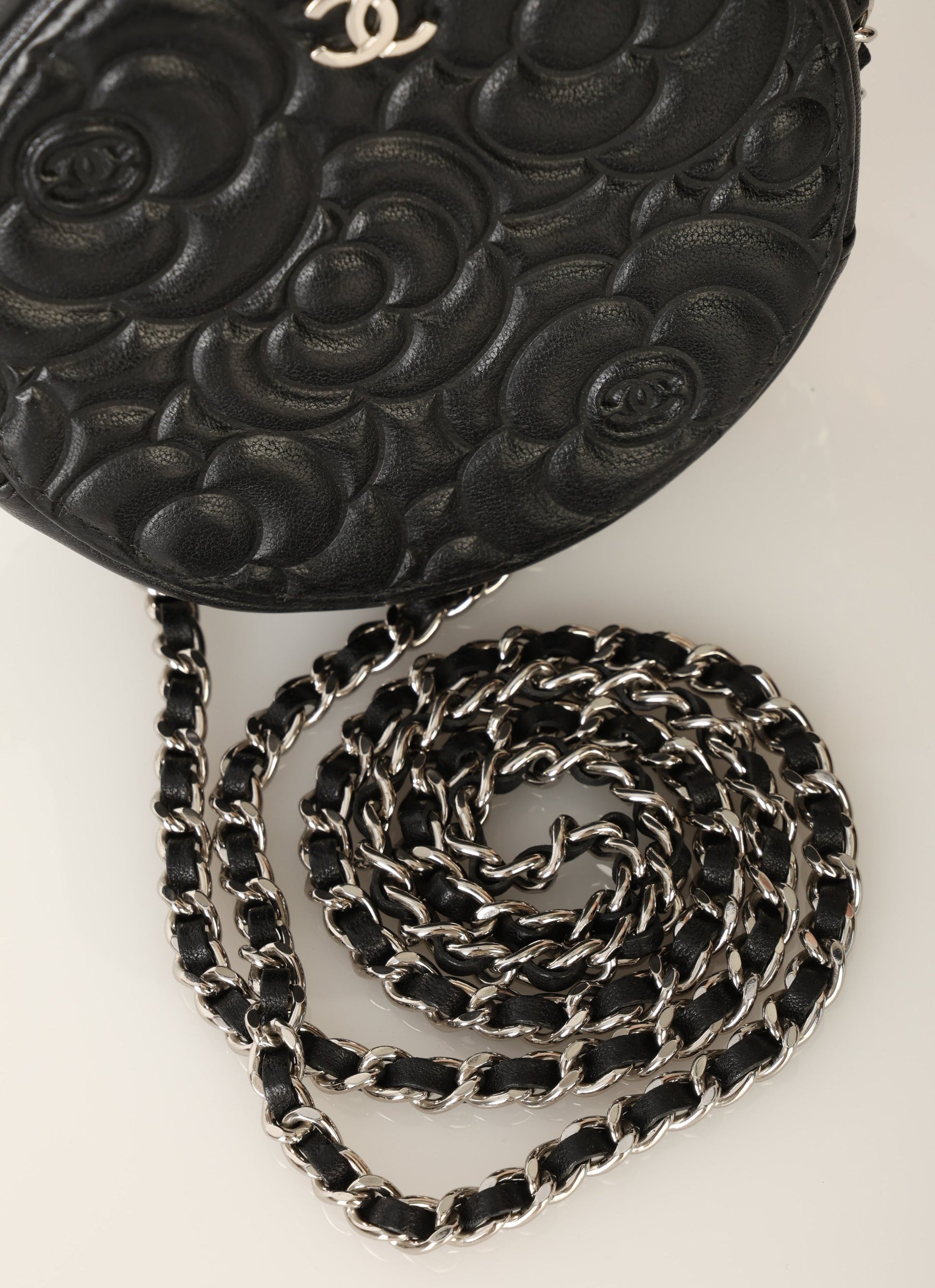 Dropping in the shop is a stunning Chanel Lambskin Camellia Mini Crossbody bag in black with silver hardware! This is a great piece to grab on a night out or any special event. Gorgeous camellia flowers are embossed on the lambskin making this such a unique piece. The interior features two smaller pockets and one large compartment.?You can fit your cards, keys, key pouch, and a few other smaller essentials.?