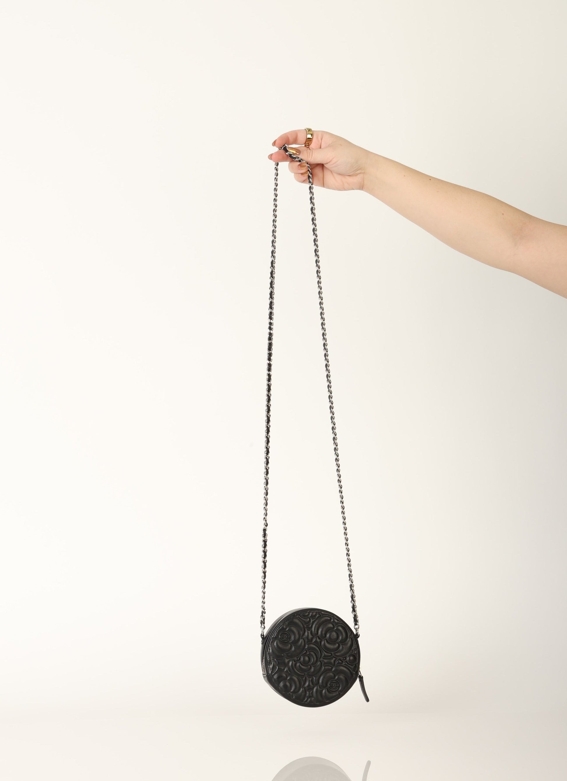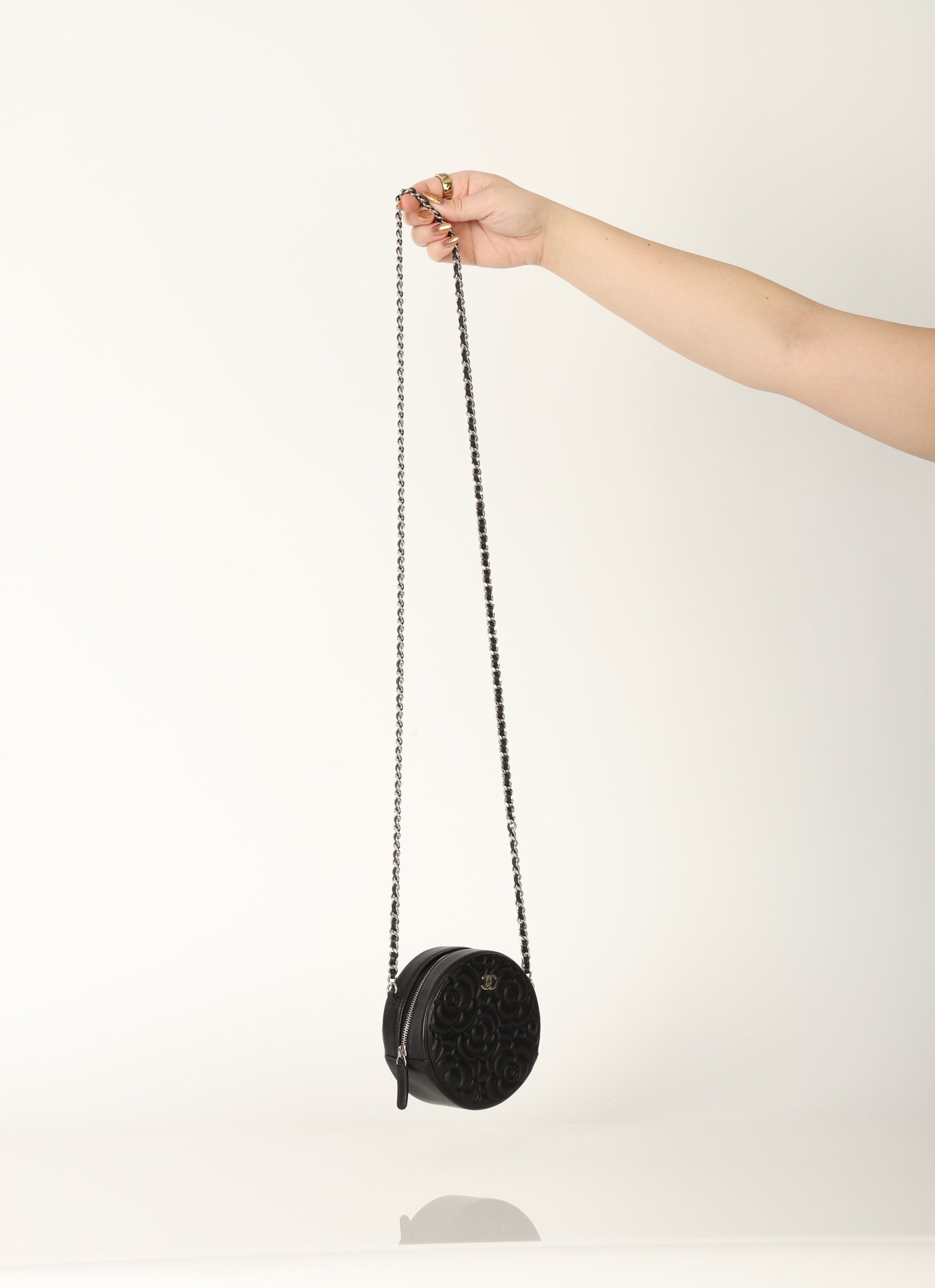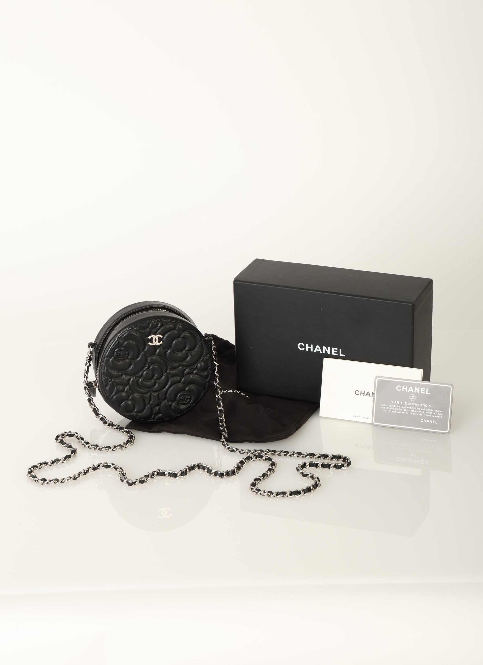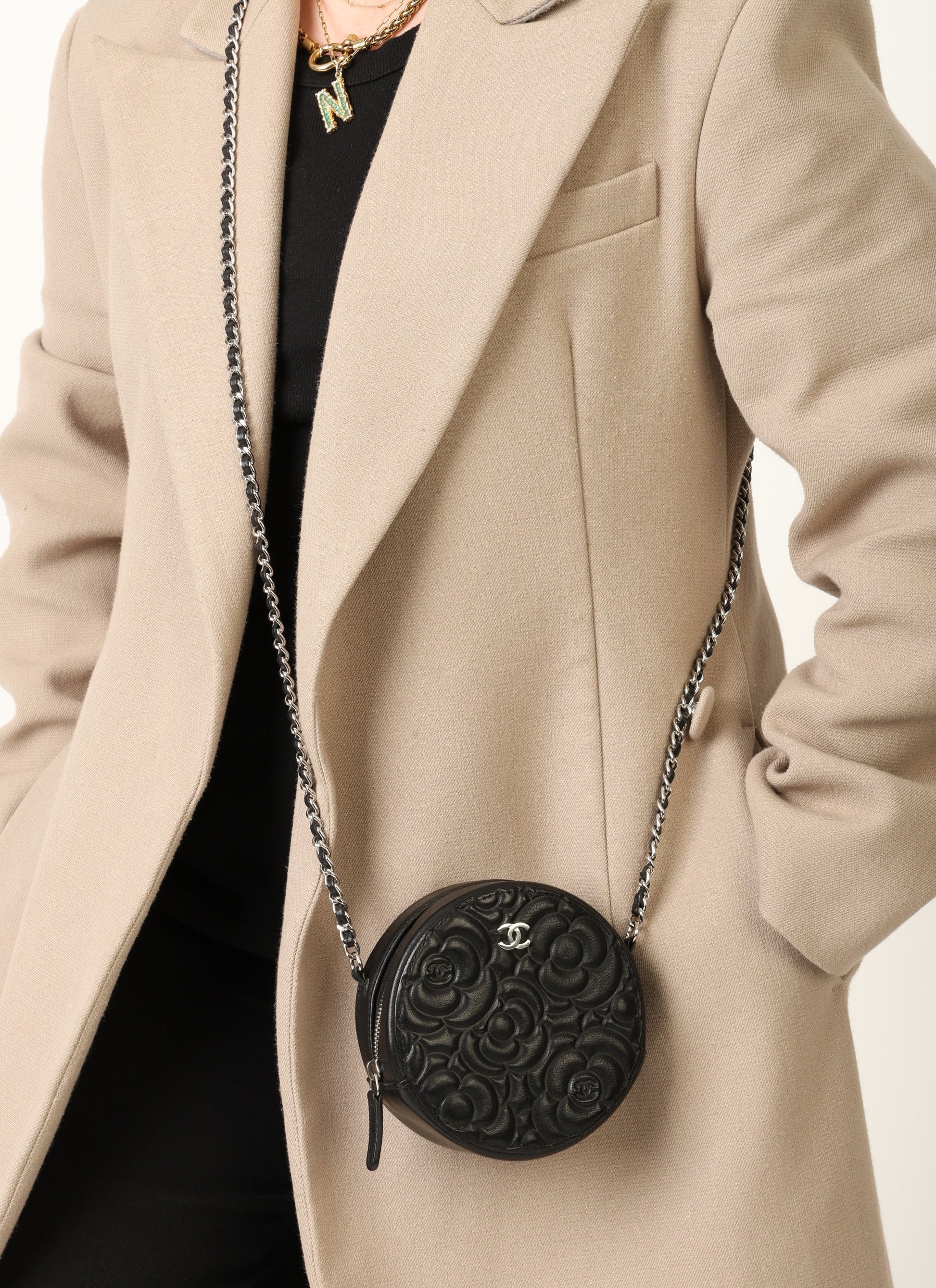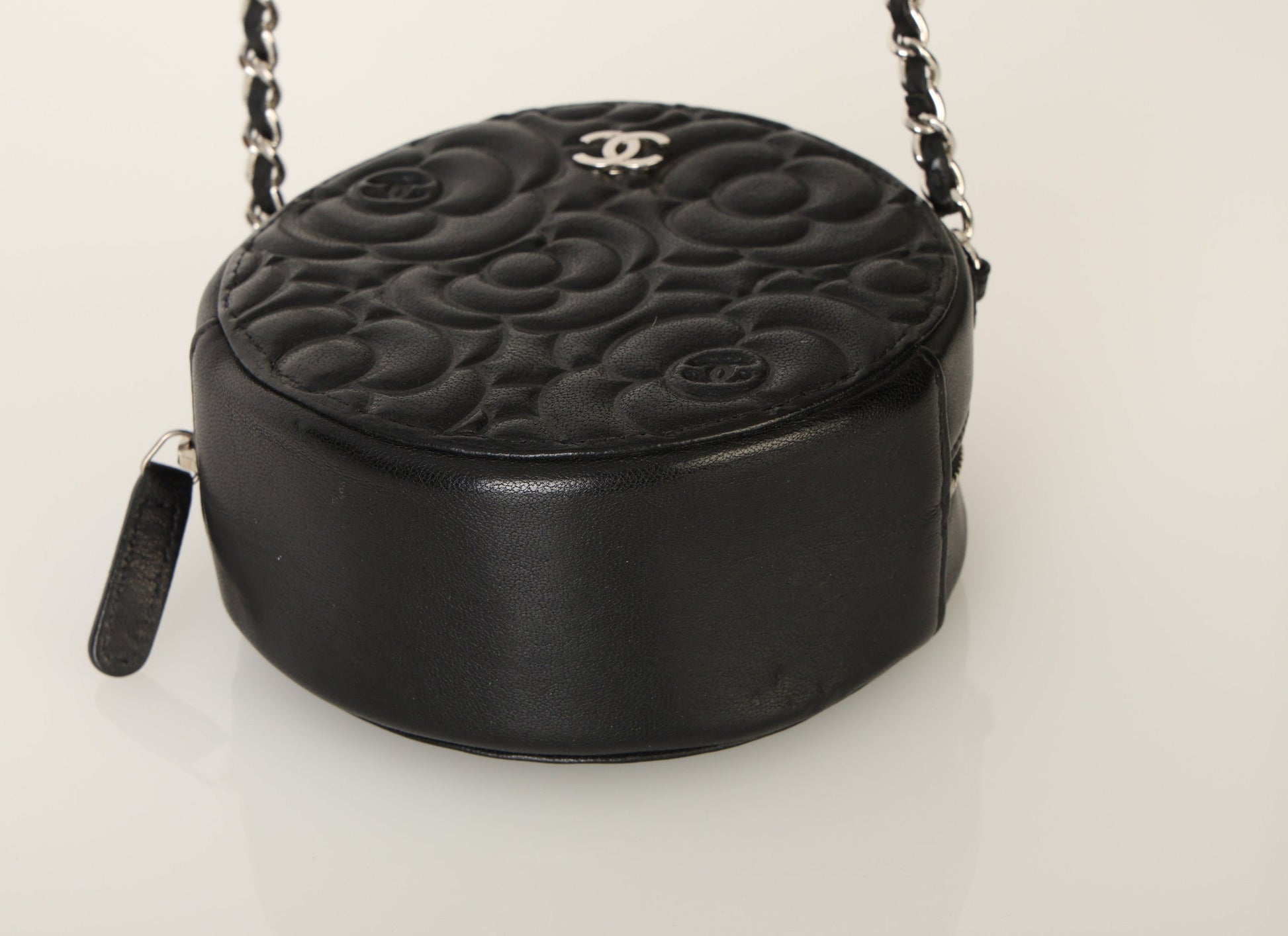 Dropping in the shop is a stunning Chanel Lambskin Camellia Mini Crossbody bag in black with silver hardware! This is a great piece to grab on a night out or any special event. Gorgeous camellia flowers are embossed on the lambskin making this such a unique piece. The interior features two smaller pockets and one large compartment.?You can fit your cards, keys, key pouch, and a few other smaller essentials.?