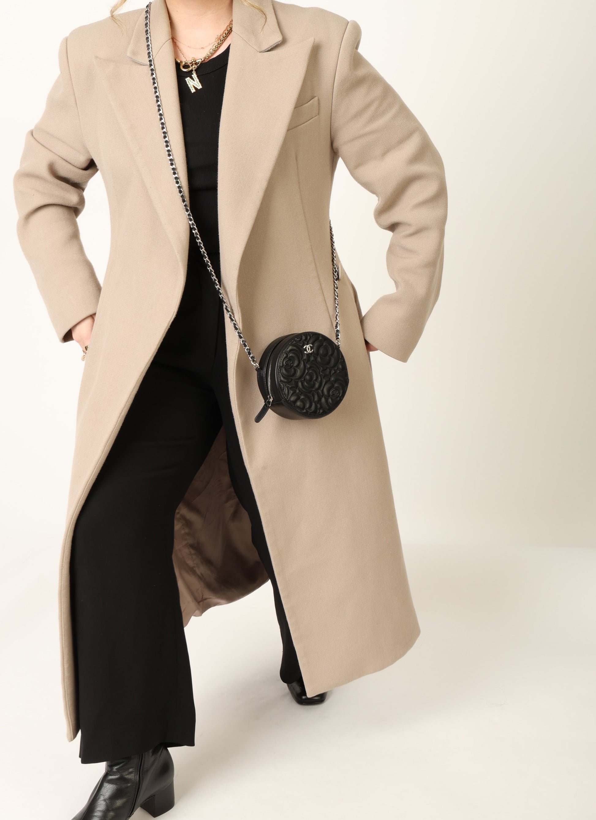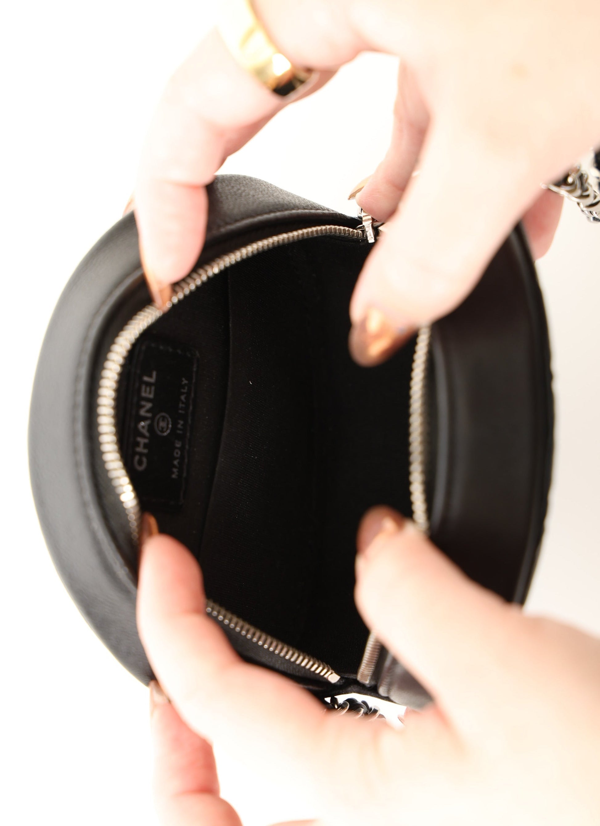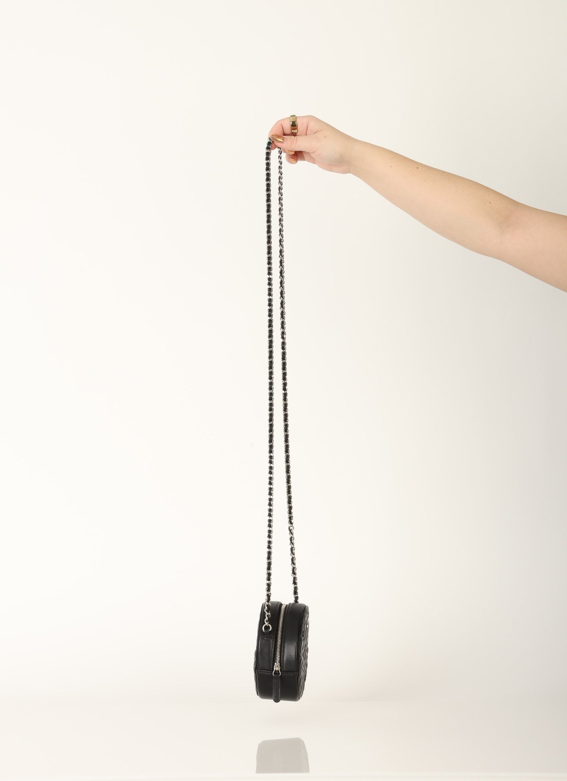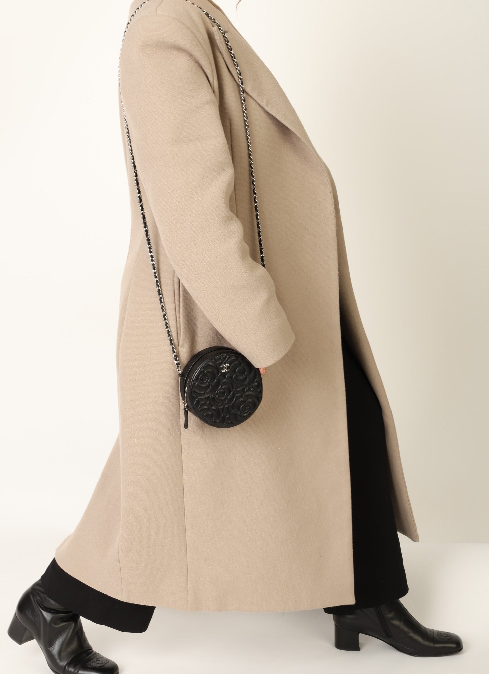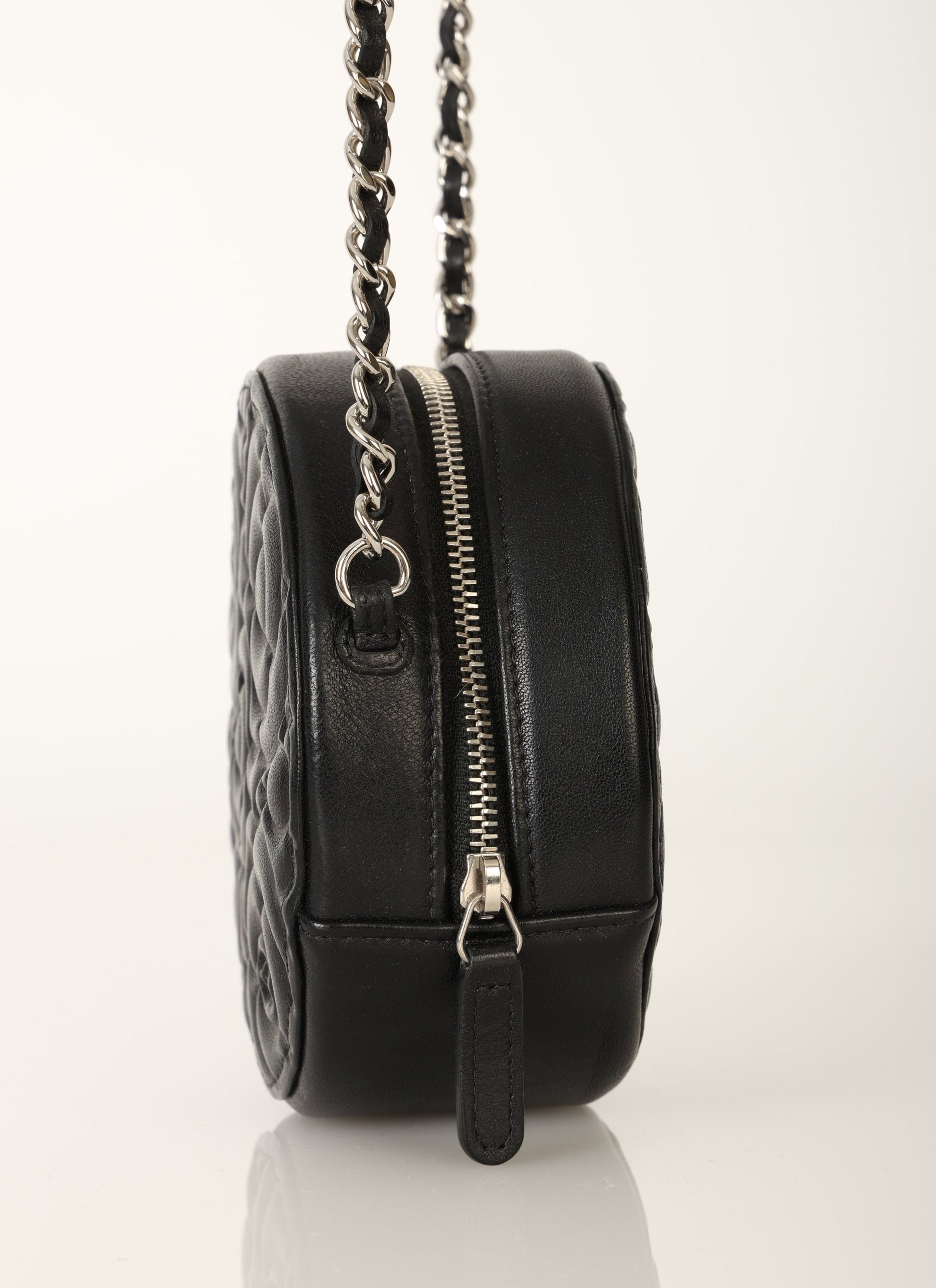 Dropping in the shop is a stunning Chanel Lambskin Camellia Mini Crossbody bag in black with silver hardware! This is a great piece to grab on a night out or any special event. Gorgeous camellia flowers are embossed on the lambskin making this such a unique piece. The interior features two smaller pockets and one large compartment.?You can fit your cards, keys, key pouch, and a few other smaller essentials.?