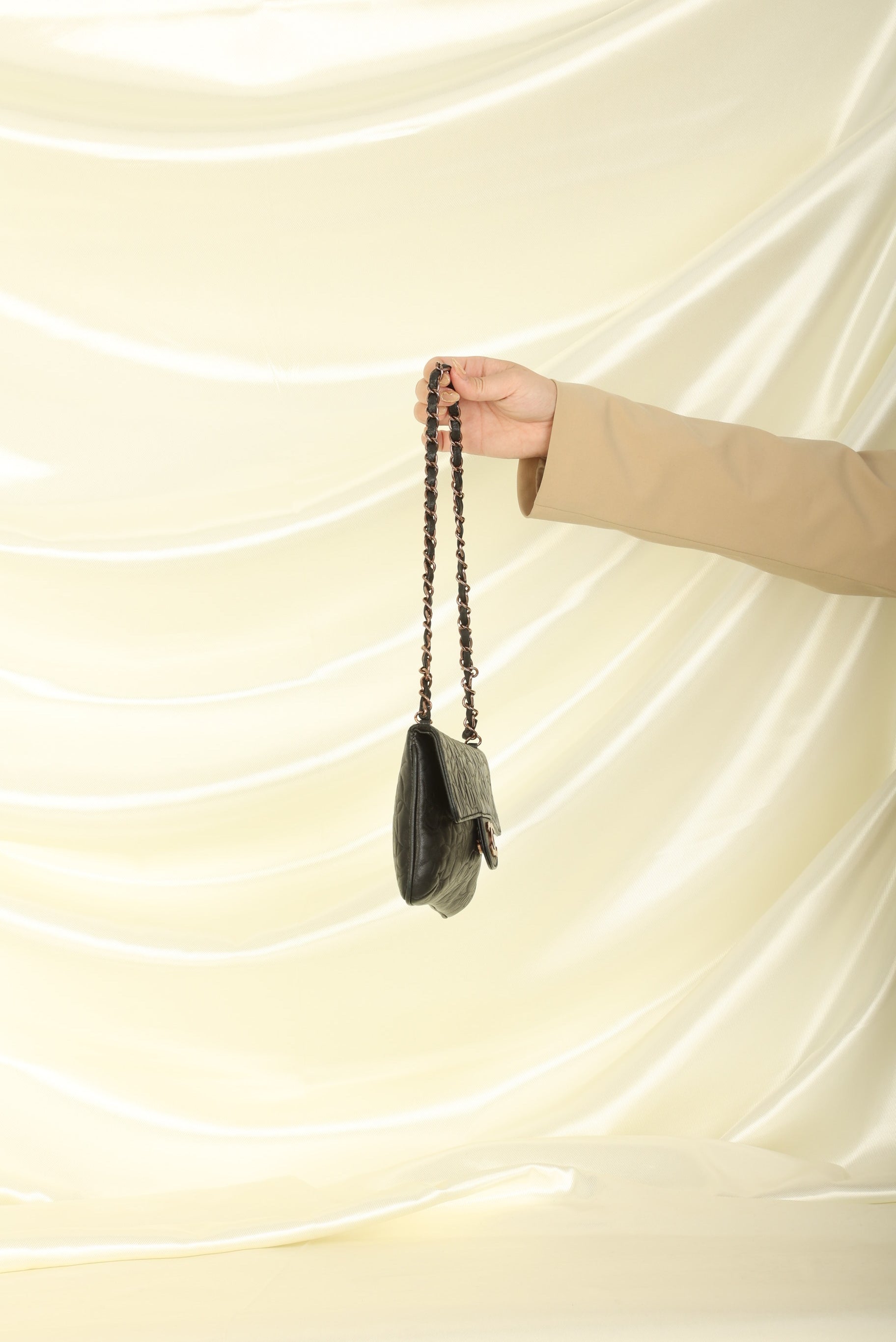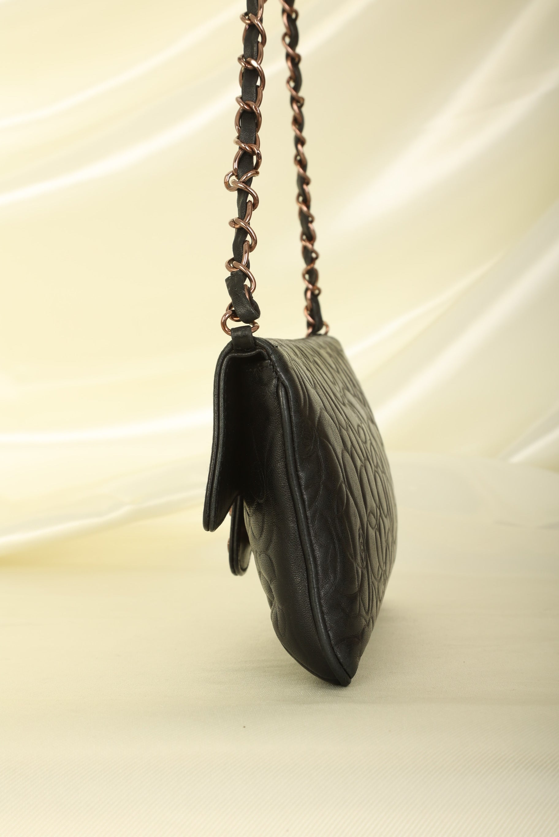 A chic lambskin Chanel flap pochette that has the iconic camellia flowers and CC logos embossed all over the bag. Rose gold chain hardware is an unexpected and edgy touch to this sweet bag! Can fit a phone, card holder, sunglasses, and keys.