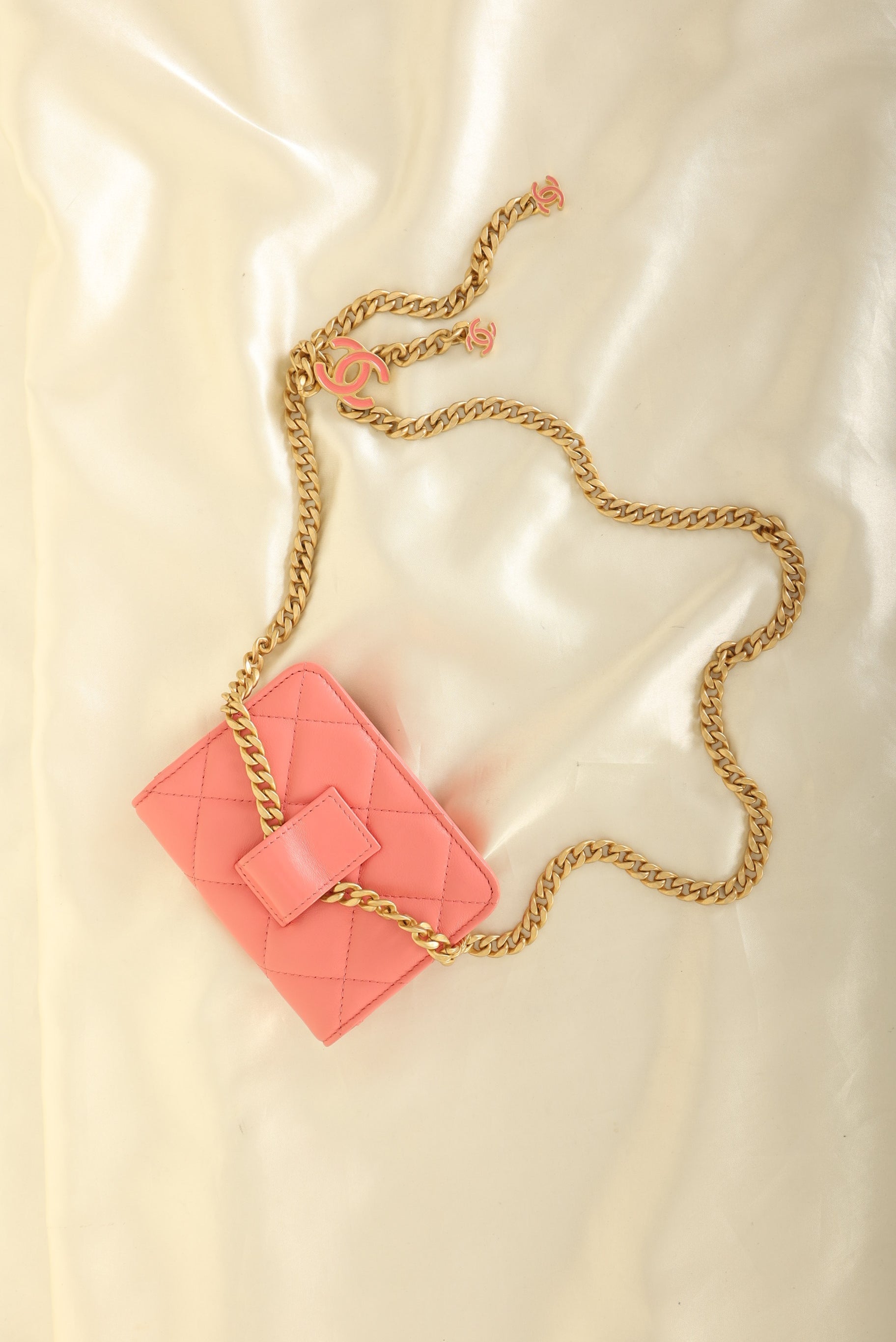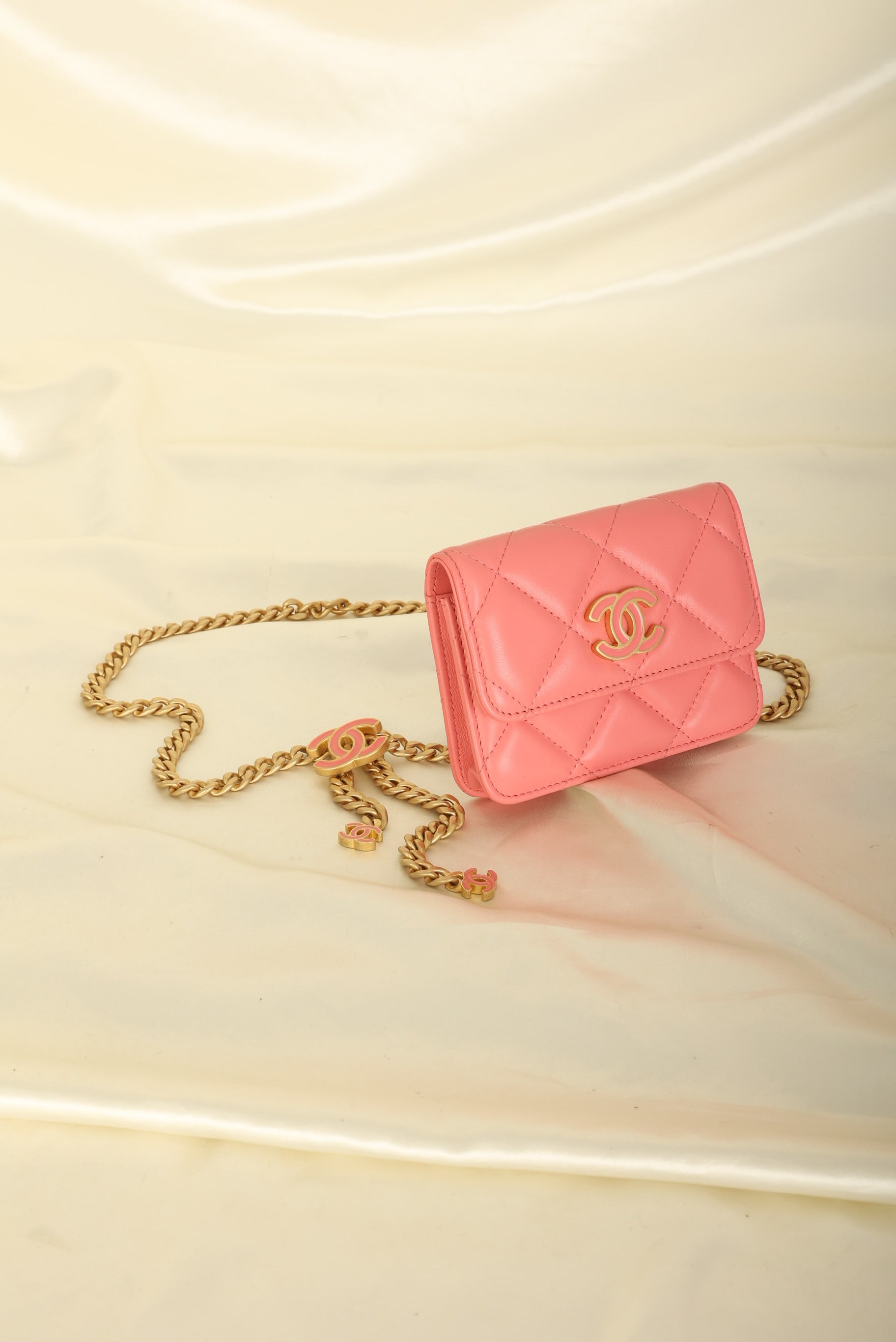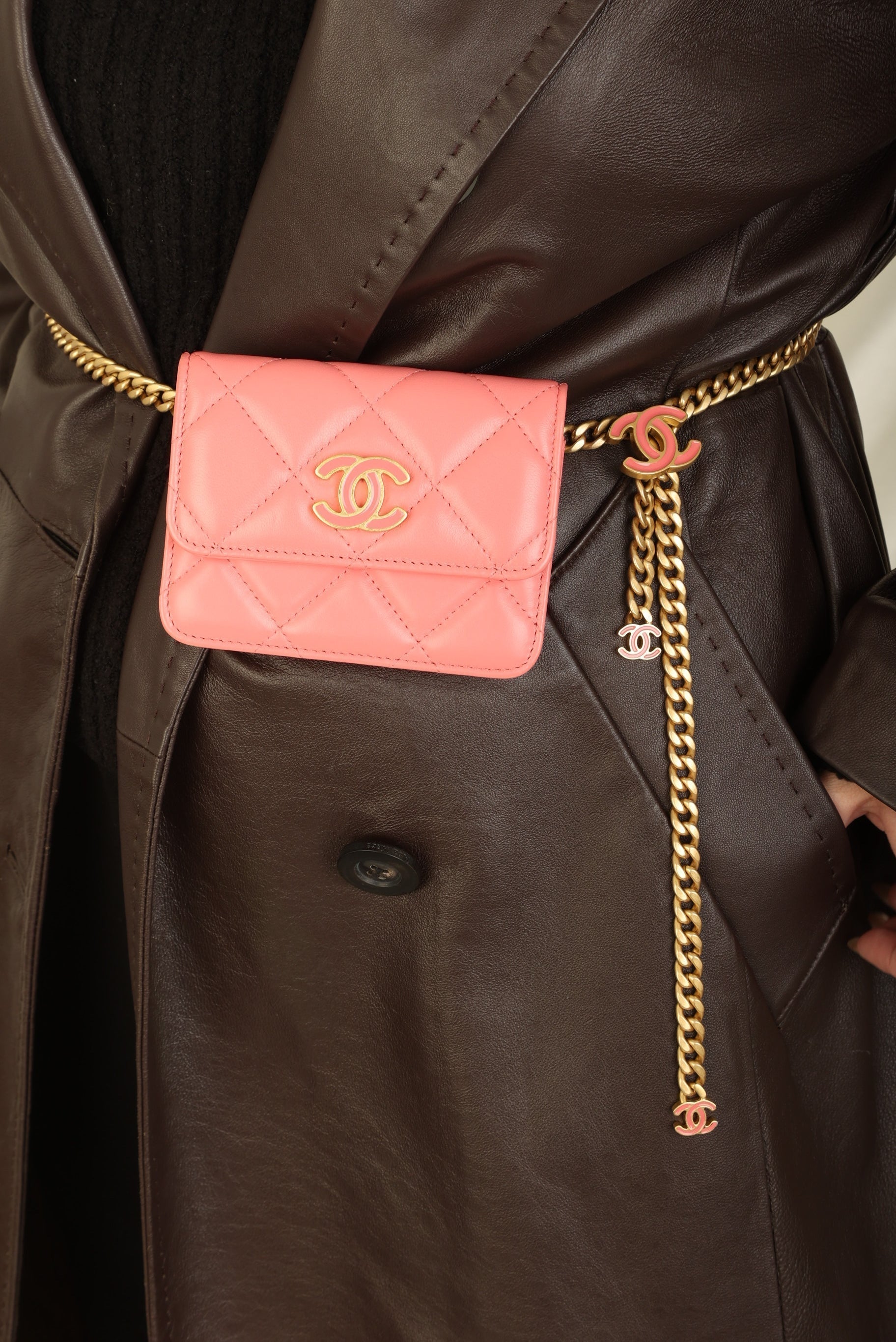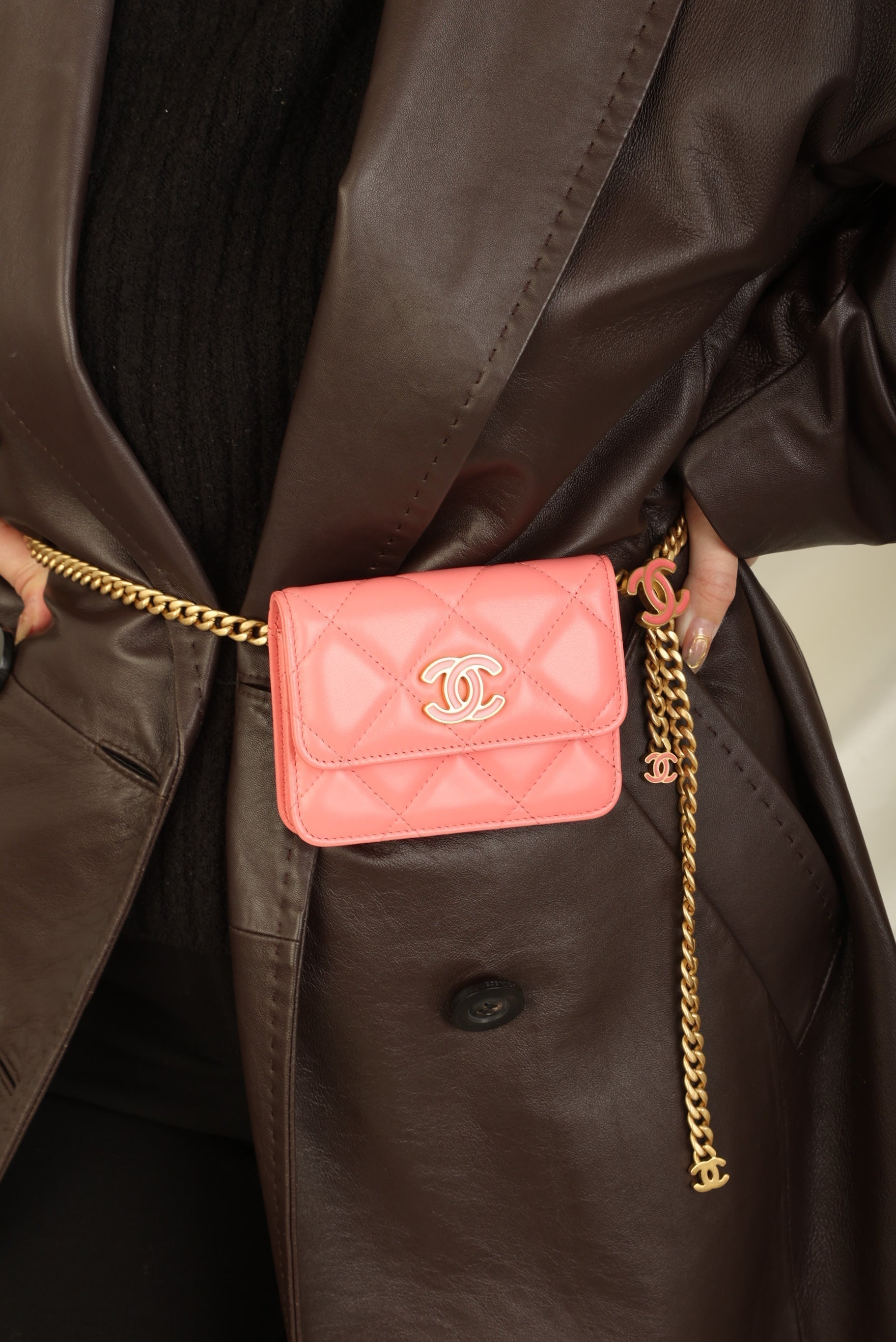 Dropping in the shop is this adorable Chanel Lambskin Chain Waist Bag! This piece is crafter in soft lambskin in a salmon pink shade with the most gorgeous aged gold hardware. Perfect for a night out for our hands-free girlies! This piece can be together or separately! Use the bag on its own or as a wallet and use the chain as it's own belt or even a necklace. This versatile piece is great to have in your collection for a little pop of color. You can fit your cards, mini hand sanitizer, and lippie.?