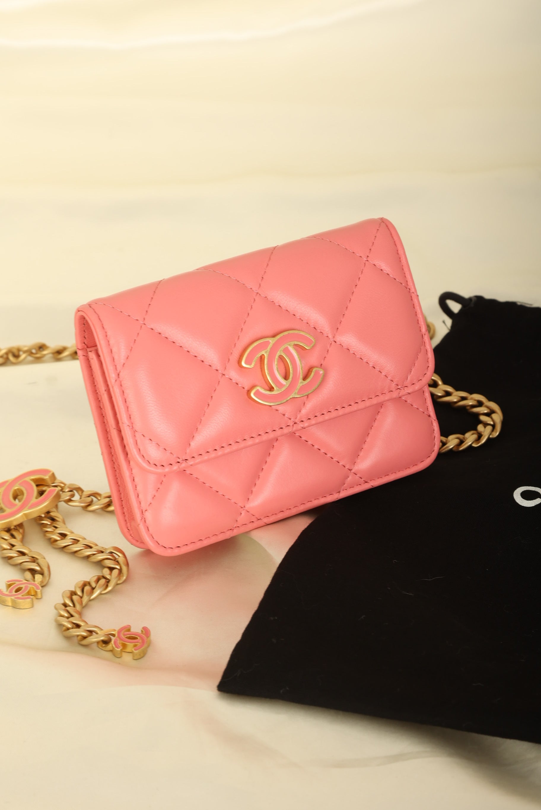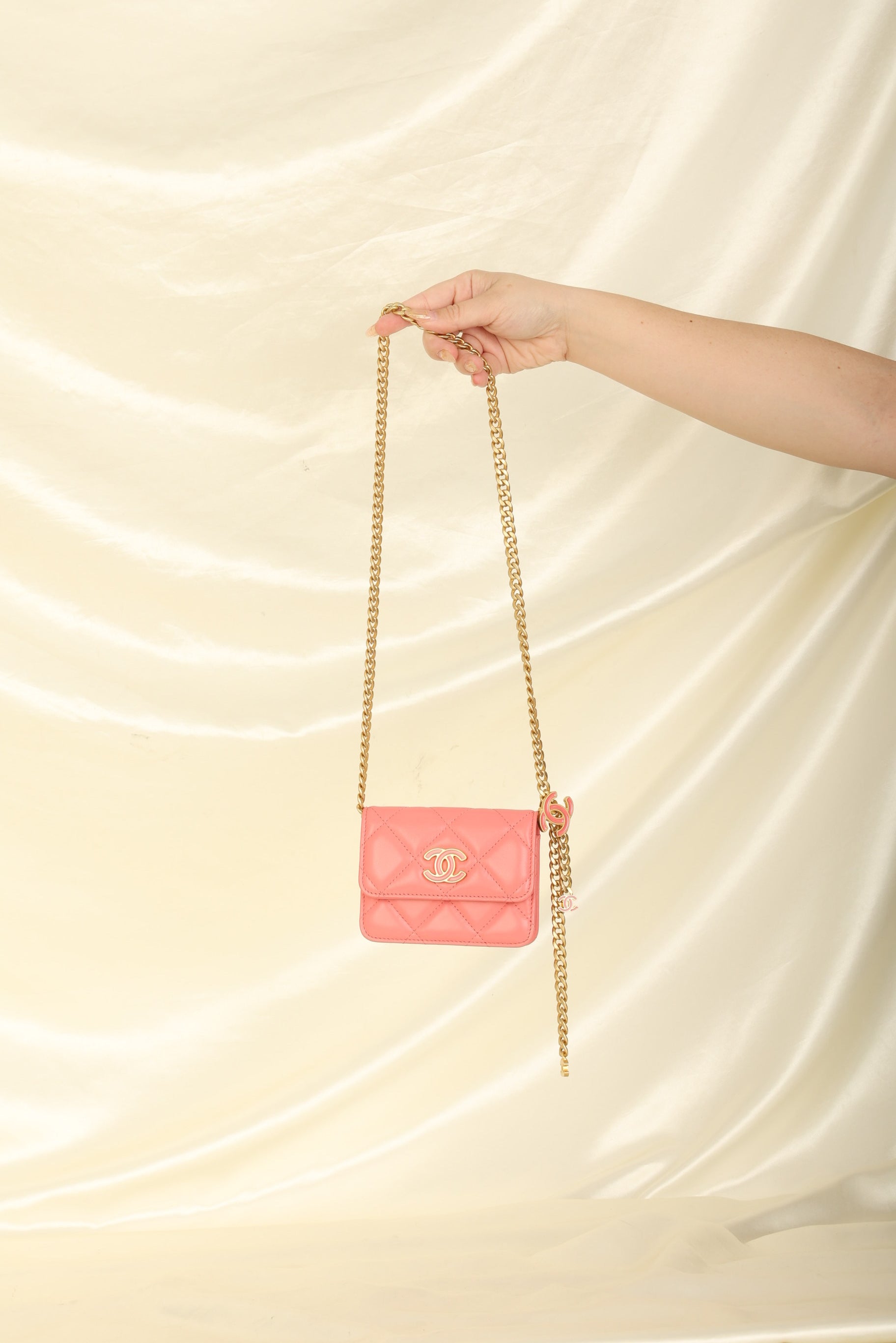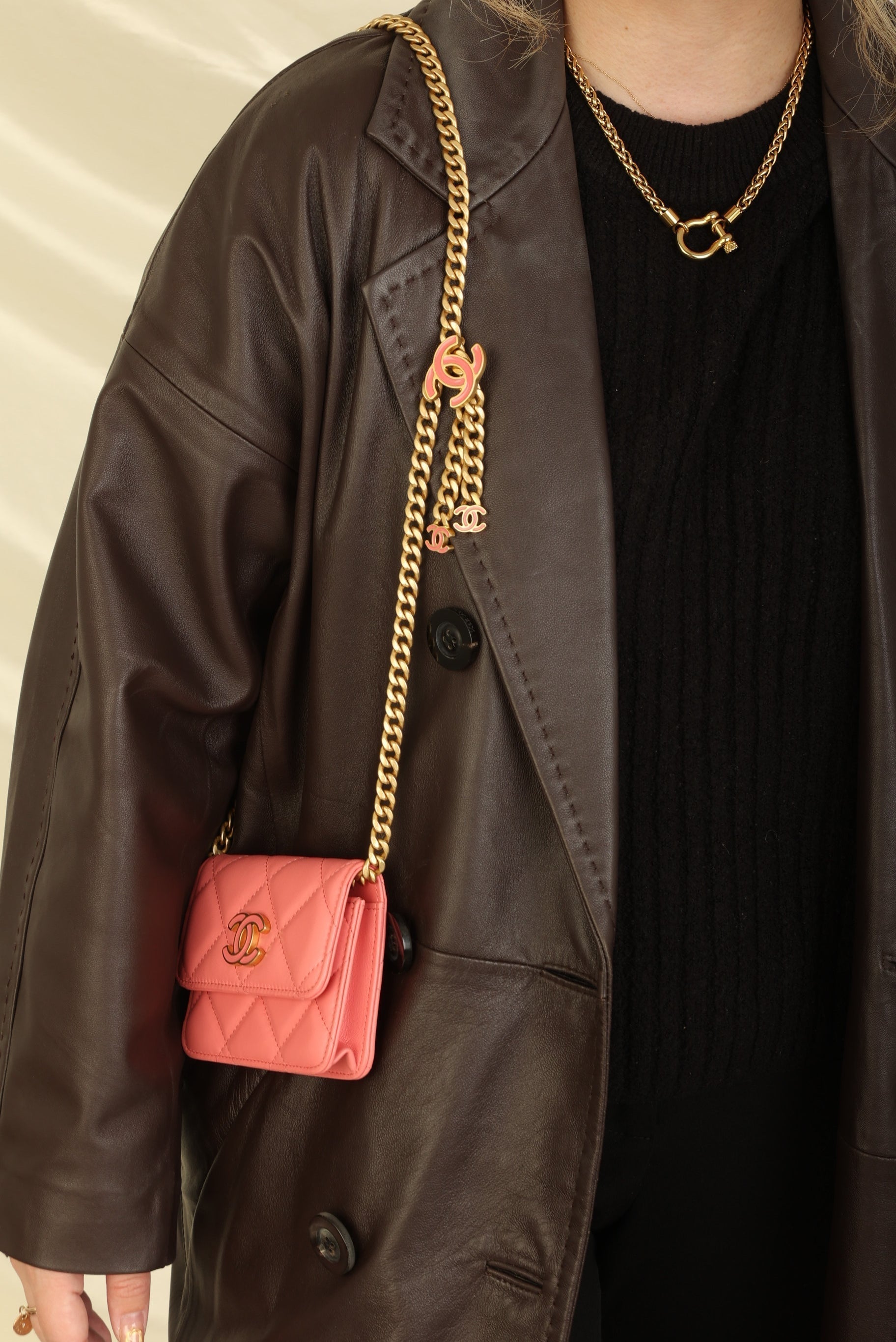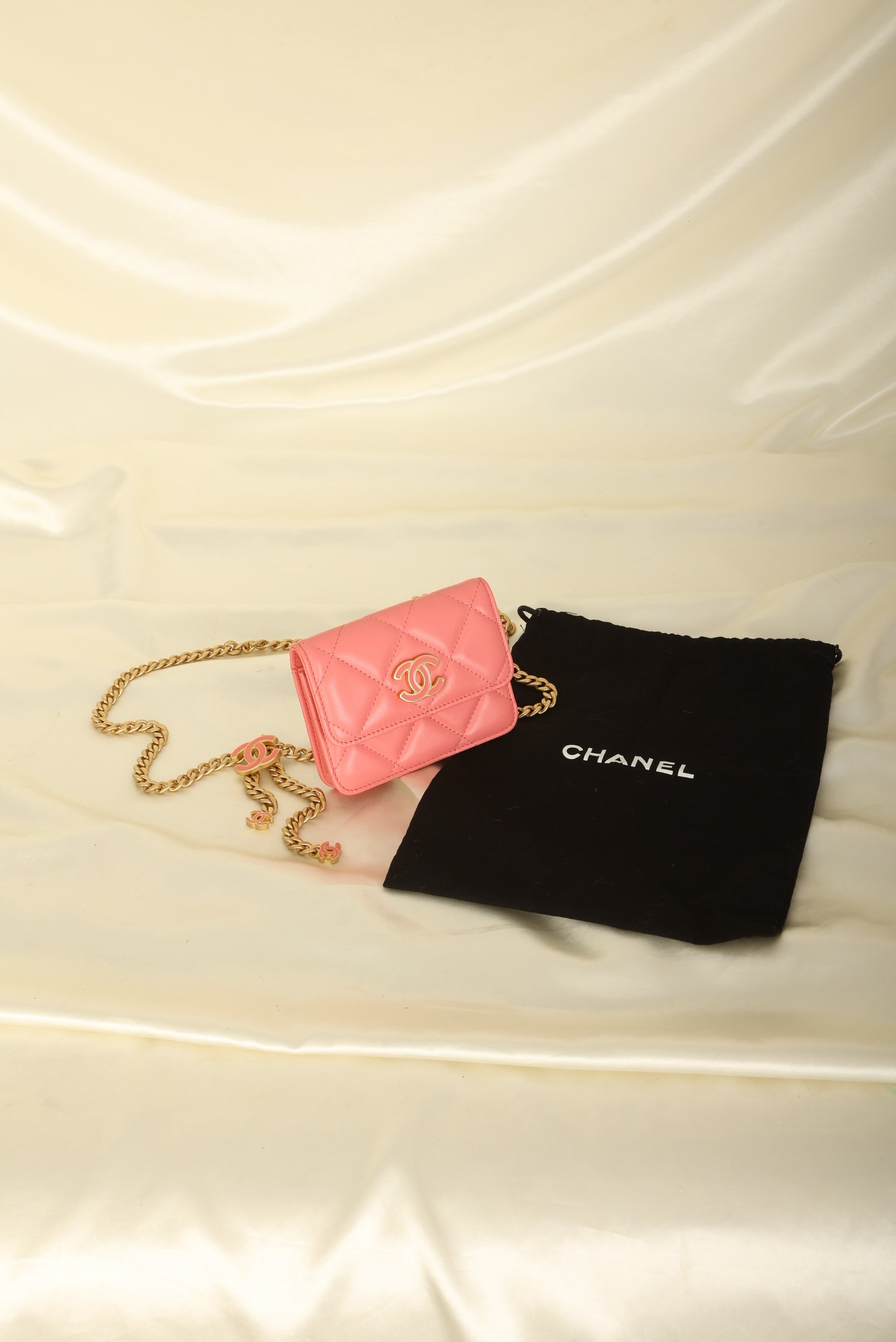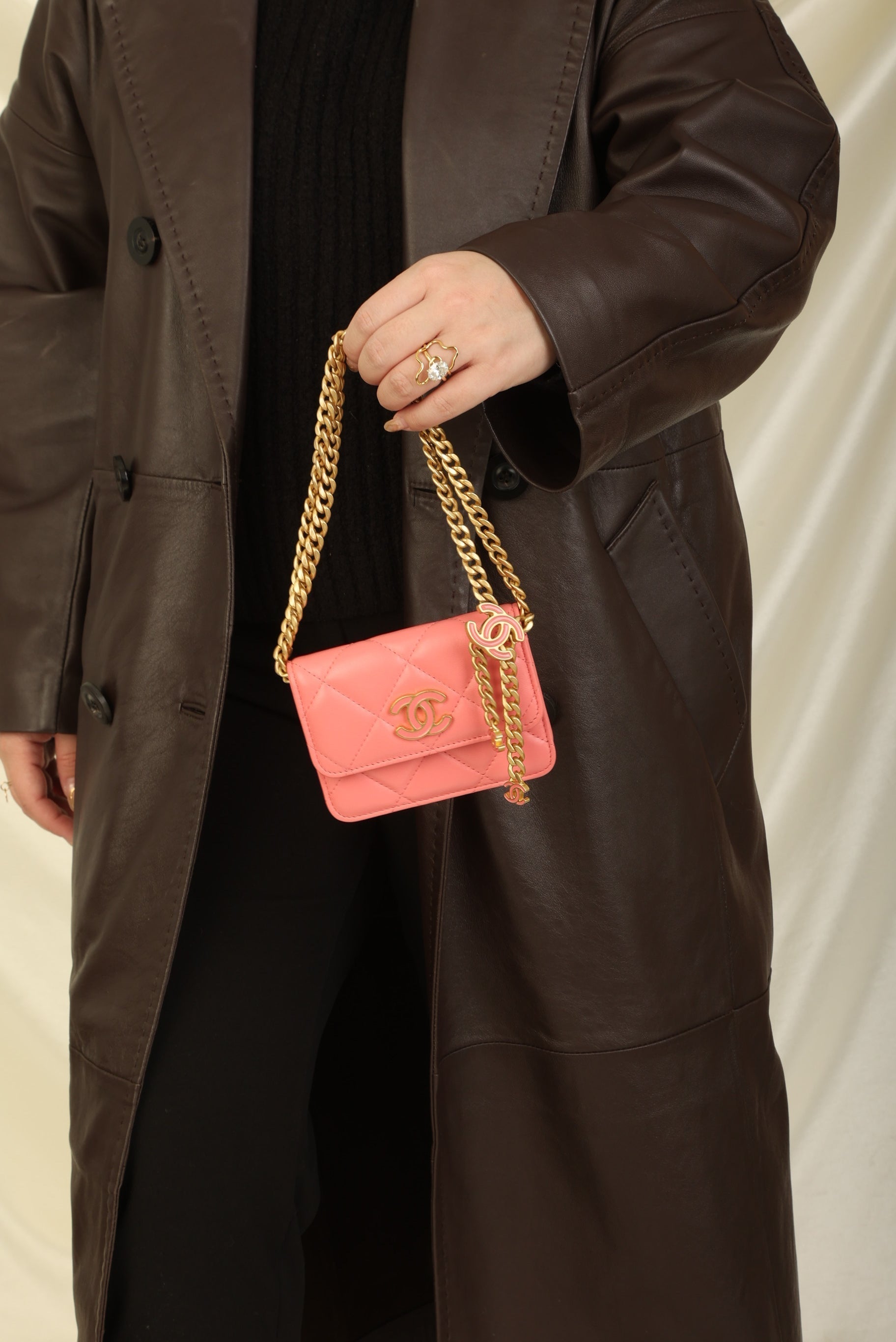 Dropping in the shop is this adorable Chanel Lambskin Chain Waist Bag! This piece is crafter in soft lambskin in a salmon pink shade with the most gorgeous aged gold hardware. Perfect for a night out for our hands-free girlies! This piece can be together or separately! Use the bag on its own or as a wallet and use the chain as it's own belt or even a necklace. This versatile piece is great to have in your collection for a little pop of color. You can fit your cards, mini hand sanitizer, and lippie.?