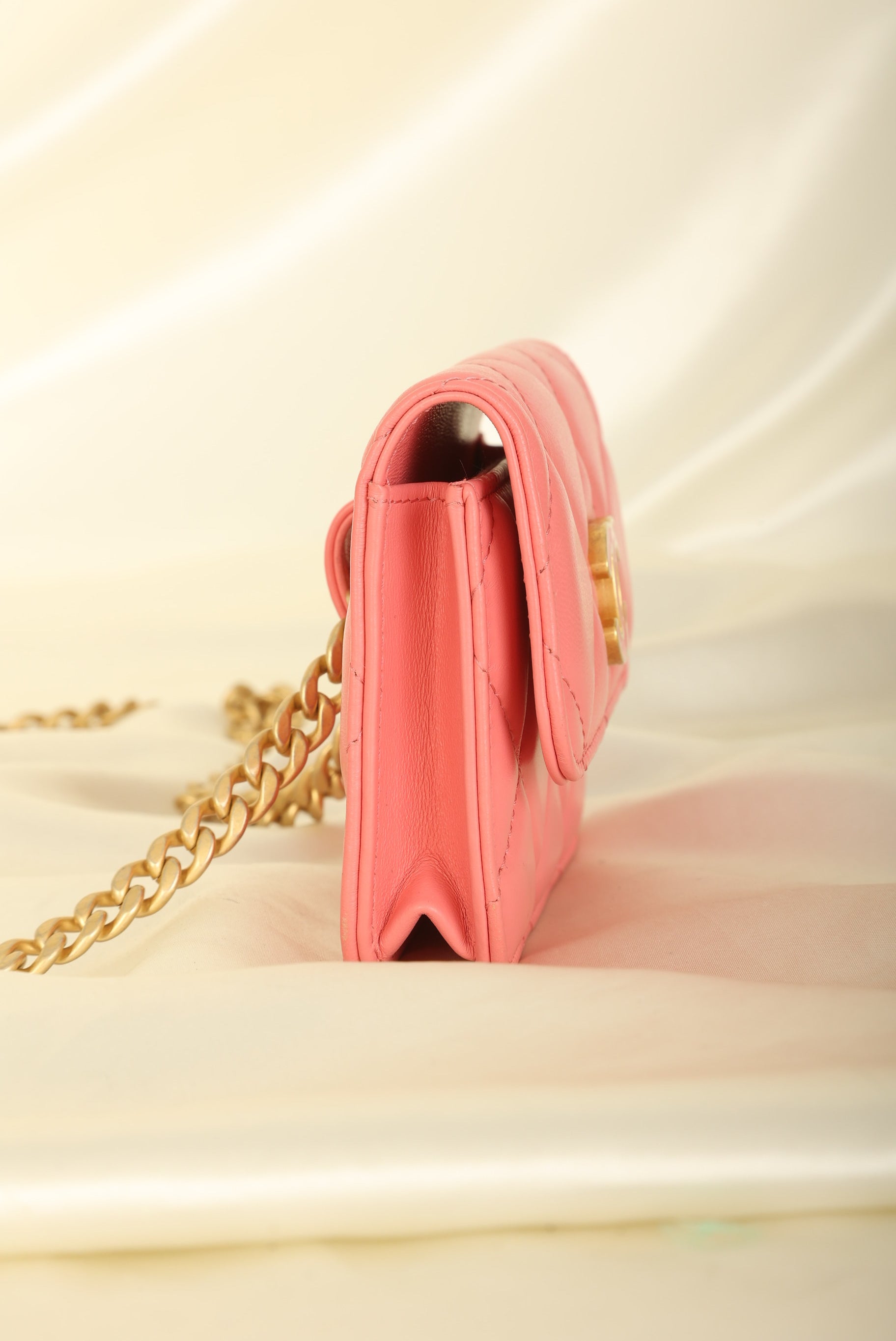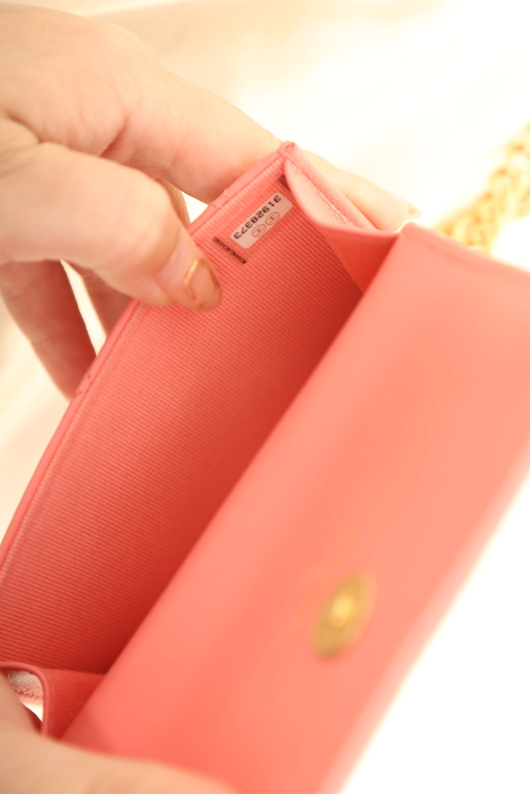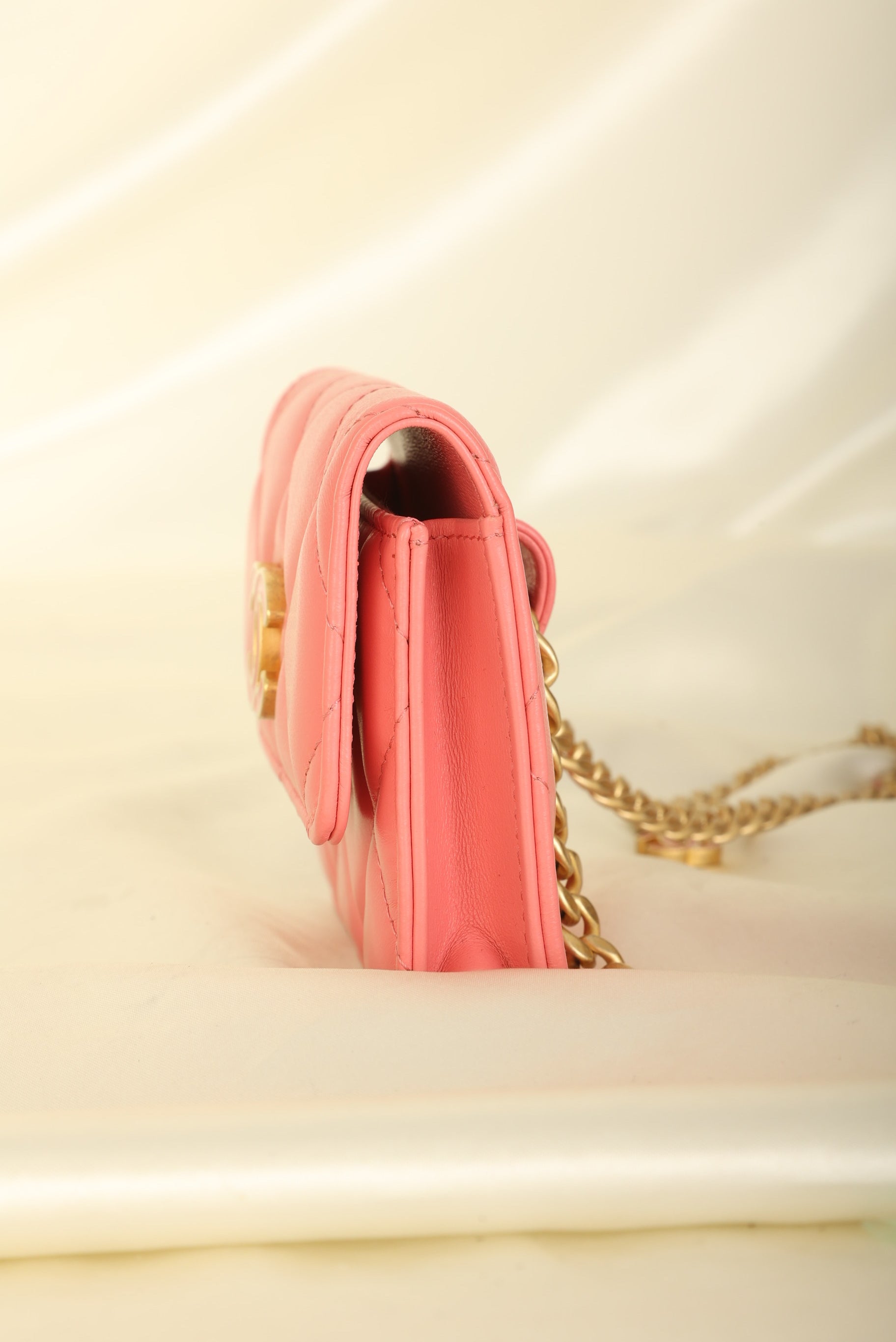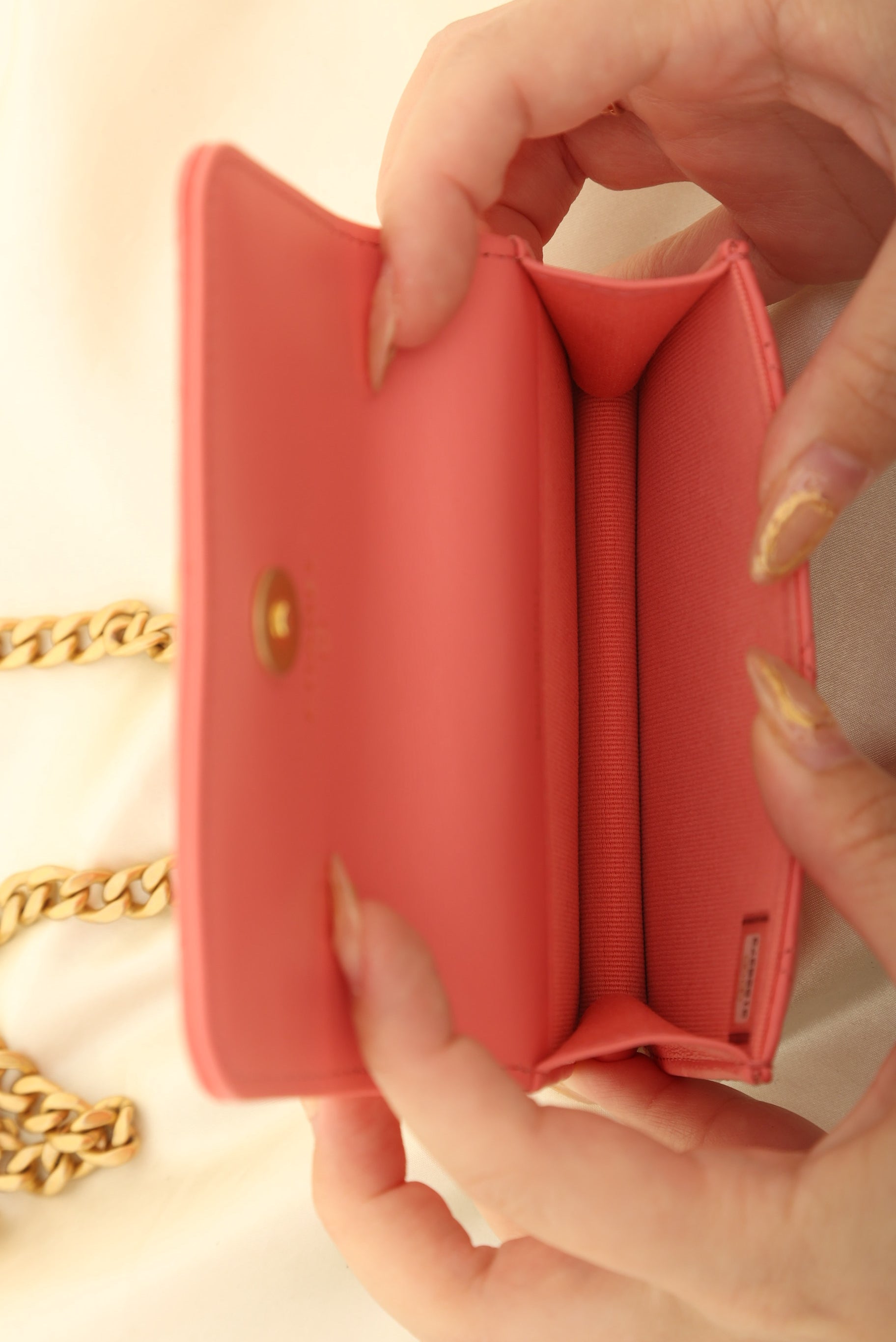 Dropping in the shop is this adorable Chanel Lambskin Chain Waist Bag! This piece is crafter in soft lambskin in a salmon pink shade with the most gorgeous aged gold hardware. Perfect for a night out for our hands-free girlies! This piece can be together or separately! Use the bag on its own or as a wallet and use the chain as it's own belt or even a necklace. This versatile piece is great to have in your collection for a little pop of color. You can fit your cards, mini hand sanitizer, and lippie.?