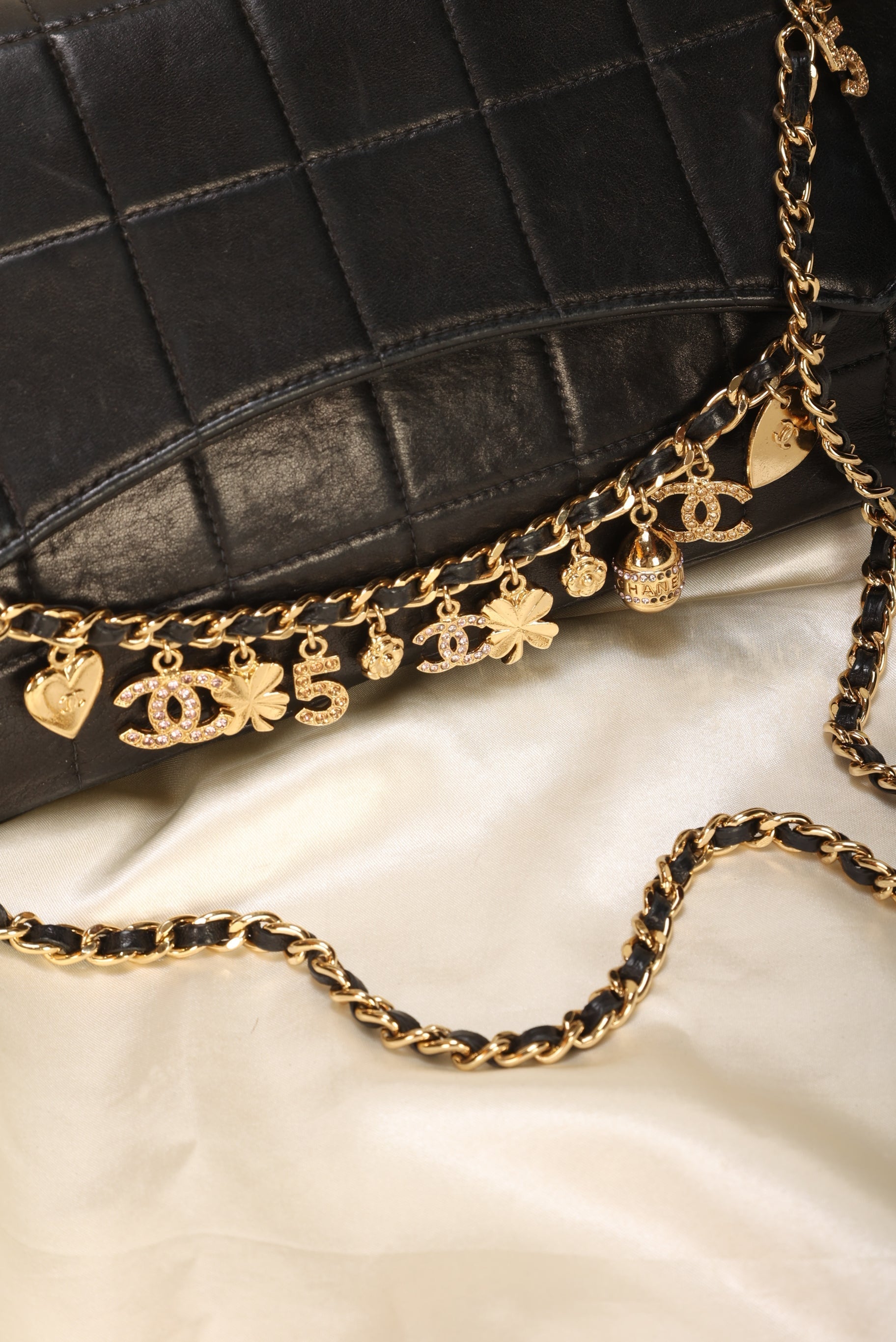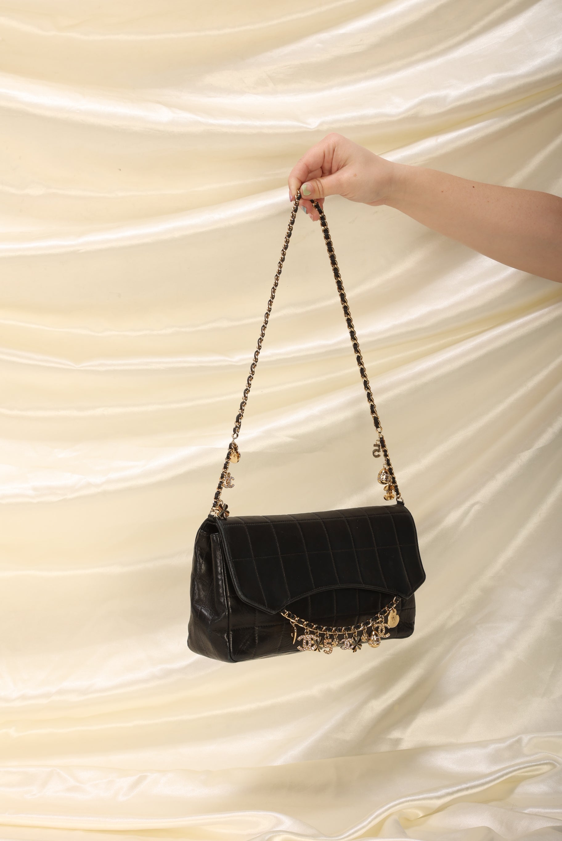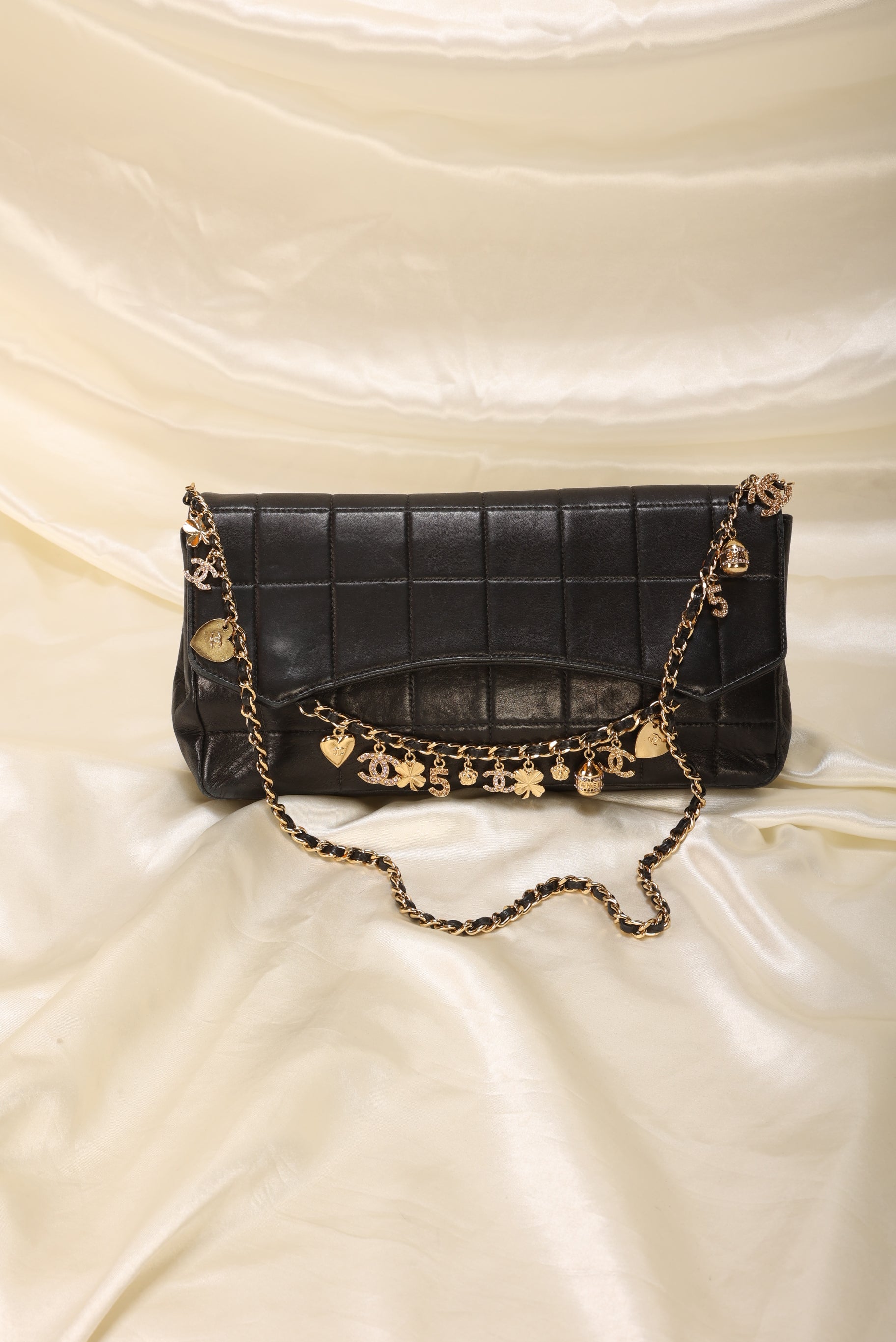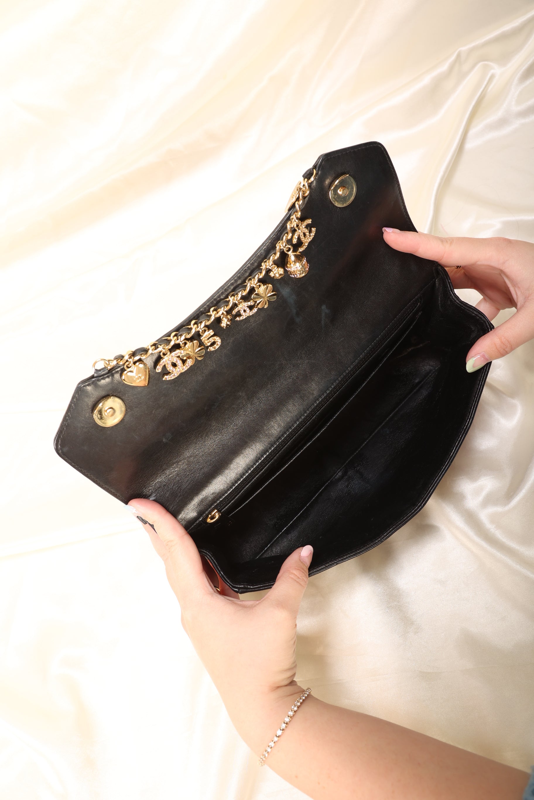 Not currently available anywhere online. Bringing an extremely rare Chanel bag to the shop. Dangling Chanel charms adorned on the front flap of the bag and on the sides. Adds whim to this special piece. Can be as as a shoulder bag or clutch.?