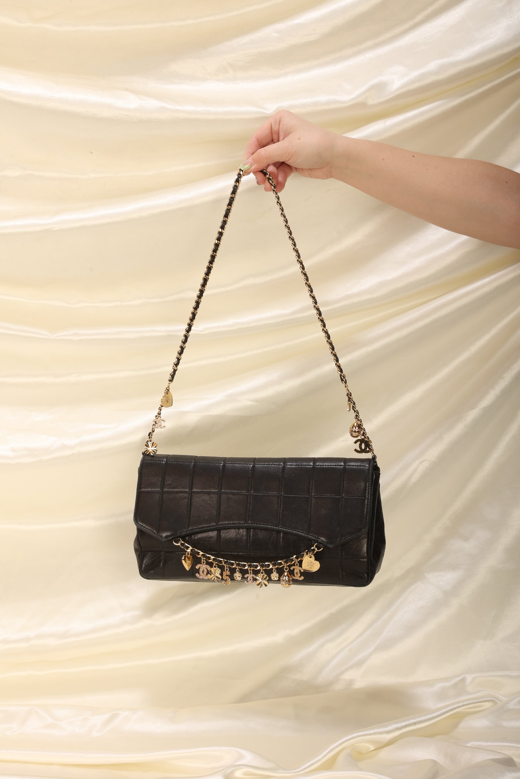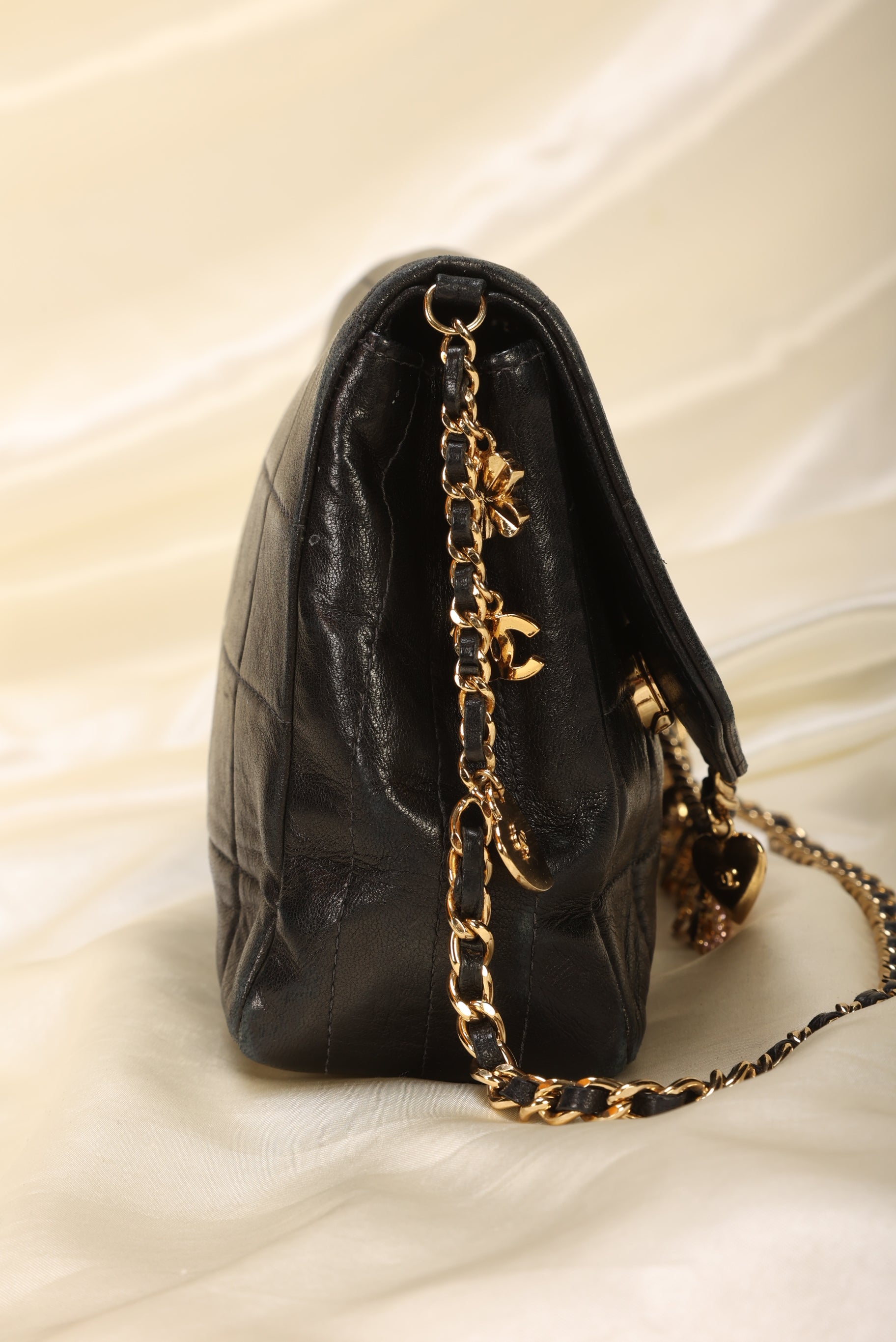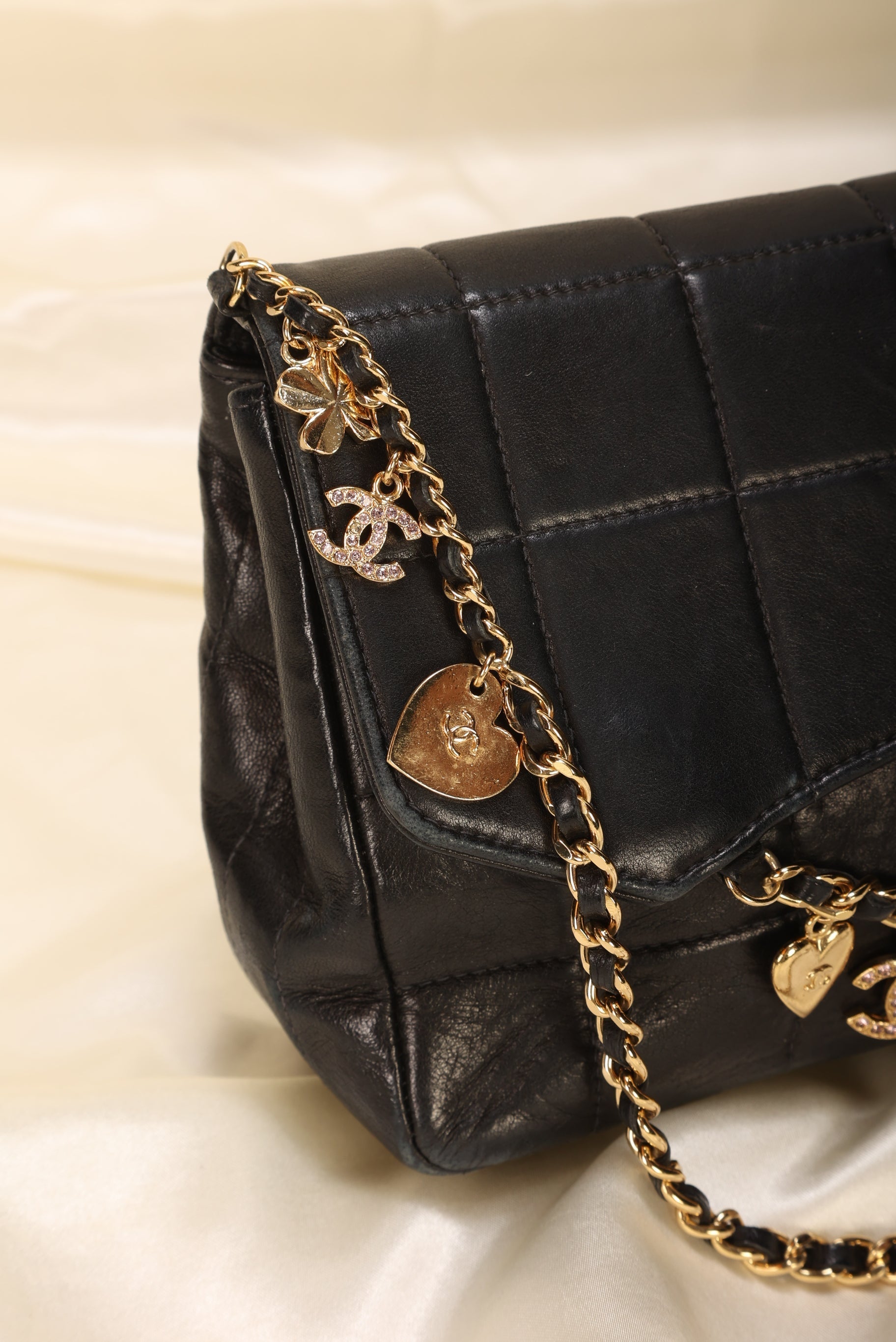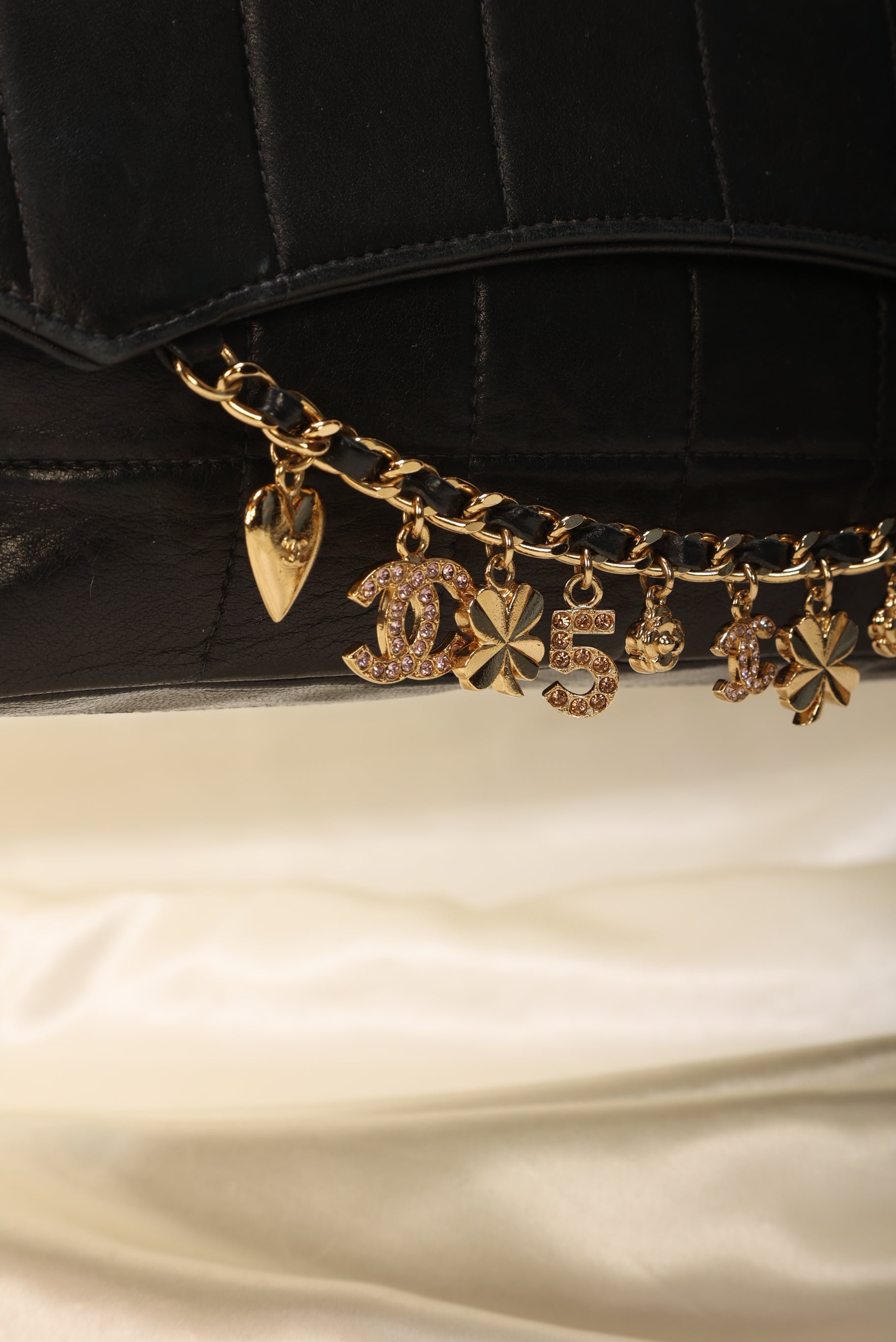 Not currently available anywhere online. Bringing an extremely rare Chanel bag to the shop. Dangling Chanel charms adorned on the front flap of the bag and on the sides. Adds whim to this special piece. Can be as as a shoulder bag or clutch.?