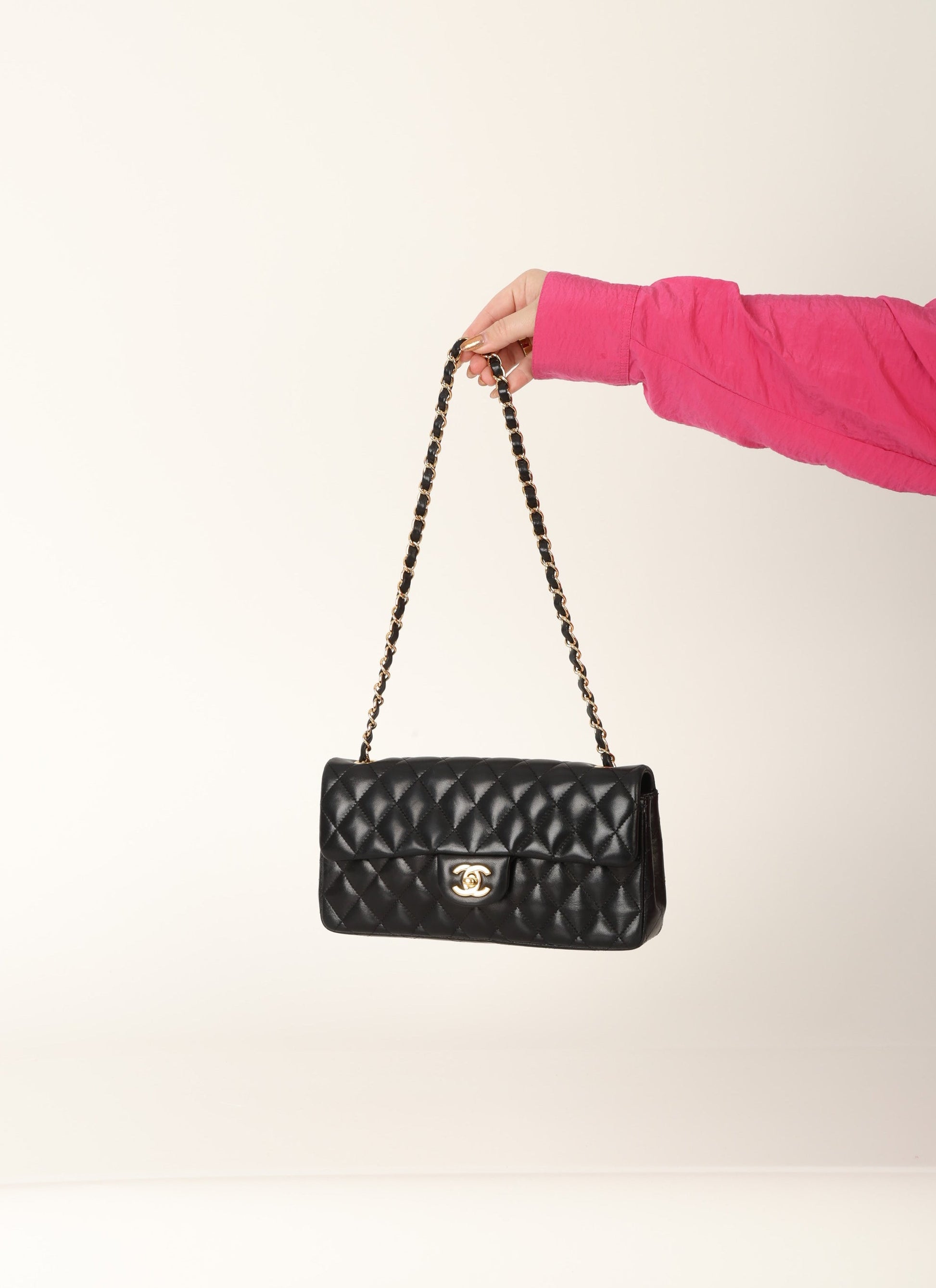 Dropping in the shop is a Chanel Lambskin East West Flap in?black?with gold hardware! This piece is?the sister to the classic flap and the style is discontinued. The diamond quilting of the East-West is a rare find! Can be as a long or short-shoulder bag with an added interior hook. You can fit your phone, wallet, keys, sunglasses, and a few other smaller essentials.?