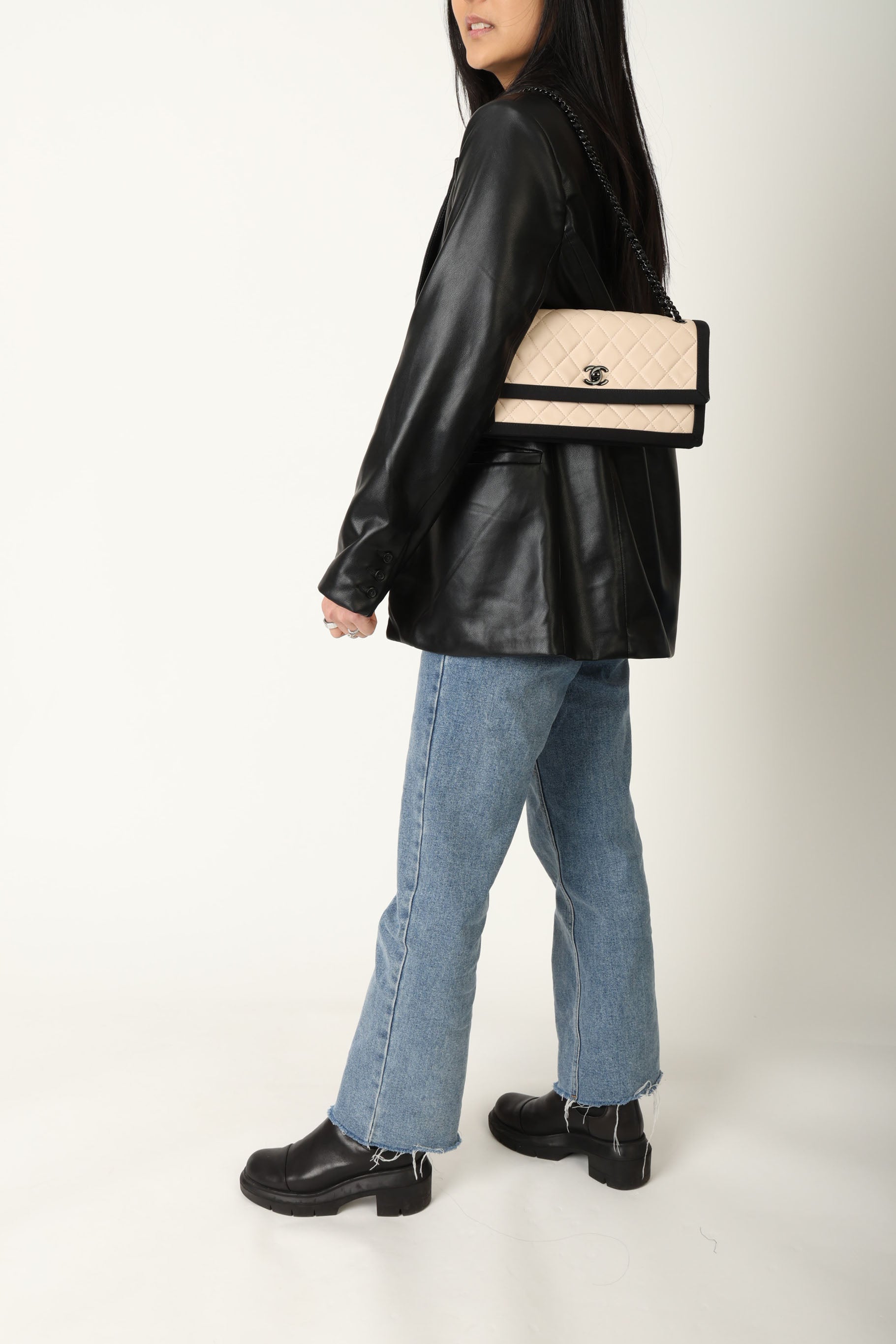 Bringing to the shop, is an eye catching flap bag crafted in lambskin with a unique grosgrain edging. This bag crafted with gunmetal hardware paired with the grosgrain trim, combines both the edgy and classic look.
