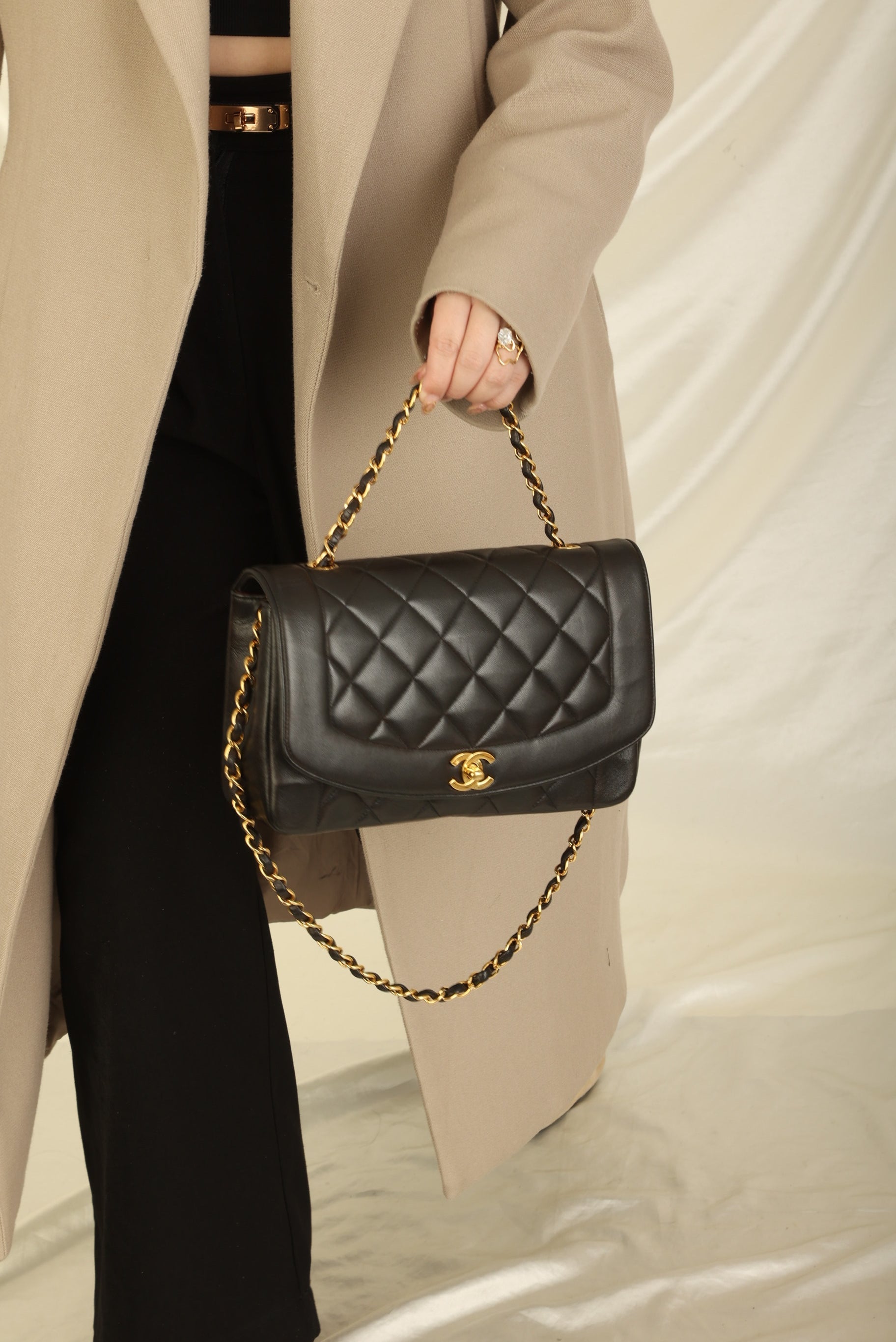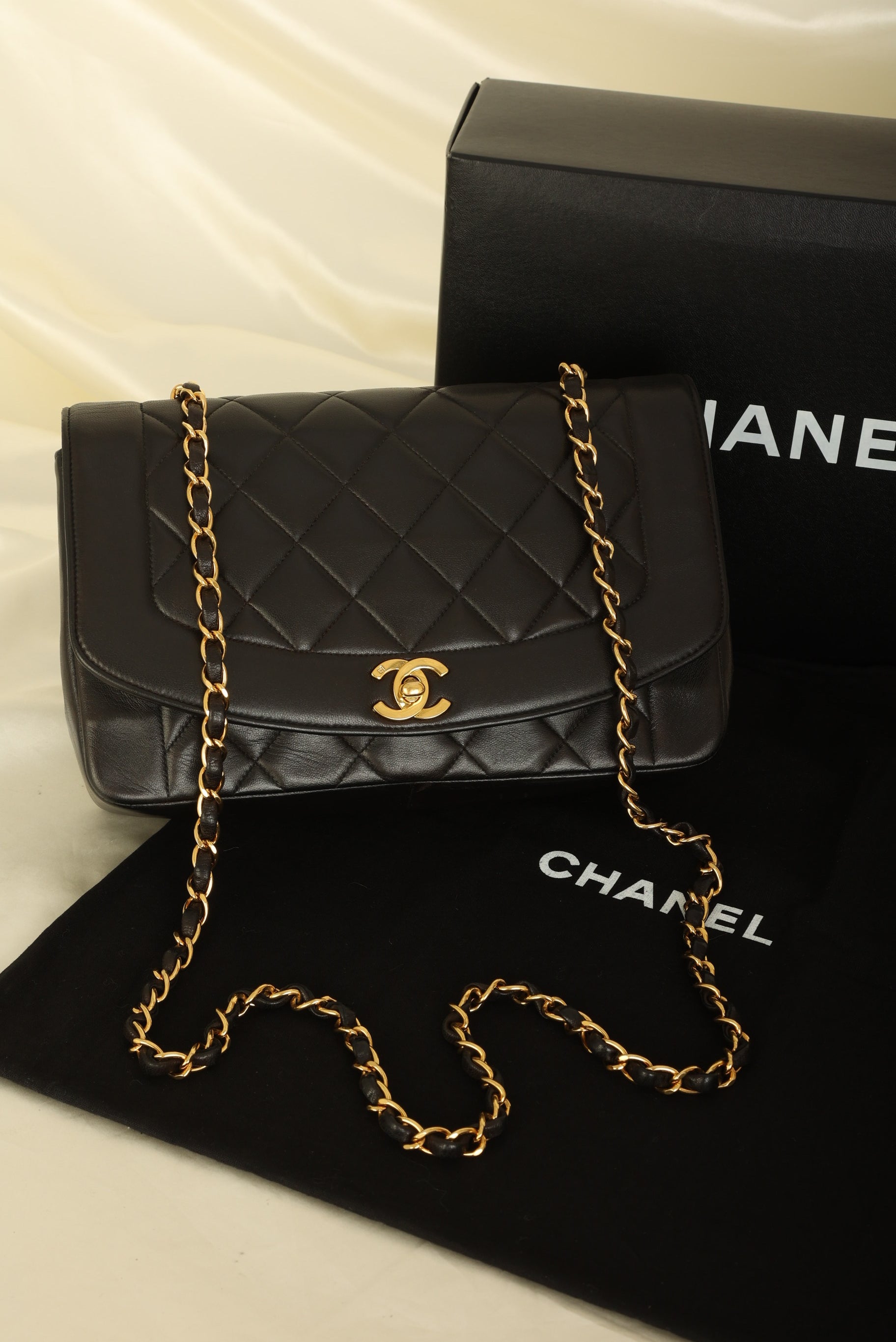 Crafted from the finest lambskin leather, this medium Diana bag features a sleek and streamlined design with a stunning 24K gold plated chain and hardware. The black color is versatile and perfect for any occasion, while the signature Chanel diamond quilted pattern adds a touch of luxury and elegance.