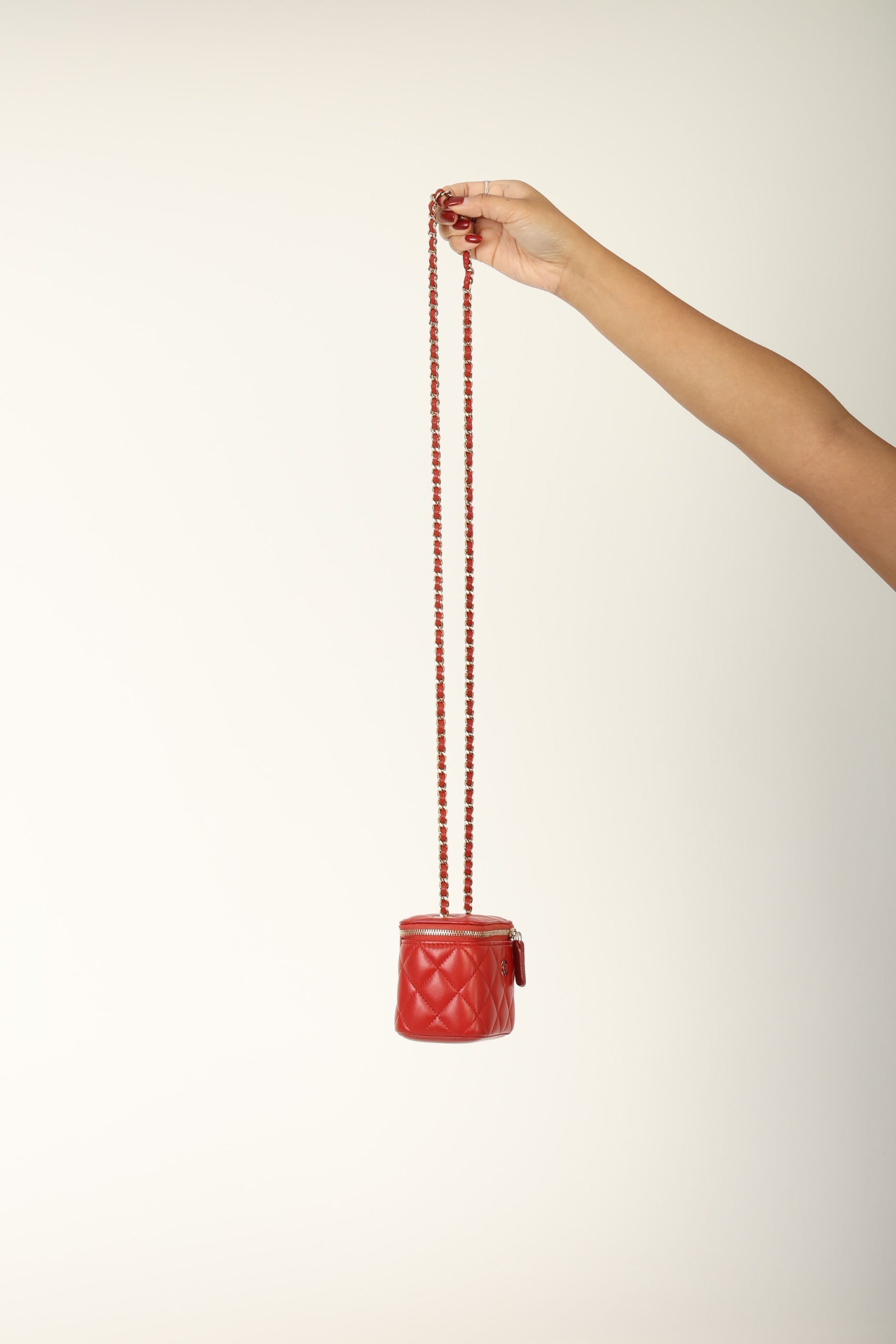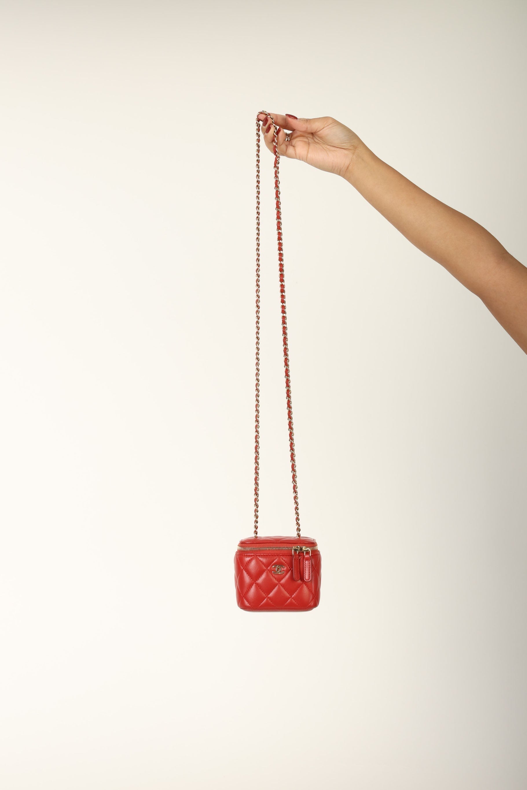 Presenting the cutest Chanel Lambskin mini vanity! The classic lambskin Chanel look but with a cherry red pop of color - can definitely be used for any season!