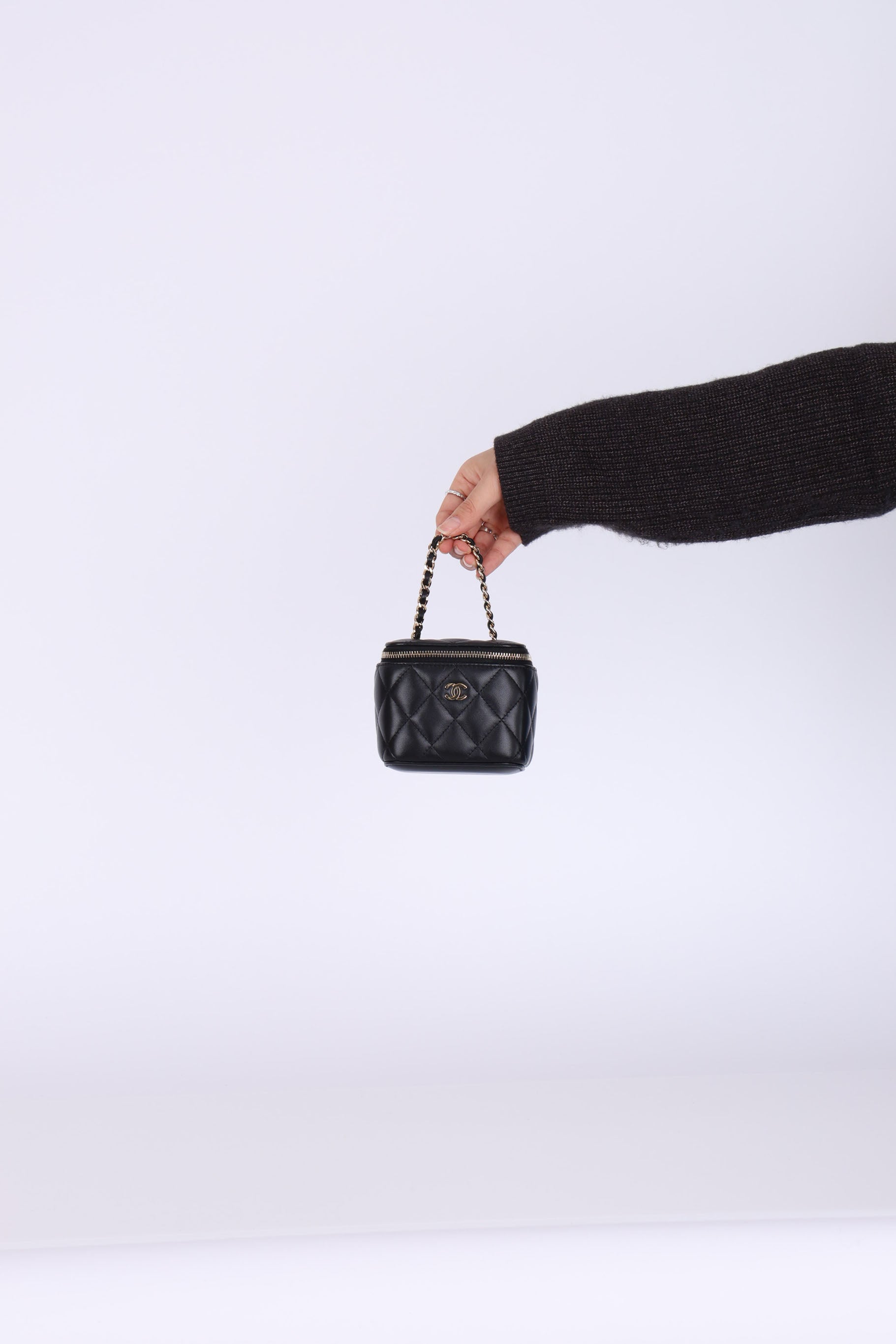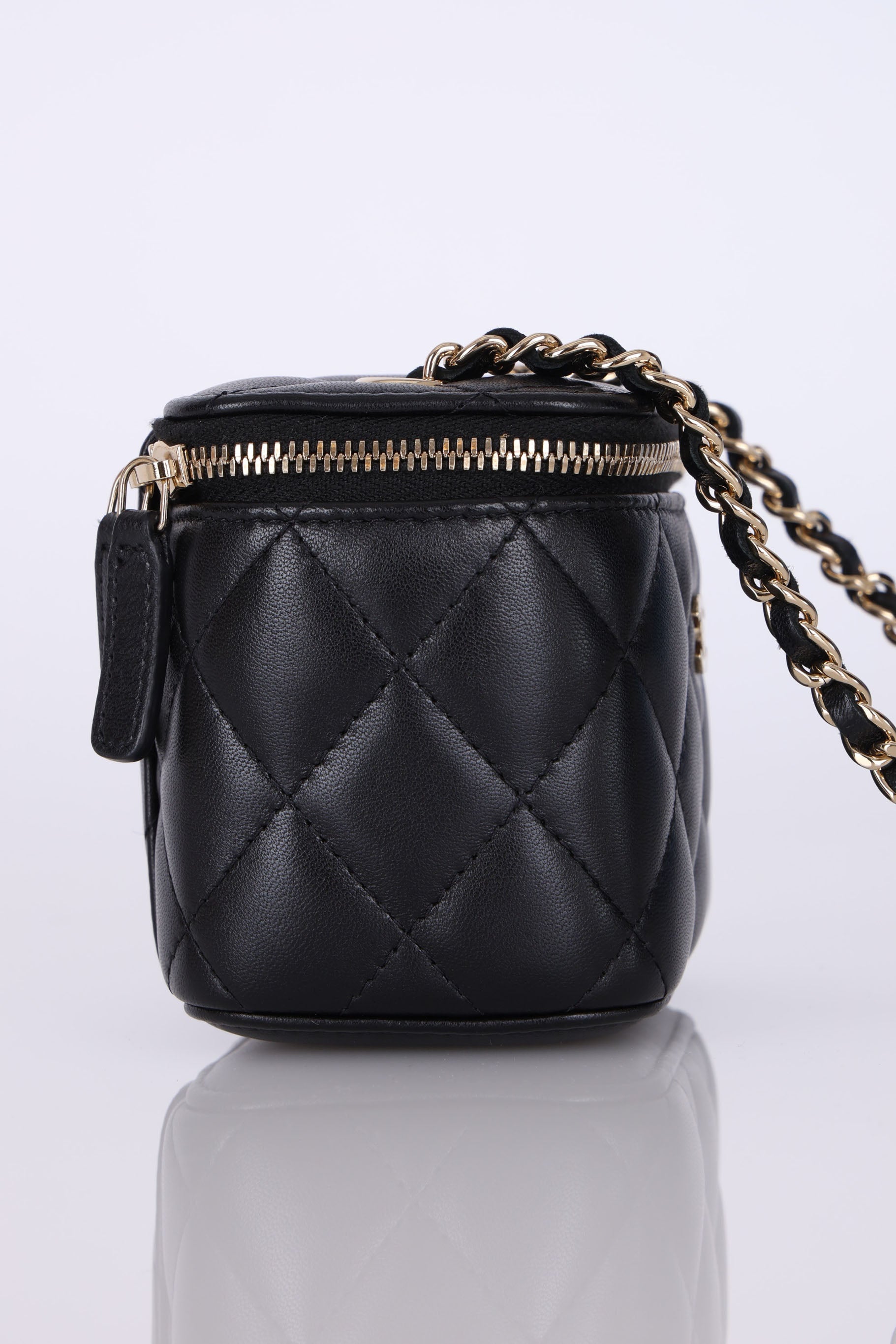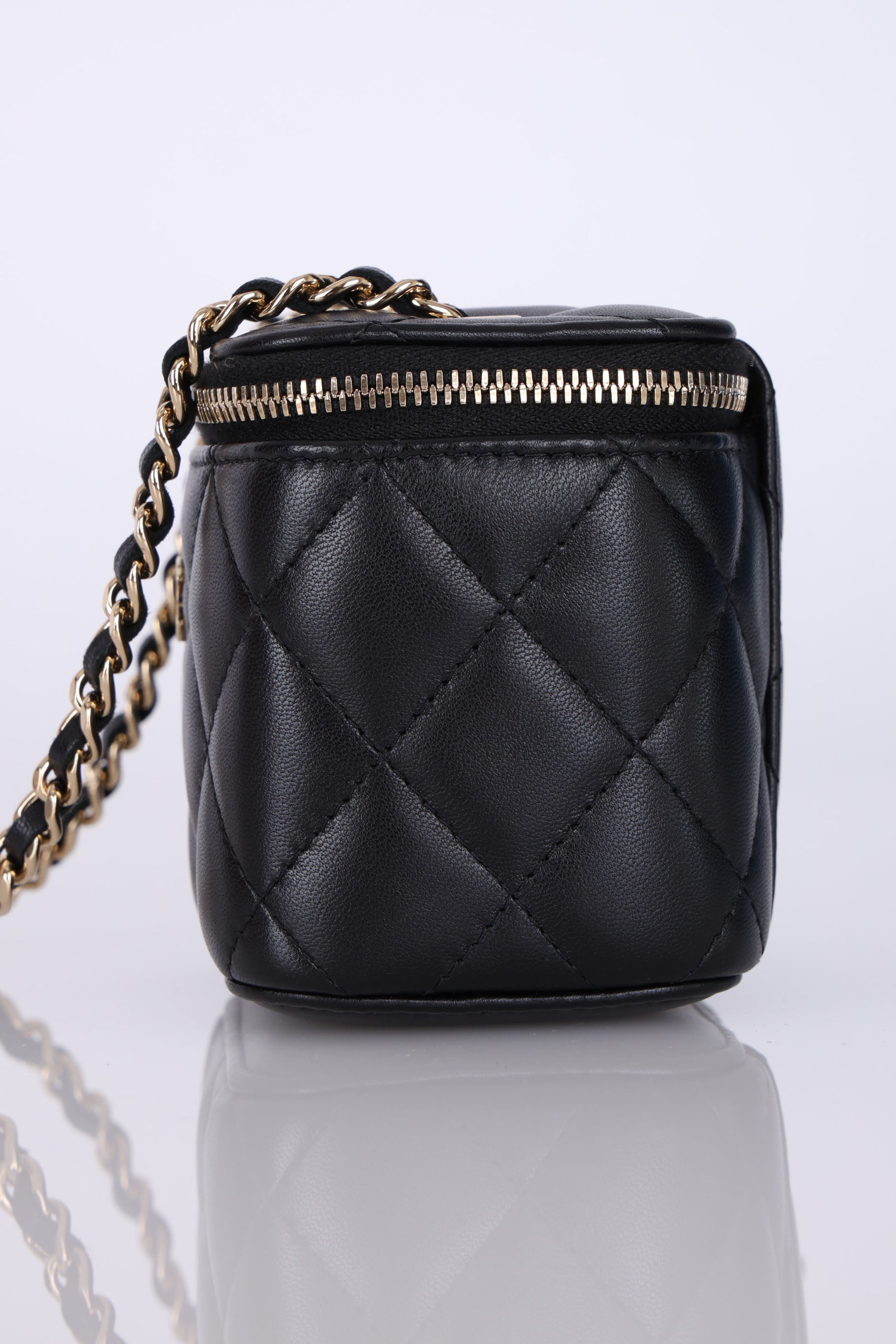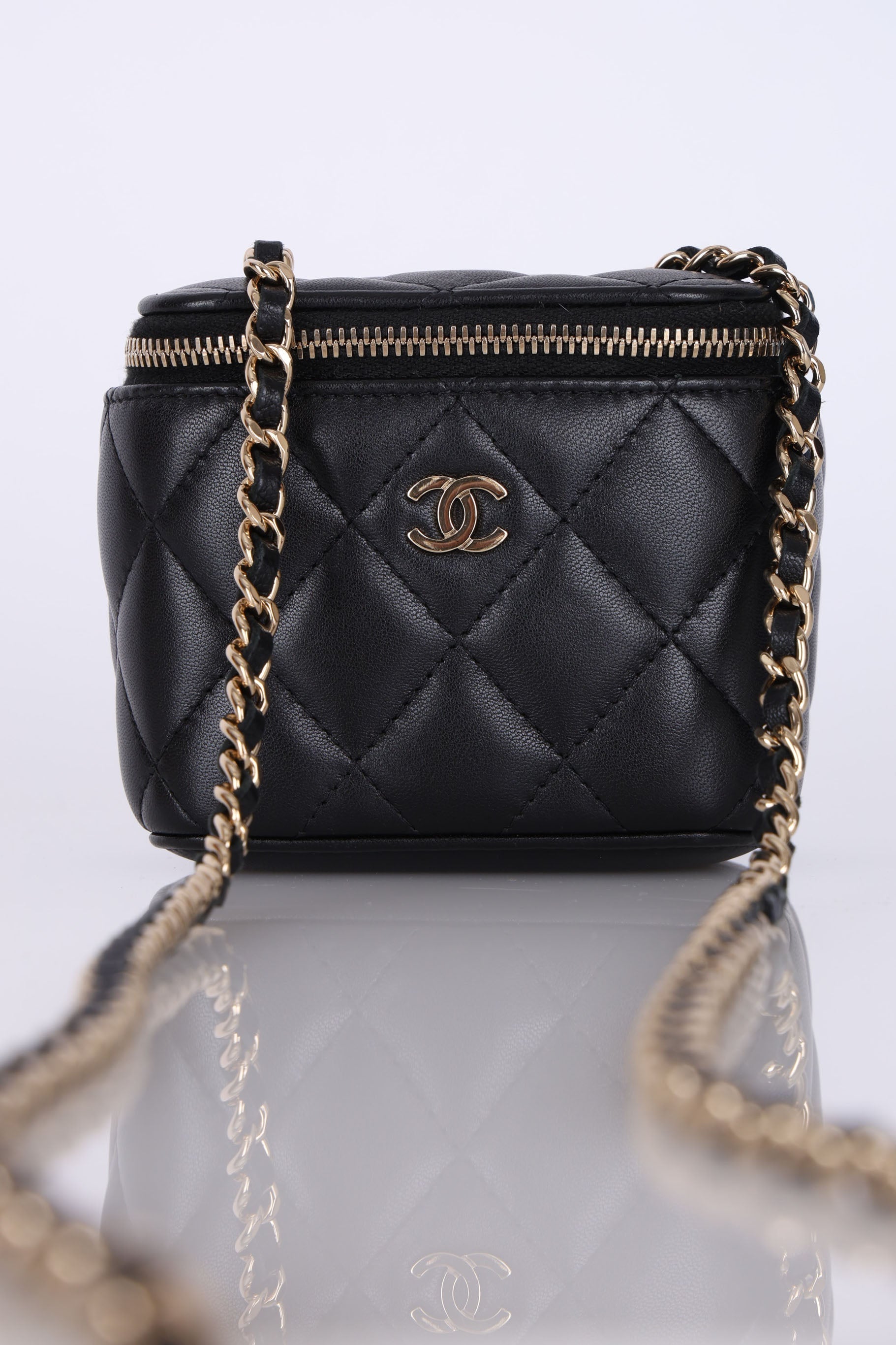 Presenting the cutest Chanel Lambskin mini vanity! The classic lambskin Chanel look but as a little vanity - can definitely be used for any season!