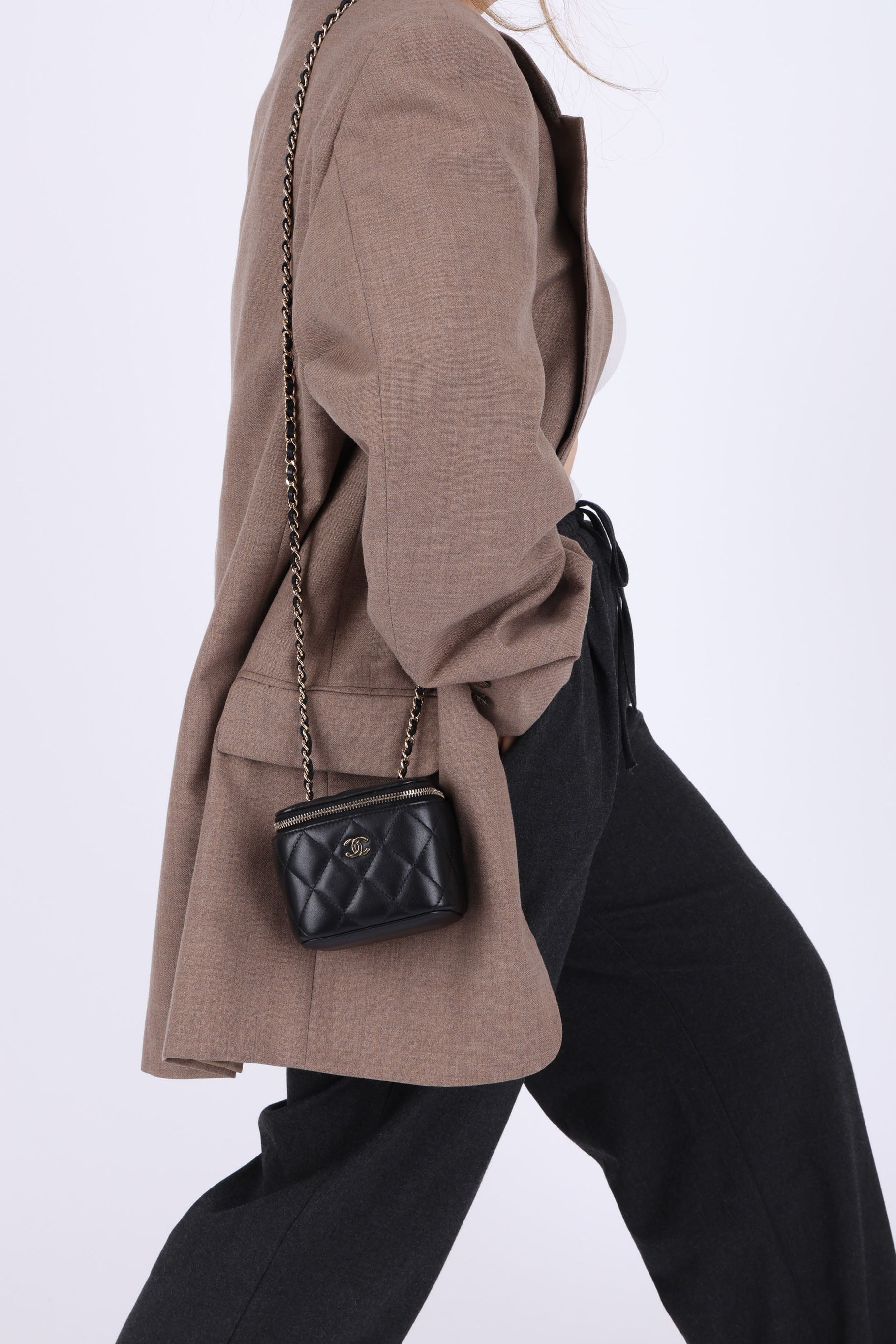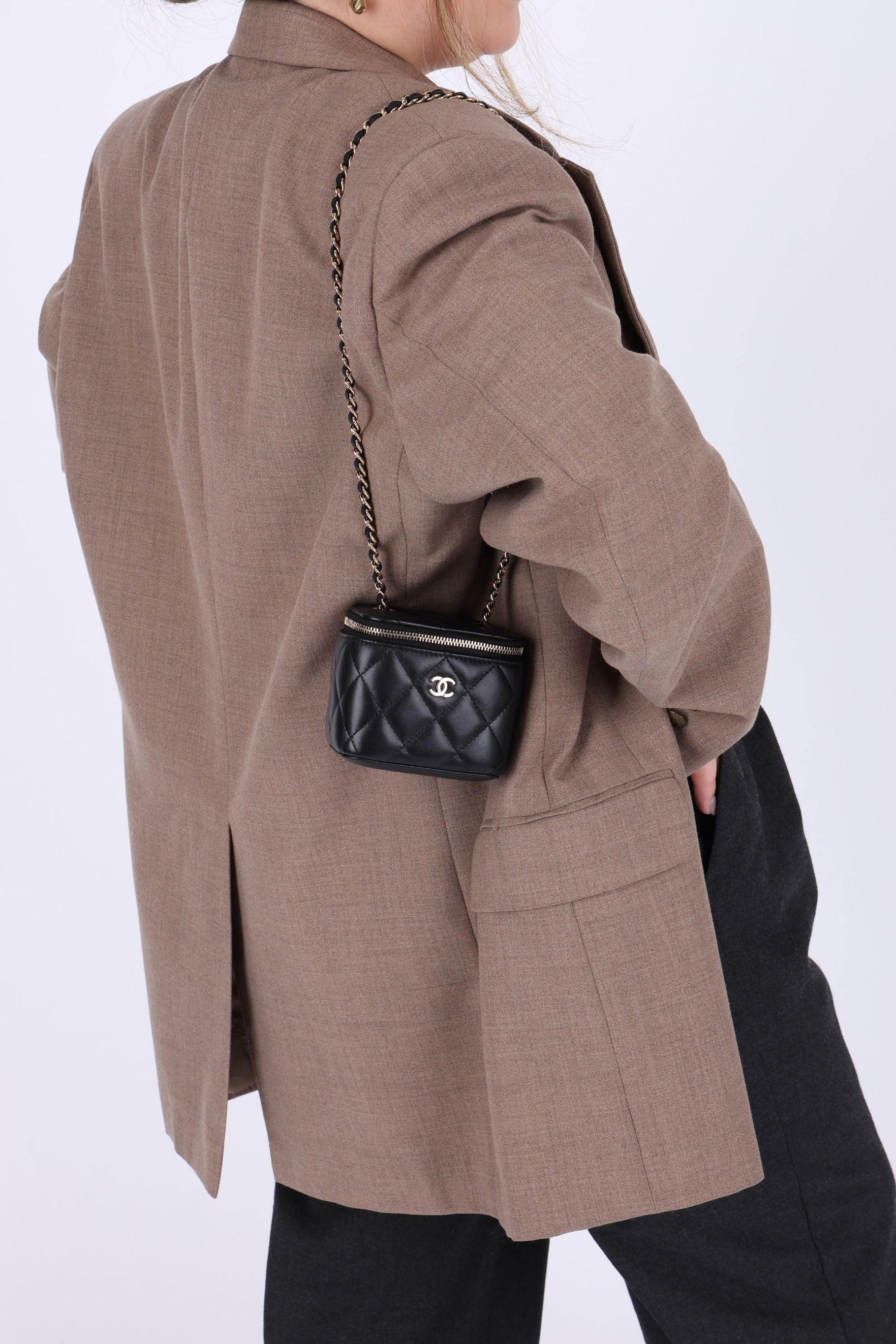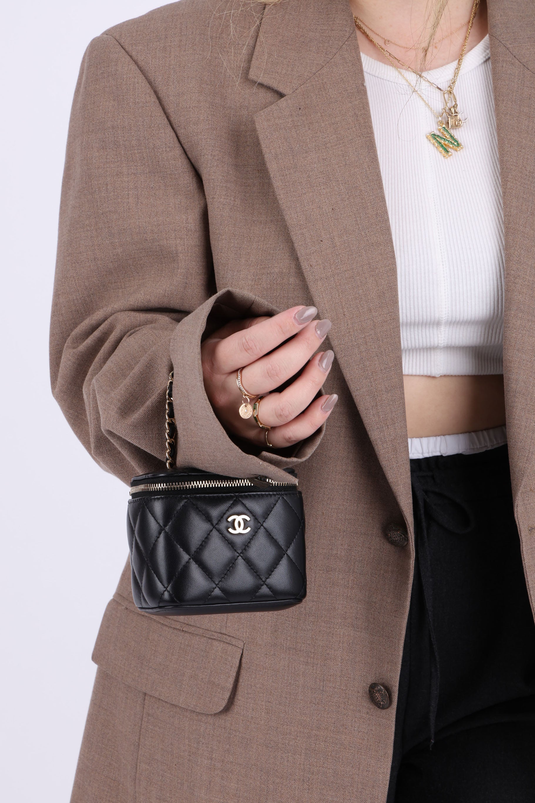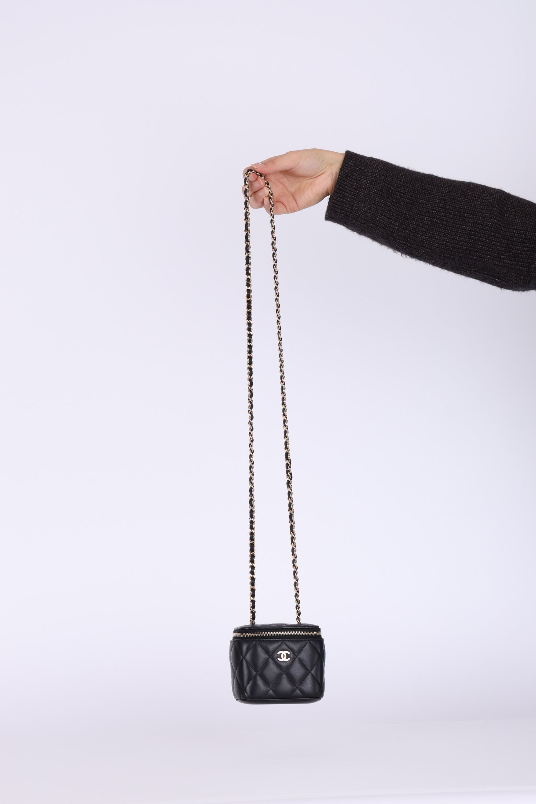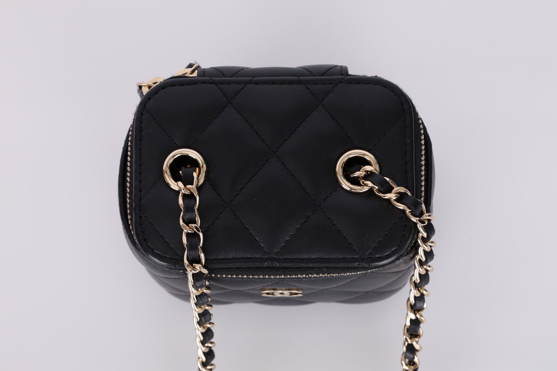 Presenting the cutest Chanel Lambskin mini vanity! The classic lambskin Chanel look but as a little vanity - can definitely be used for any season!