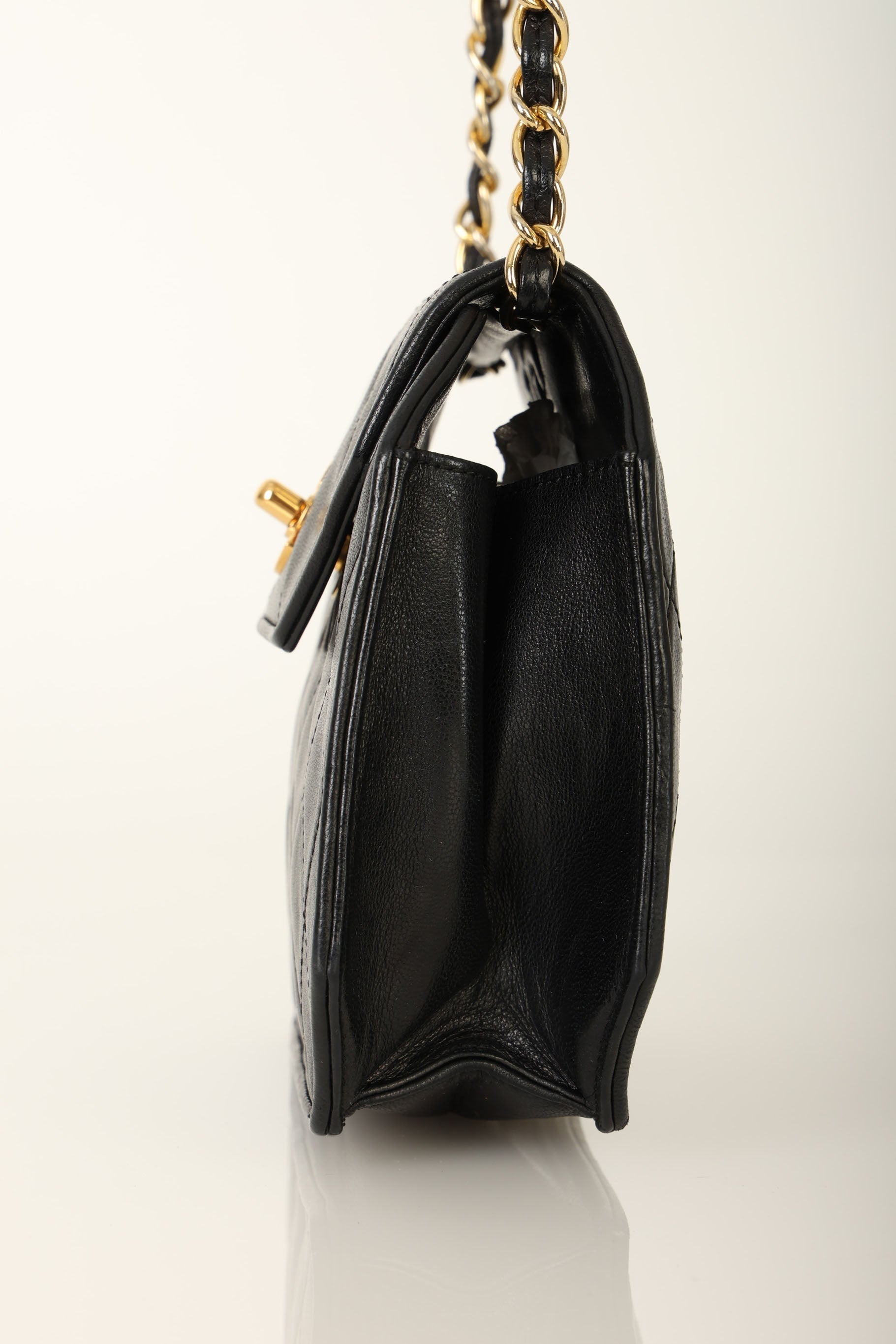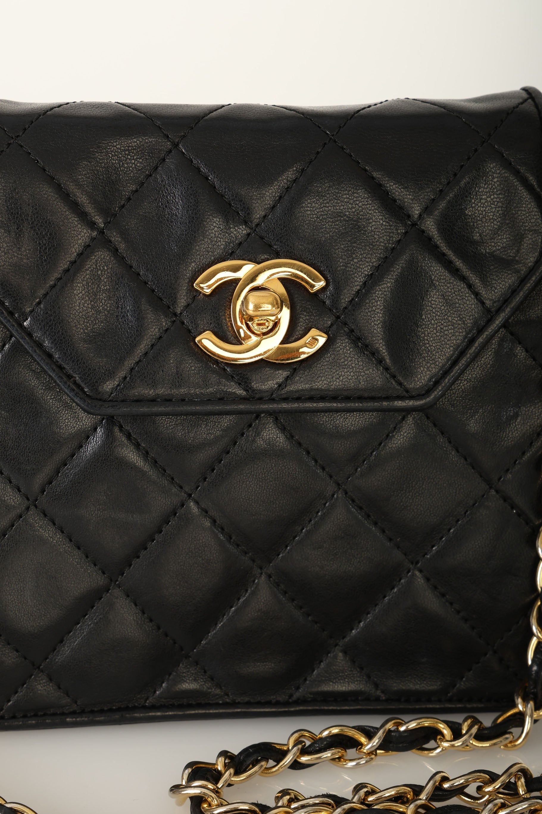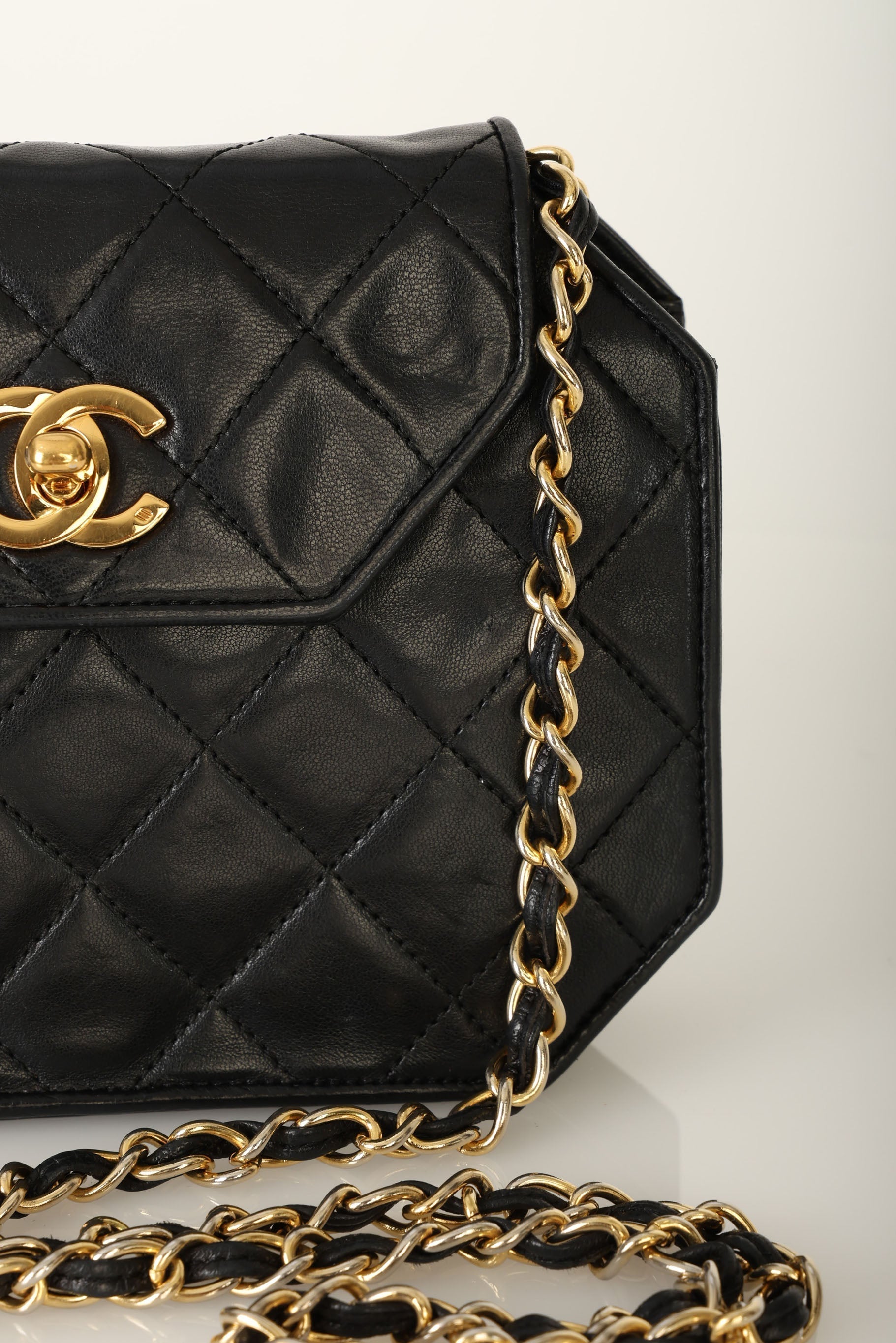 Crafted with rich black lambskin and finished 24K gold plated hardware, this vintage Chanel bag is a true masterpiece. The unique geometric shape and impeccable attention to detail make it a standout accessory that is sure to turn heads. This rare and unique piece is a true testament to the timeless elegance and sophistication of Chanel.