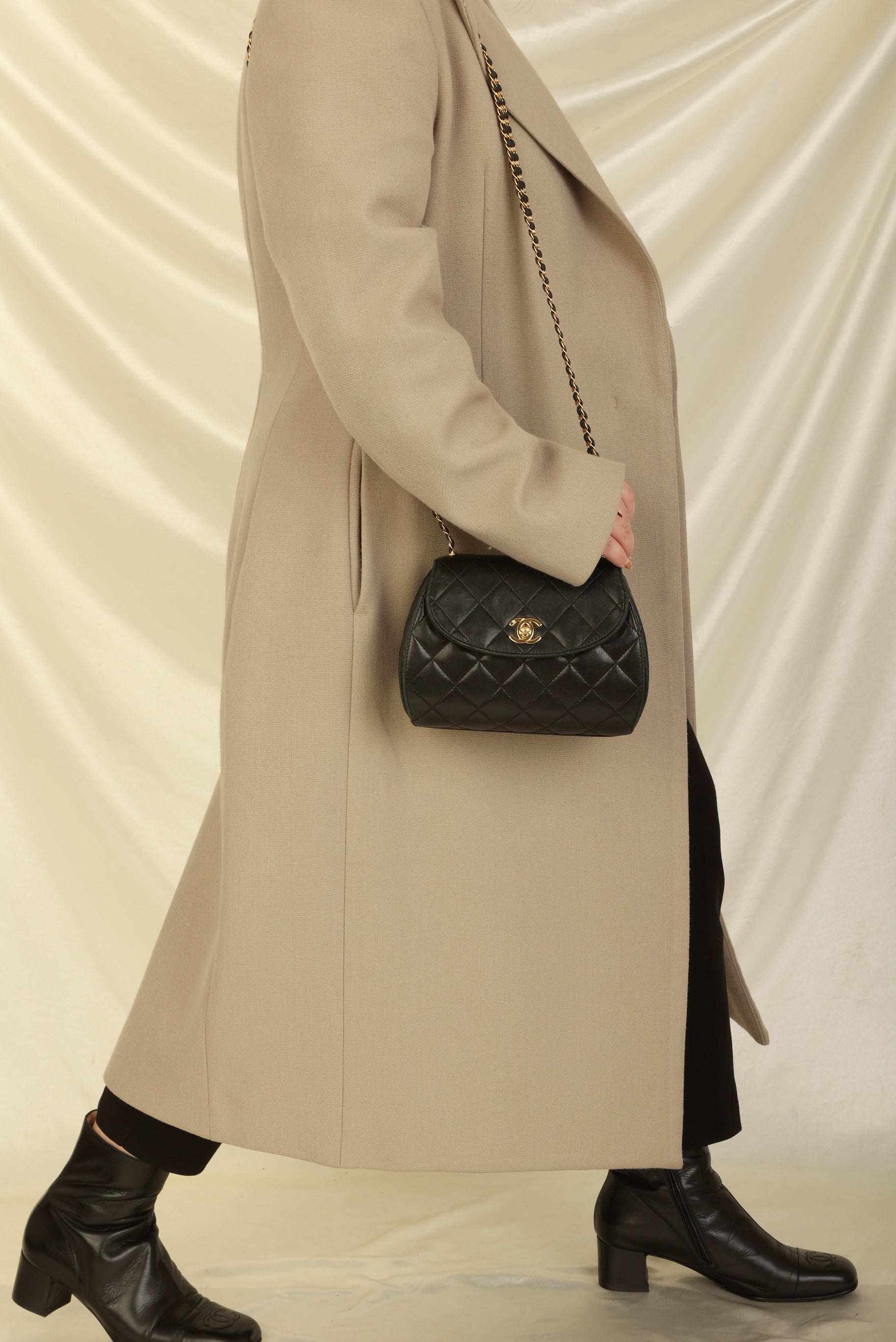 Dropping in the shop is this fun Chanel Lambskin Quad Chain Bag! This piece is crafted in soft lambskin with 24k gold plated hardware. The shape of the bag and the quadruple chain detail makes this bag so unique. The inside features two smaller compartments, one being zipped. You can fit your phone, card case, and a few other smaller essentials.