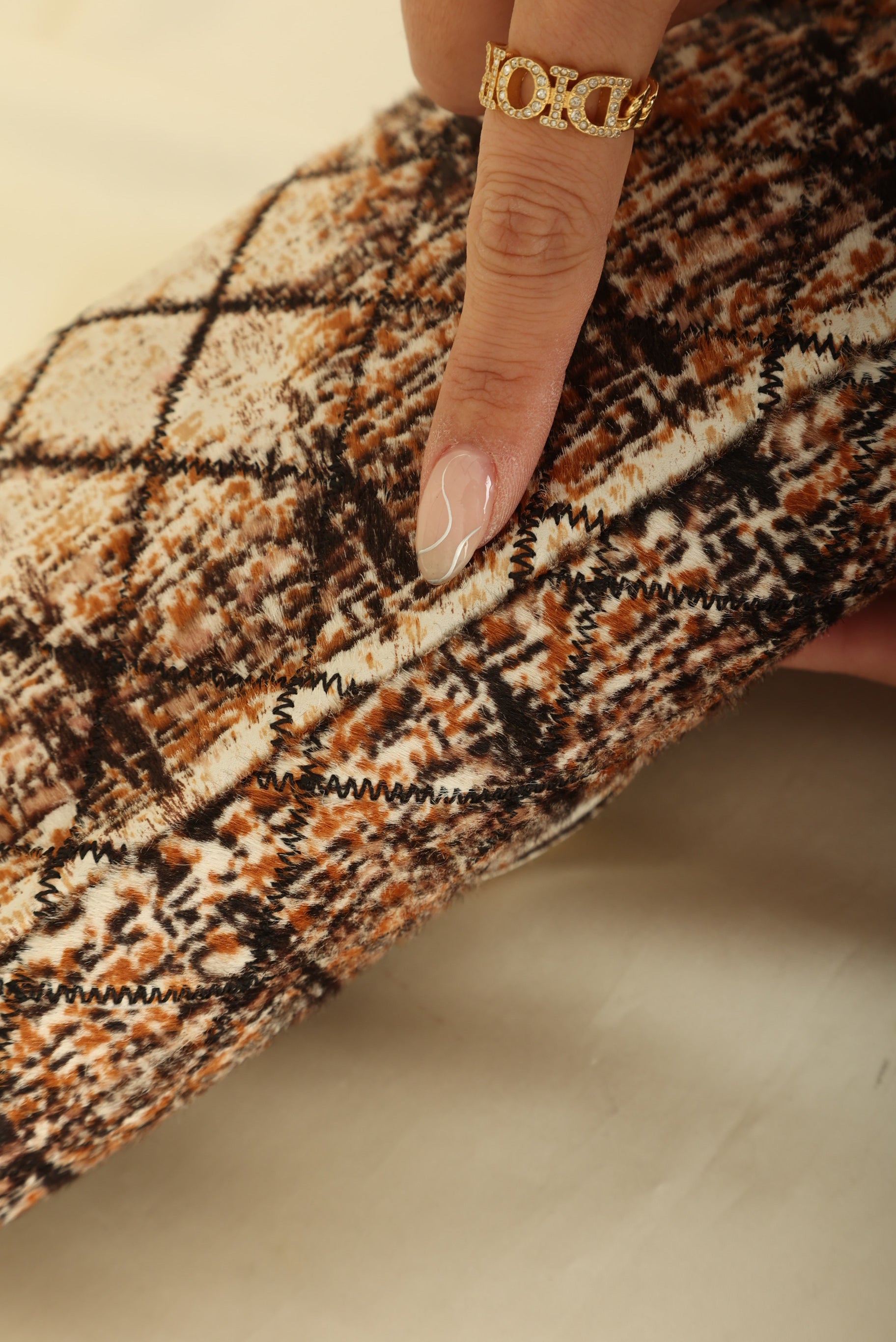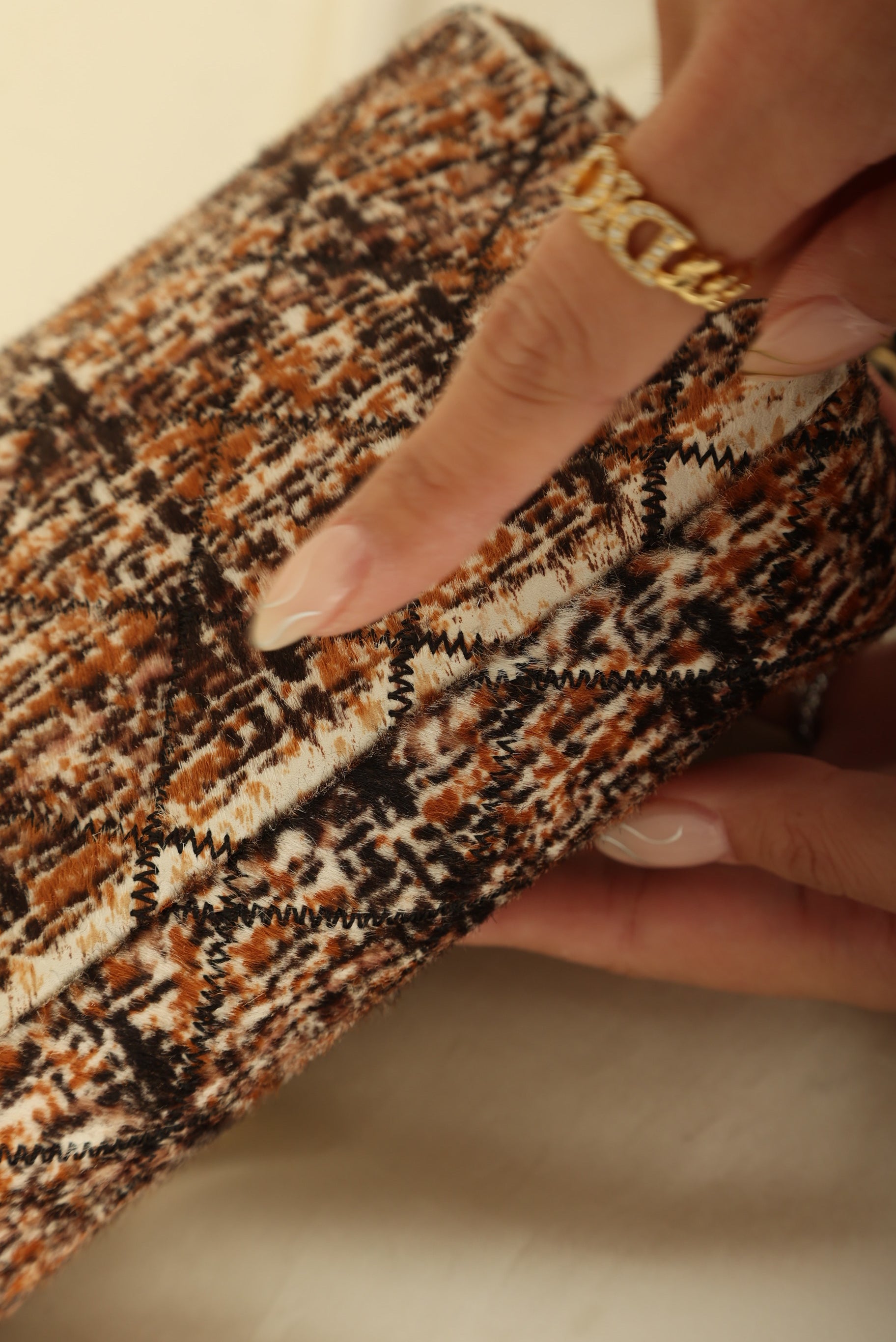 If fall was a color, it would be this bag! This beauty is crafted in pony hair and features the rare east-west design. The colors of the bag are perfect for fall and will bring a touch of warmth to any outfit. You can fit your phone, keys, sunglasses wallet, and one or two smaller essentials.