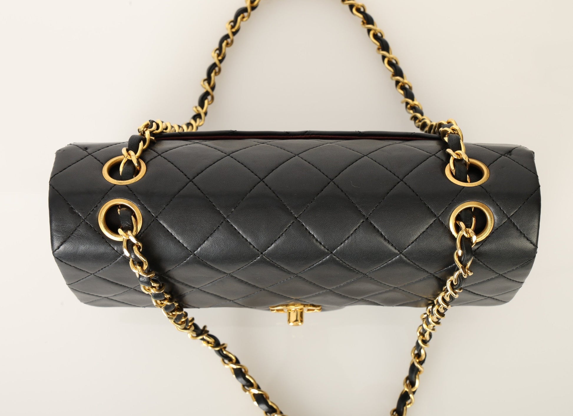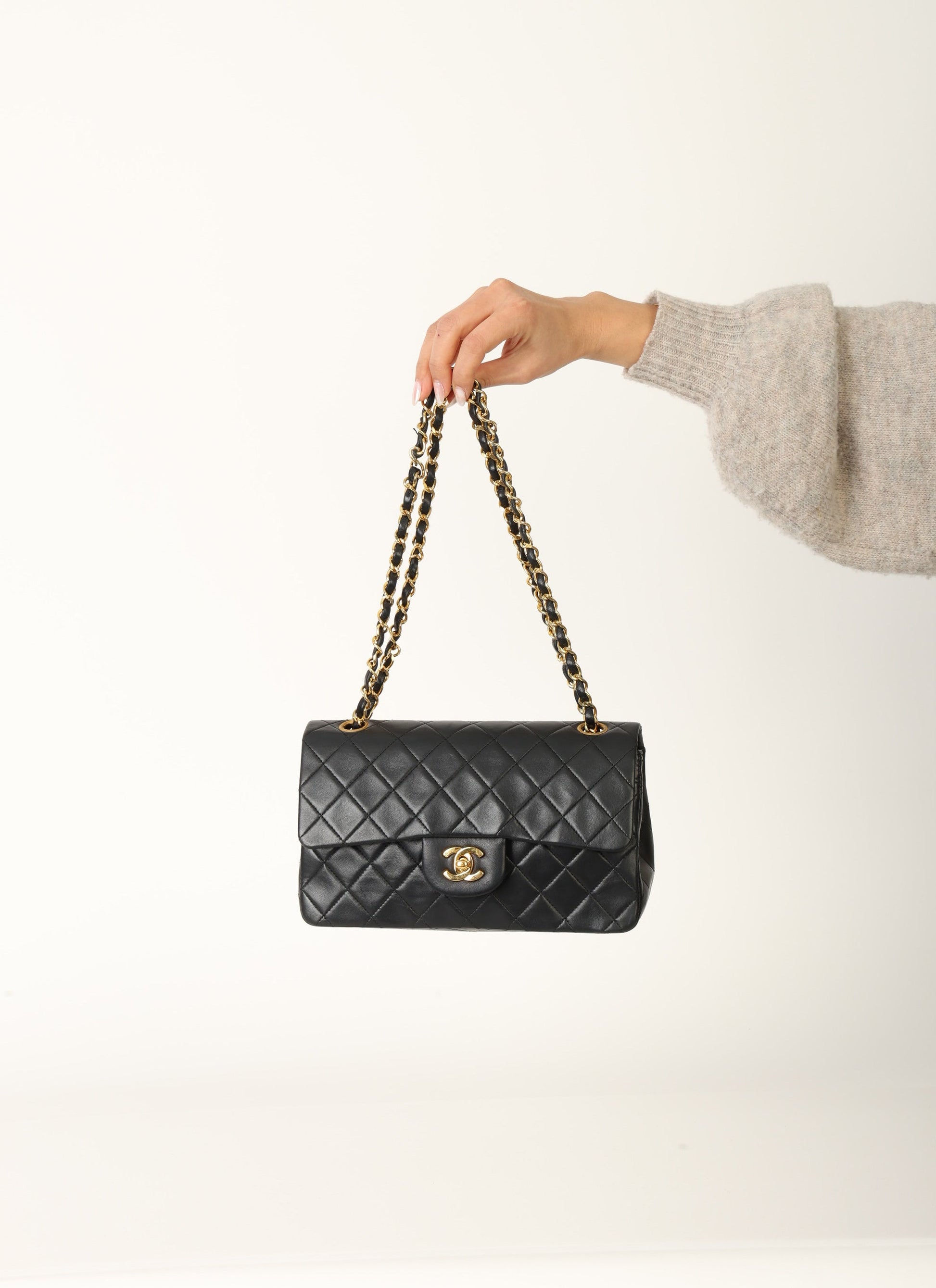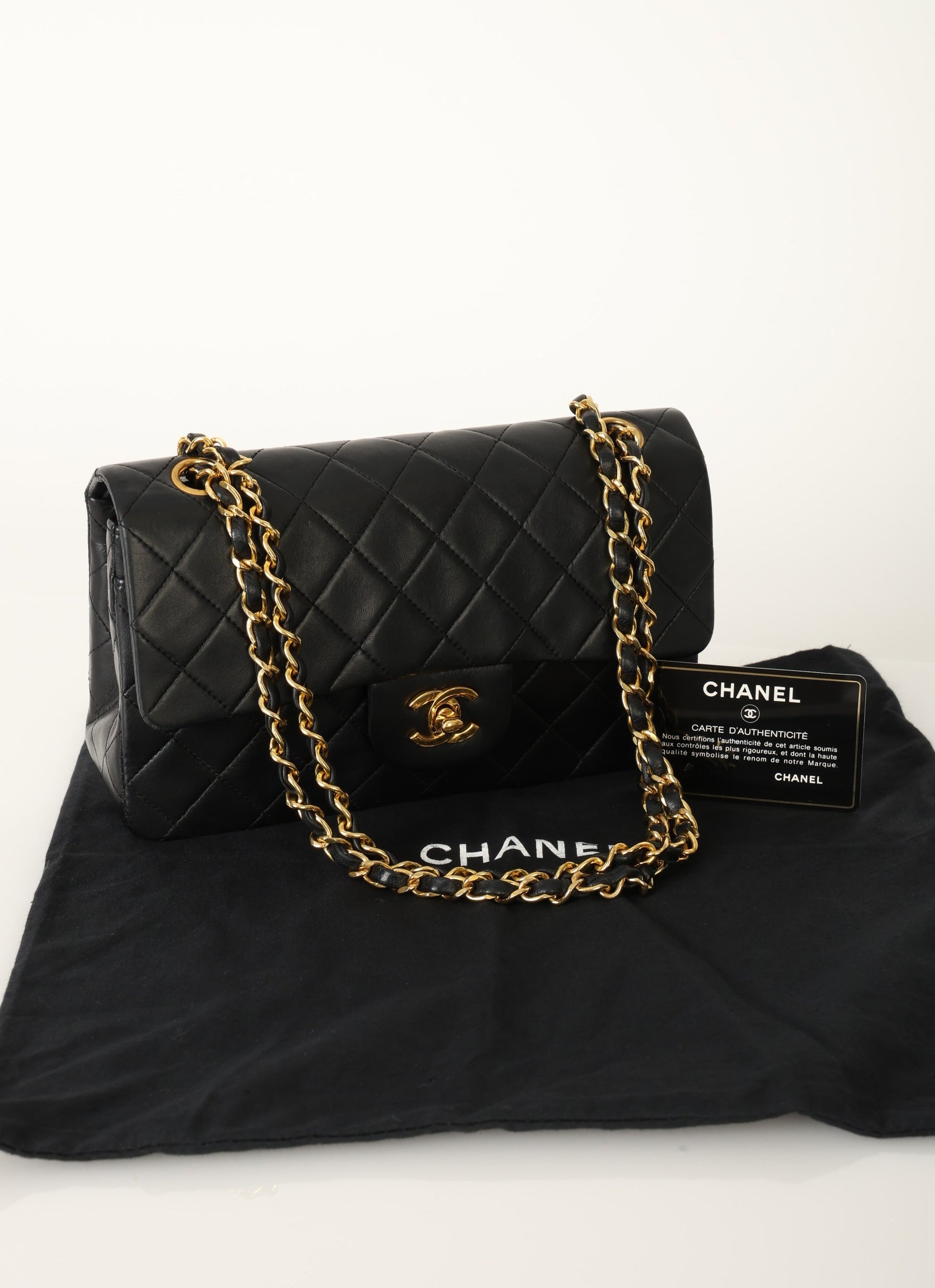 Dropping in the shop is a stunning, soft classic Chanel Lambskin Small Double Flap in black with gold hardware! An New investment piece that?can be loved for years to come. Vintage Chanel crafted in the 90s 24k hardware and soft buttery lambskin. Don't miss out on this gorgeous find! Can be as a long or short-shoulder bag. You can fit your phone, keys wallet, and a few other smaller essentials.?