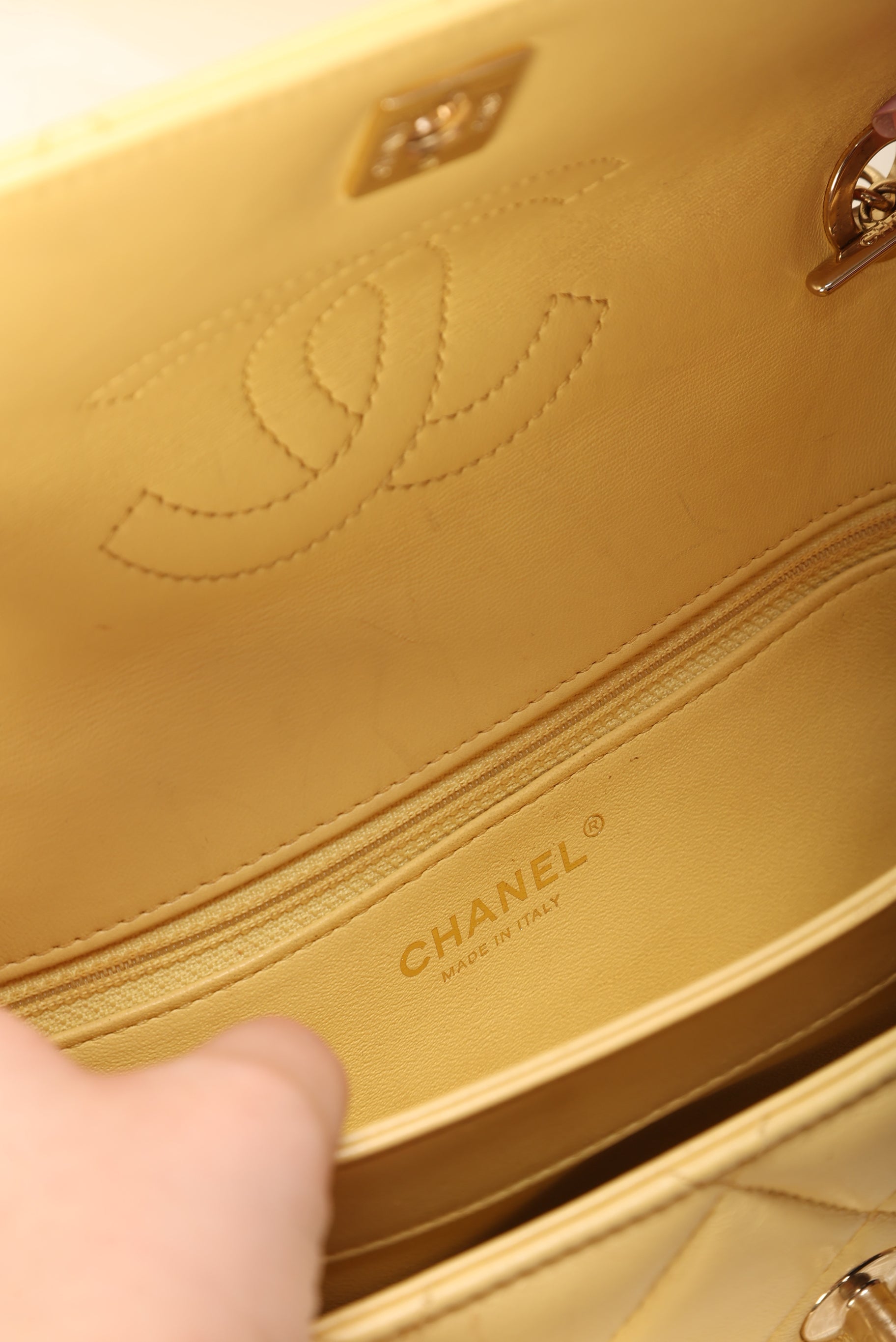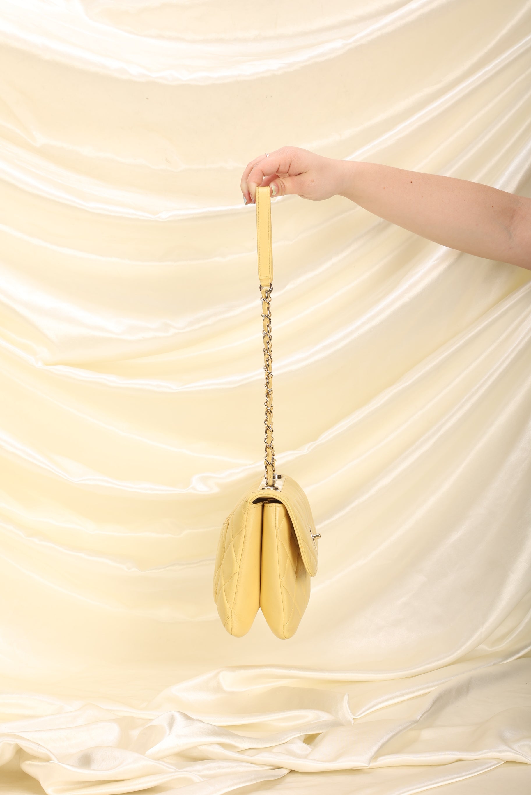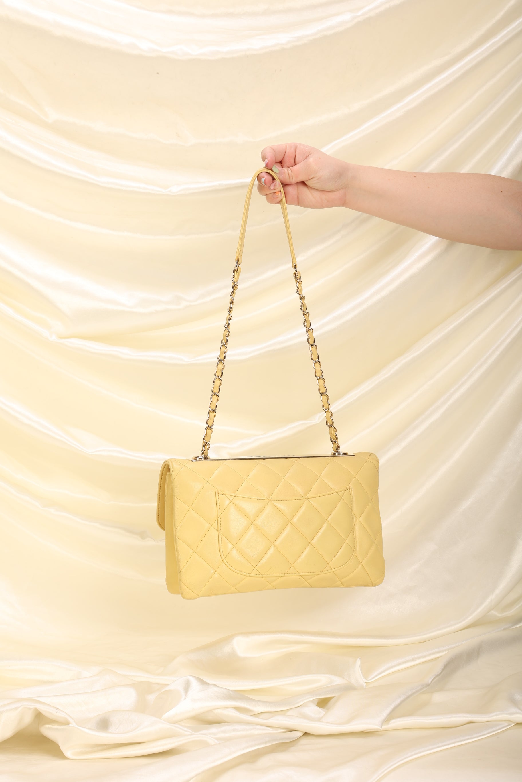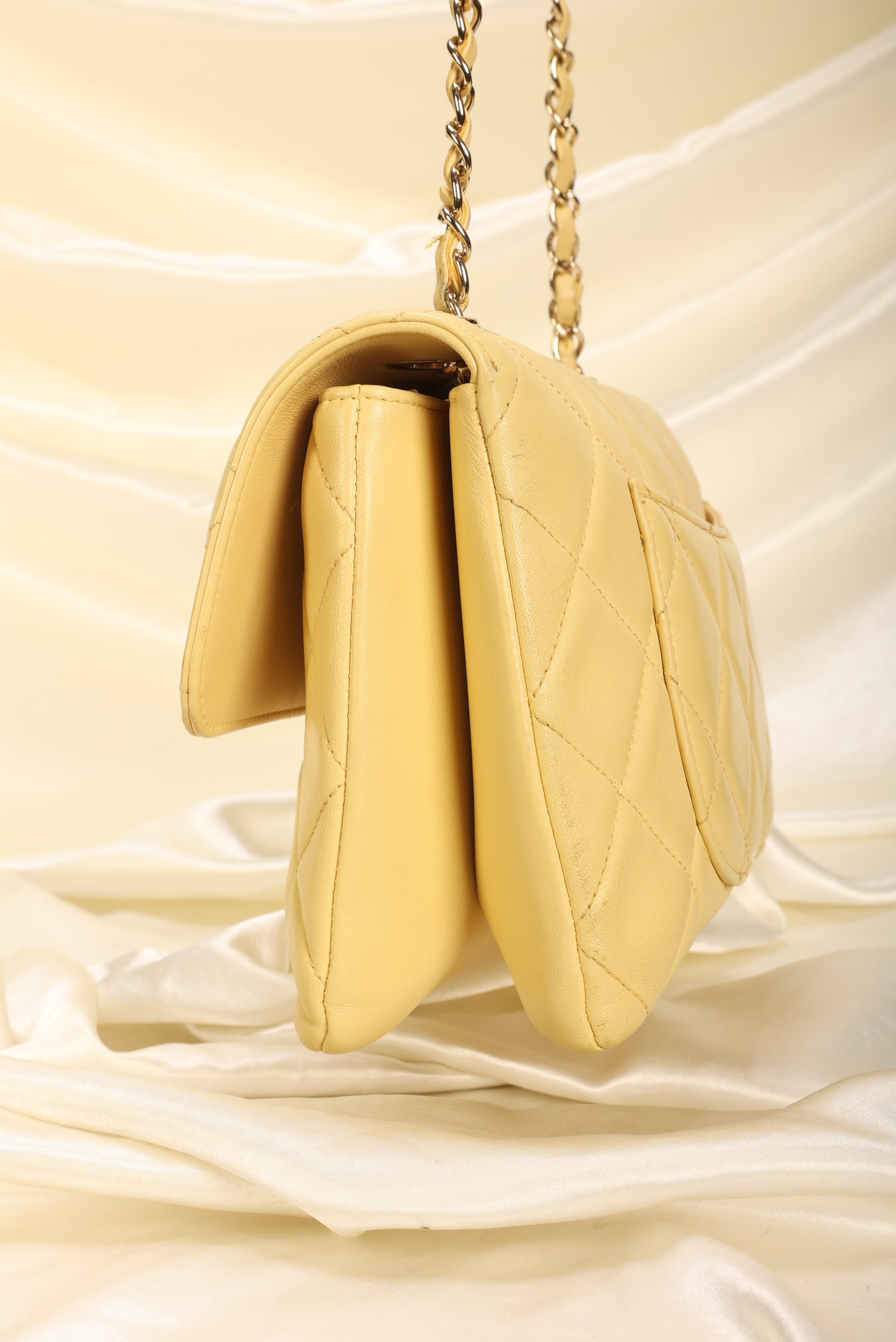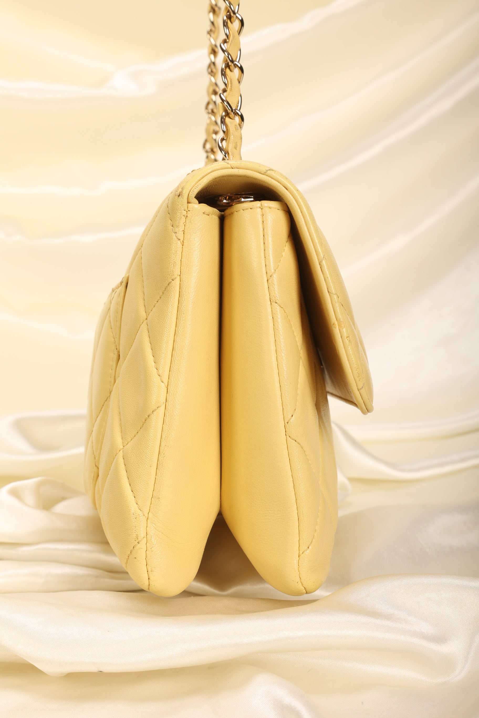A vibrant and bold Chanel bag that's sure to make a statement. The eye-catching lemon yellow lambskin leather is perfectly complemented by the exquisite gold hardware, creating a look that's both modern and timeless. This shade is the perfect pop of color to add to any outfit and is sure to turn heads. Whether you're pairing it with a casual outfit or using it to add a bold accent to a formal look, this is the perfect accessory.