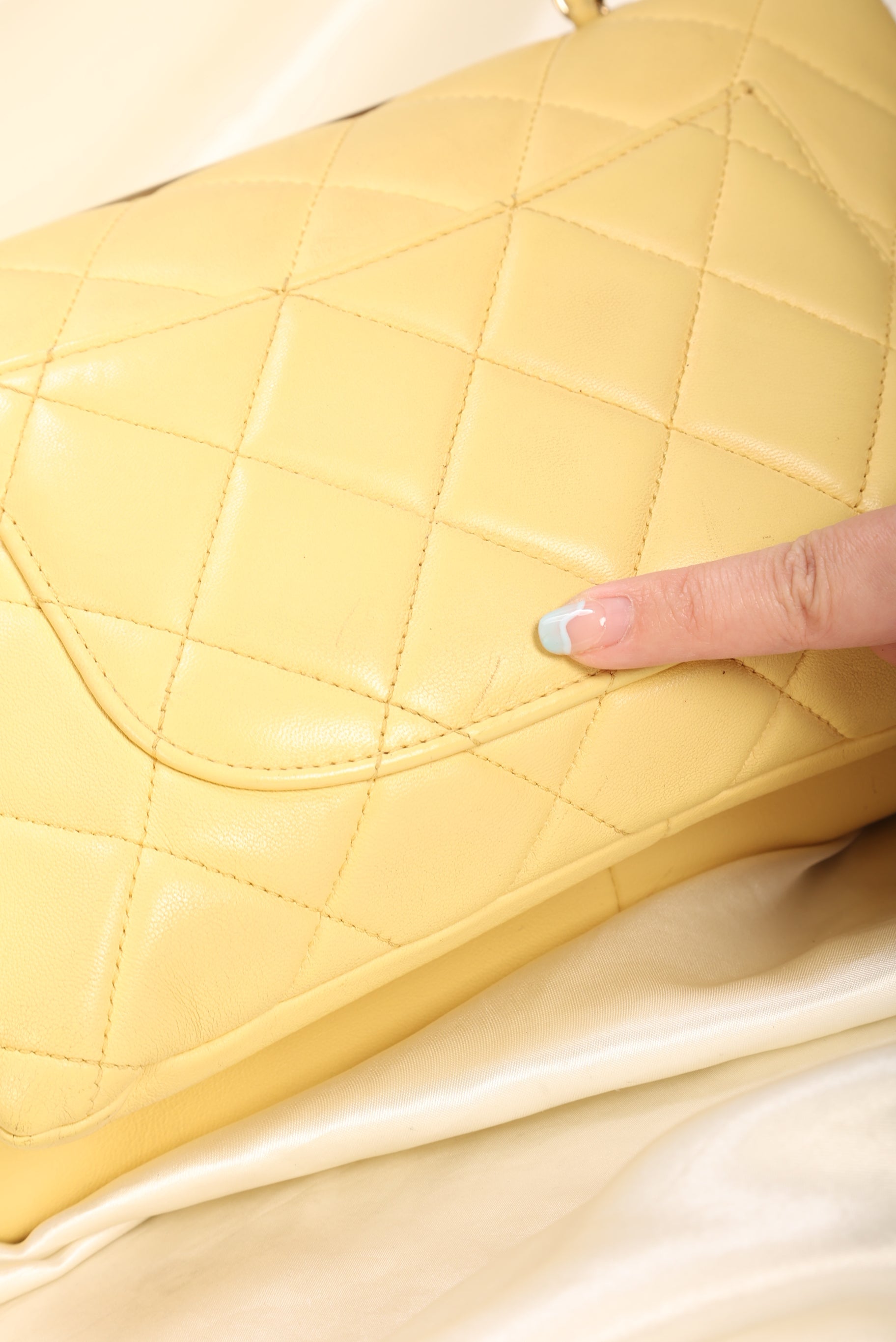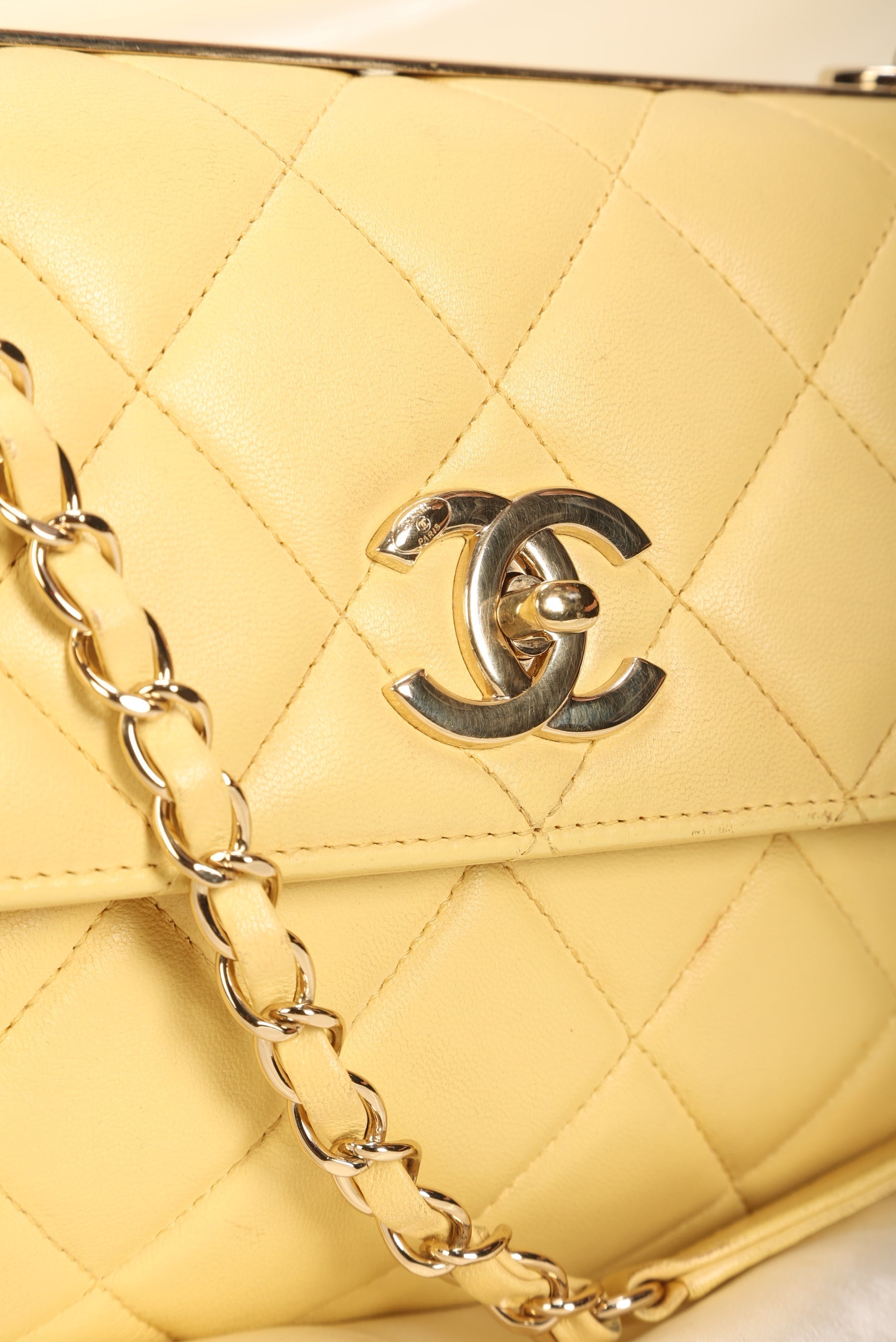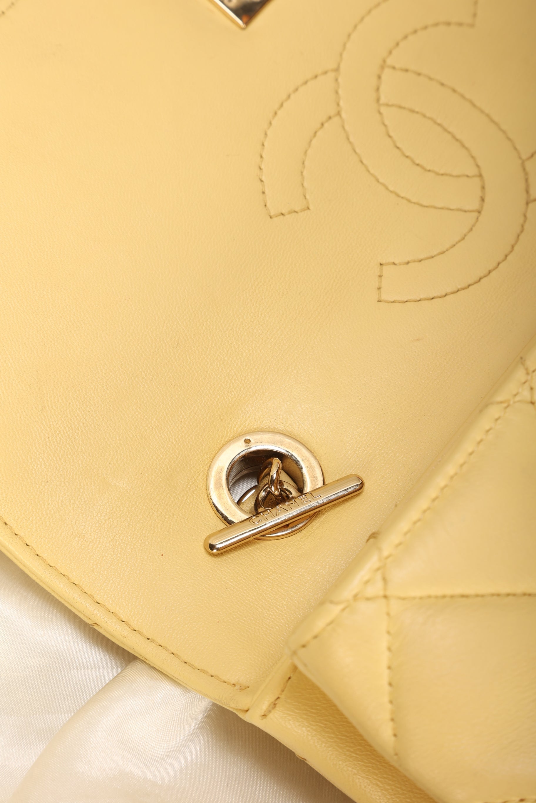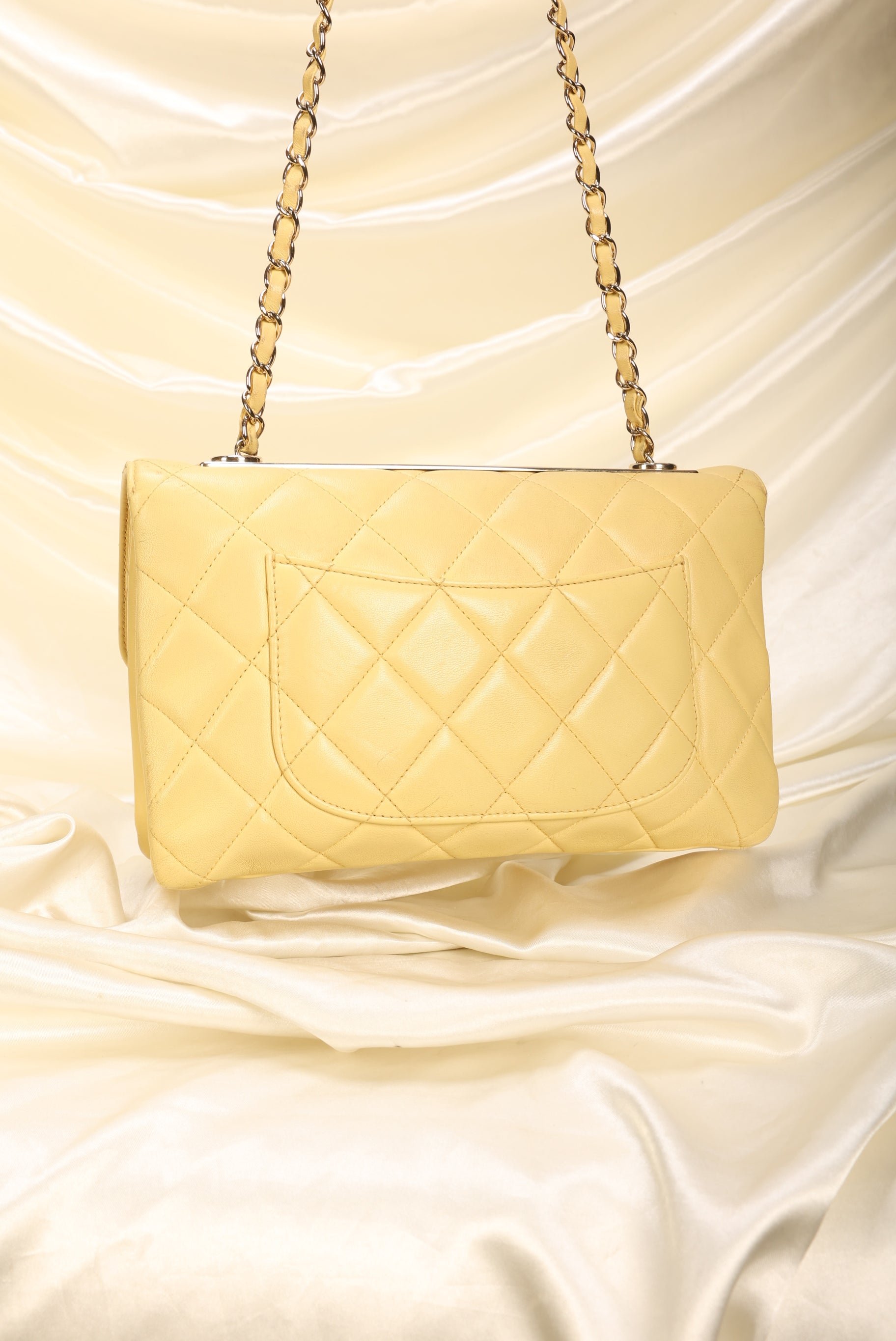 A vibrant and bold Chanel bag that's sure to make a statement. The eye-catching lemon yellow lambskin leather is perfectly complemented by the exquisite gold hardware, creating a look that's both modern and timeless. This shade is the perfect pop of color to add to any outfit and is sure to turn heads. Whether you're pairing it with a casual outfit or using it to add a bold accent to a formal look, this is the perfect accessory.