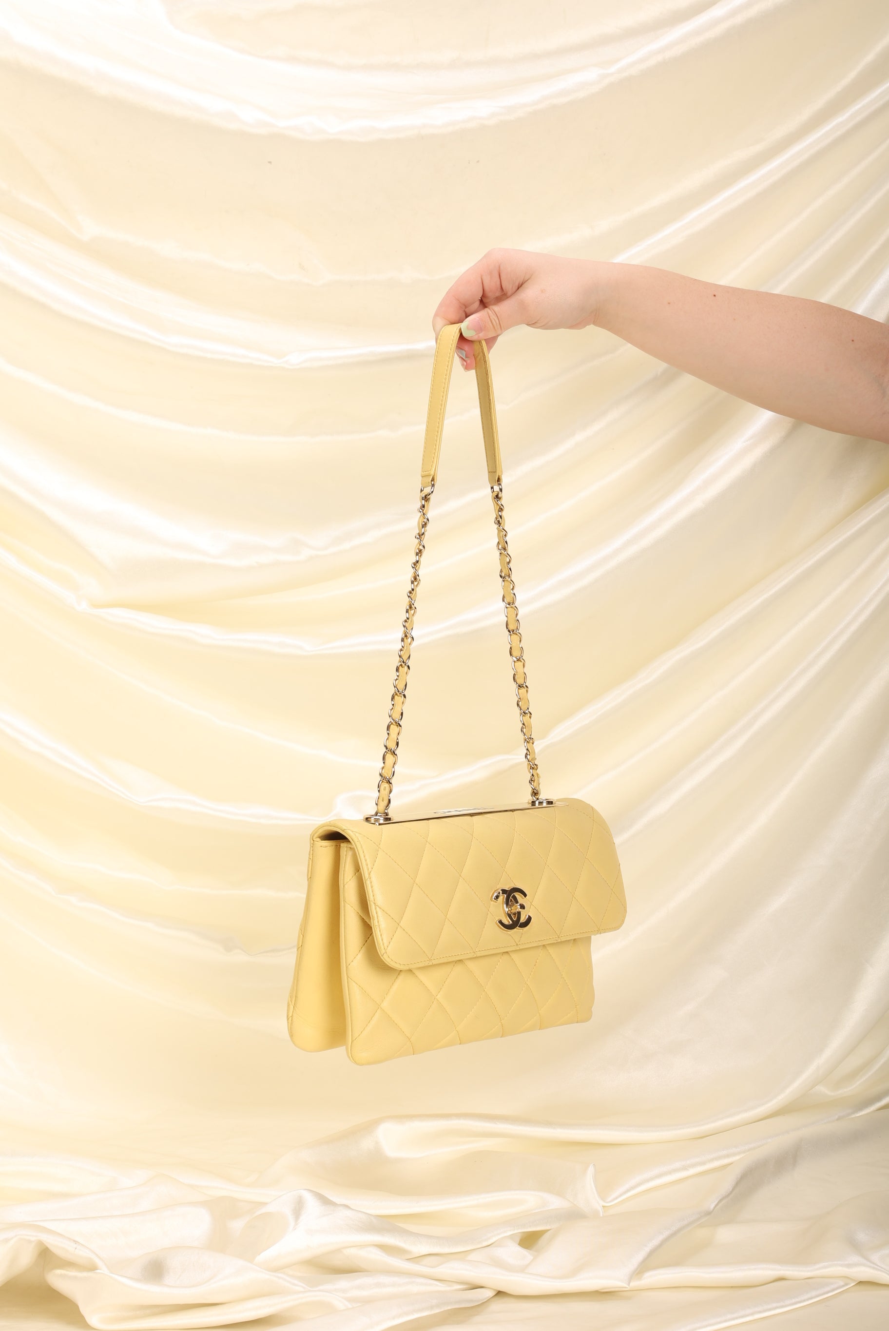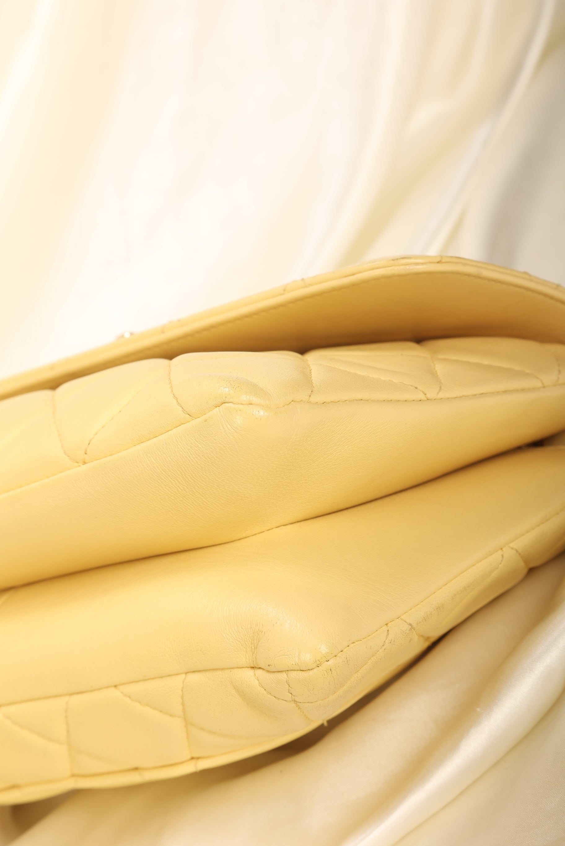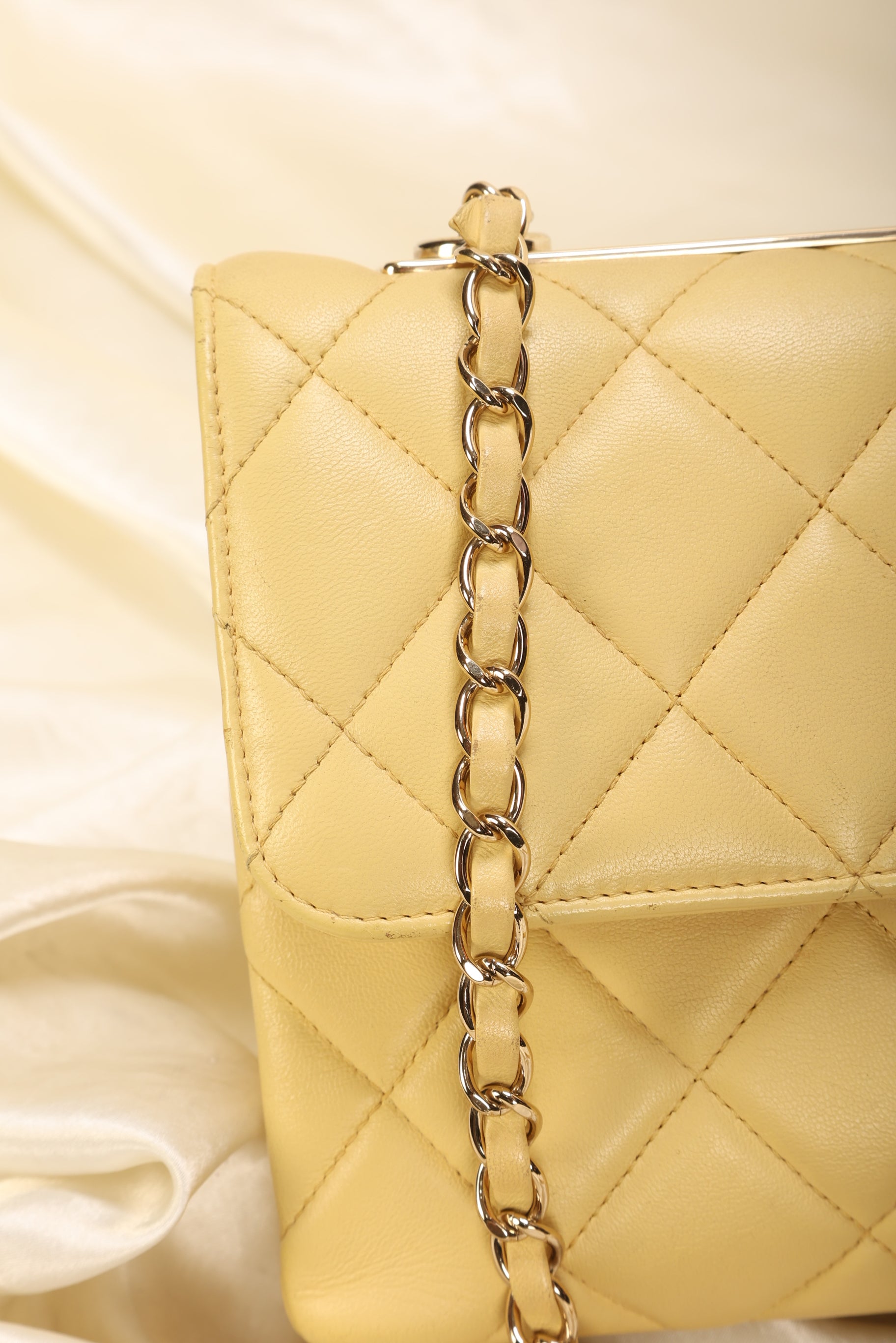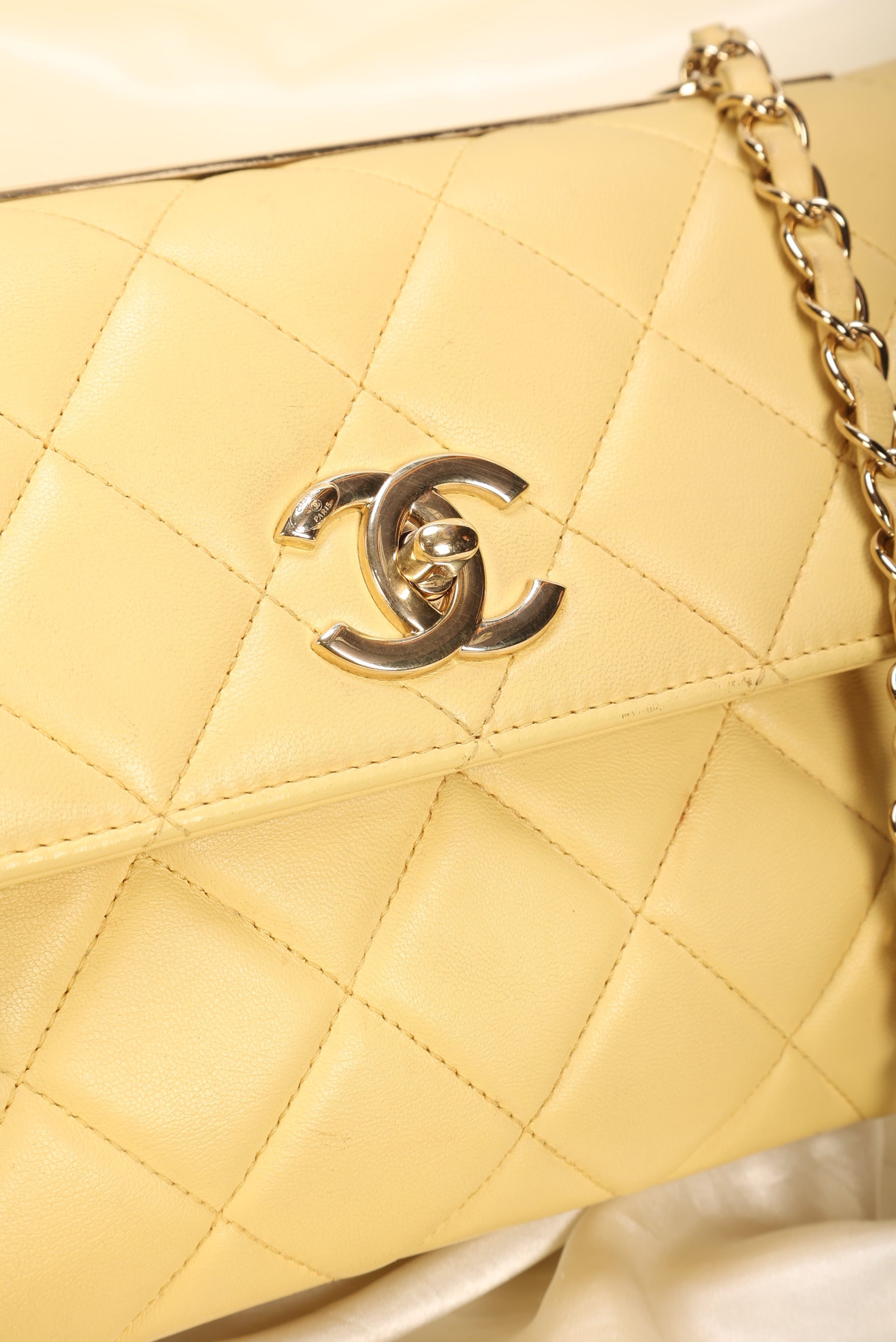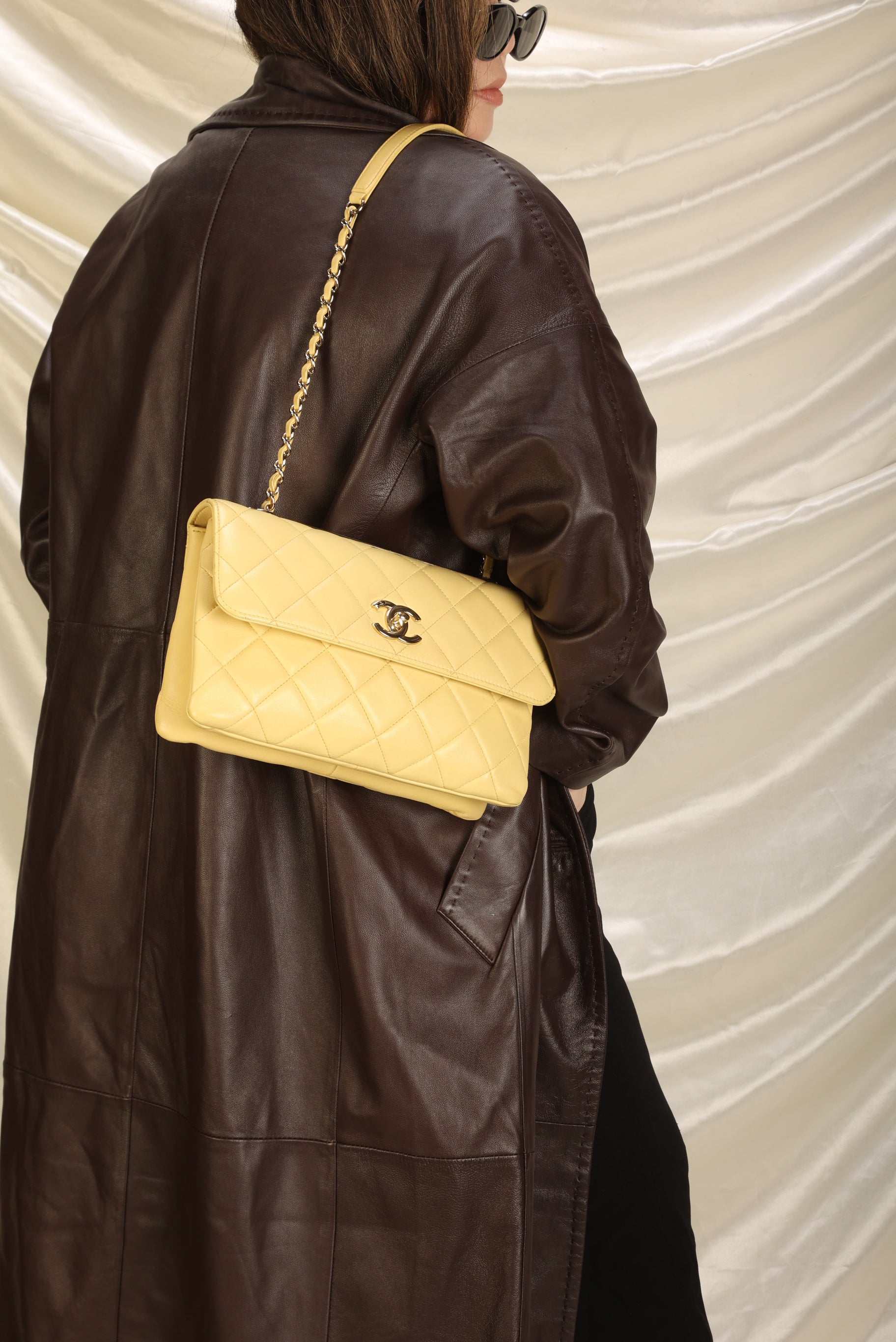 A vibrant and bold Chanel bag that's sure to make a statement. The eye-catching lemon yellow lambskin leather is perfectly complemented by the exquisite gold hardware, creating a look that's both modern and timeless. This shade is the perfect pop of color to add to any outfit and is sure to turn heads. Whether you're pairing it with a casual outfit or using it to add a bold accent to a formal look, this is the perfect accessory.