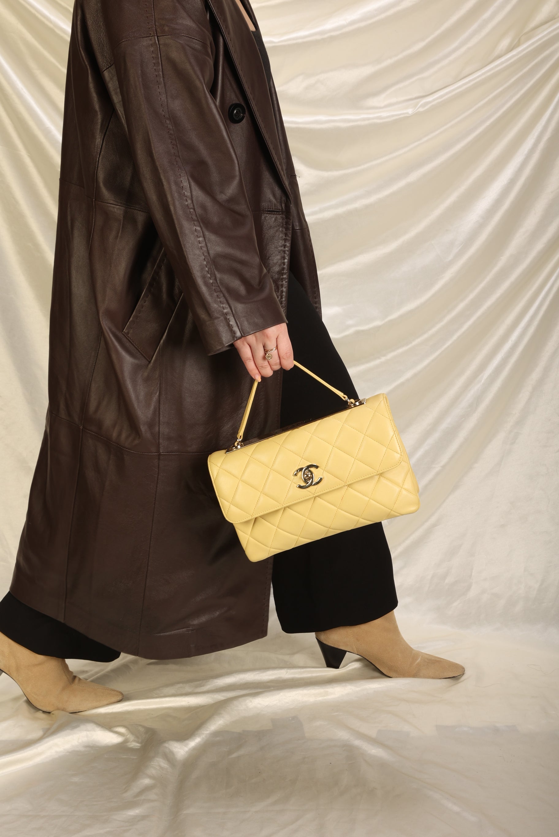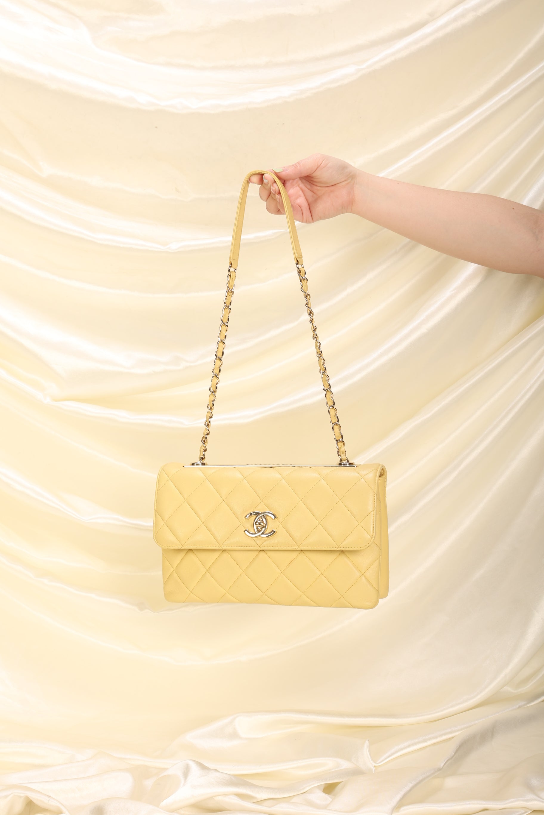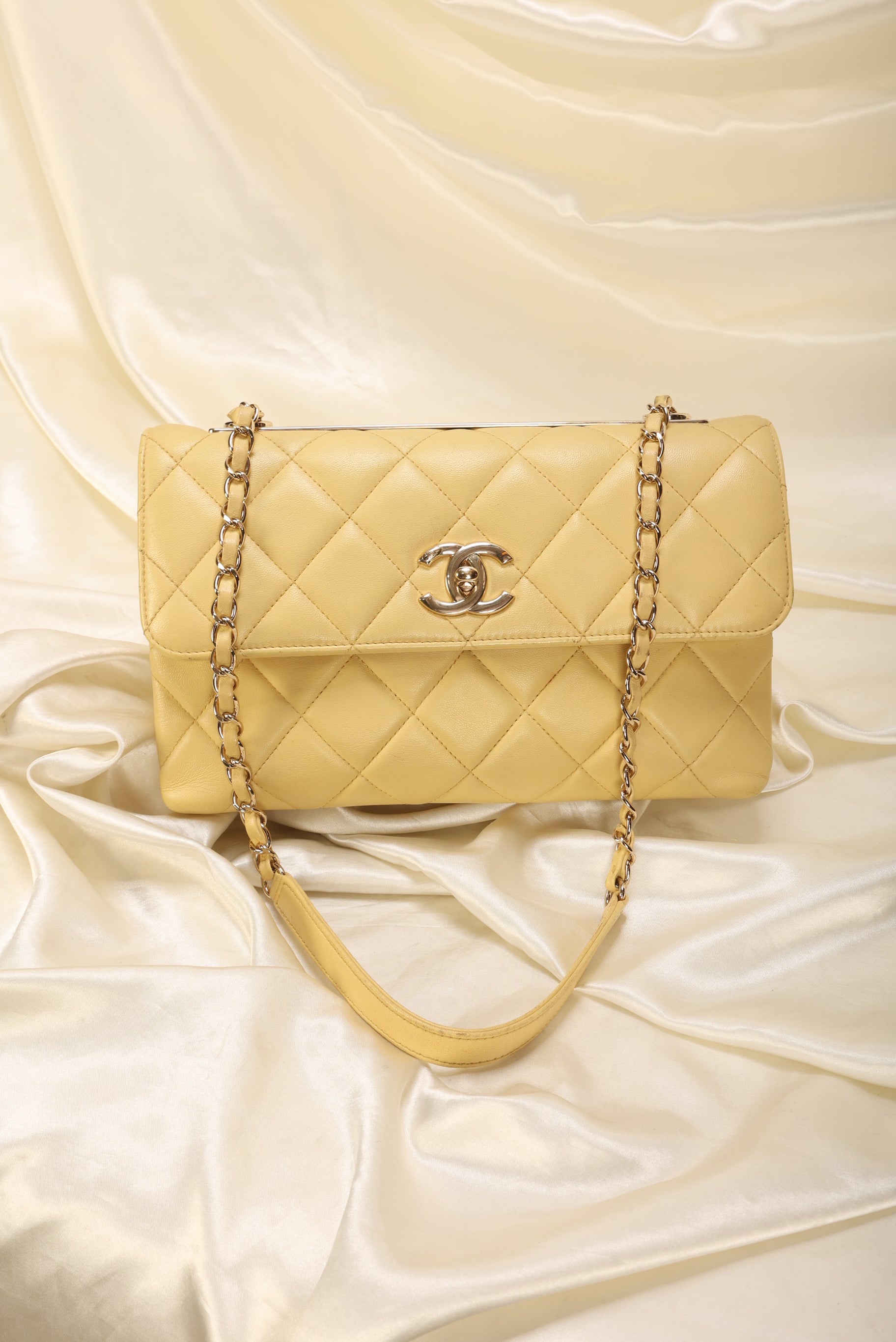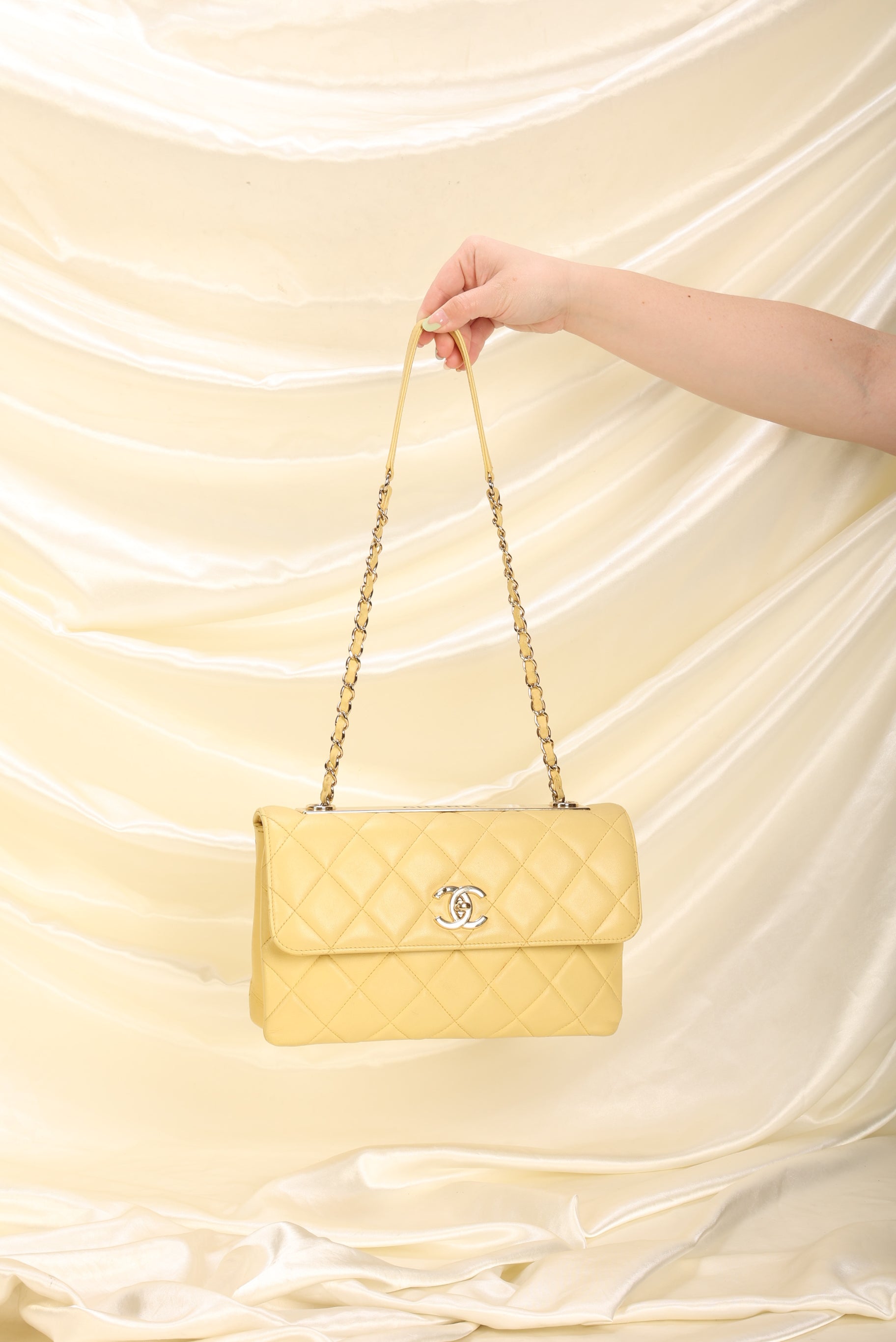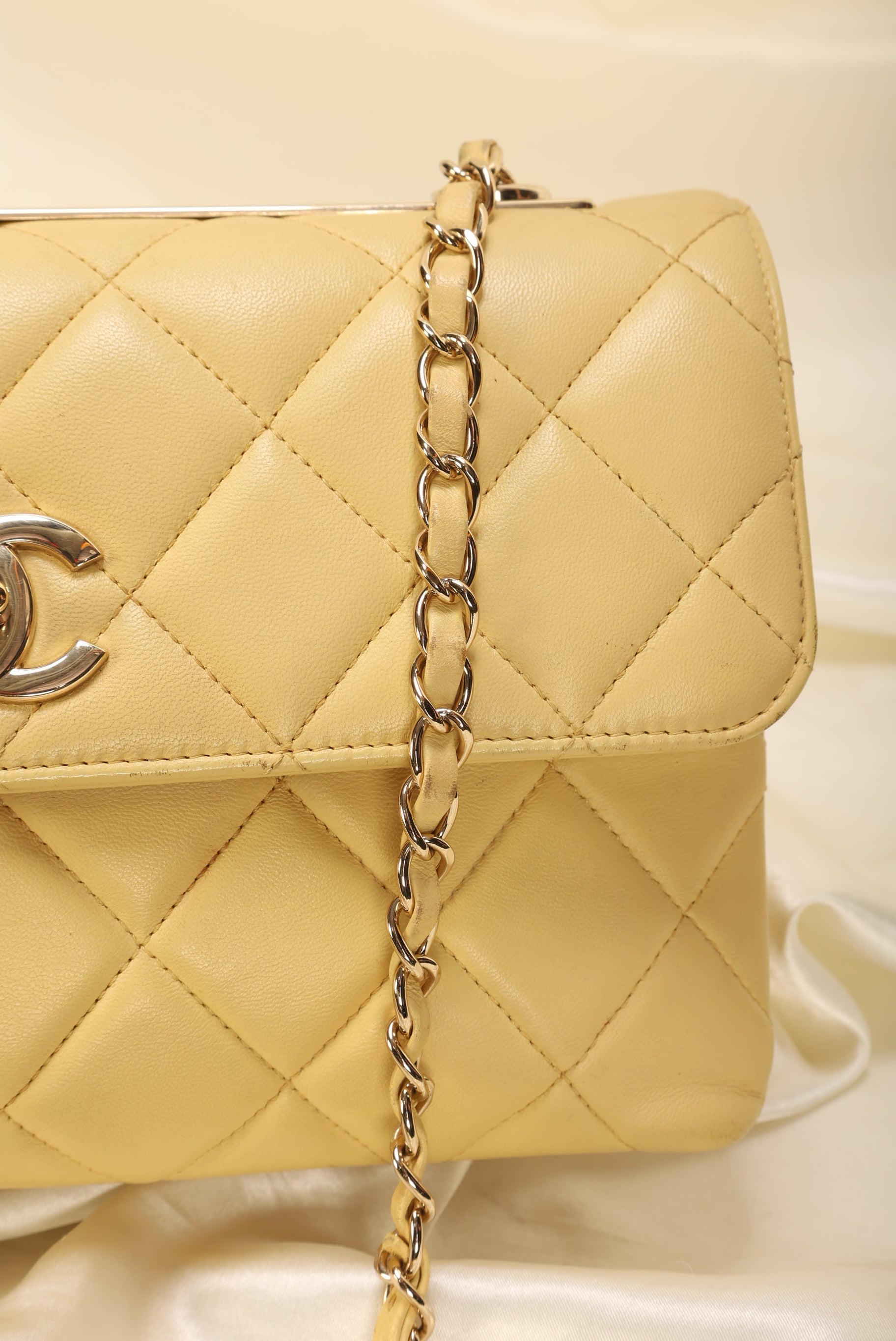 A vibrant and bold Chanel bag that's sure to make a statement. The eye-catching lemon yellow lambskin leather is perfectly complemented by the exquisite gold hardware, creating a look that's both modern and timeless. This shade is the perfect pop of color to add to any outfit and is sure to turn heads. Whether you're pairing it with a casual outfit or using it to add a bold accent to a formal look, this is the perfect accessory.
