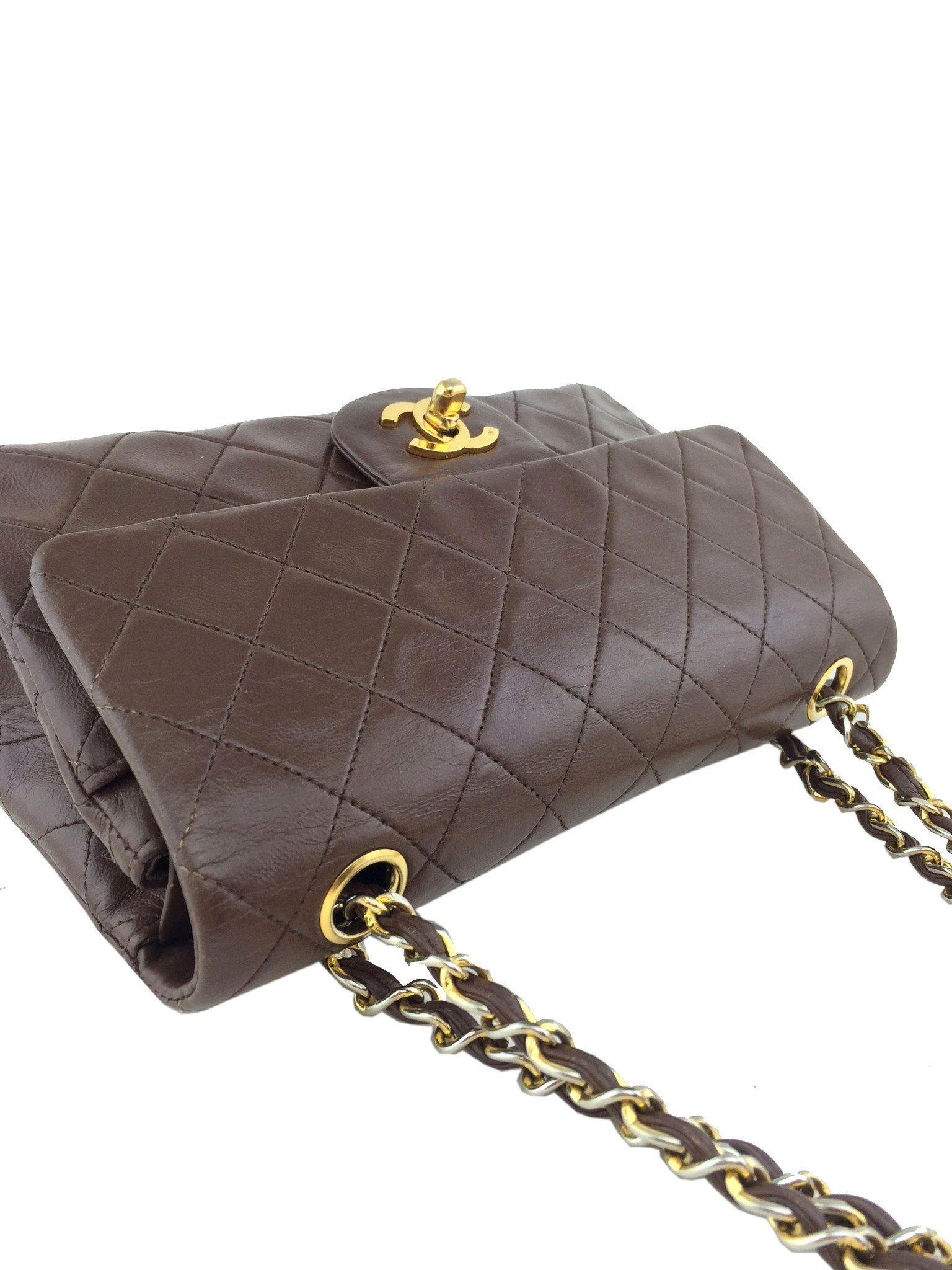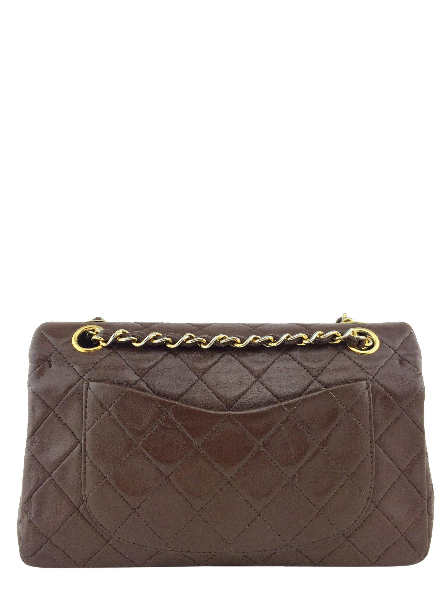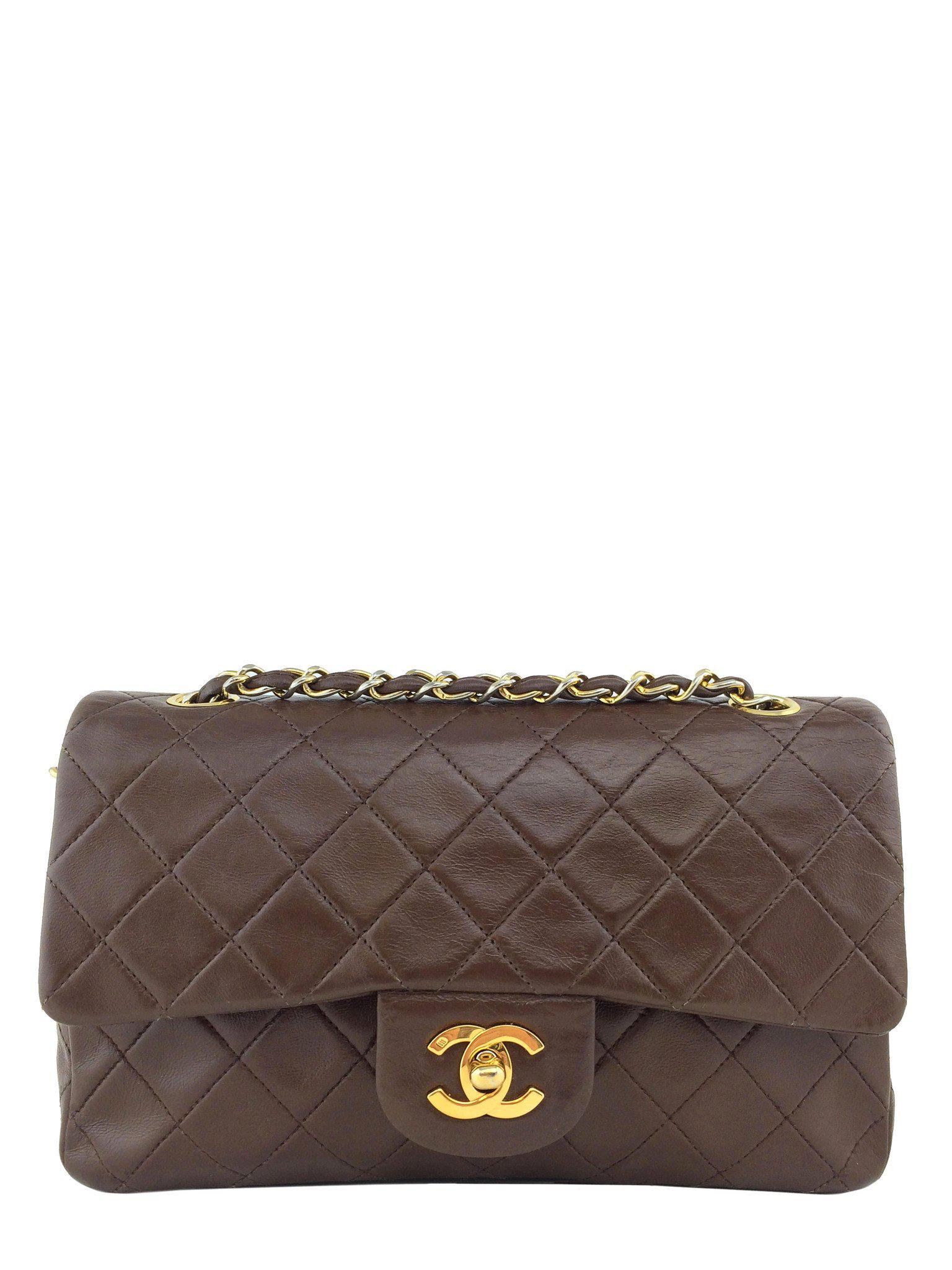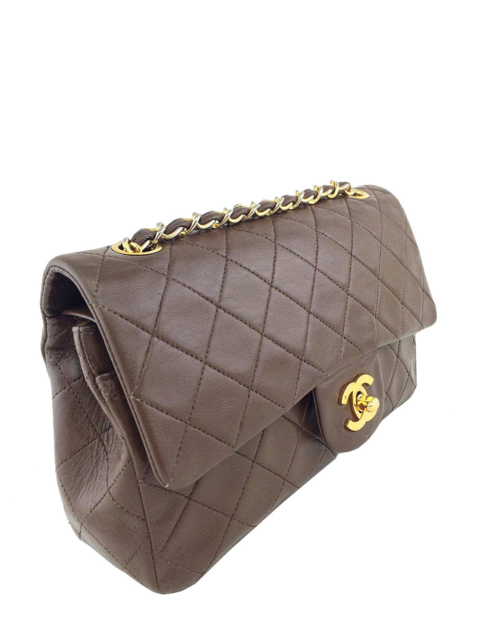 We the ity of this Chanel Quilted Lambskin Small Classic Double Flap Bag crafted in supplebrown diamond quilted lambskin leather and gold-tone hardware. This iconic bag features a chain link and leather shoulder strap that can be long or doubled, an exterior rear pocket and a double front flap with signature CC turn lock closure.