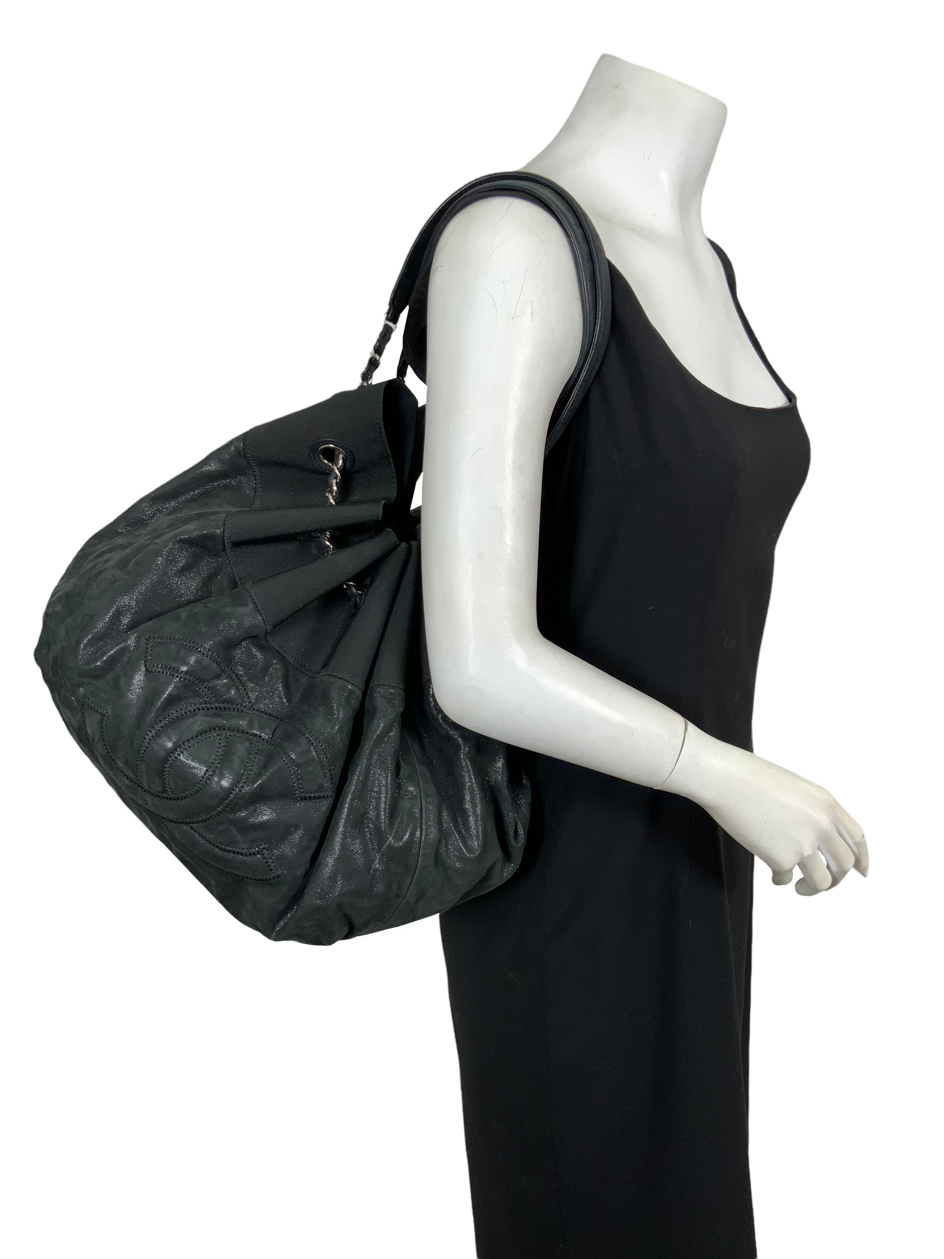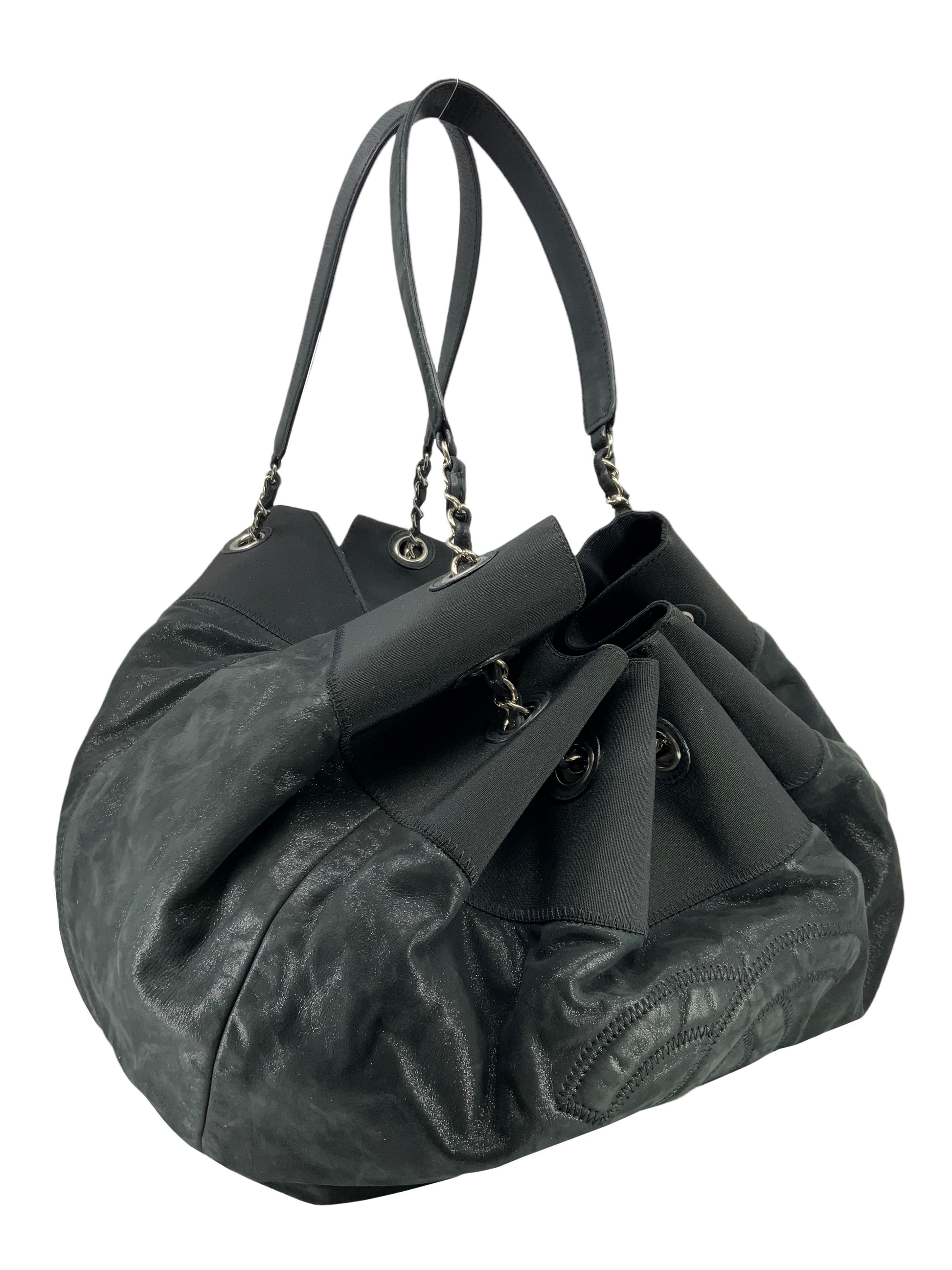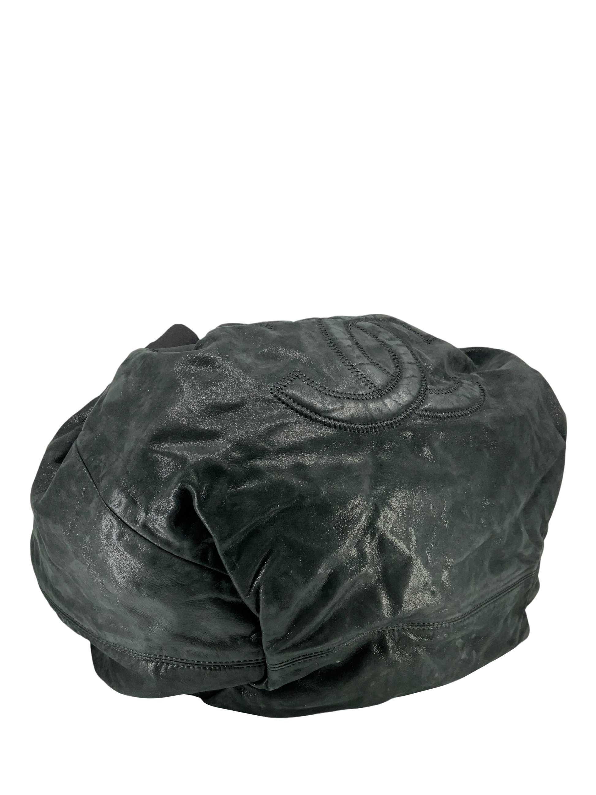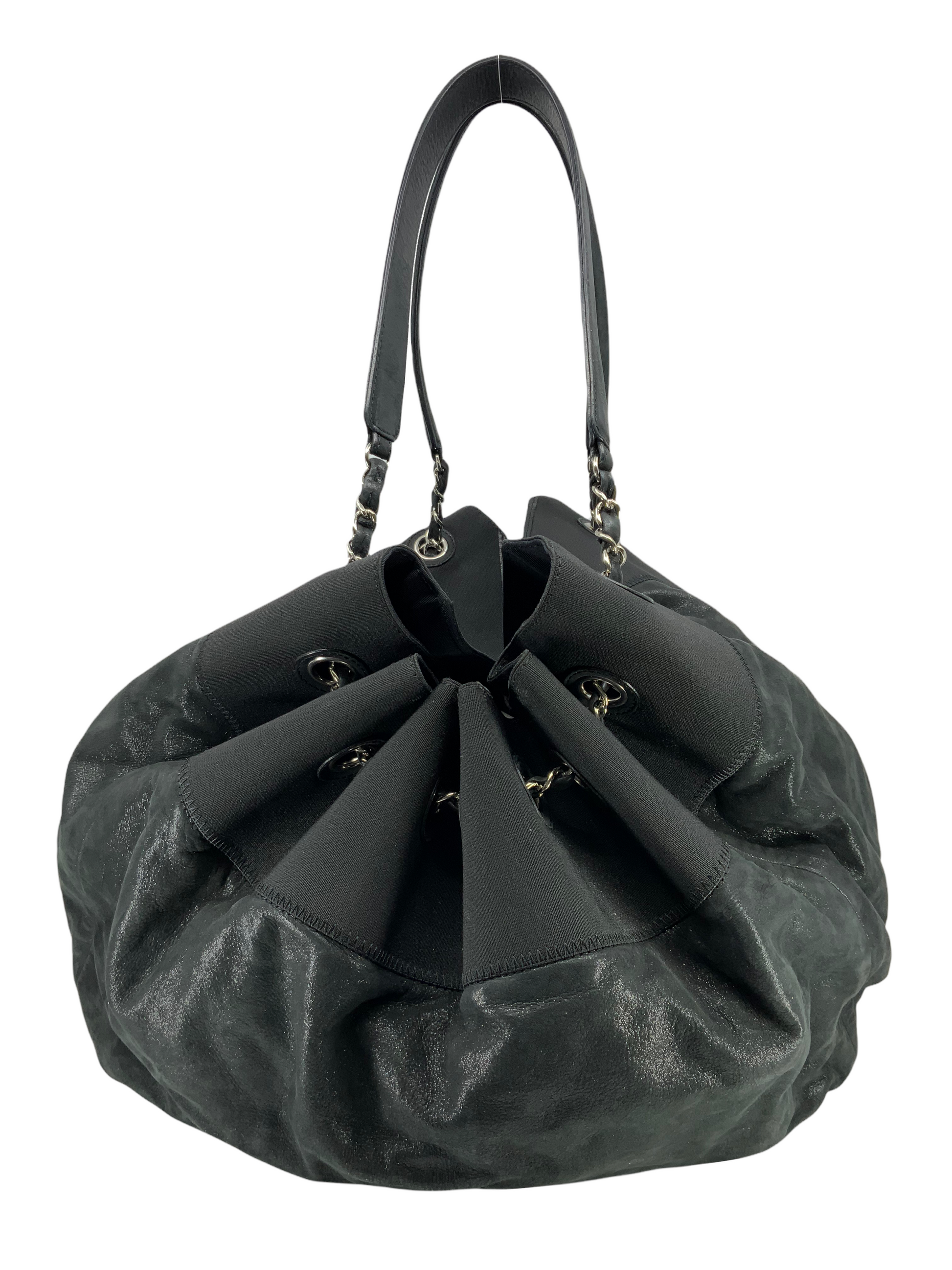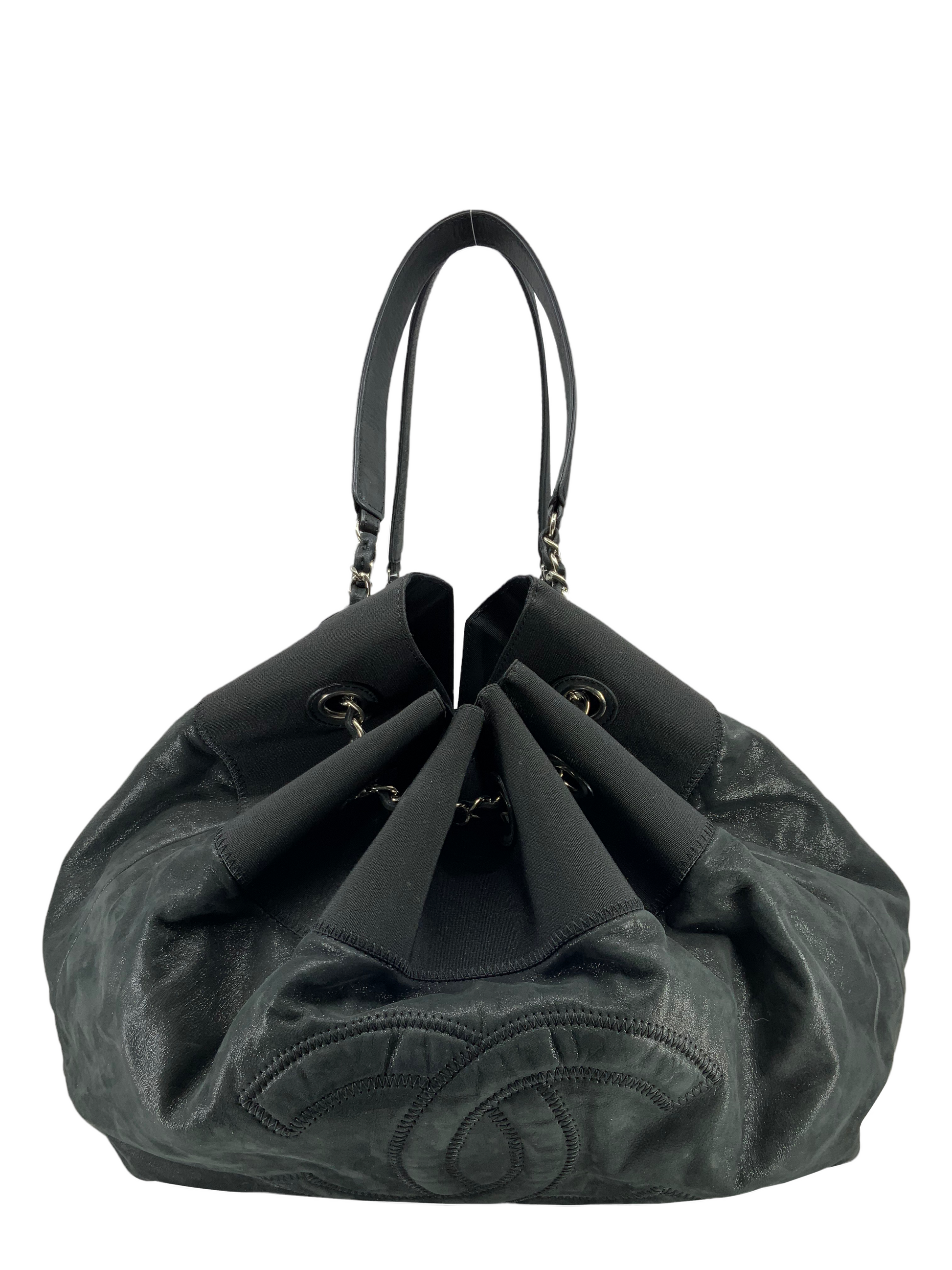 Add to your collection this extremely rare Chanel Leather Stretch Spirit Large Cabas Hobo Bag crafted from supple black iridescentcalfskin leather with a nylontop trim and silver-tone hardware.Featuring a large signature embroidered 'CC' at center and dual chain link shoulder straps threaded through eyelets, creating a cinch cord closure.