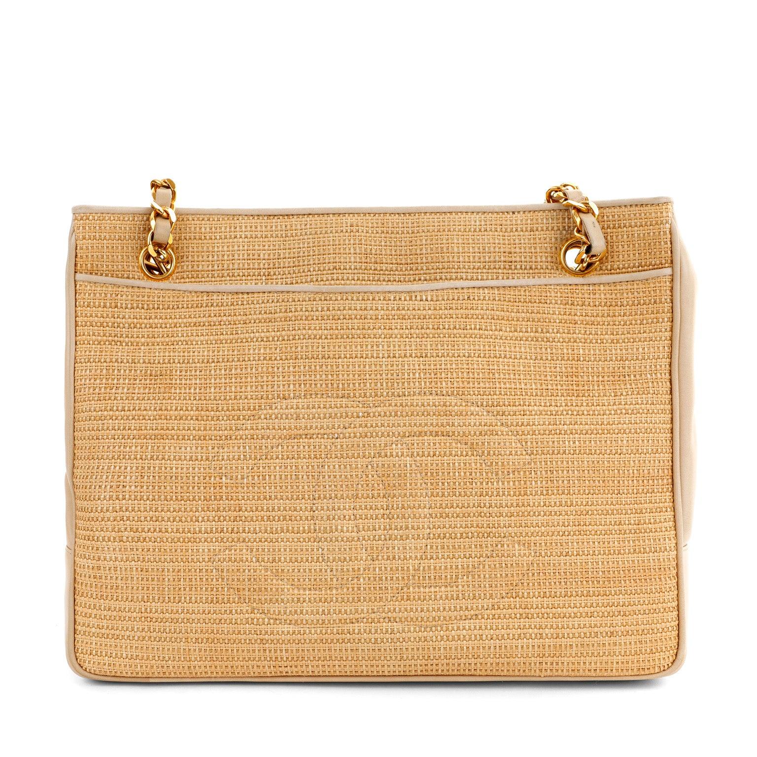 This Chanel Raffia CC Tote is in New previously owned condition.Natural raffia tote has large interlocking CC tonally stitched on the front. Beige leather trimmings and handles with gold chain details. Dust bag included.