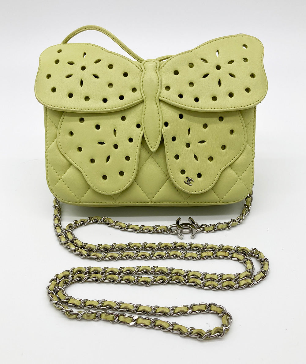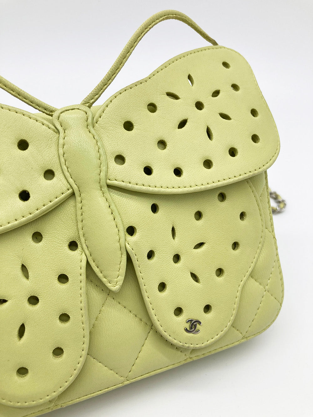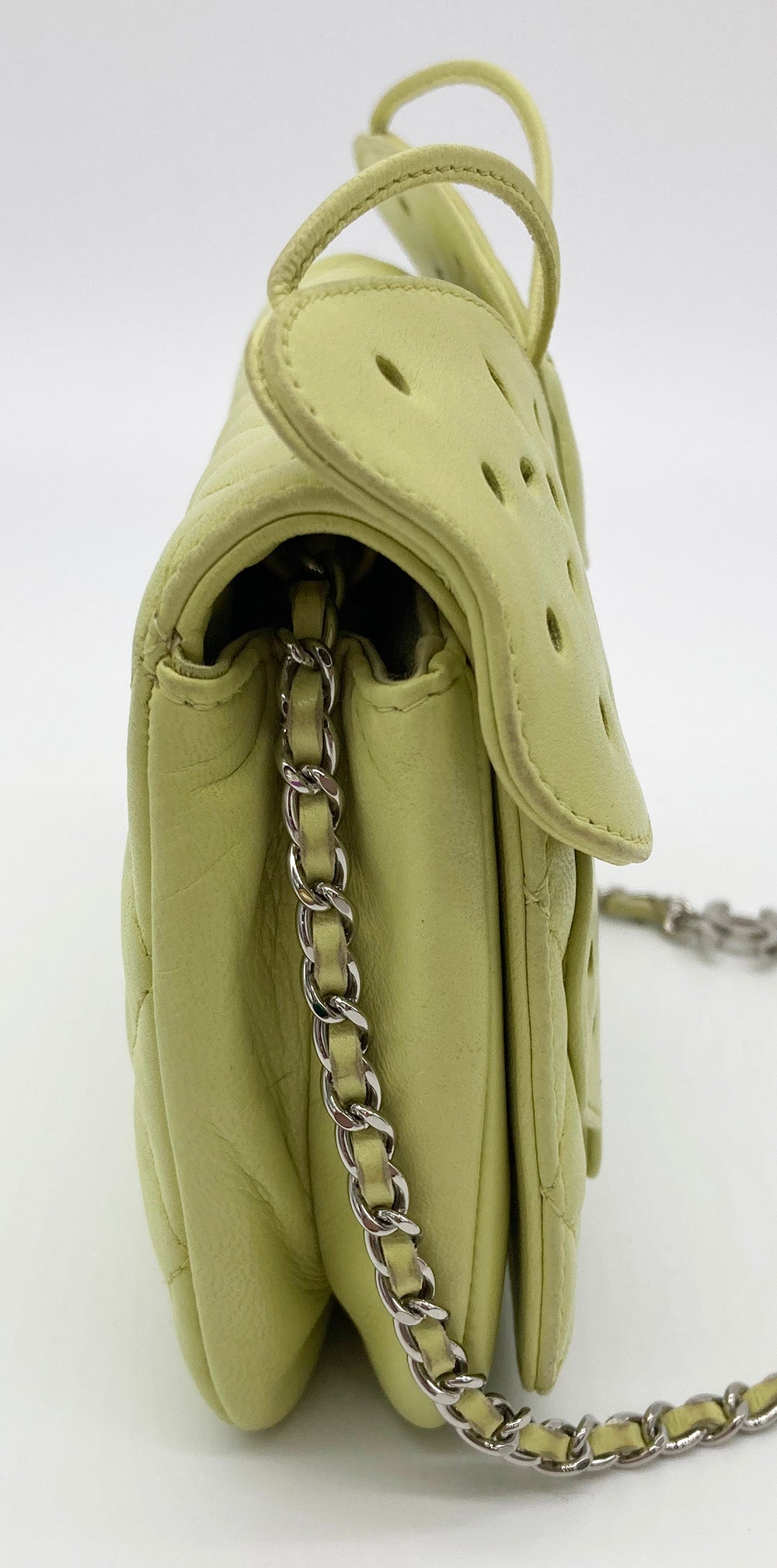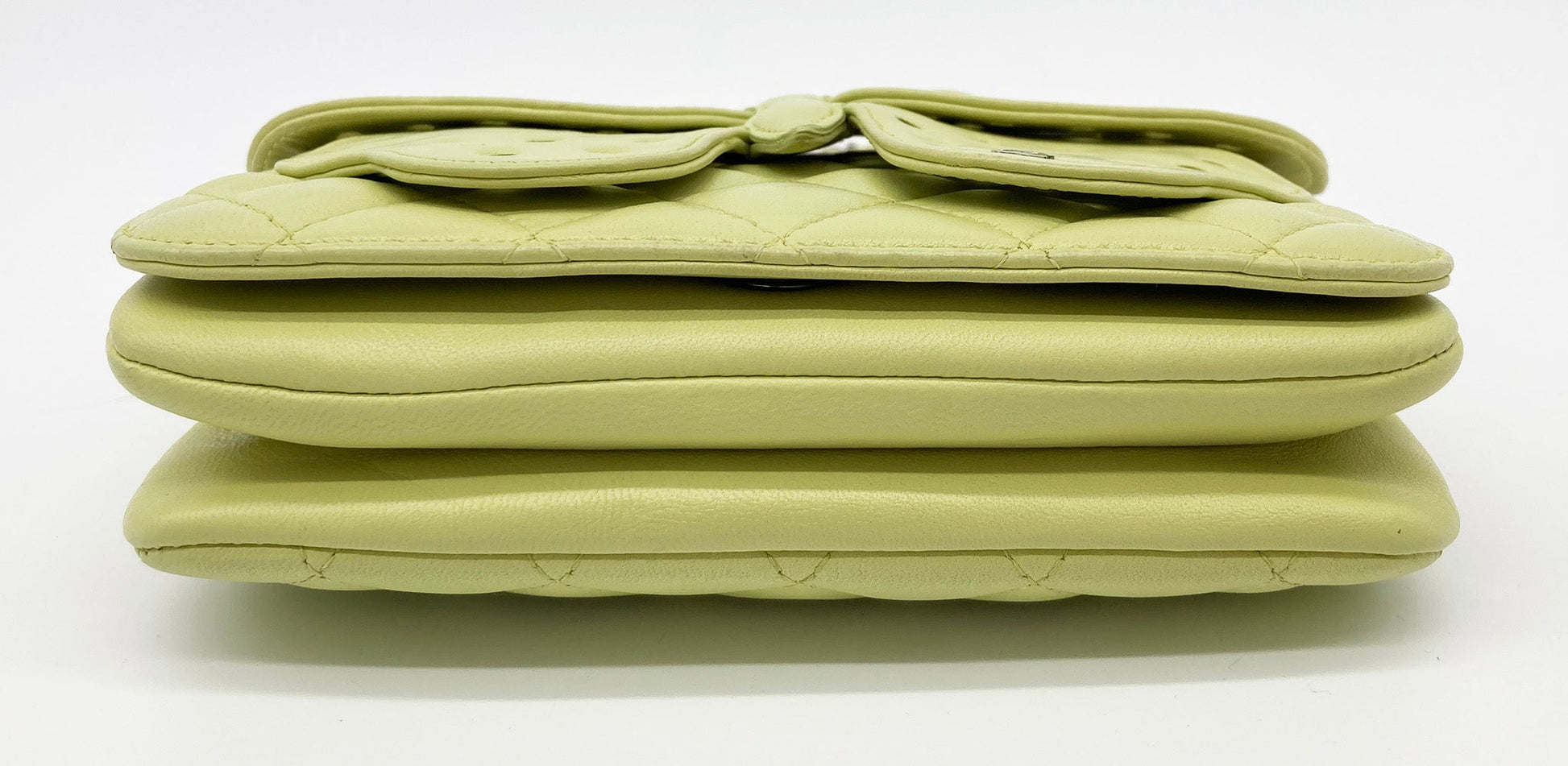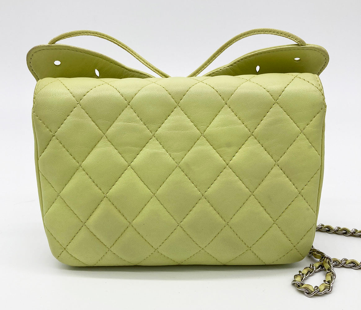 Chanel Lime Green Butterfly Classic Flap Bag in excellent condition. Lime green quilted lambskin leather exterior trimmed with a laser cut leather butterfly along the front side and woven chain and leather shoulder strap. Snap flap closure opens to a matching lime satin interior with one side slit pocket. No scuffs. Clean corners and edges. One very tiny spot on interior side lining. Very unique and rare color. Purchase includes a dust cover. Measurements: 6.25x5x2" 24" strap