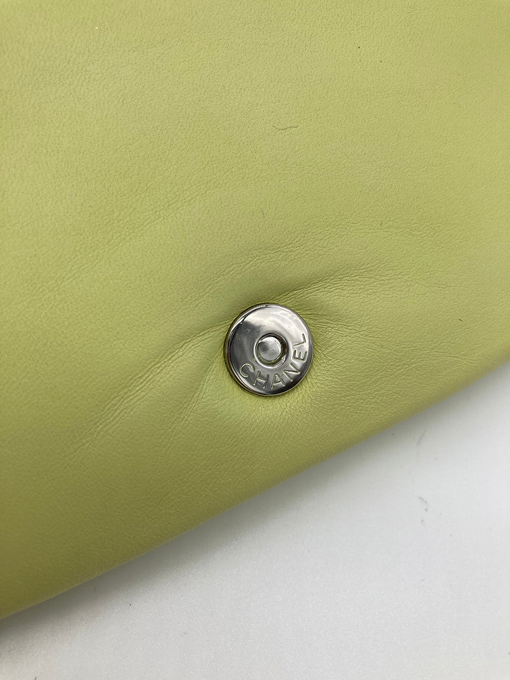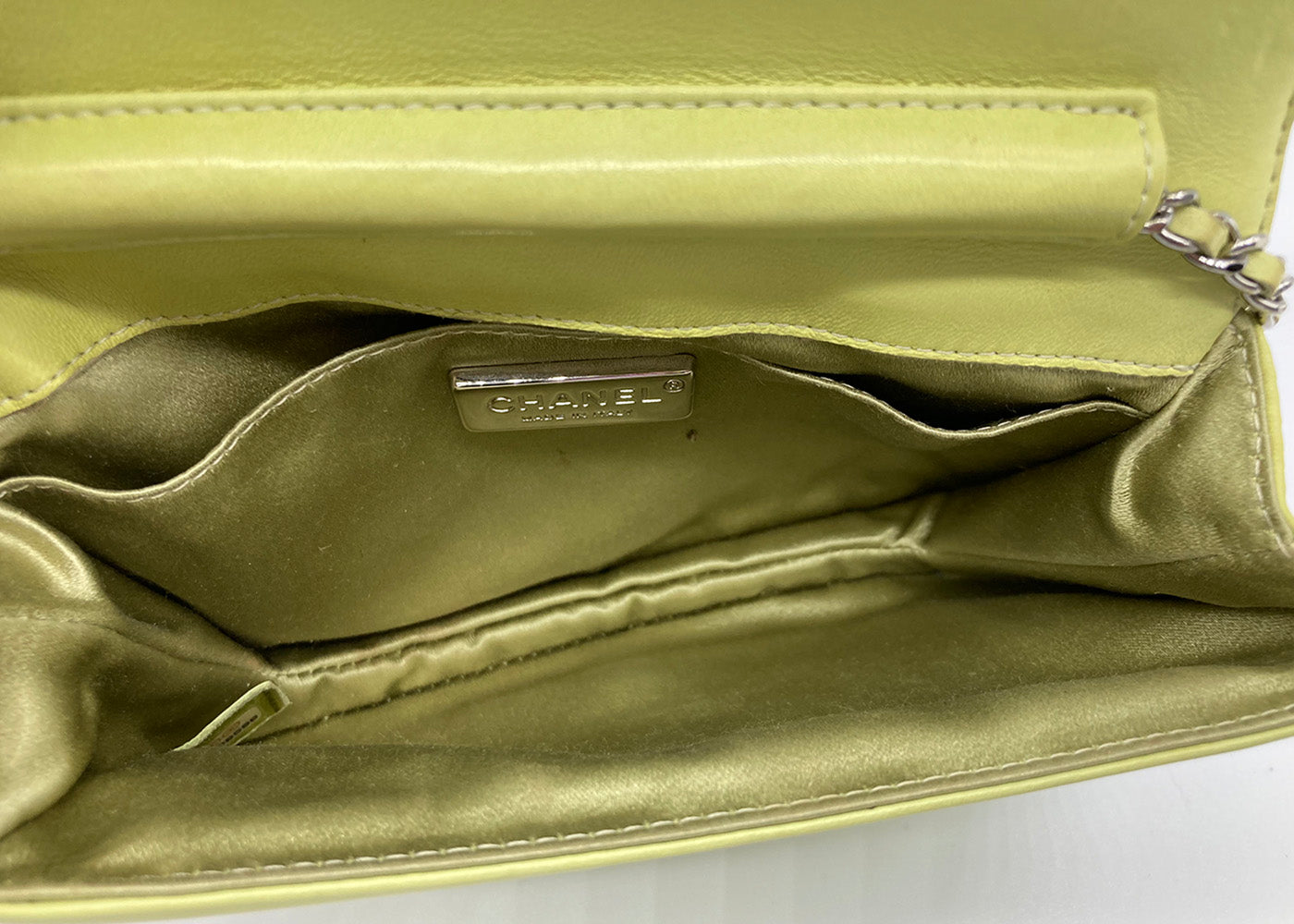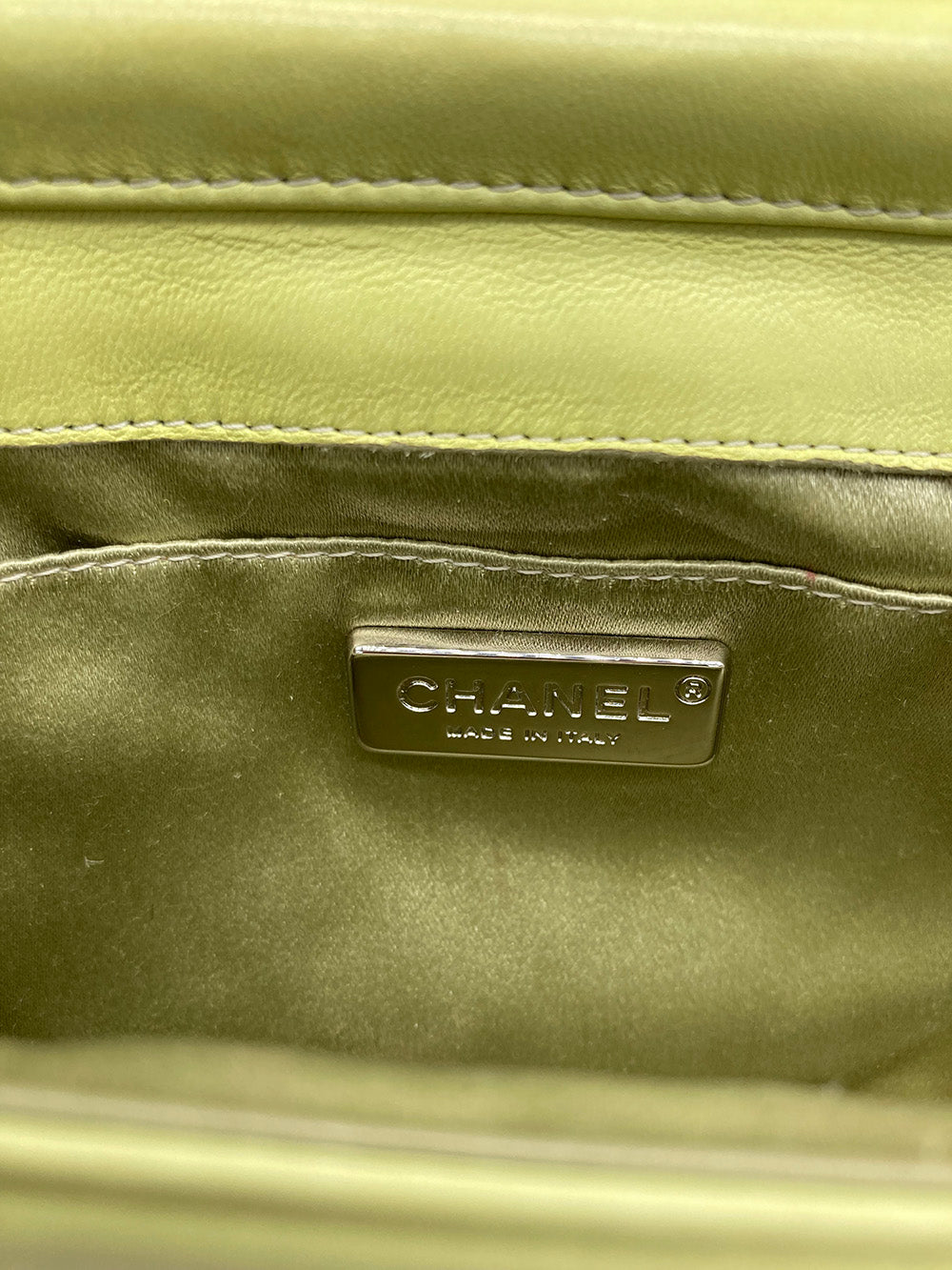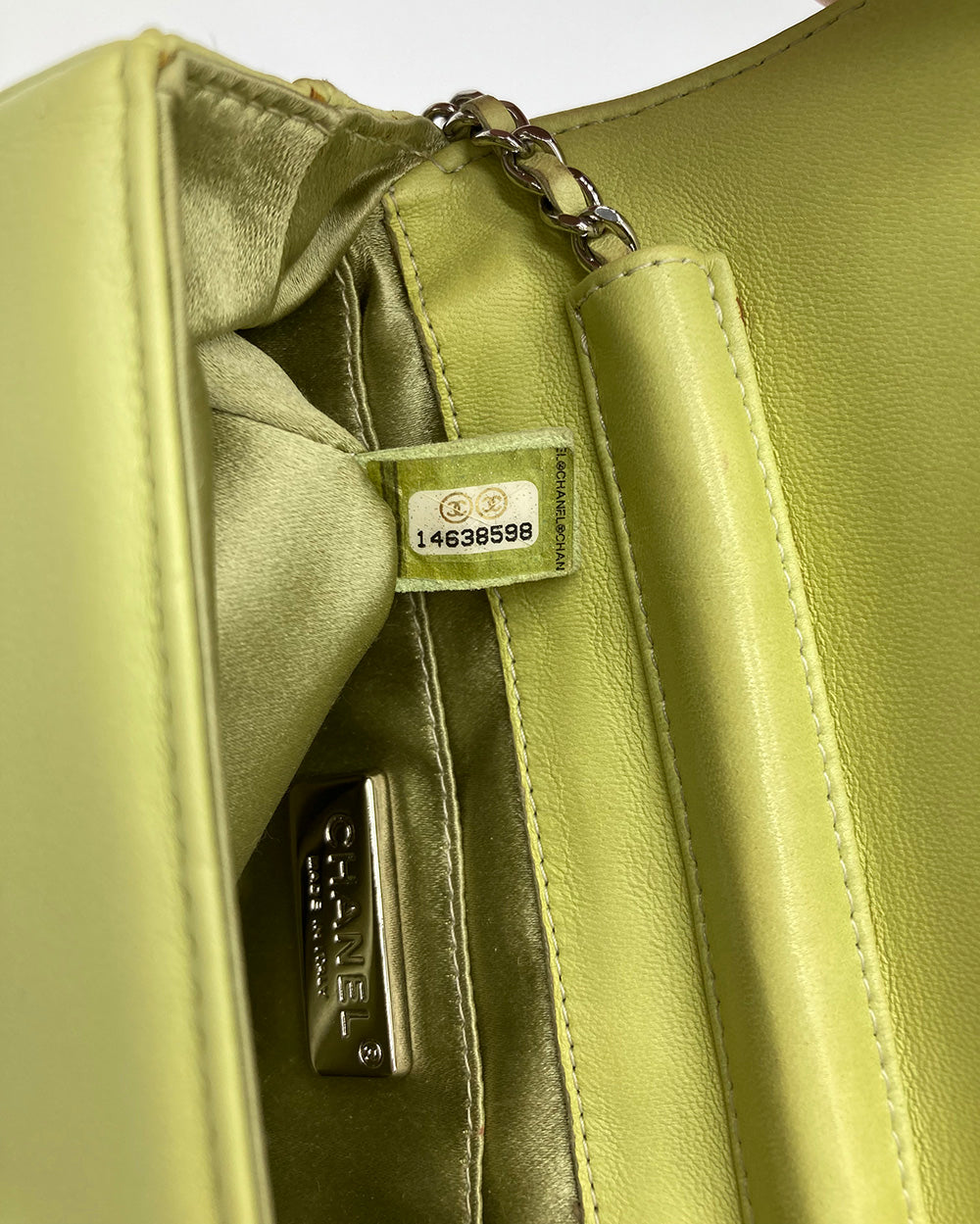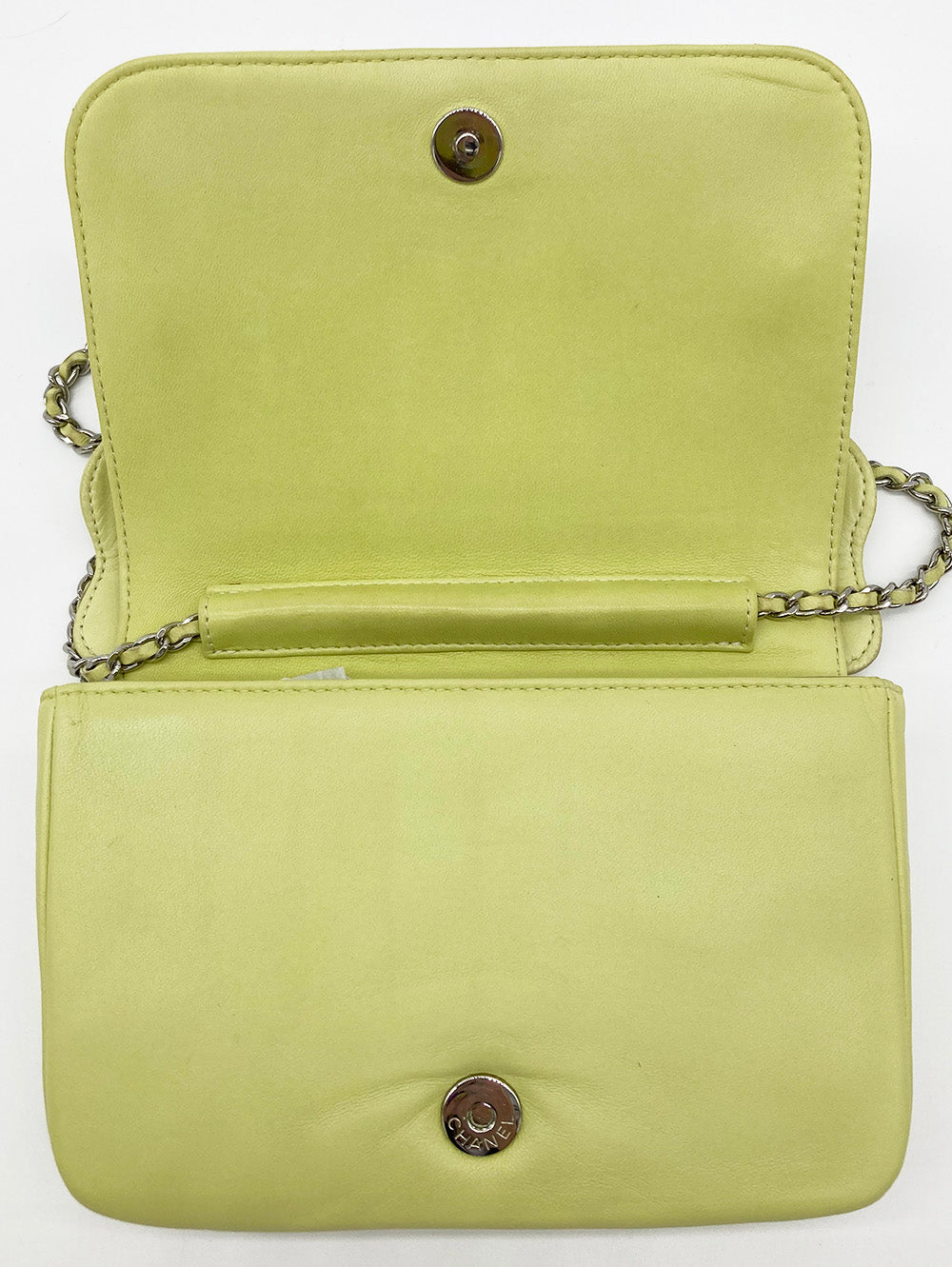 Chanel Lime Green Butterfly Classic Flap Bag in excellent condition. Lime green quilted lambskin leather exterior trimmed with a laser cut leather butterfly along the front side and woven chain and leather shoulder strap. Snap flap closure opens to a matching lime satin interior with one side slit pocket. No scuffs. Clean corners and edges. One very tiny spot on interior side lining. Very unique and rare color. Purchase includes a dust cover. Measurements: 6.25x5x2" 24" strap