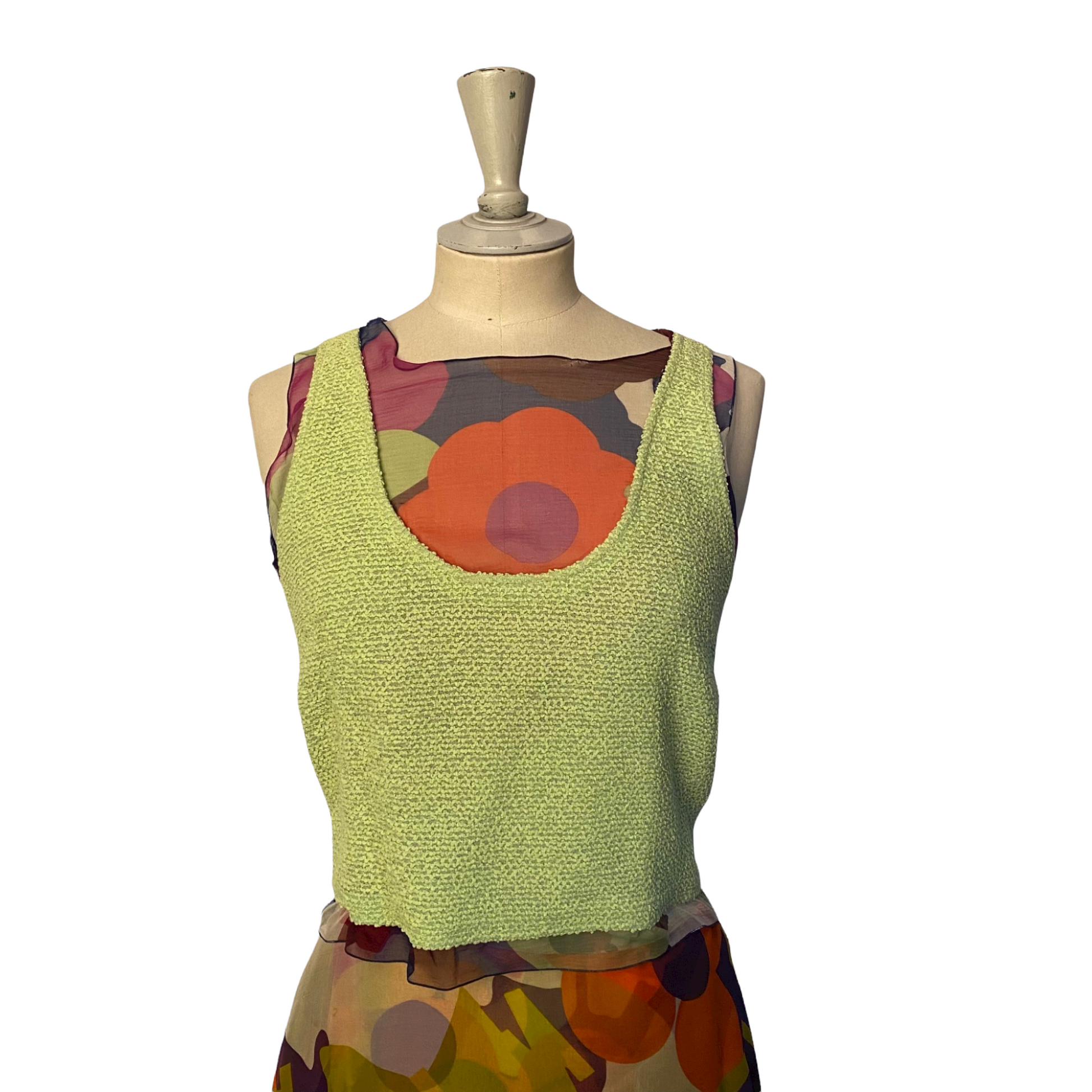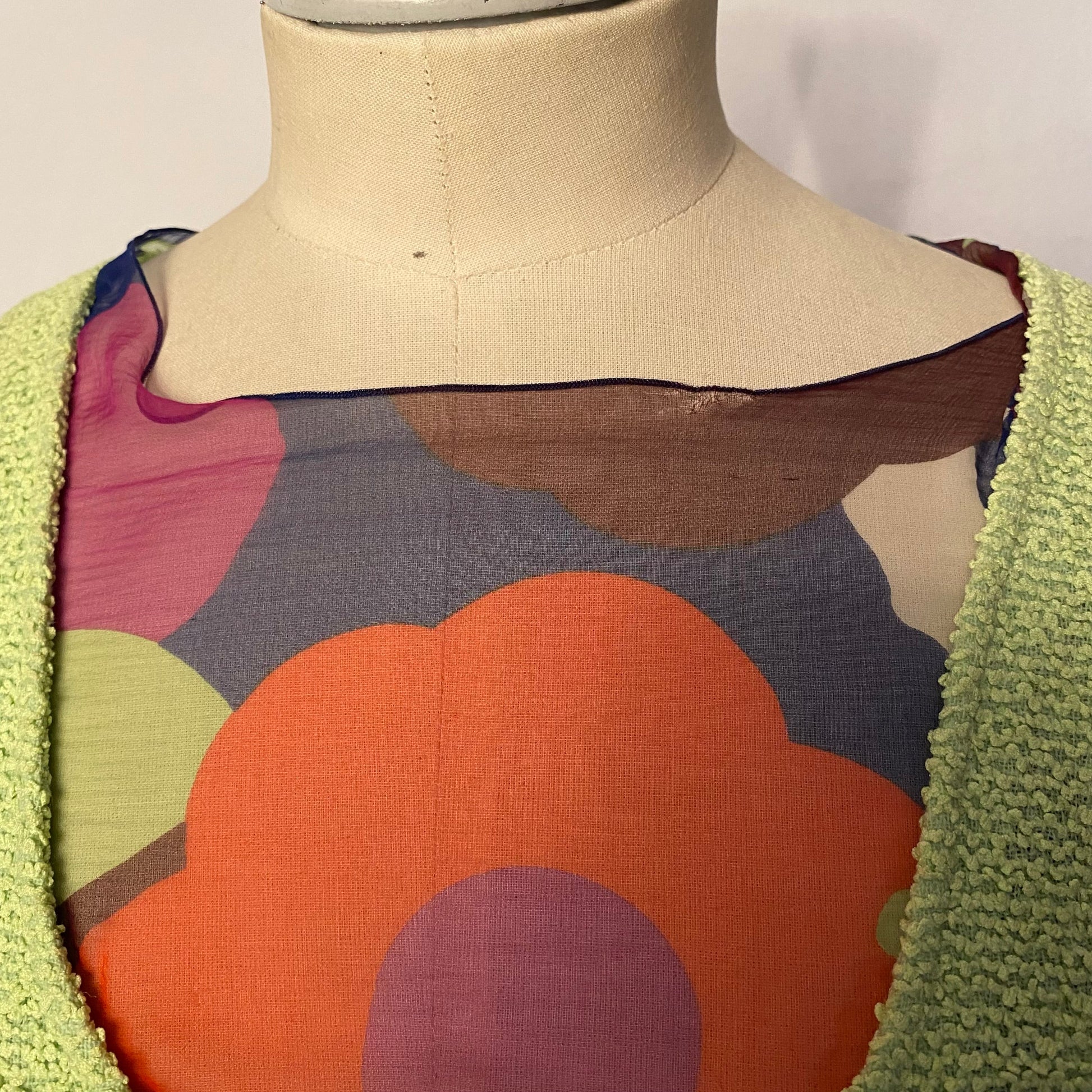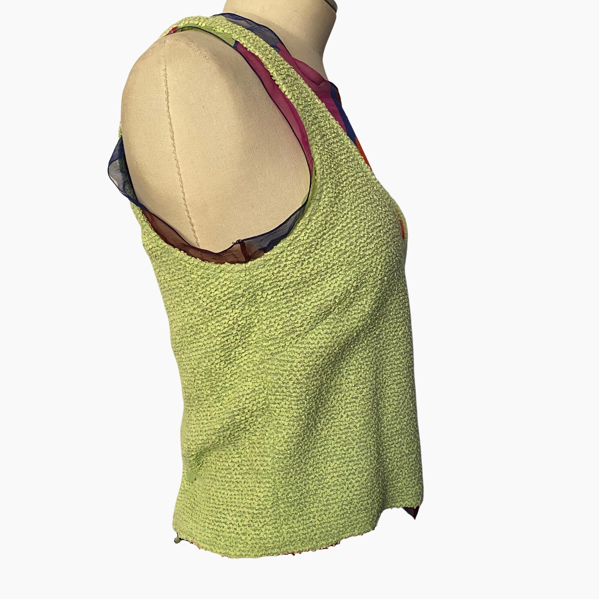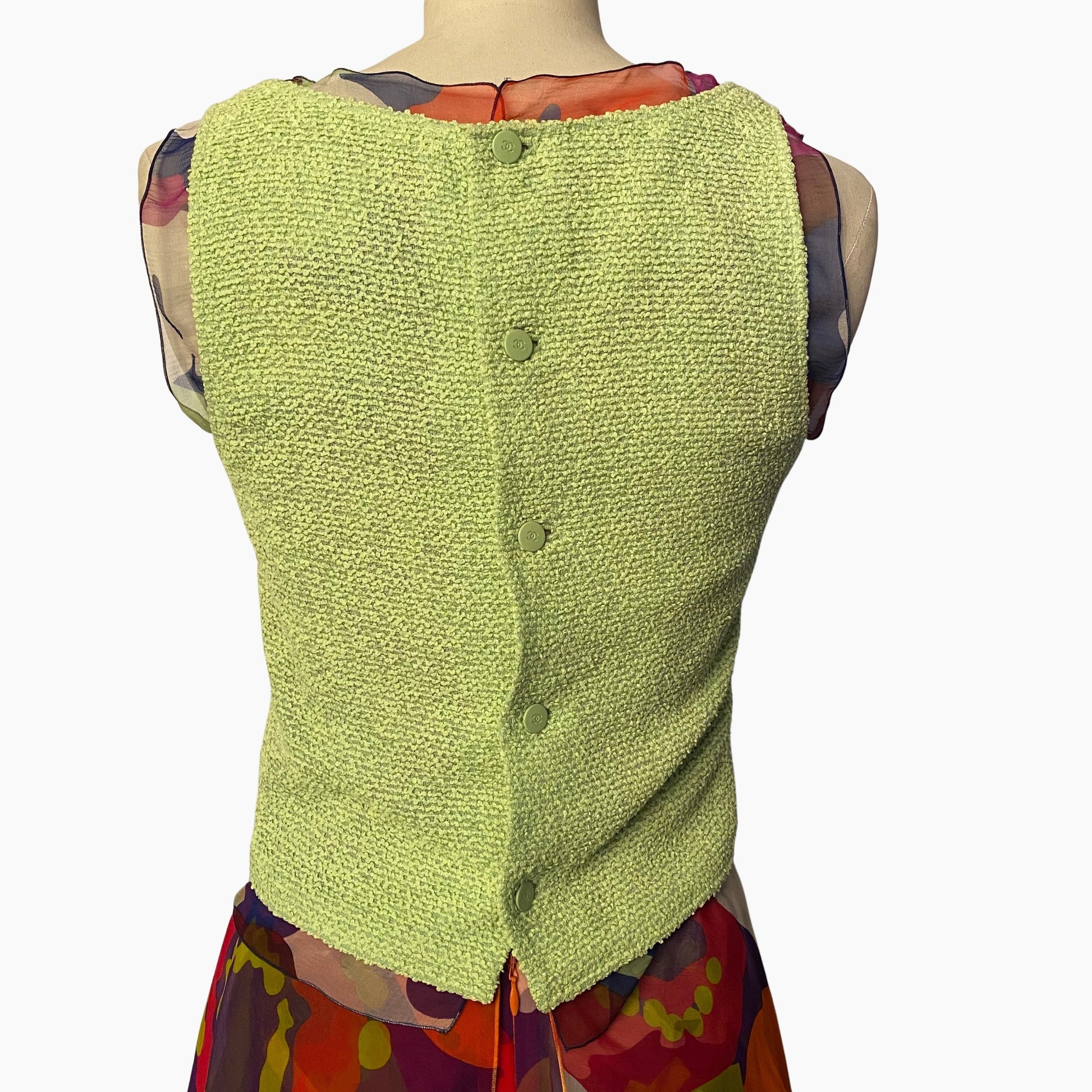 DESCRIPTION: Absinthe lime green top, with multicolor floral printed silk interior. Slight hitch at the top. Matching jacket and skirt available on Lysis.