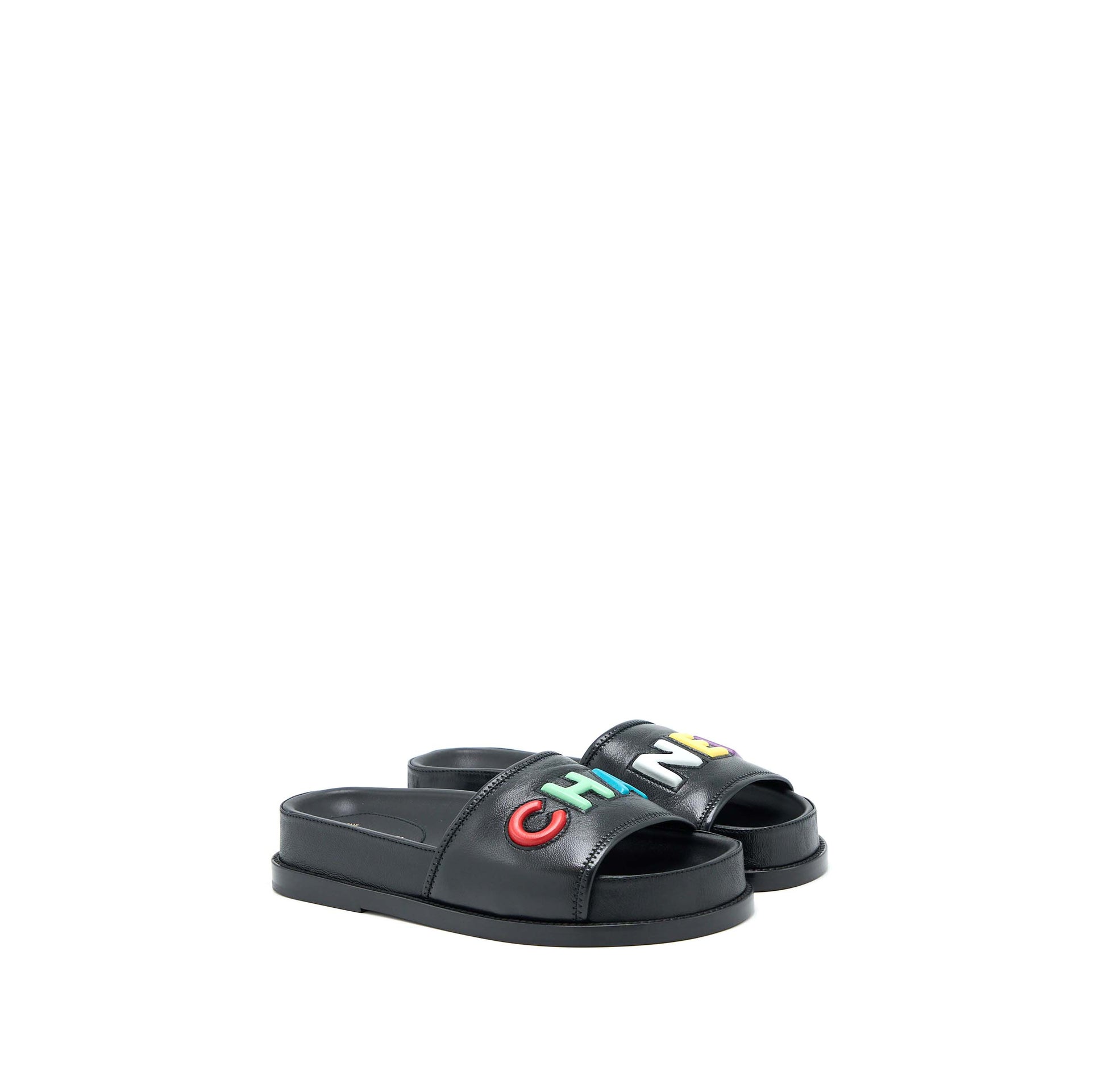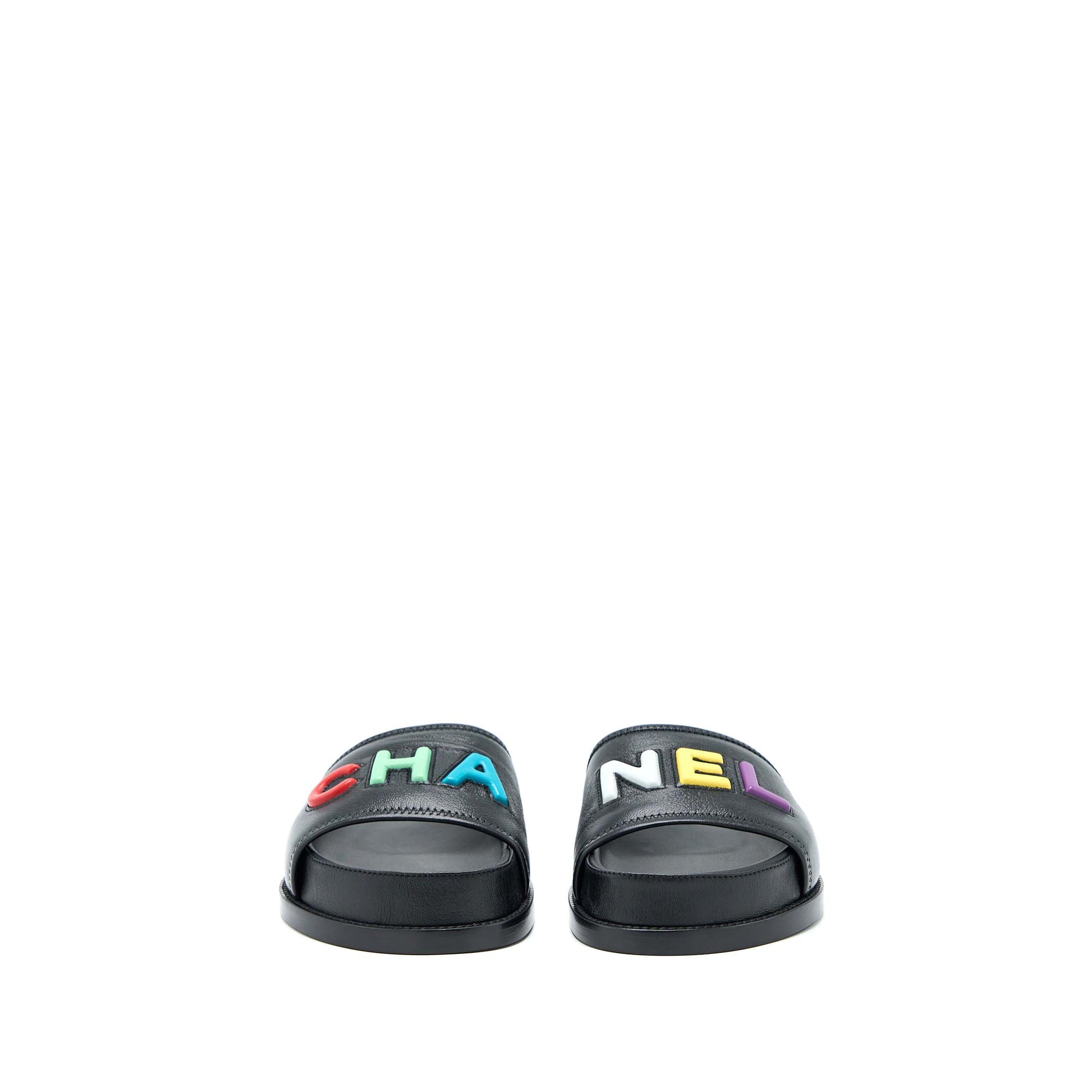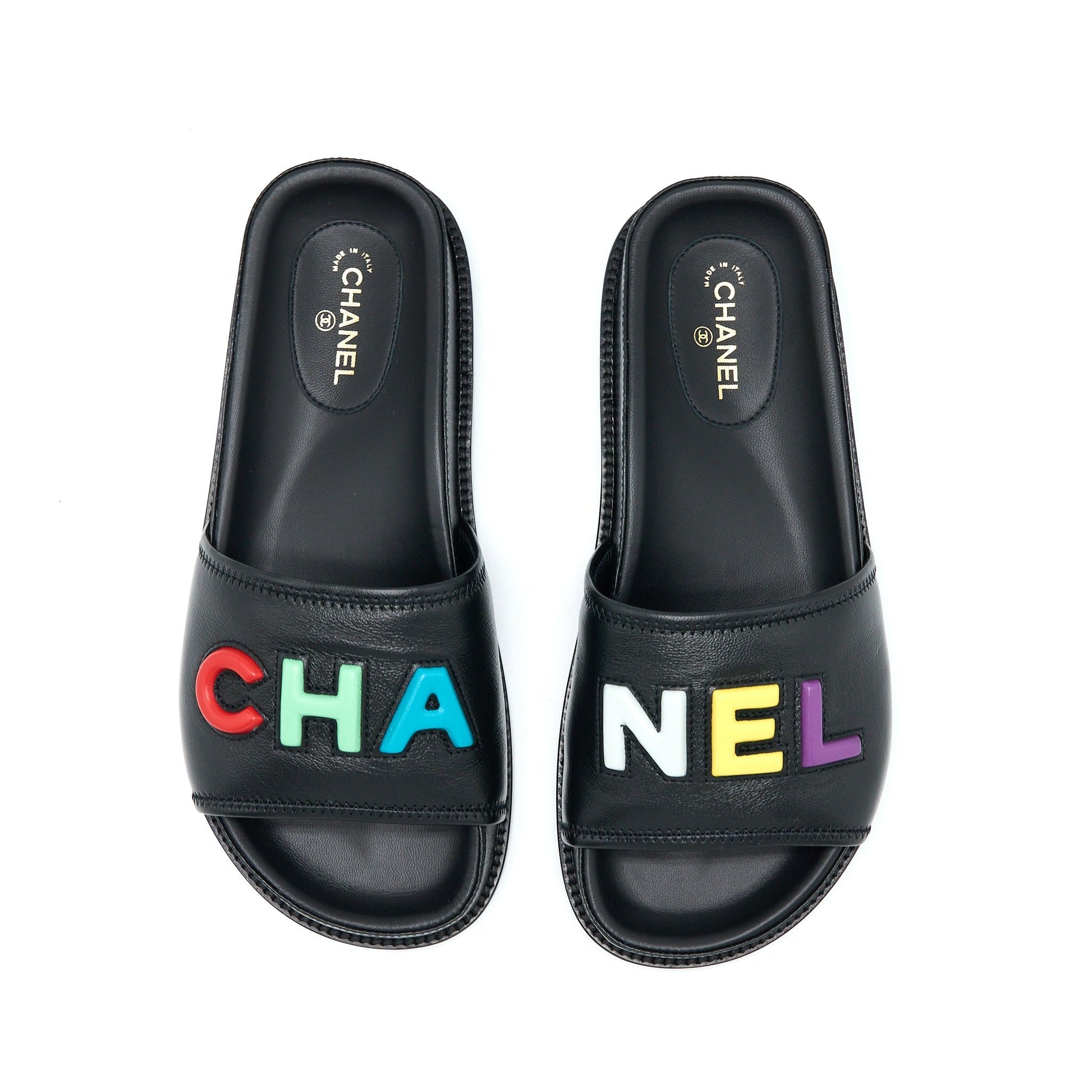 Chanel Size 37.5 Logo Multicolour Letter Slides Black