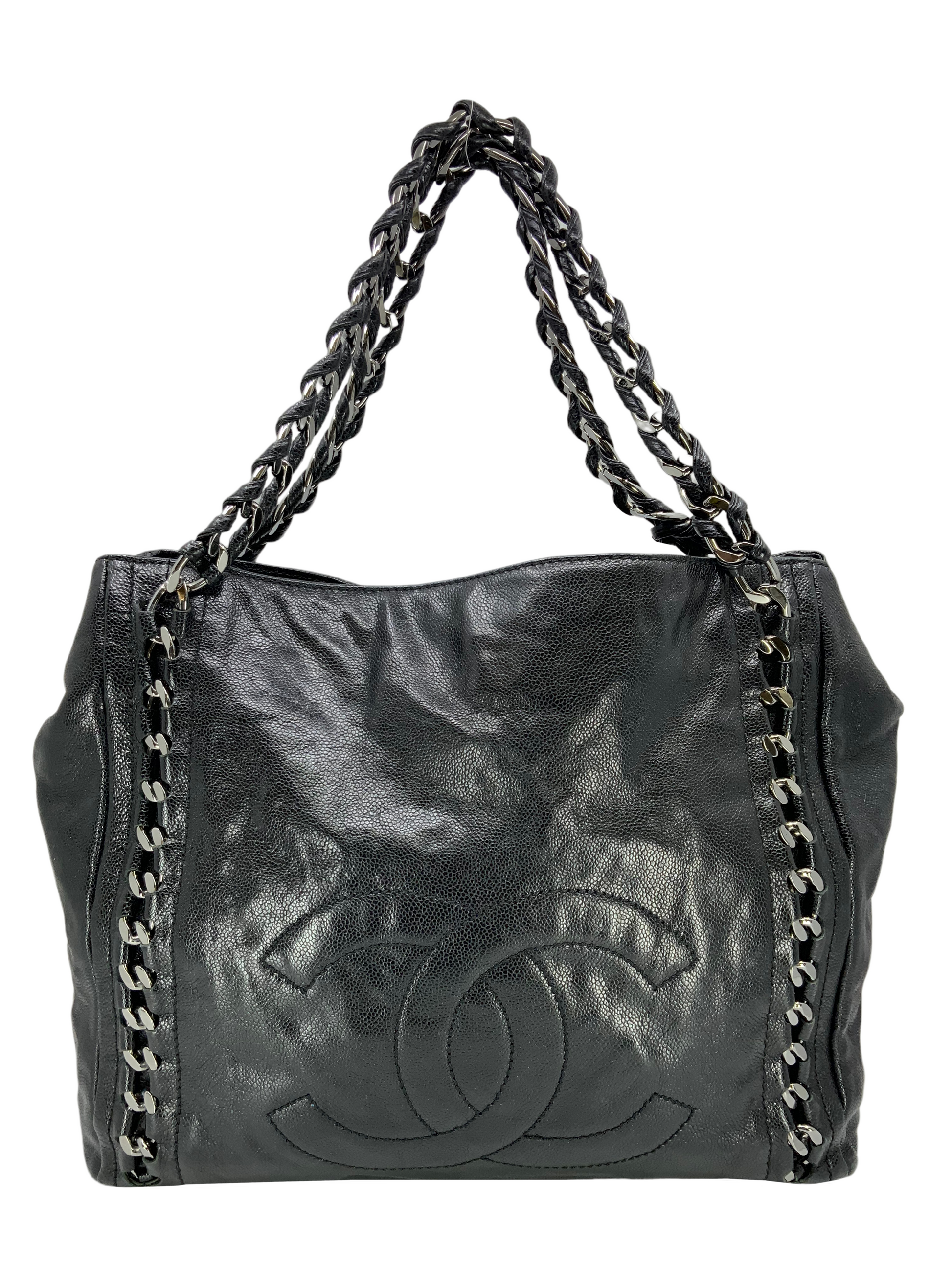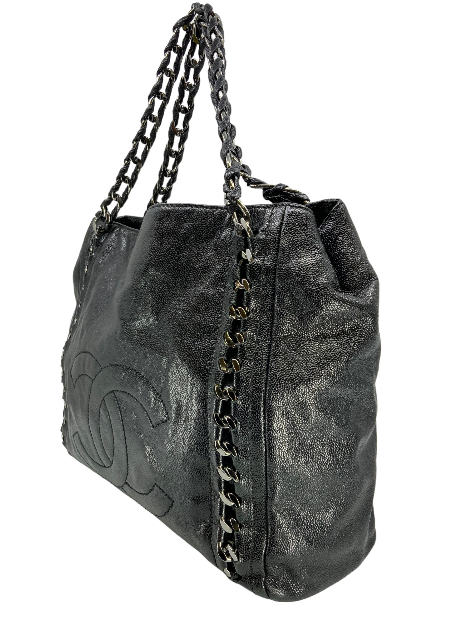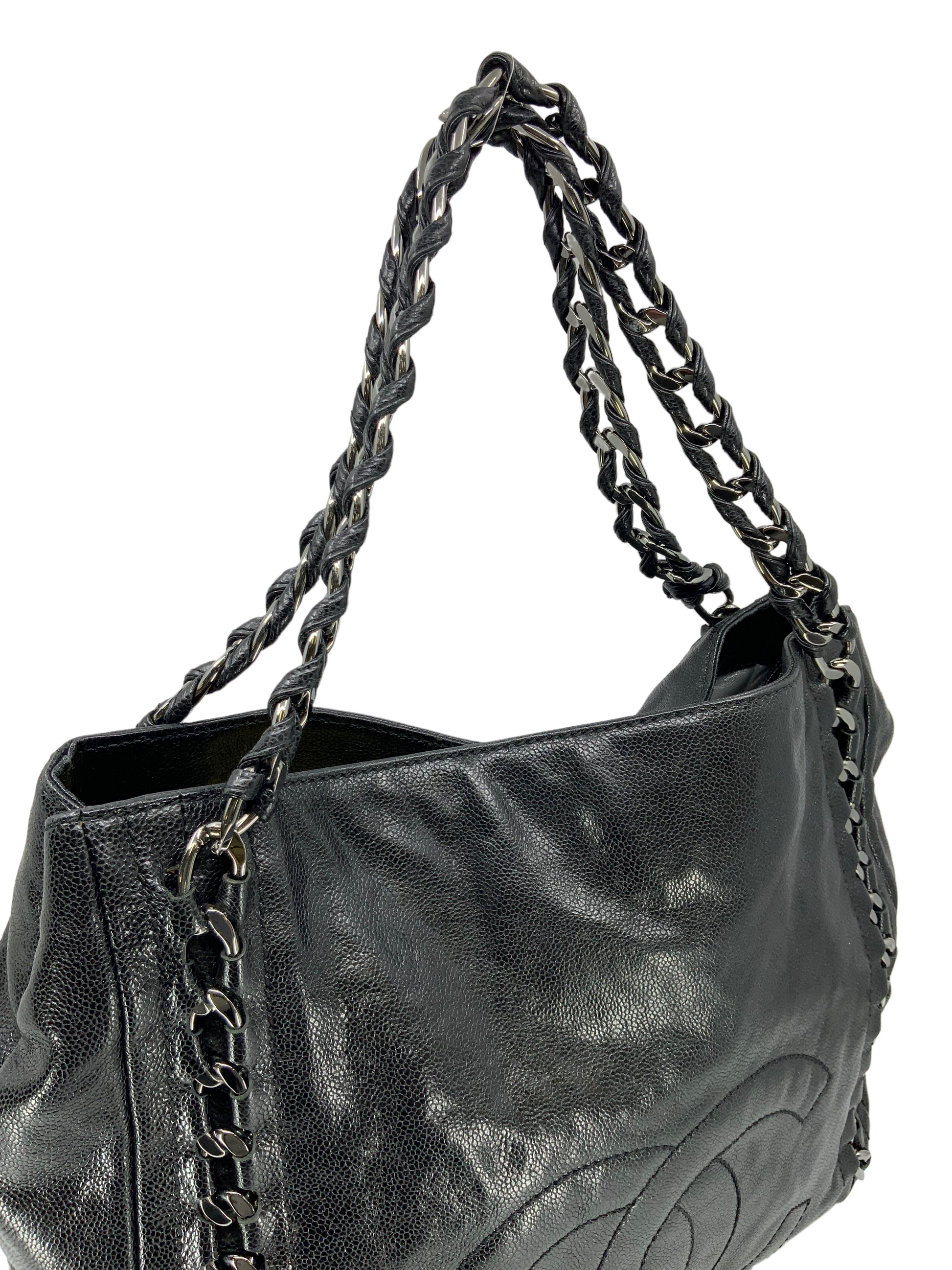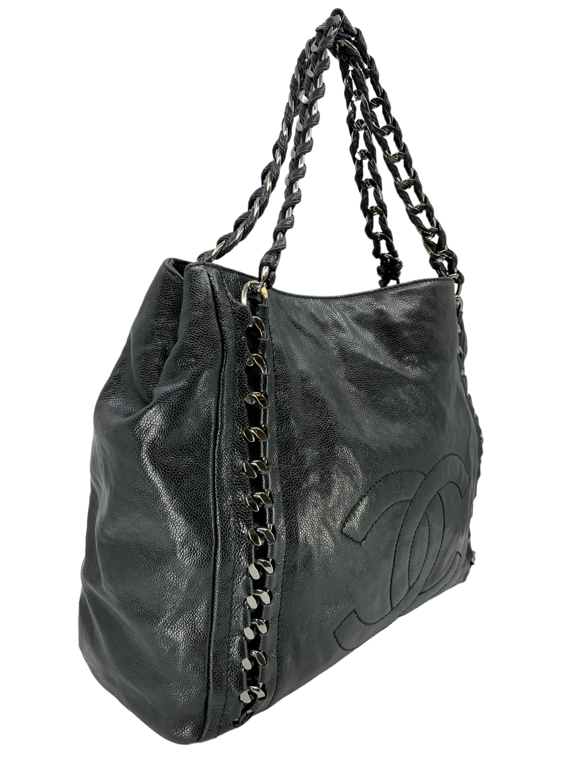 Add to your collection this CHANEL Luxe Ligne Leather Shoulder Bag from the 2008-2009 Collection.This bag isbeautifullycrafted fromblack caviar leather and silver-tone hardware. It features dualchain linkstraps threaded with tonal black leather, a large embossed signature CC logo at center and an ultra-spacious interior, roomy enough for all your essential belongings.Shop designer handbags by Chanelat.