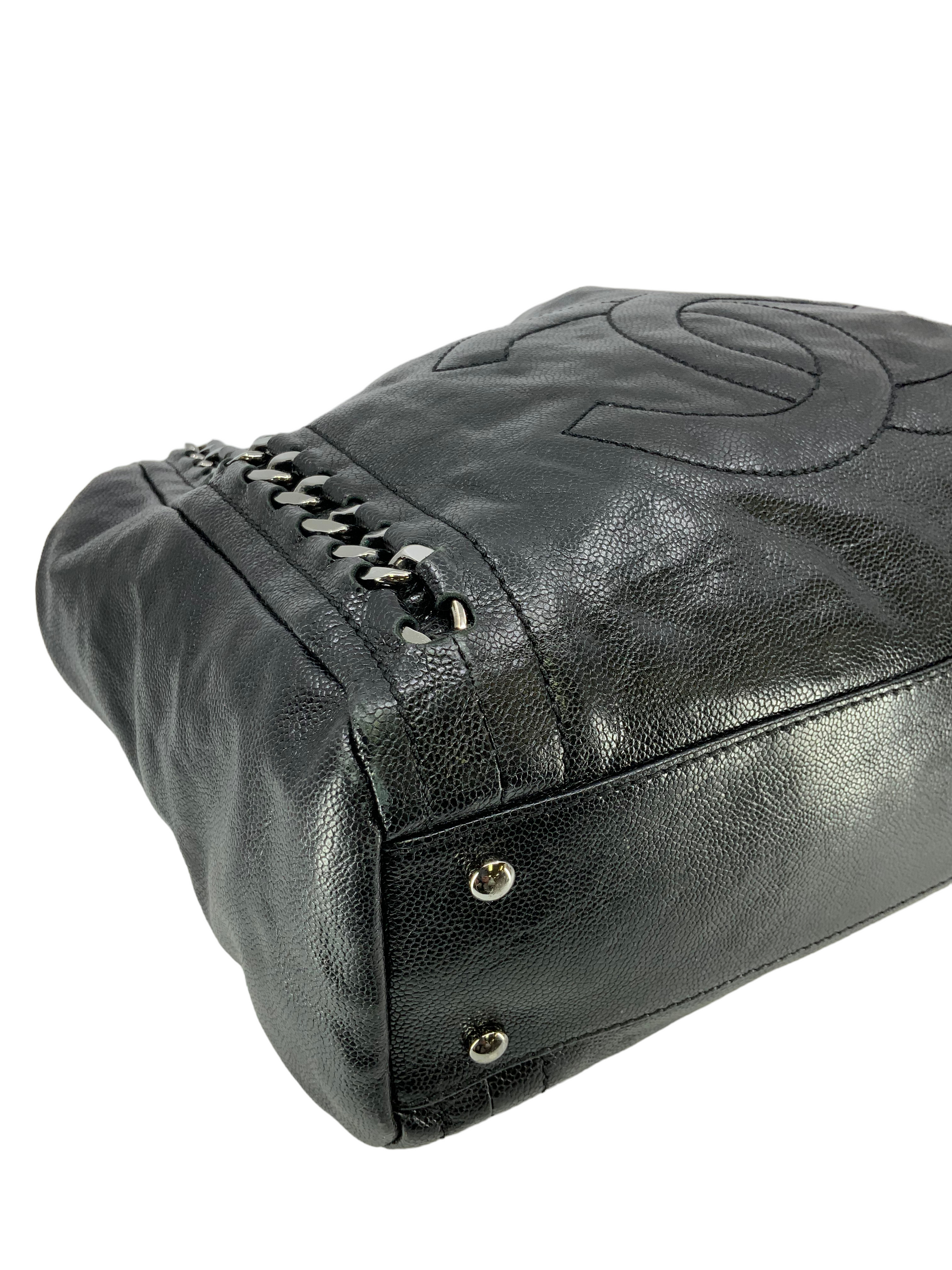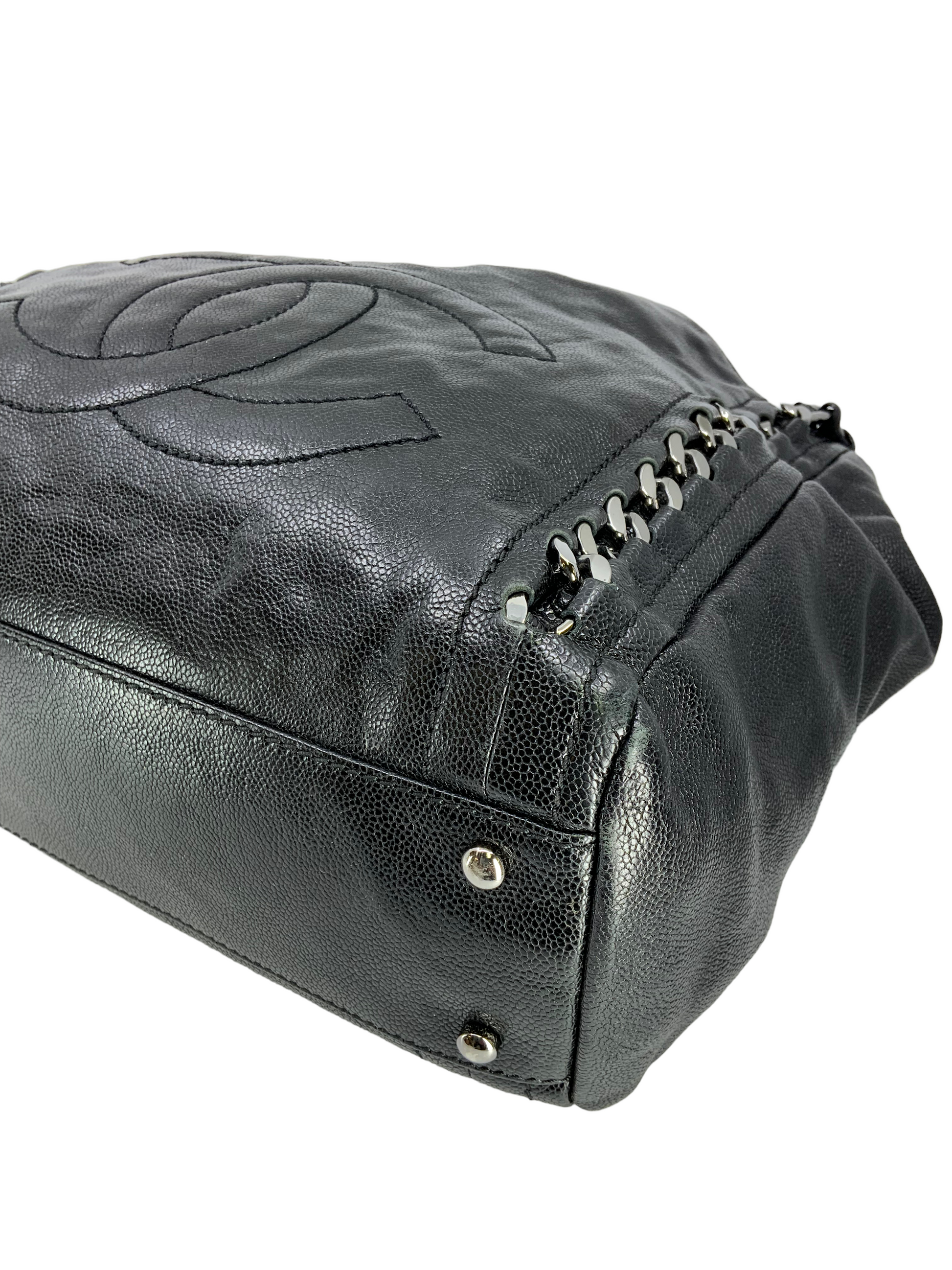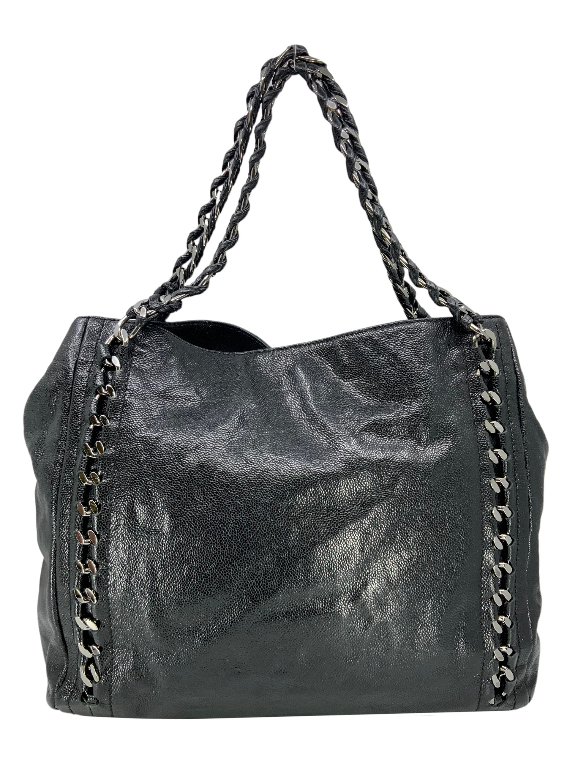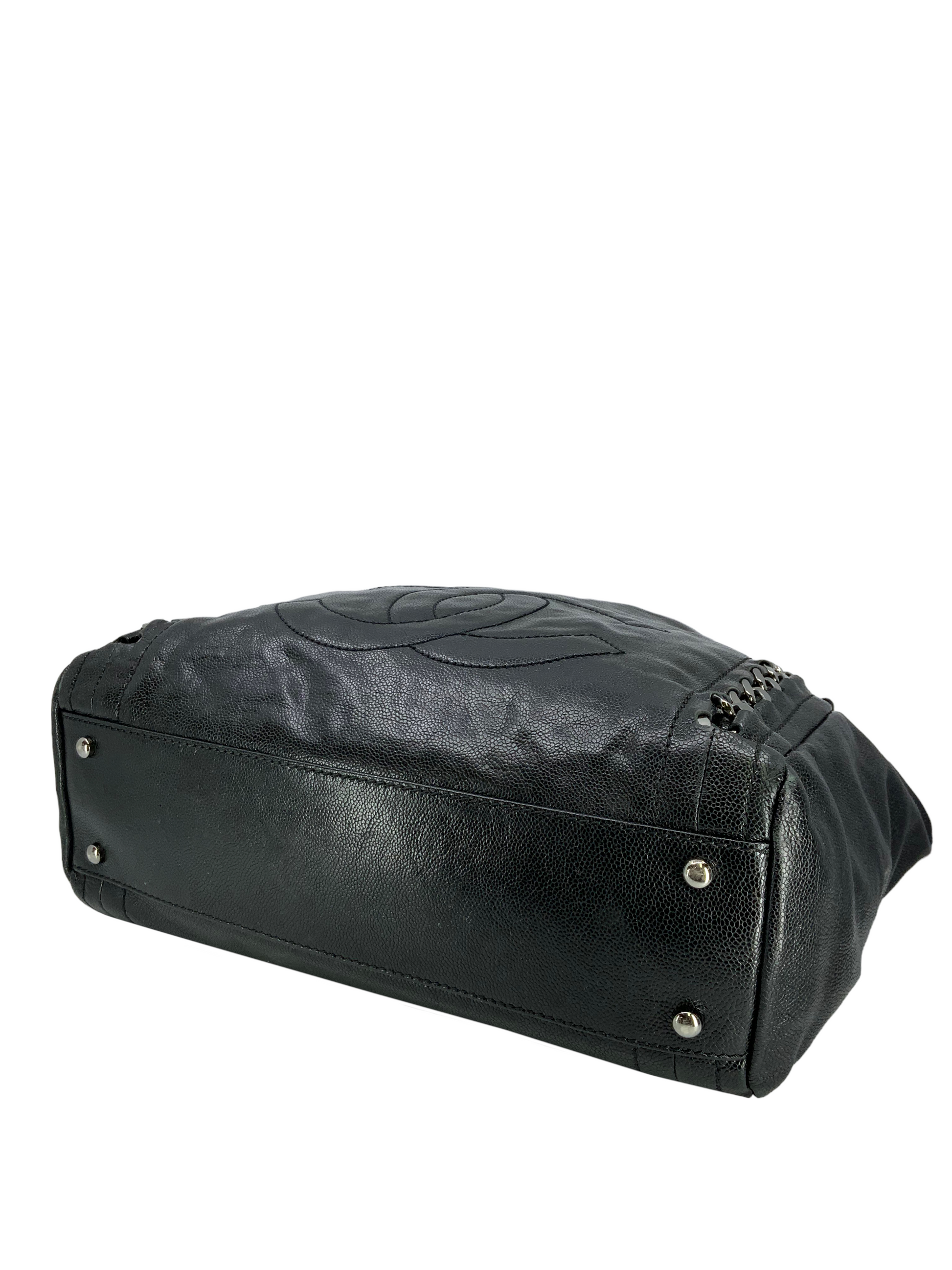 Add to your collection this CHANEL Luxe Ligne Leather Shoulder Bag from the 2008-2009 Collection.This bag isbeautifullycrafted fromblack caviar leather and silver-tone hardware. It features dualchain linkstraps threaded with tonal black leather, a large embossed signature CC logo at center and an ultra-spacious interior, roomy enough for all your essential belongings.Shop designer handbags by Chanelat.